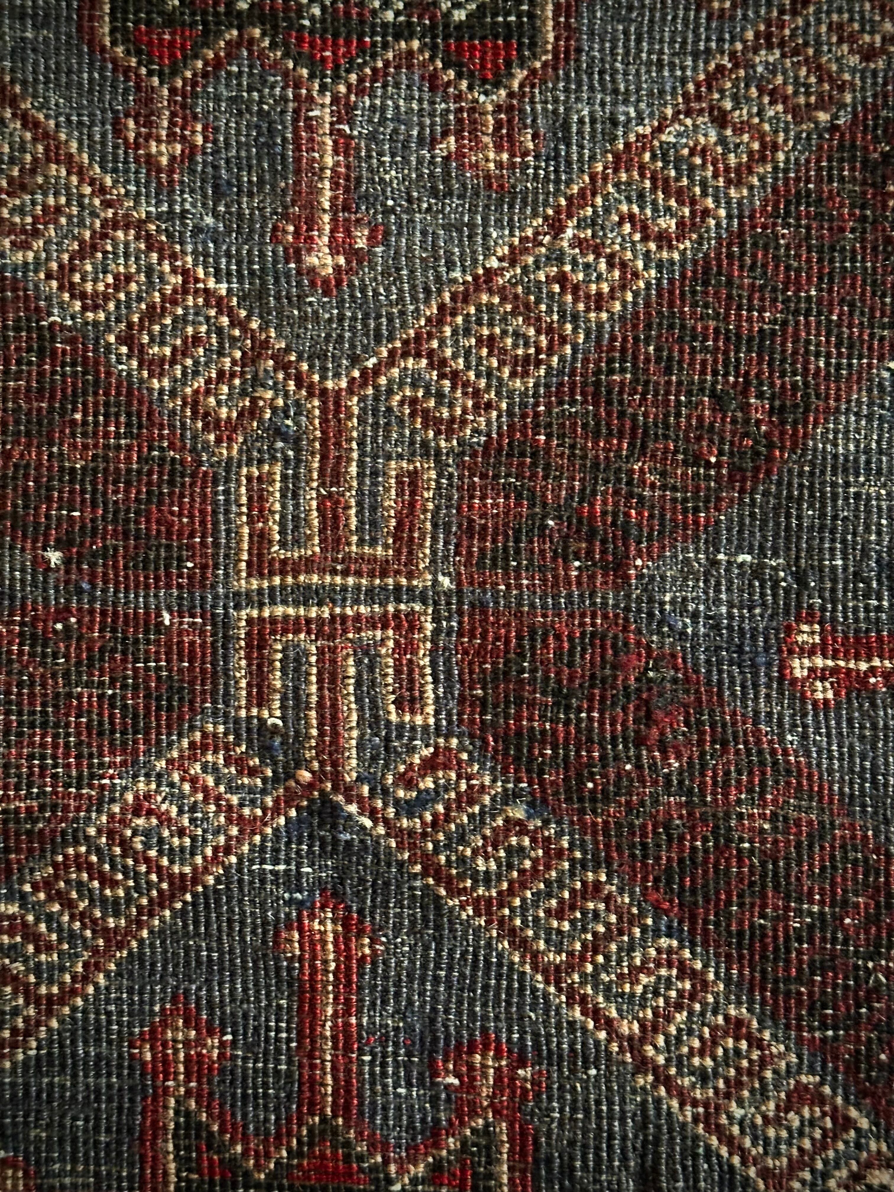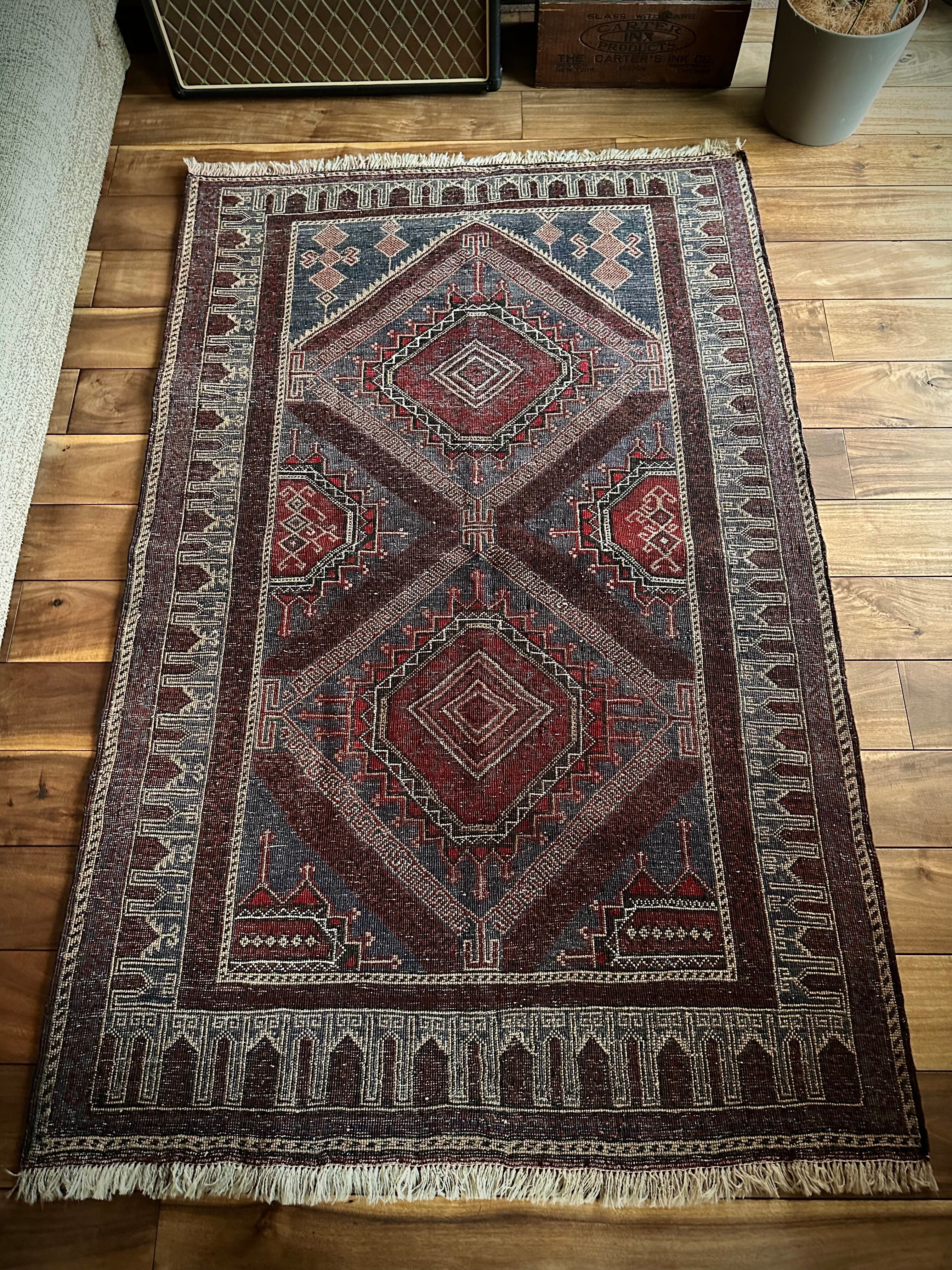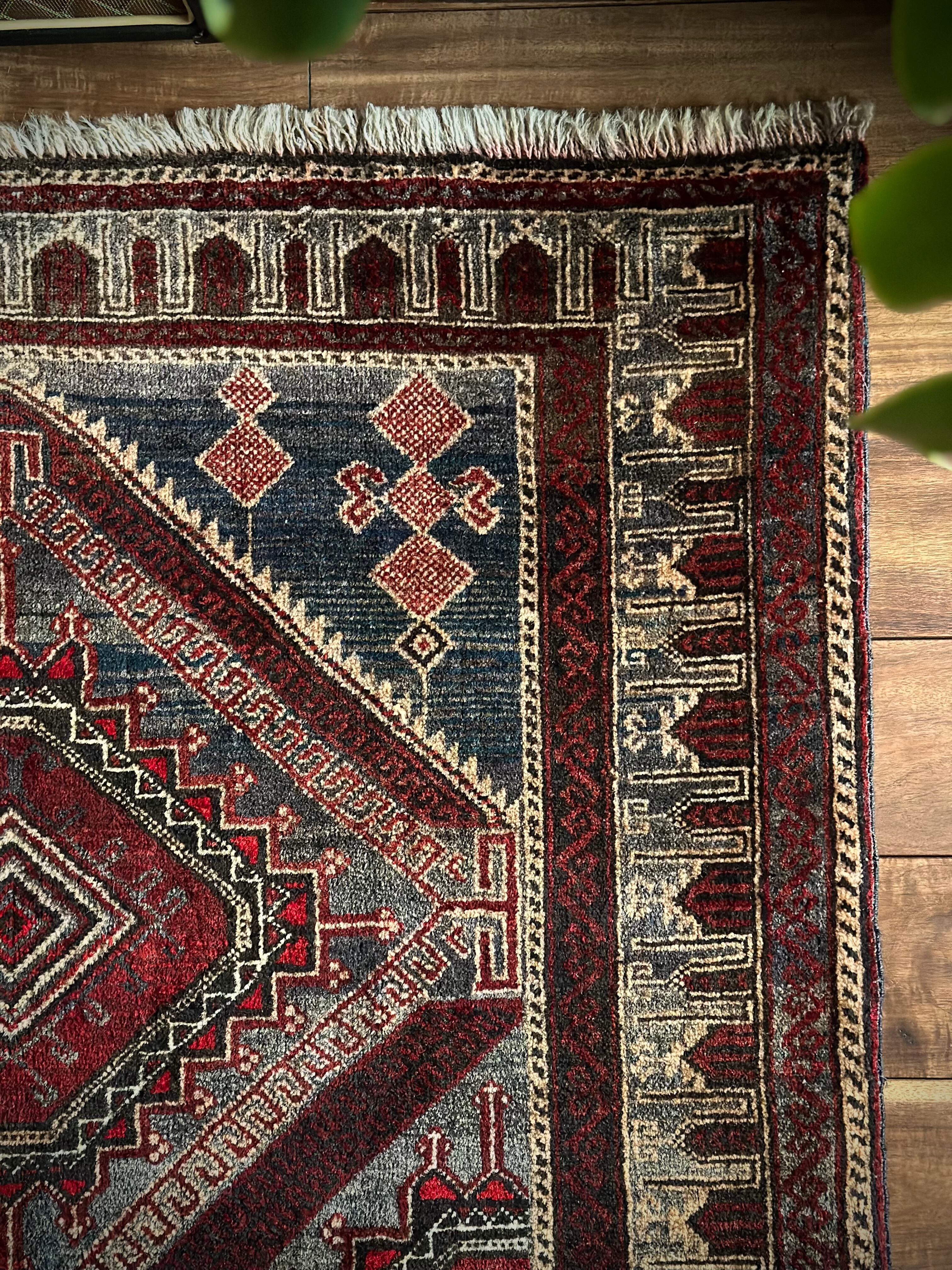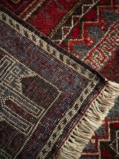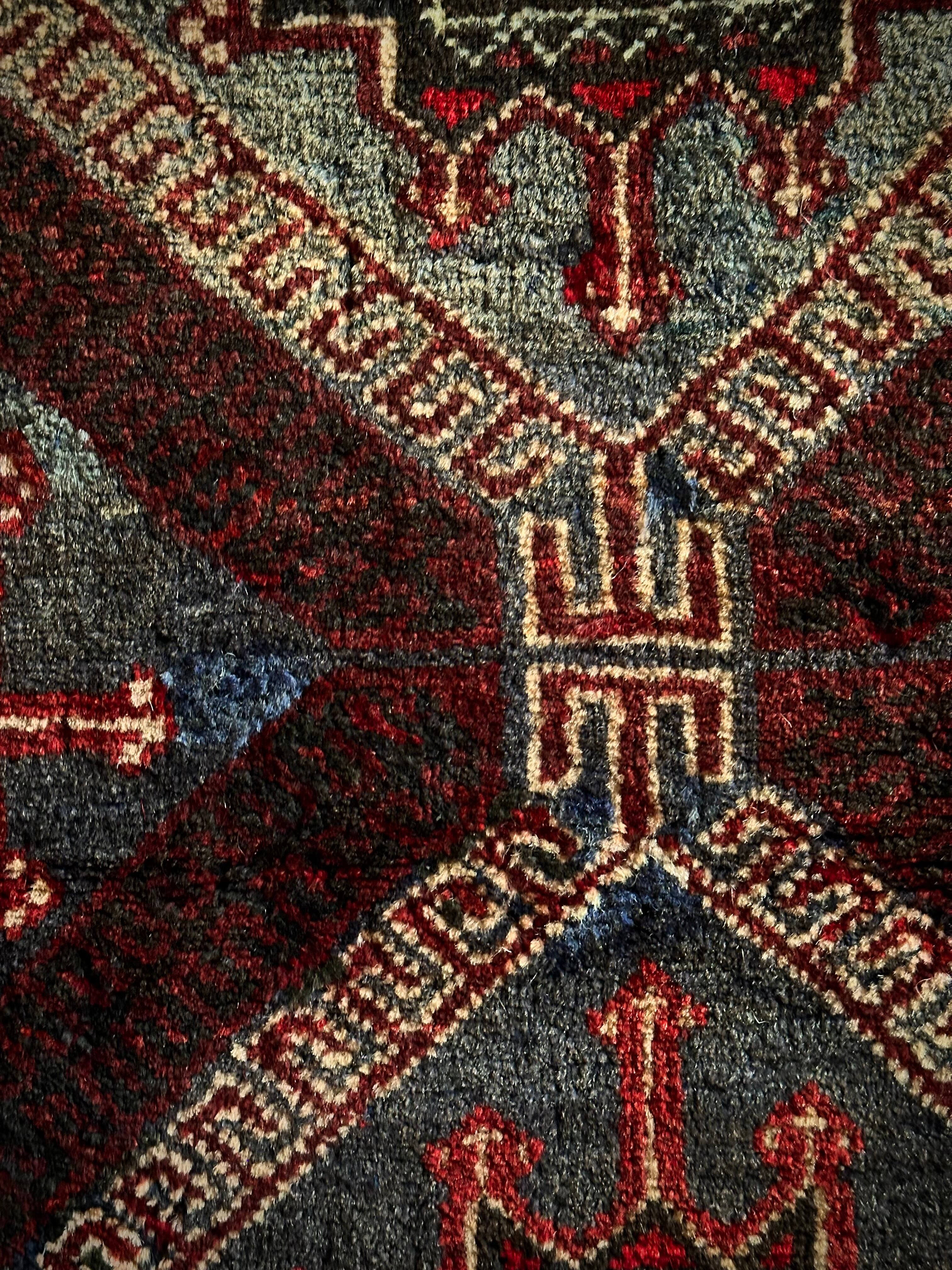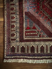 グレーをベースにボルドーやレッドで印影をつけた色彩に、2連のメダリオンと細かなモスクが織り込まれたプレイヤーらしきこちらは、アフガニスタンはヘラート州に居住するバルーチ族のトライバルラグになります。