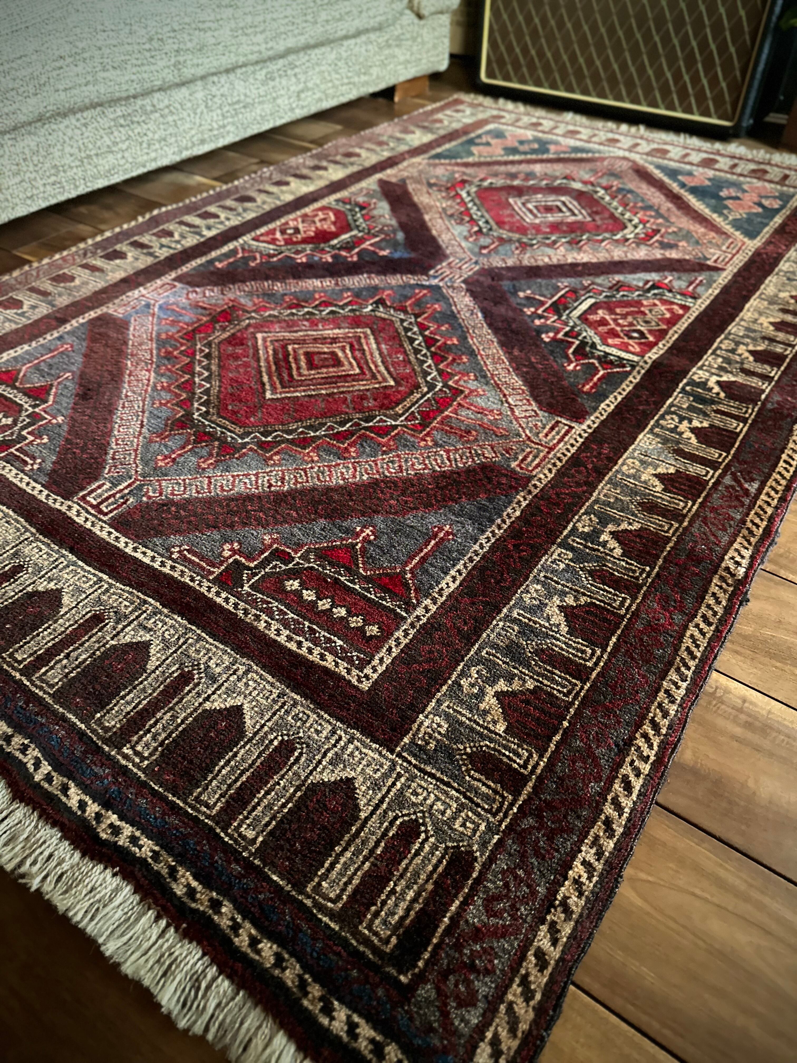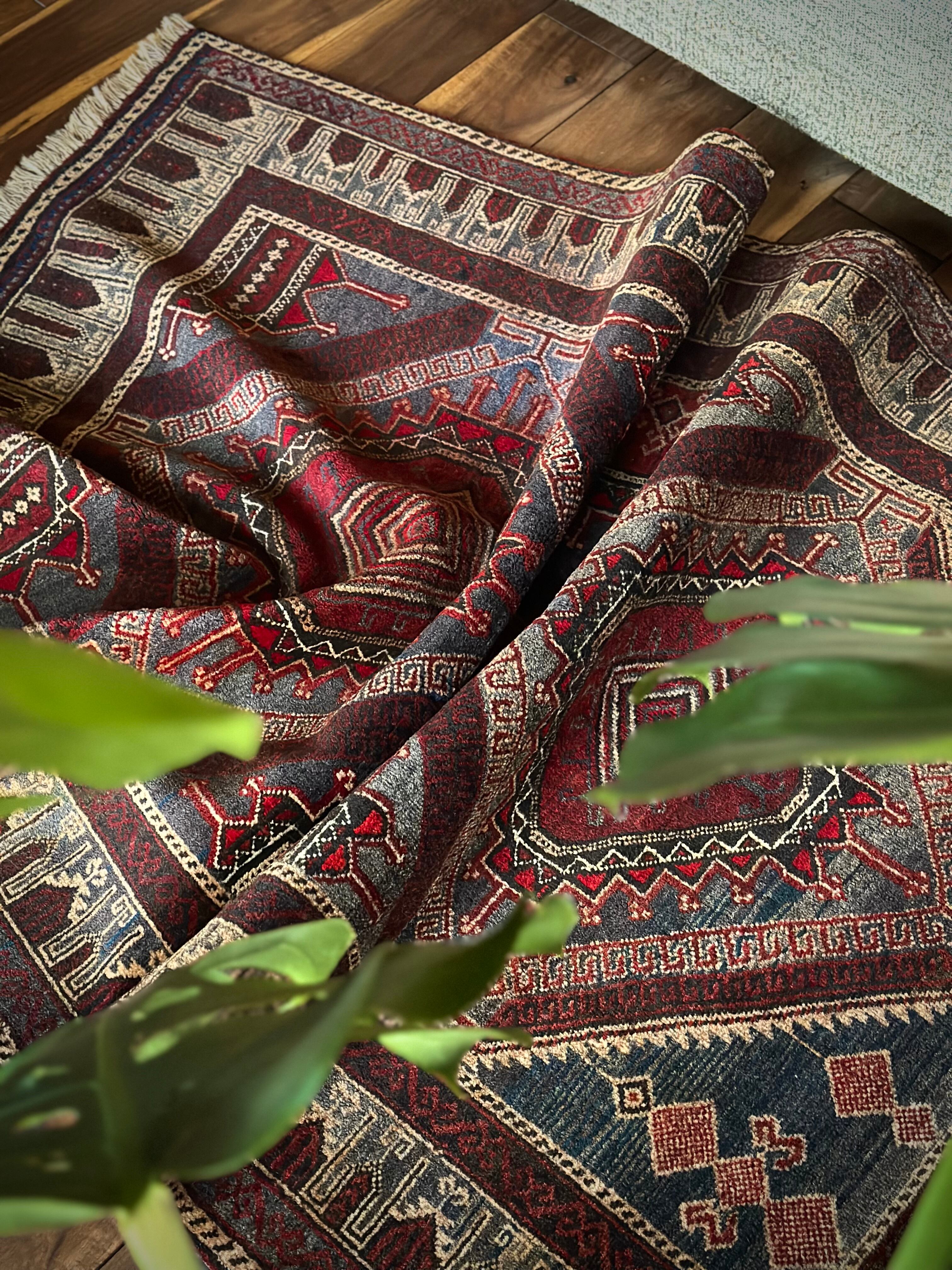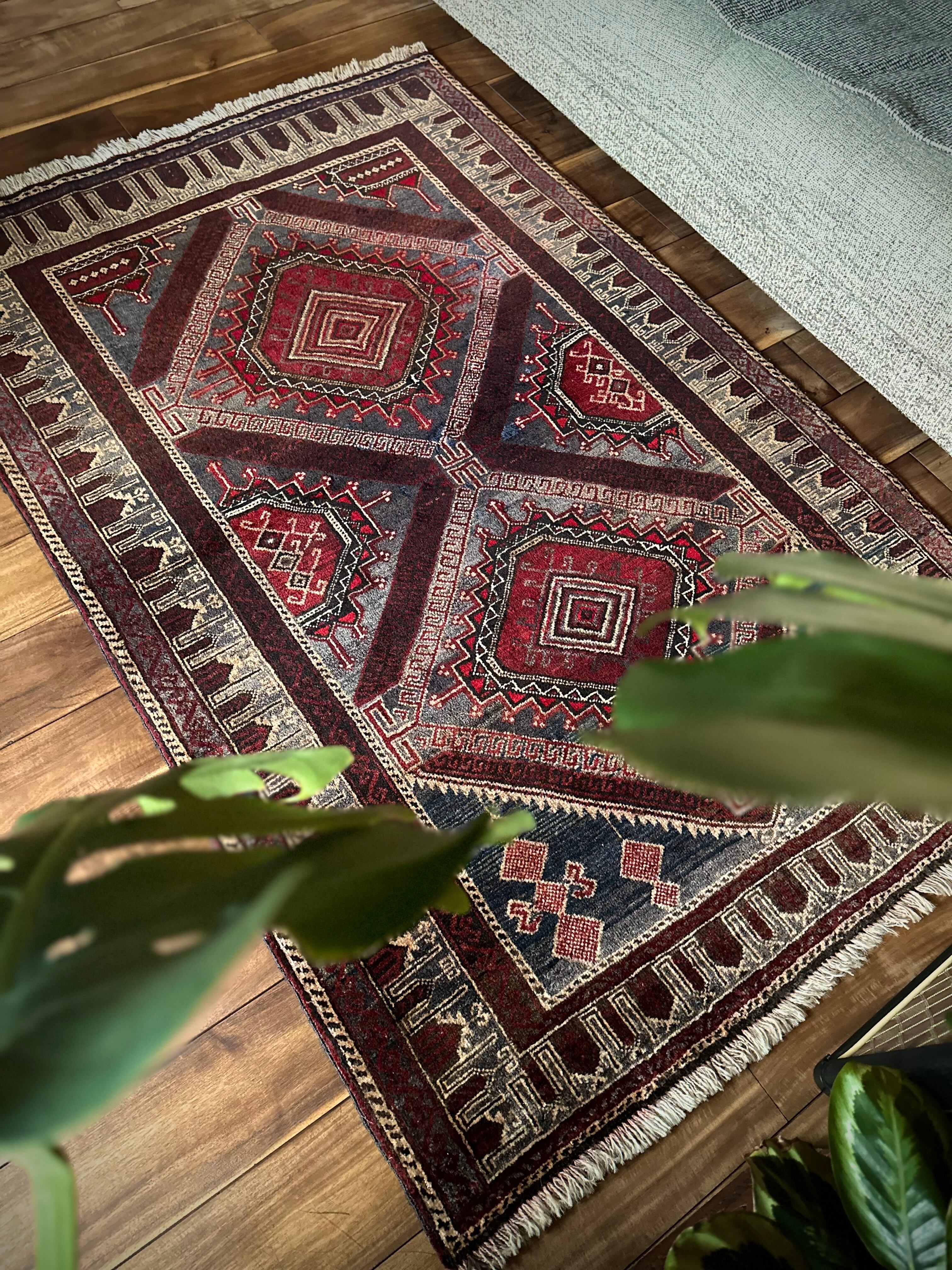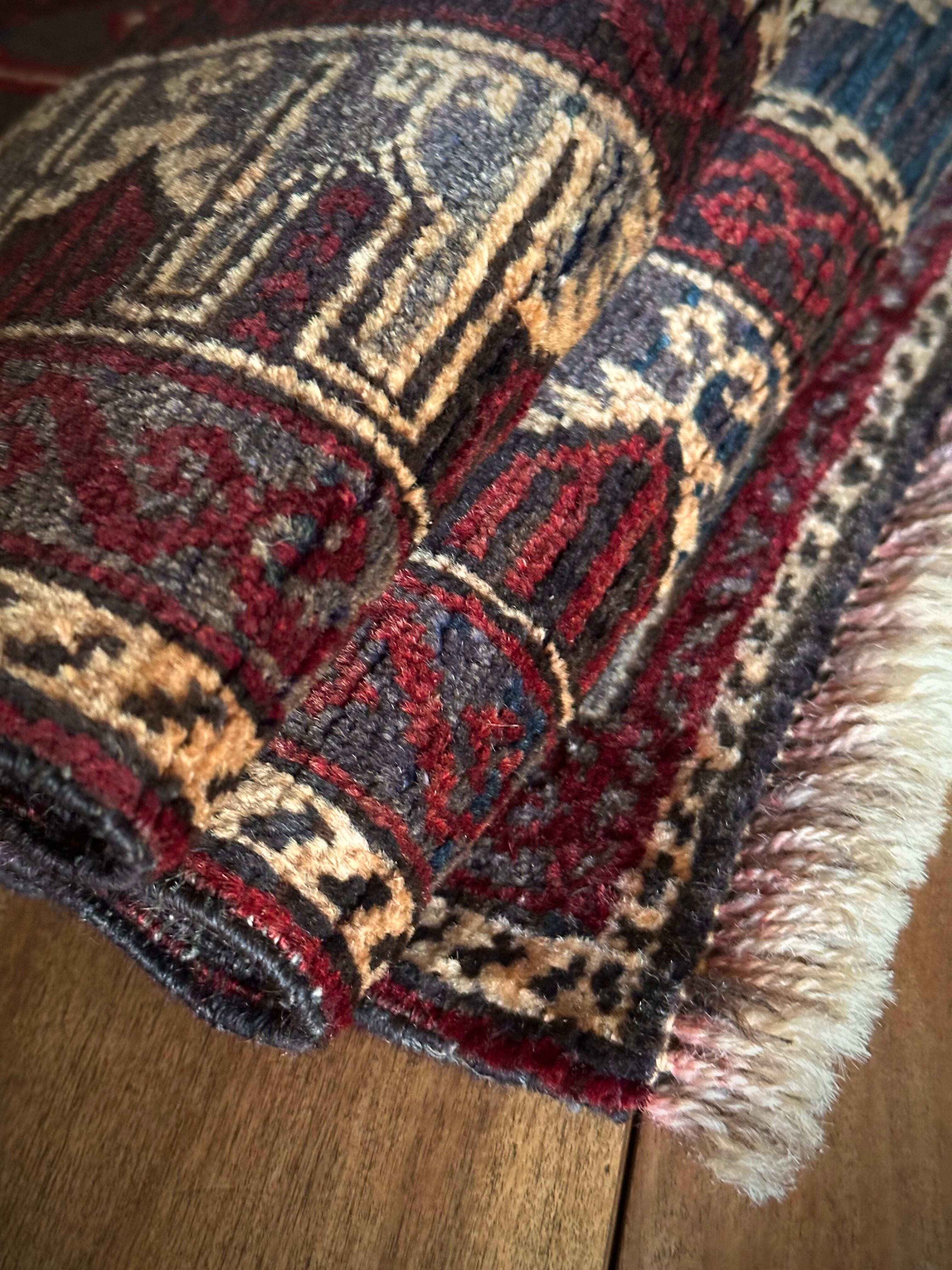グレーをベースにボルドーやレッドで印影をつけた色彩に、2連のメダリオンと細かなモスクが織り込まれたプレイヤーらしきこちらは、アフガニスタンはヘラート州に居住するバルーチ族のトライバルラグになります。