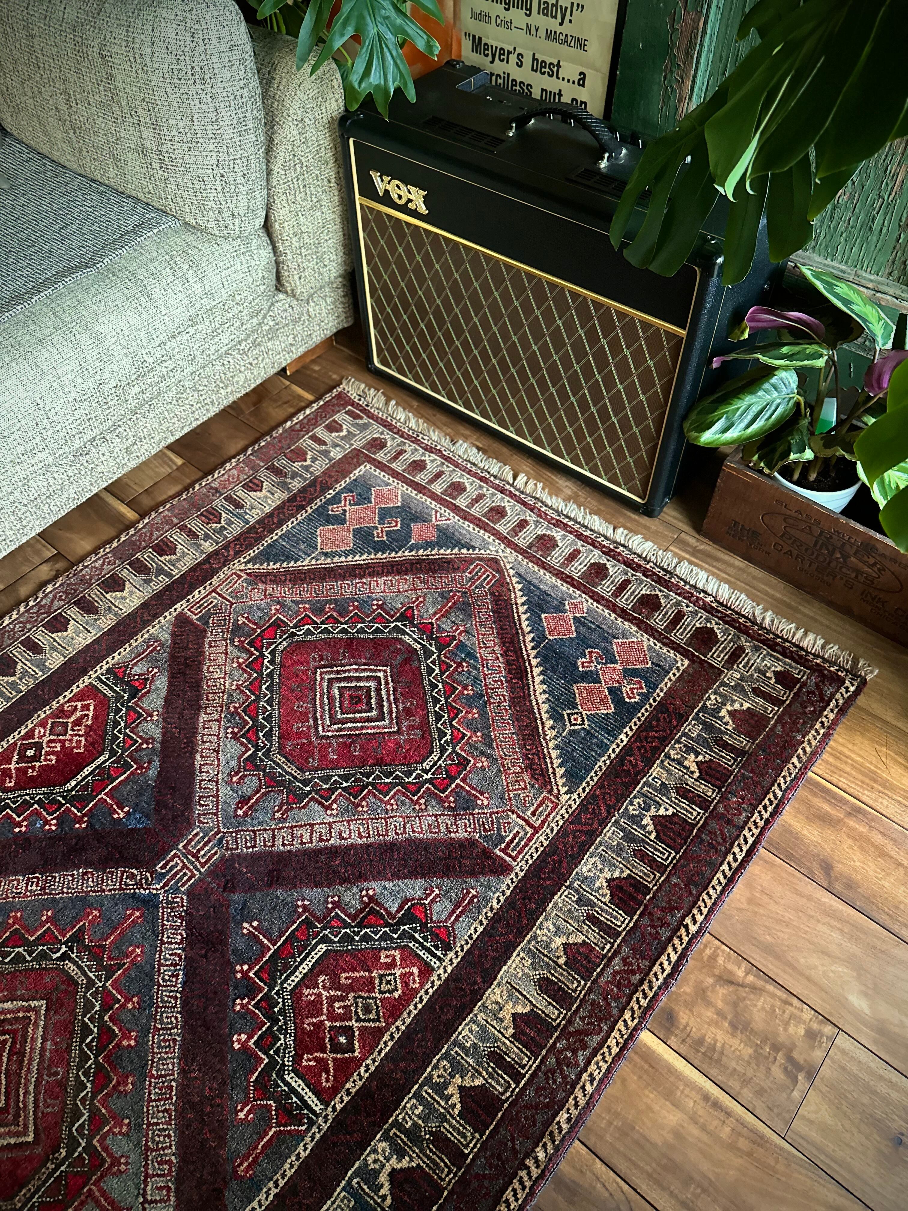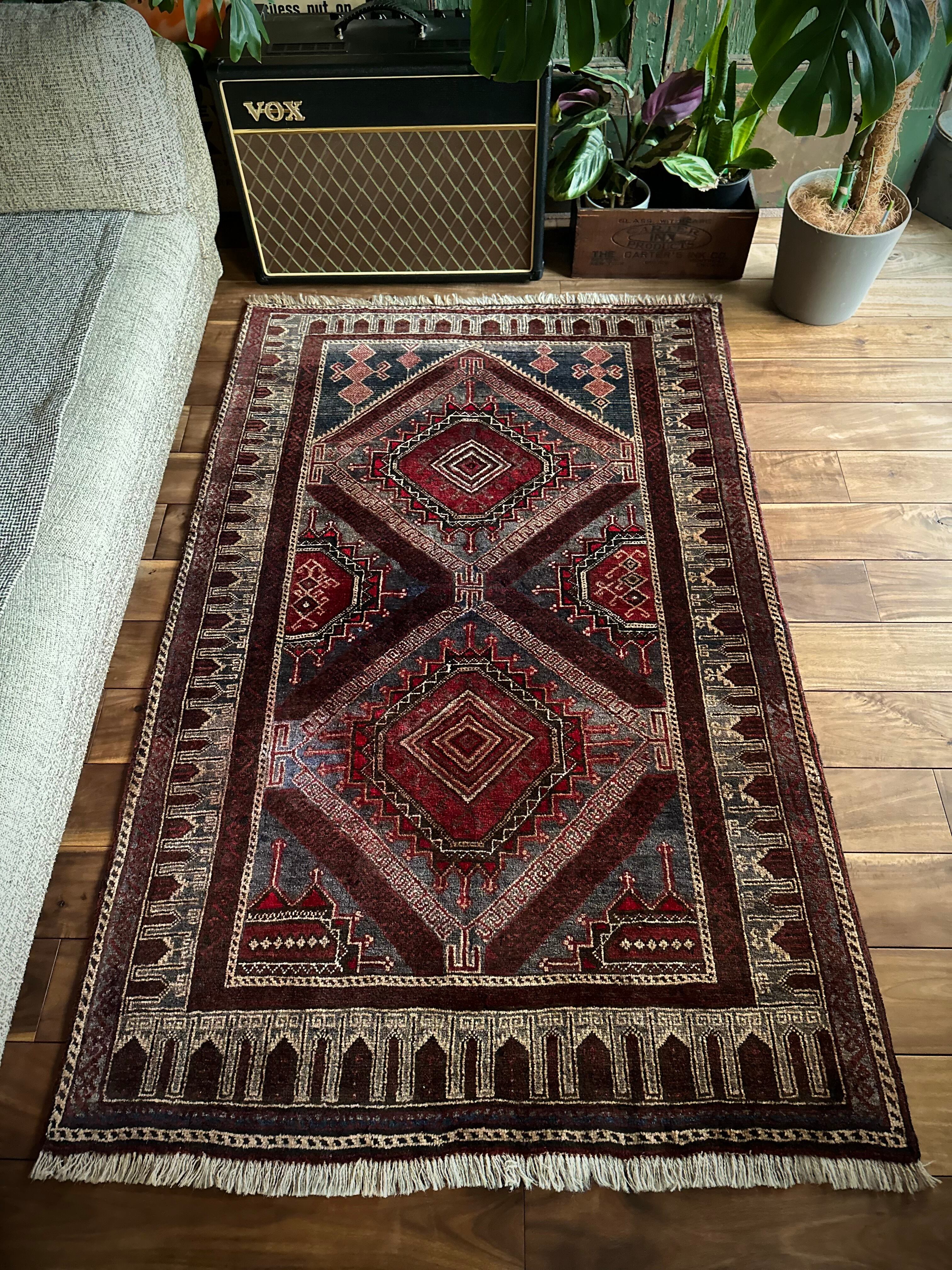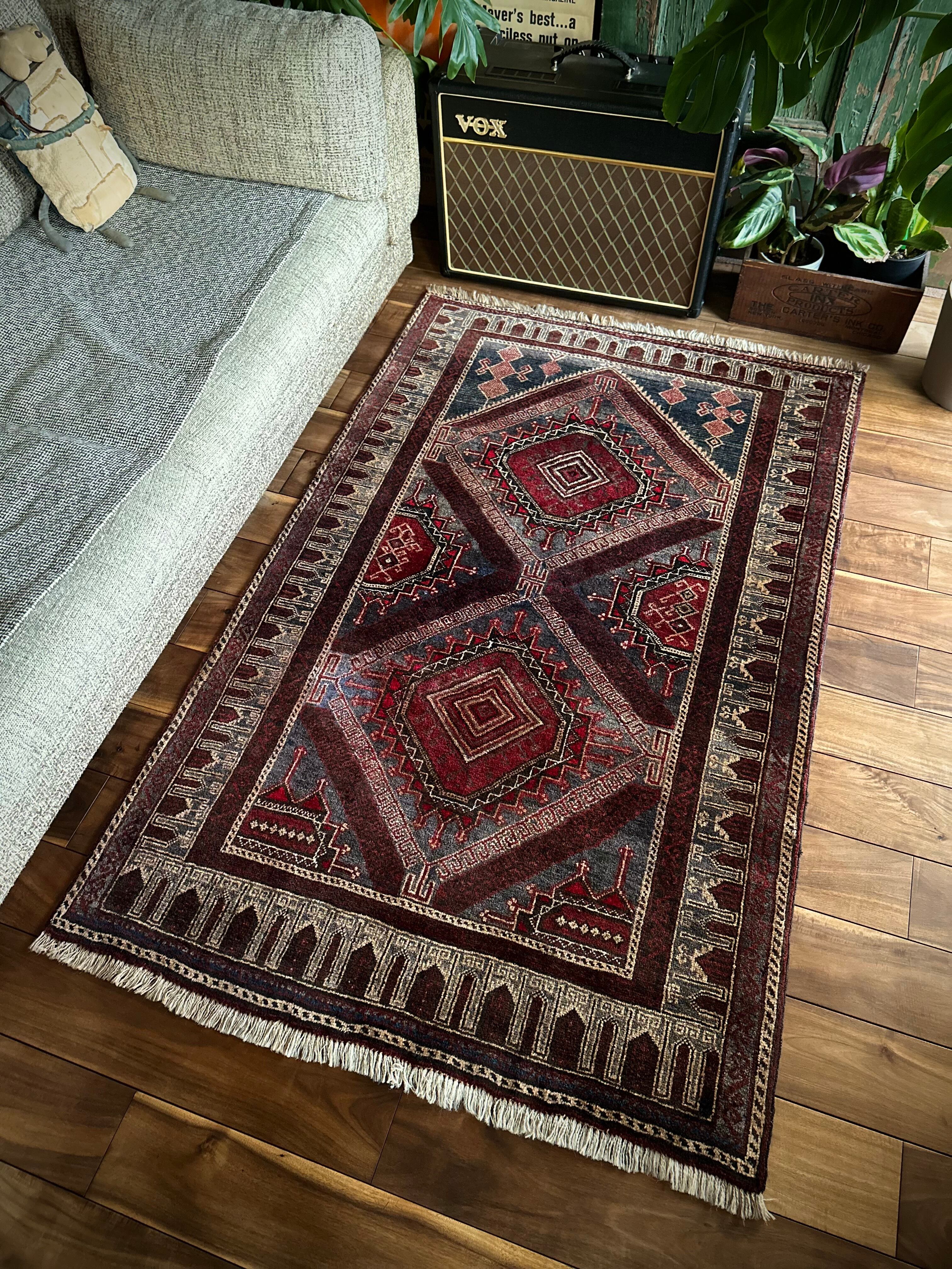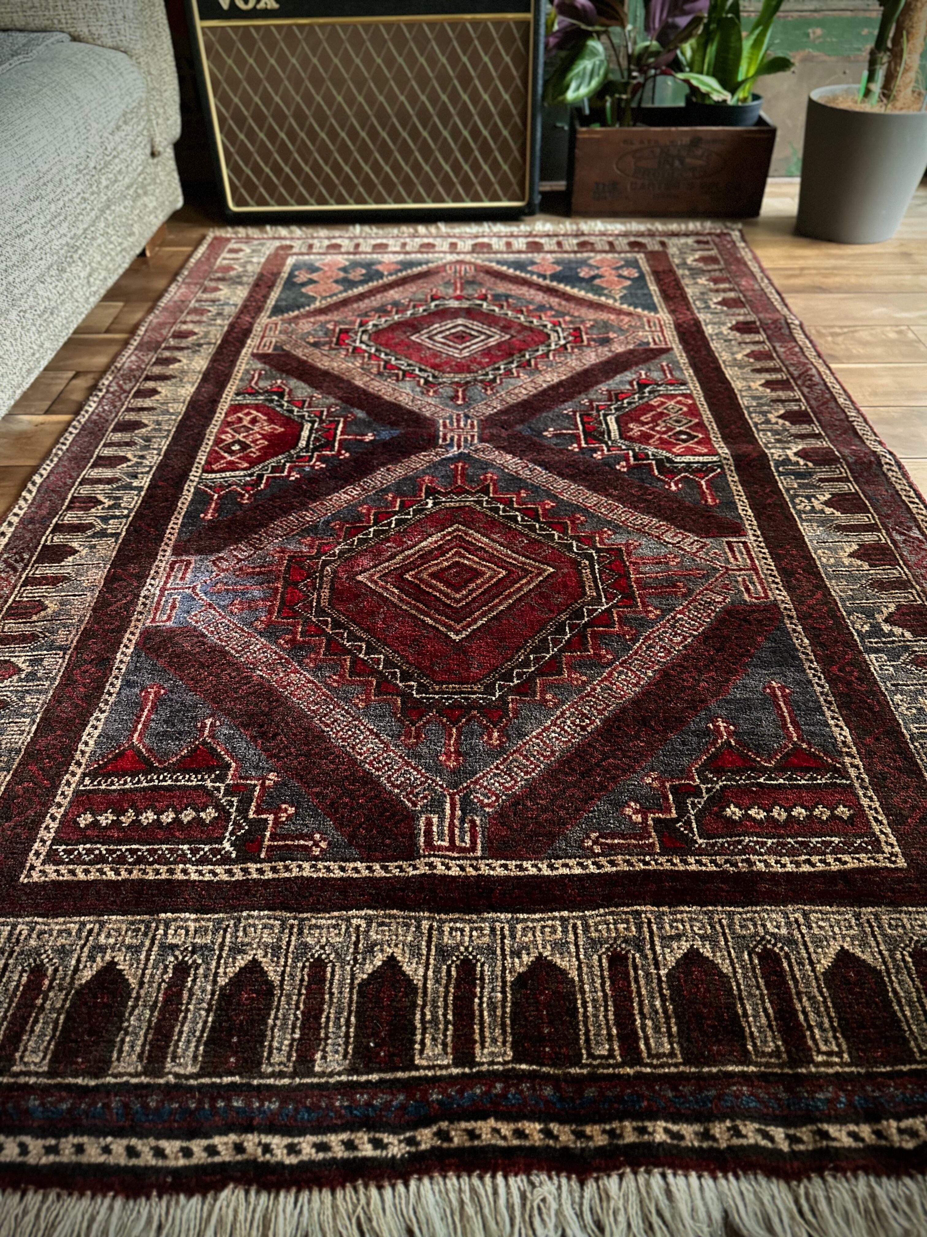 イラン産では味わえないなんともアフガン産バルーチらしい色合いで泥臭さを感じる1枚でしょうか。祈祷用のプレイヤーラグ故に持ち運びやすいように薄手で織られていて、大きさとしては2人掛けソファ前やミュージシャン気取りなギターアンプ前に敷いても様になるサイズ感となります。