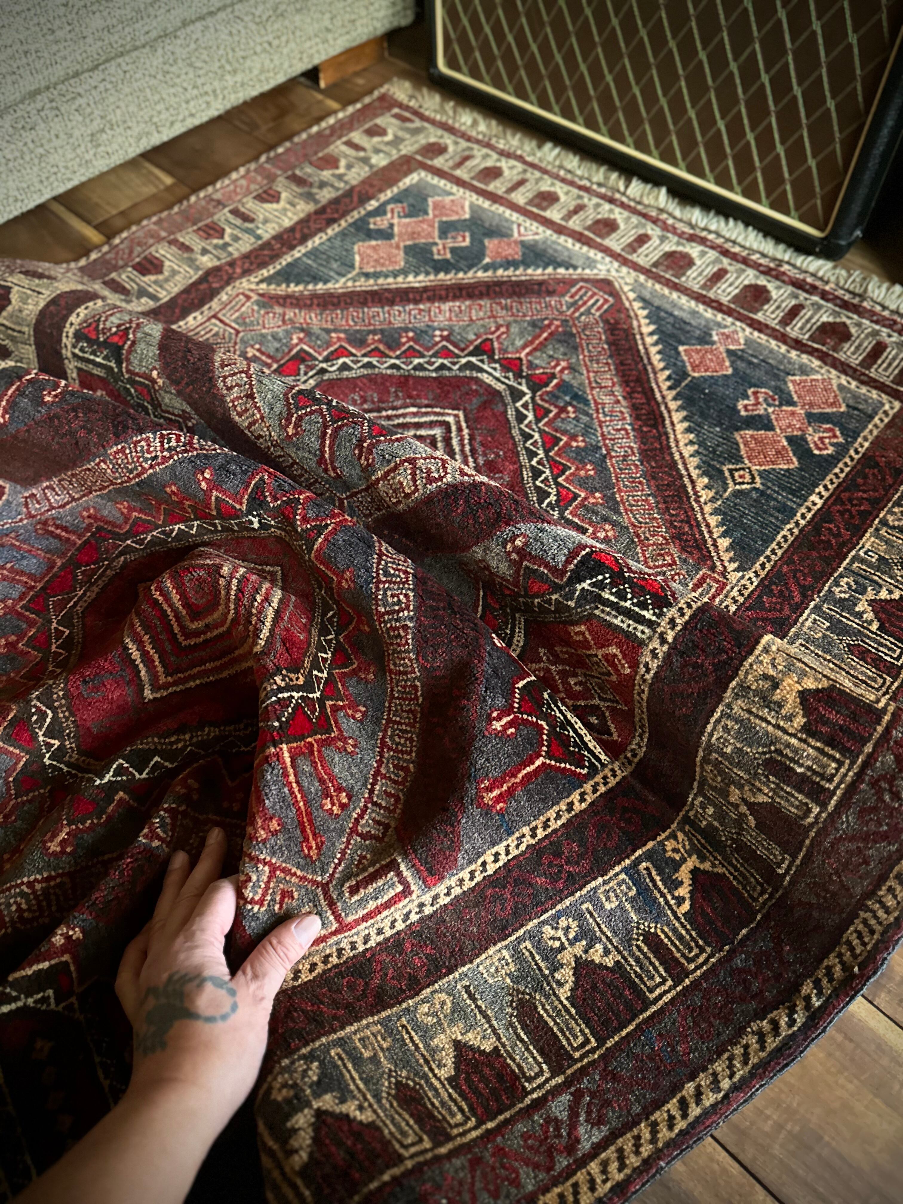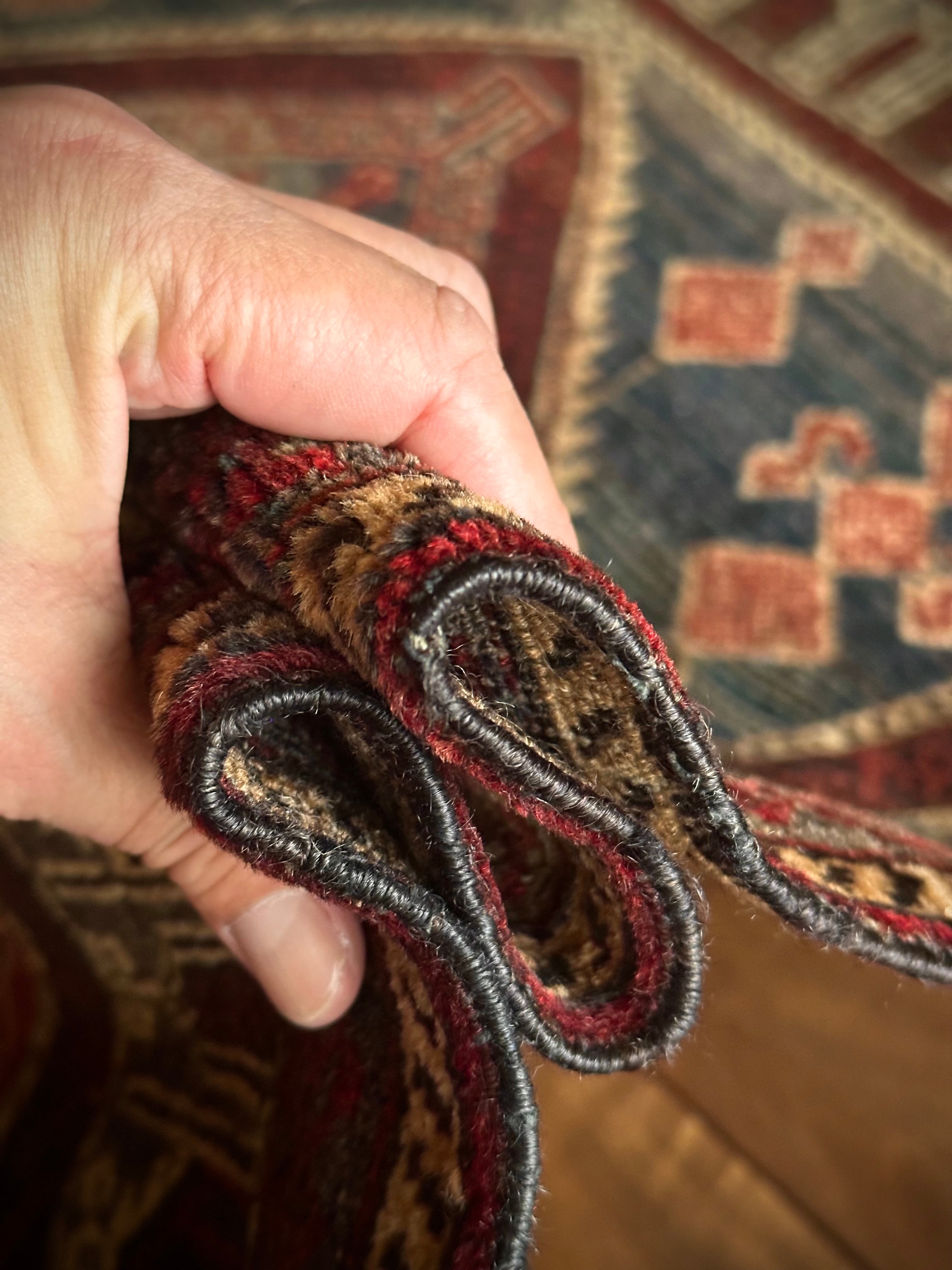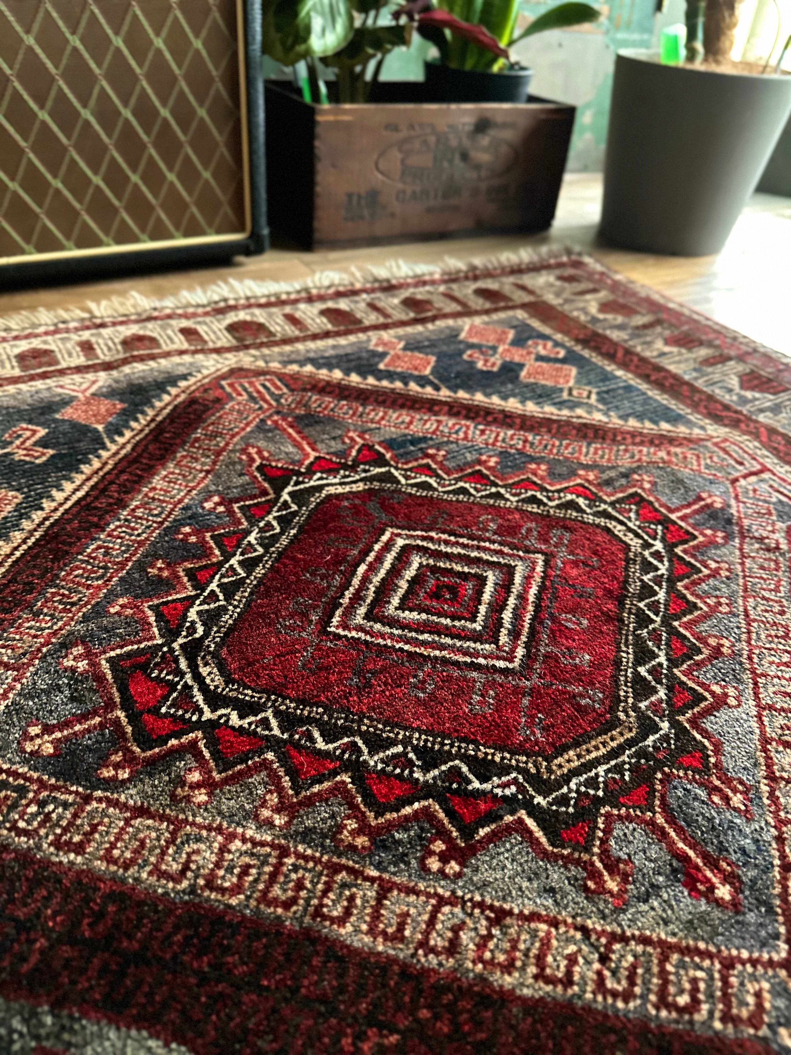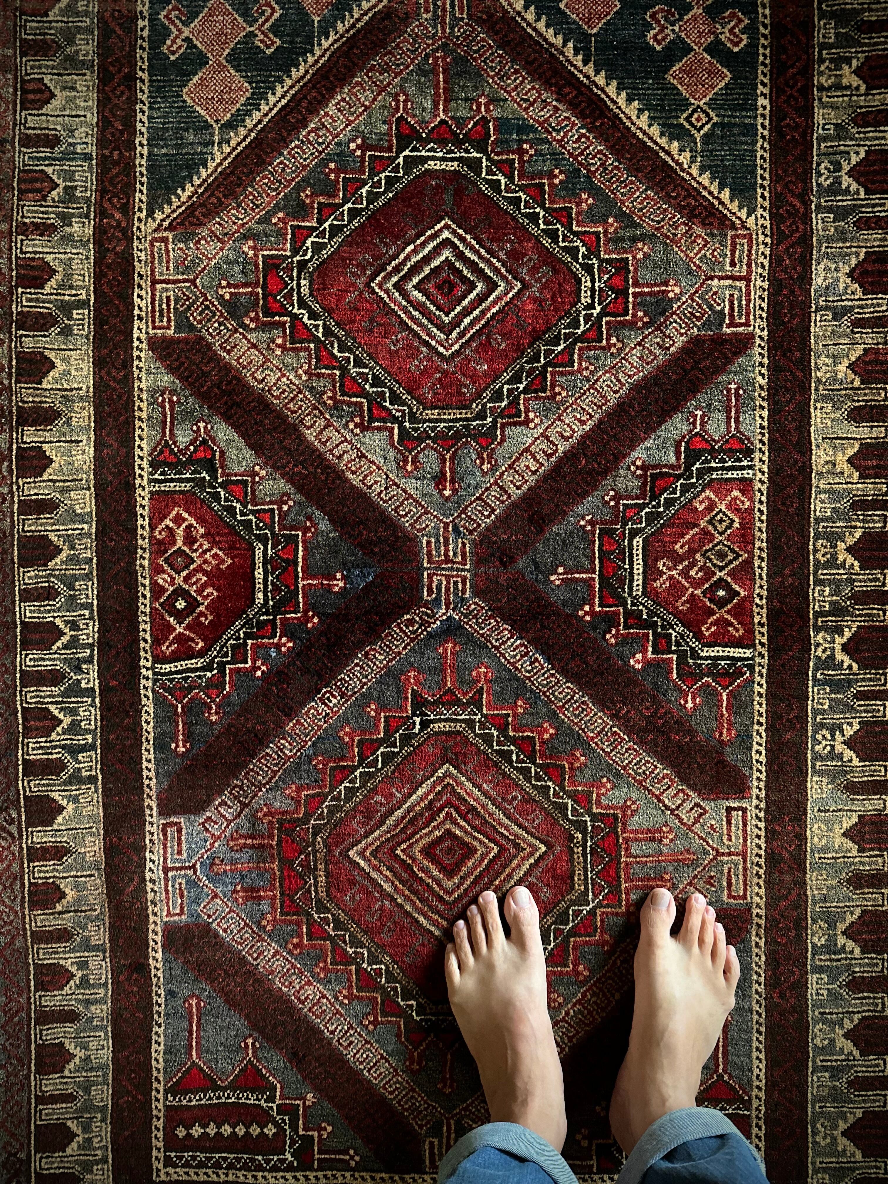 イラン産では味わえないなんともアフガン産バルーチらしい色合いで泥臭さを感じる1枚でしょうか。祈祷用のプレイヤーラグ故に持ち運びやすいように薄手で織られていて、大きさとしては2人掛けソファ前やミュージシャン気取りなギターアンプ前に敷いても様になるサイズ感となります。