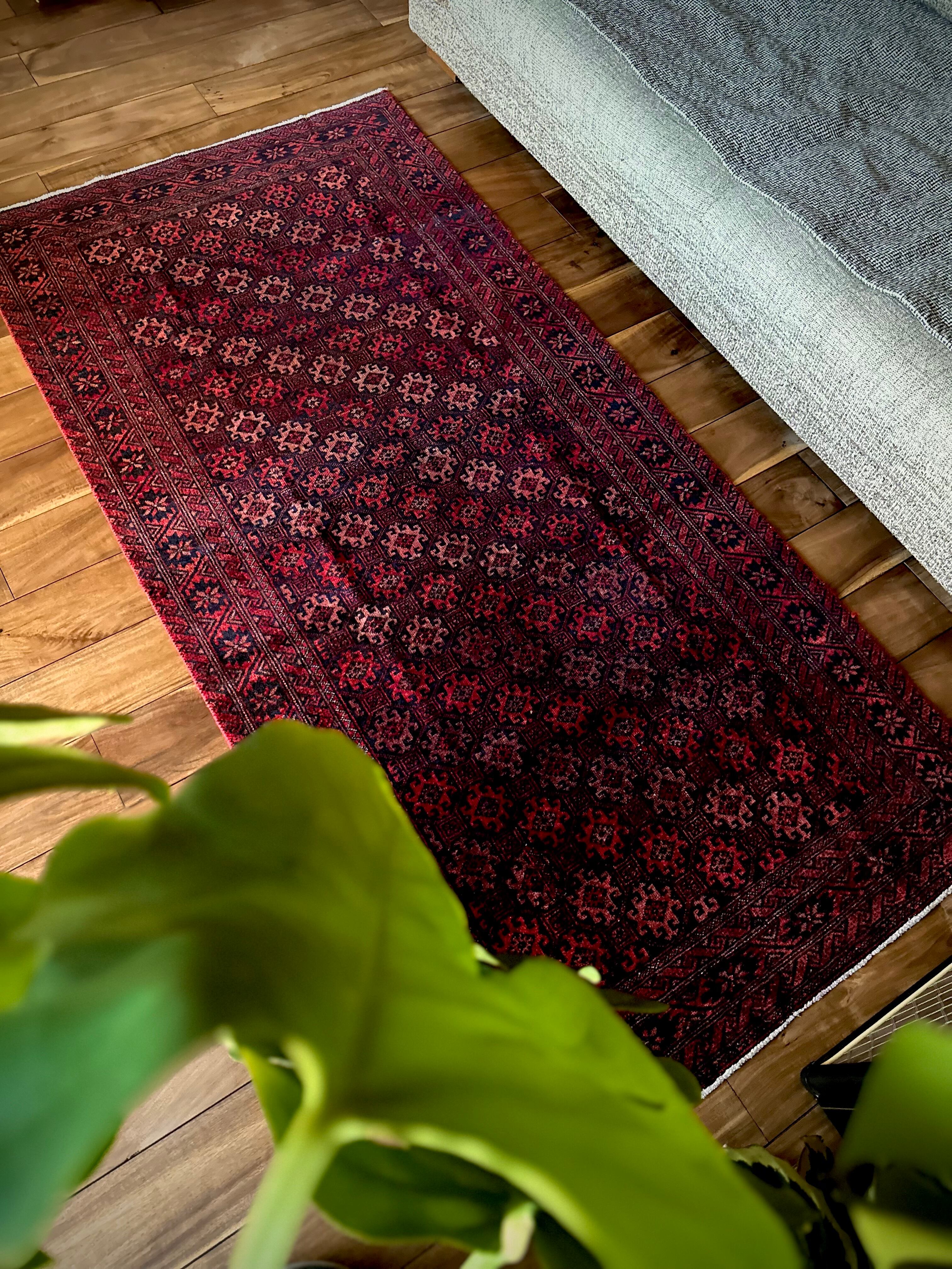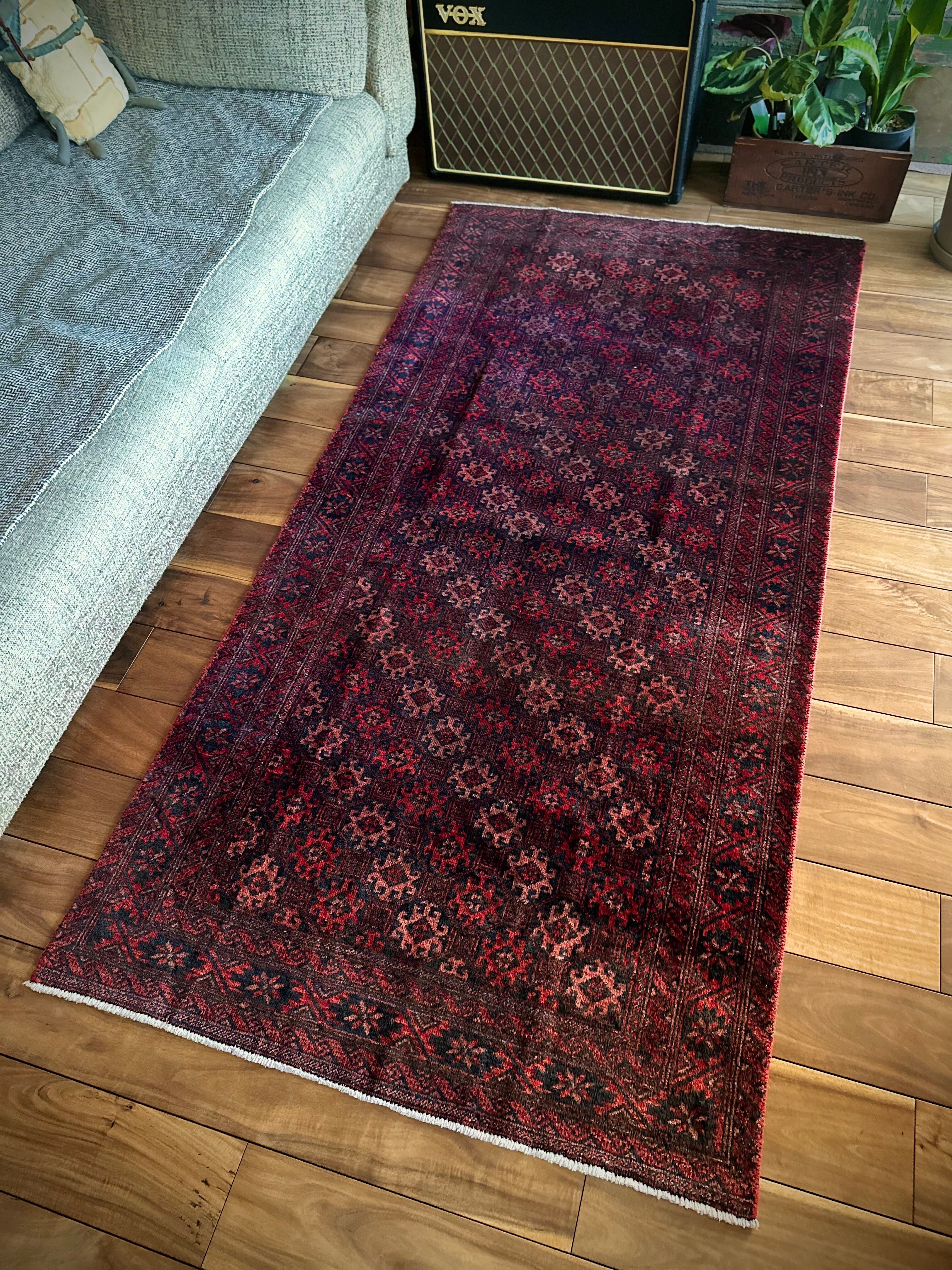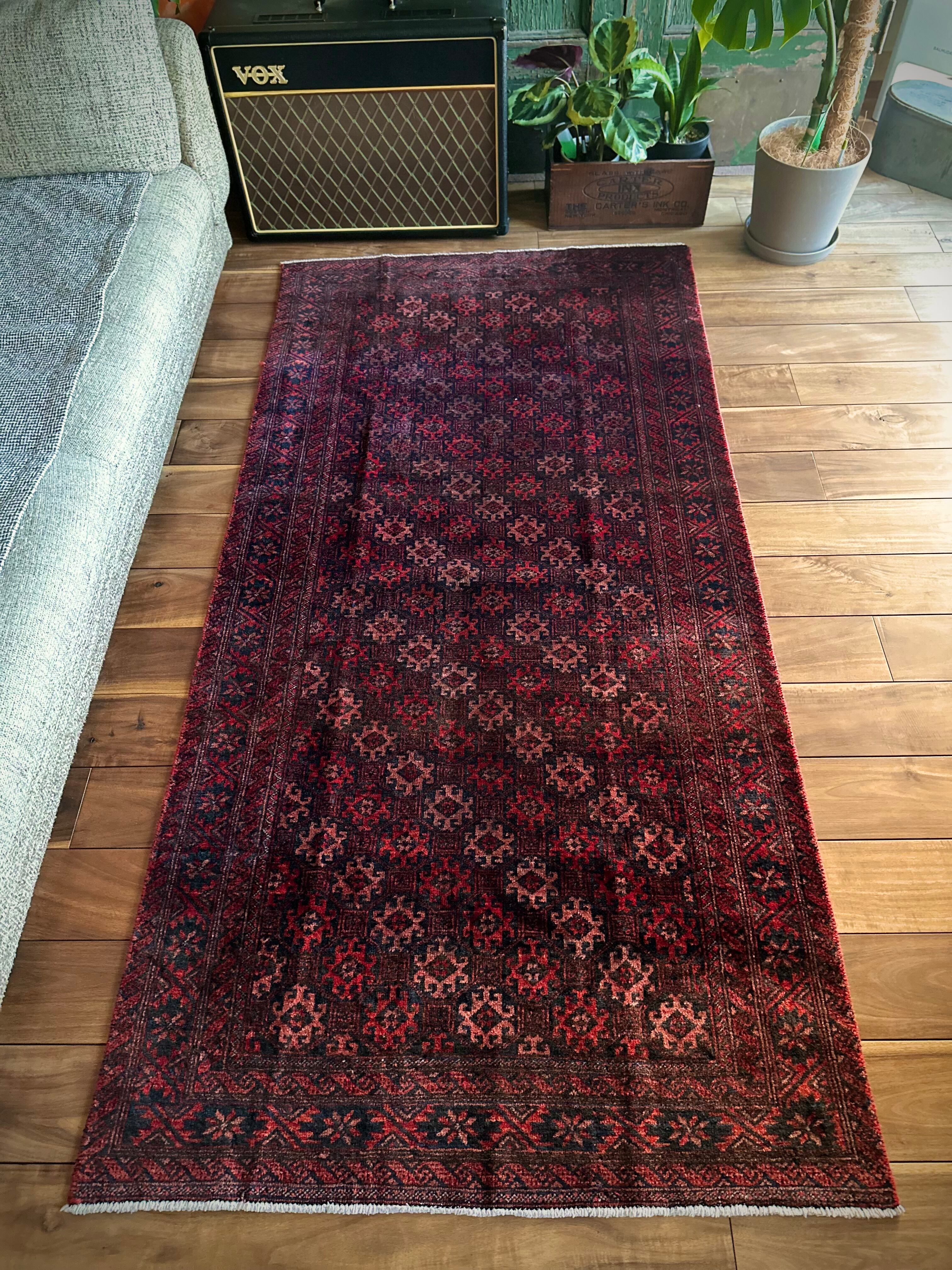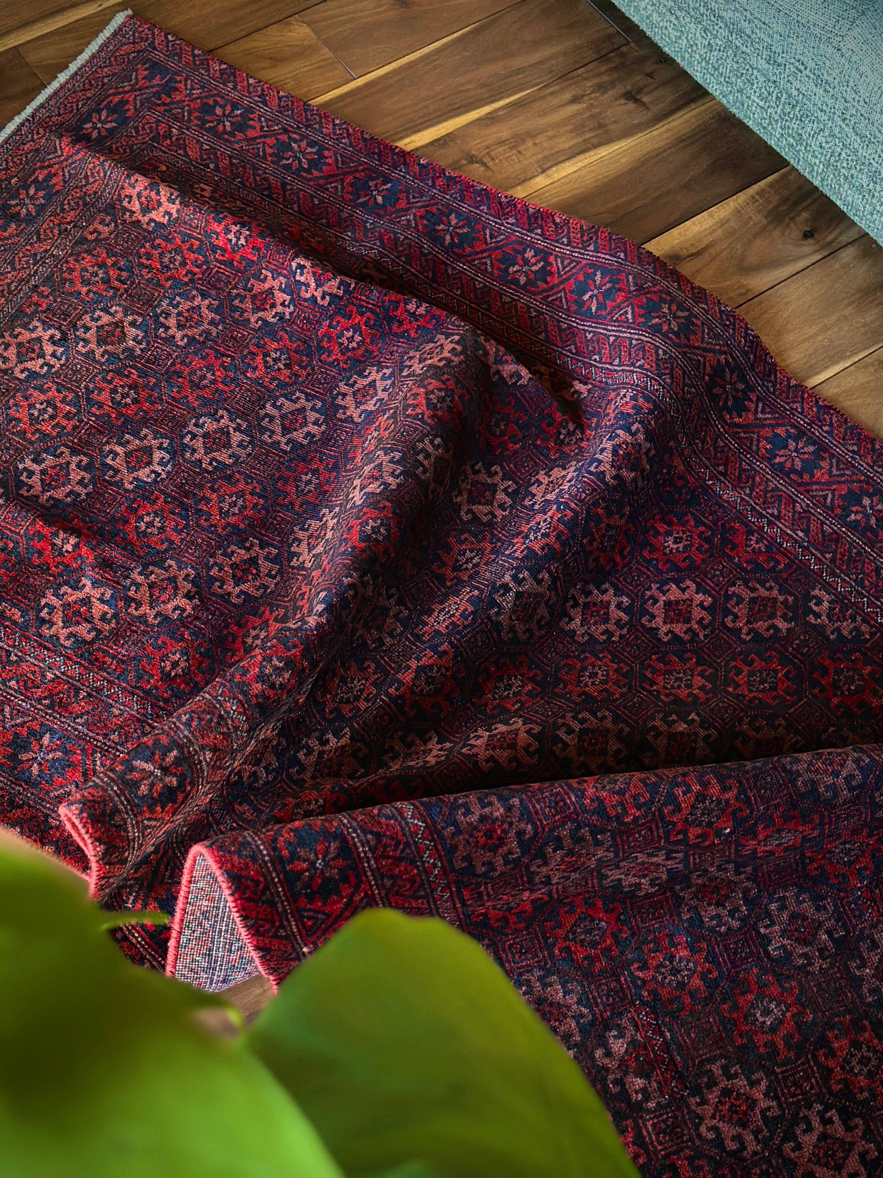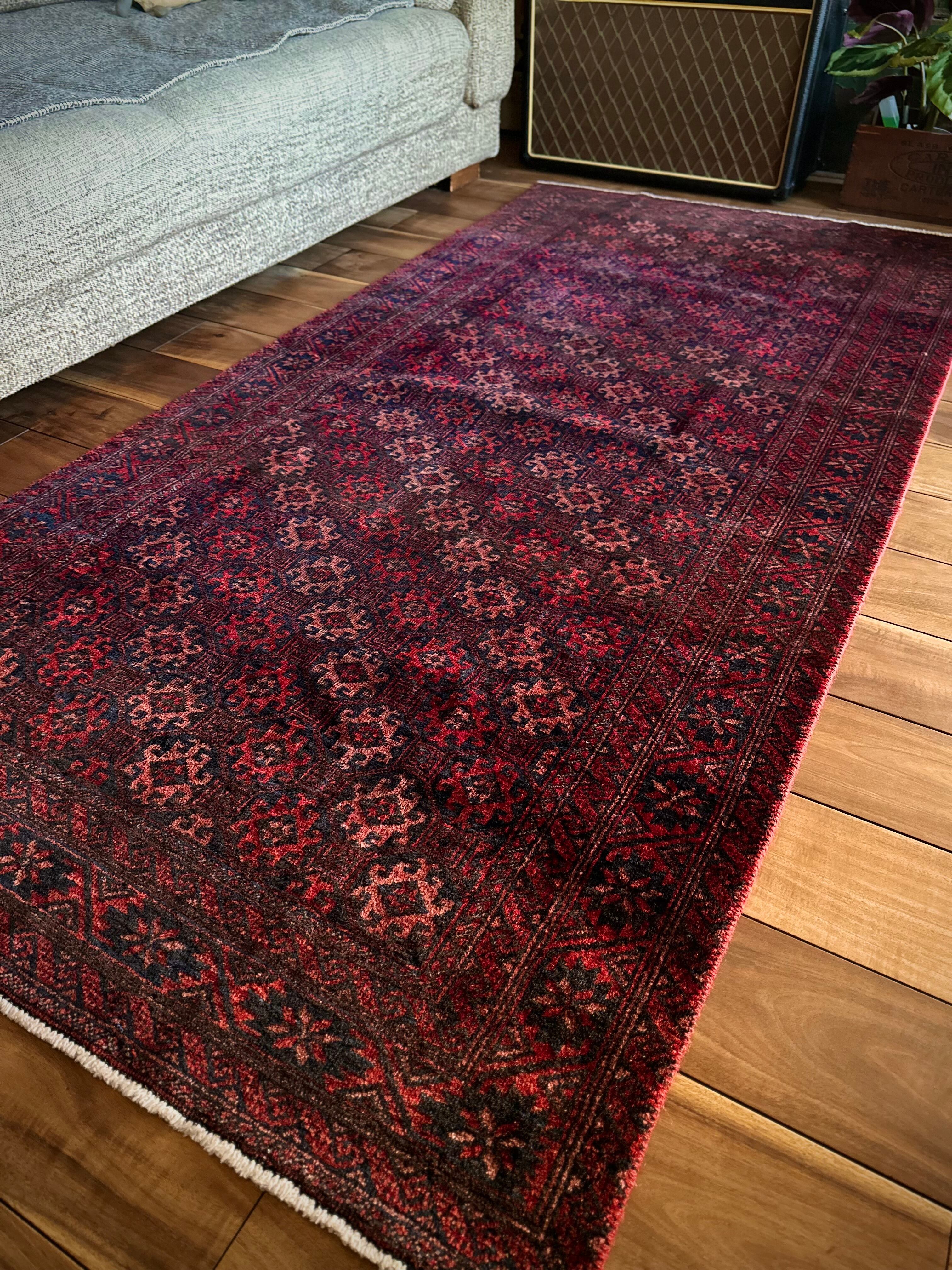 真紅に染まったフィールドの連続紋様に、バイアスにあしらわれたグラデーションの配色がシンプルでいてかっこいい、イラン東部のマシュハド近郊に居住するバルーチ族のトライバルラグになります。