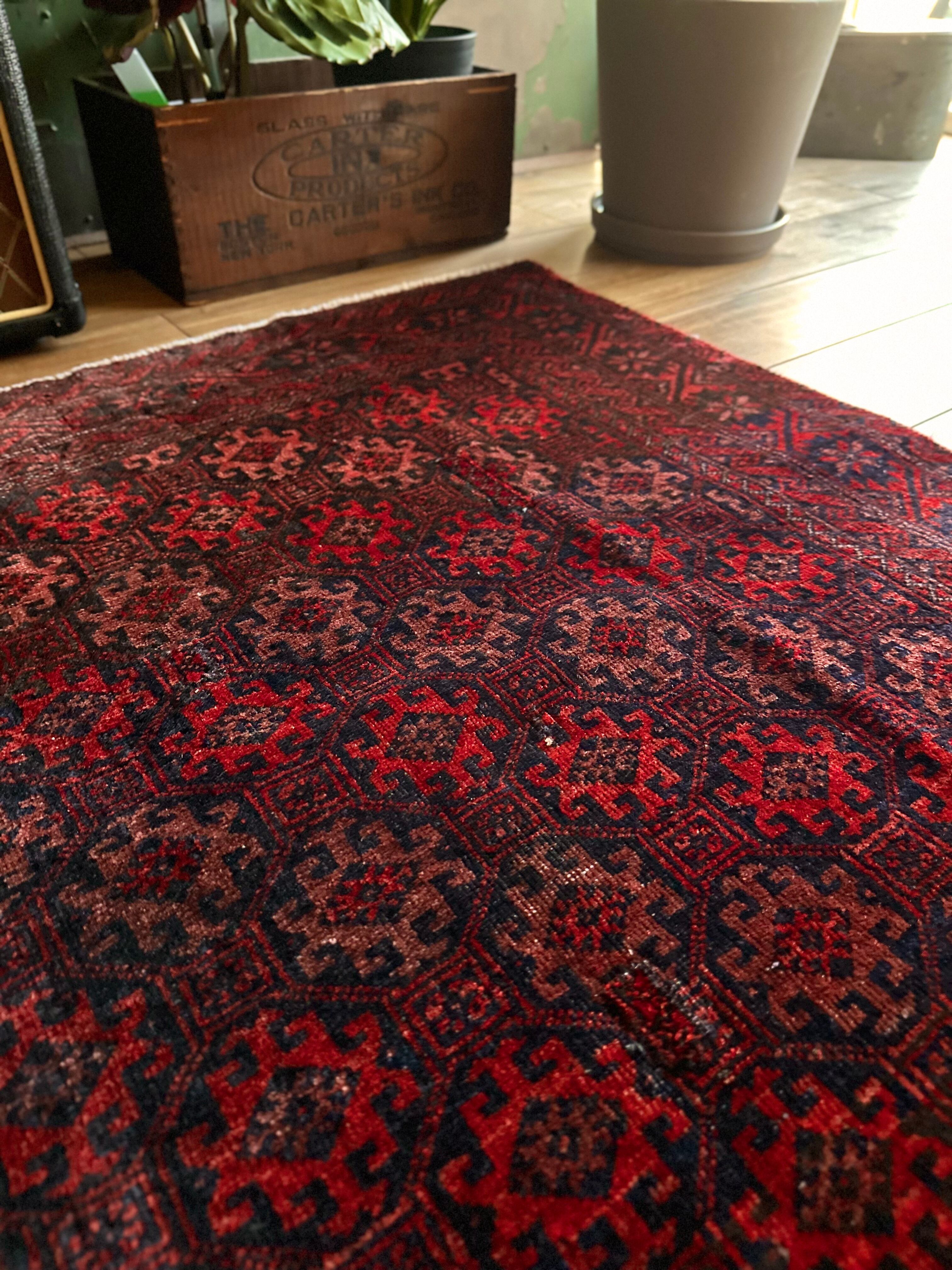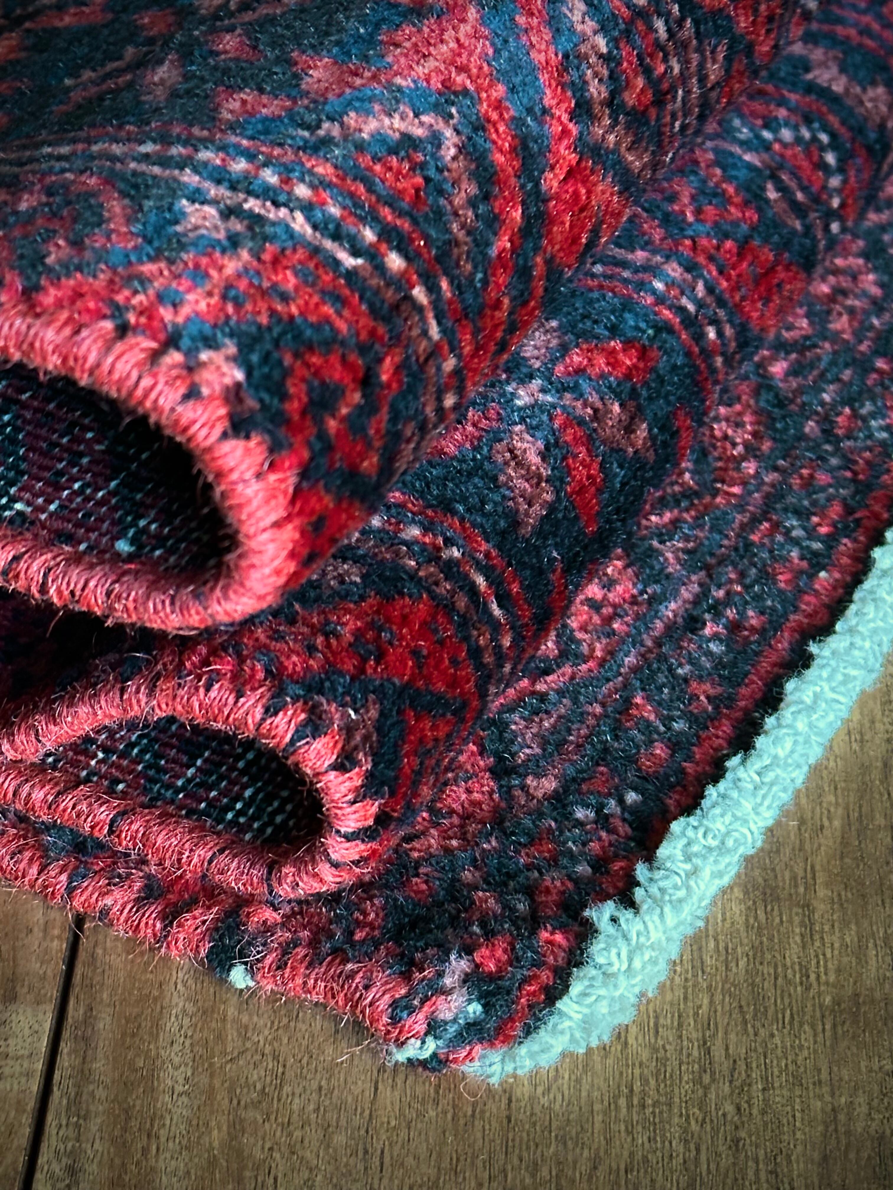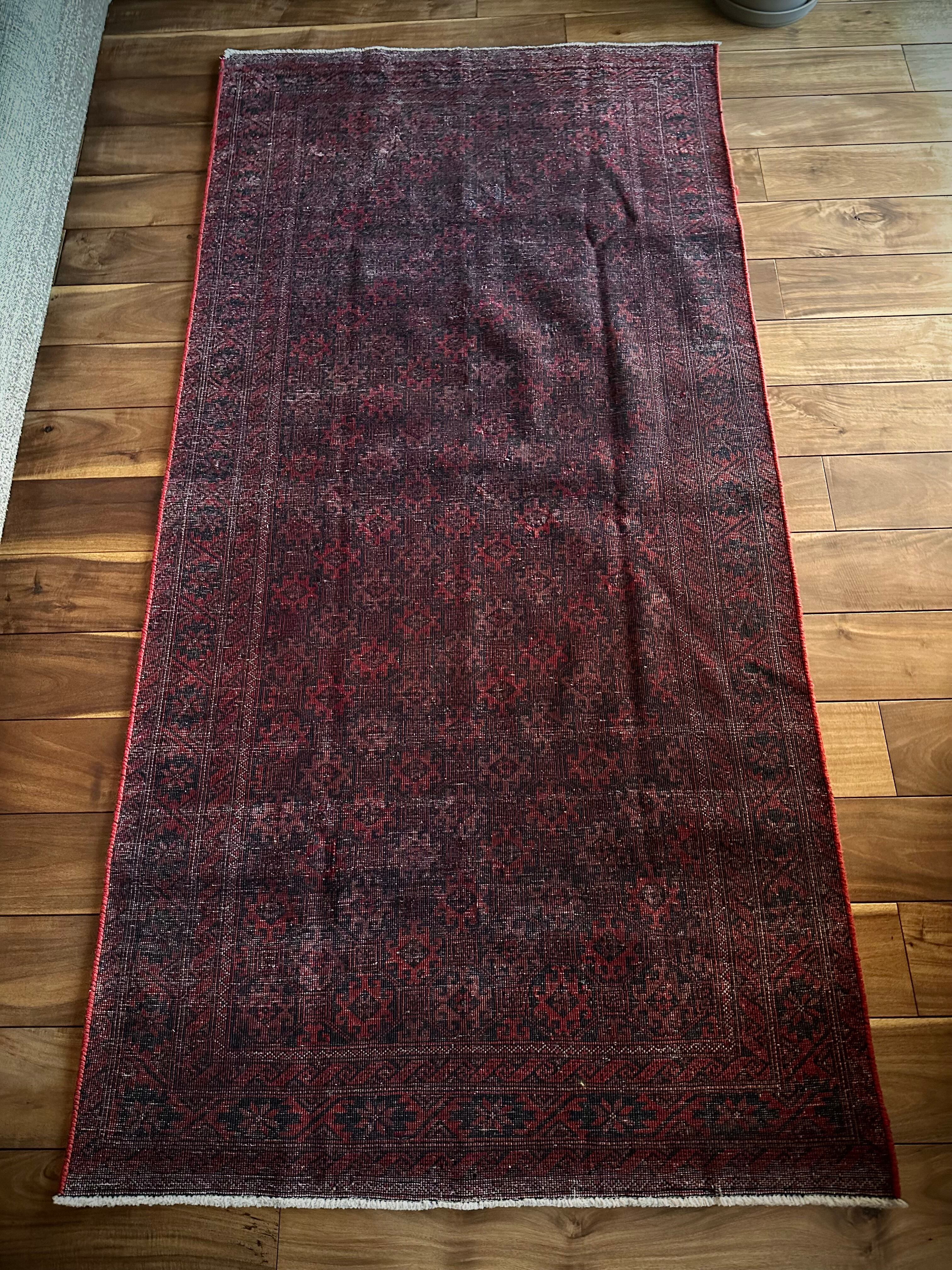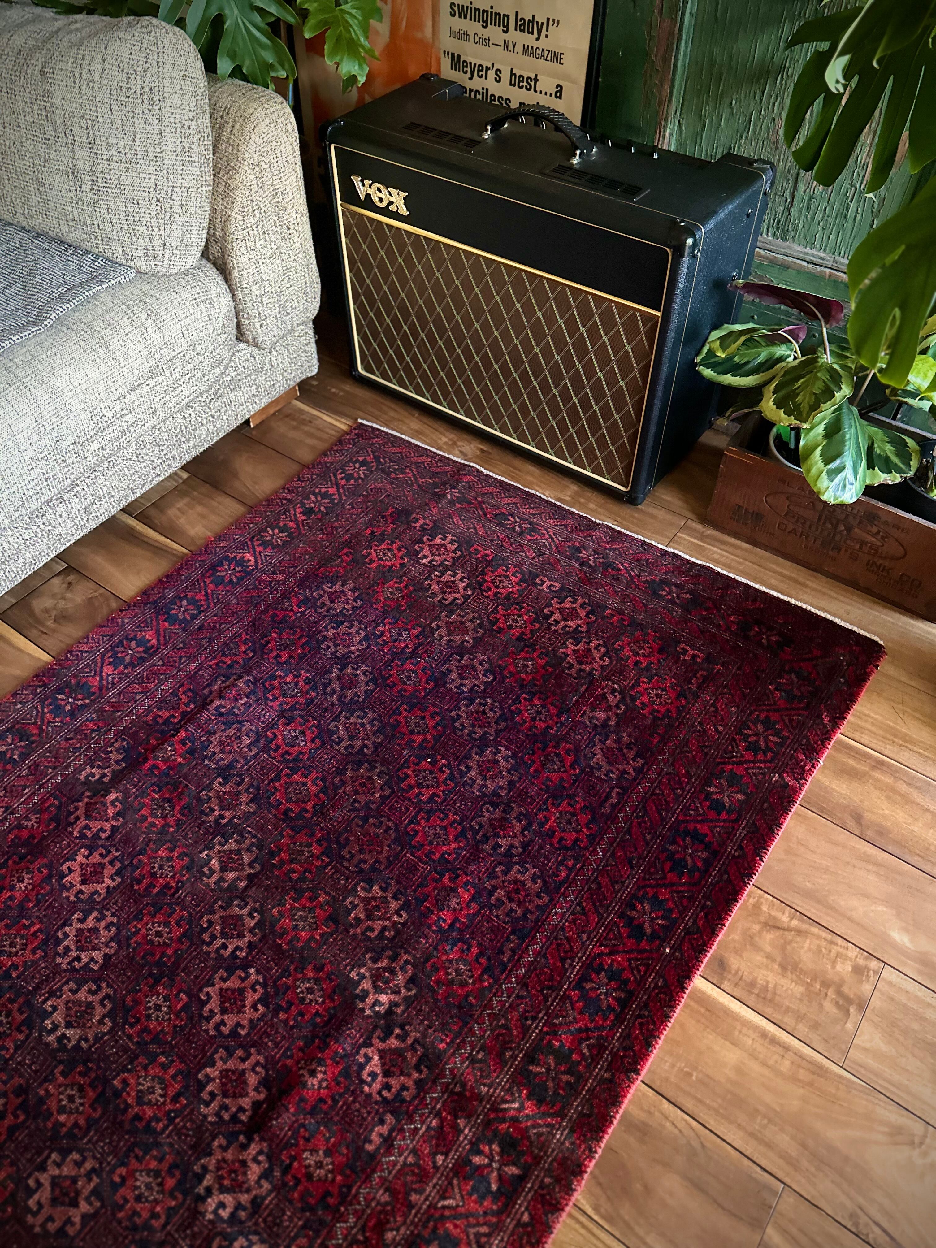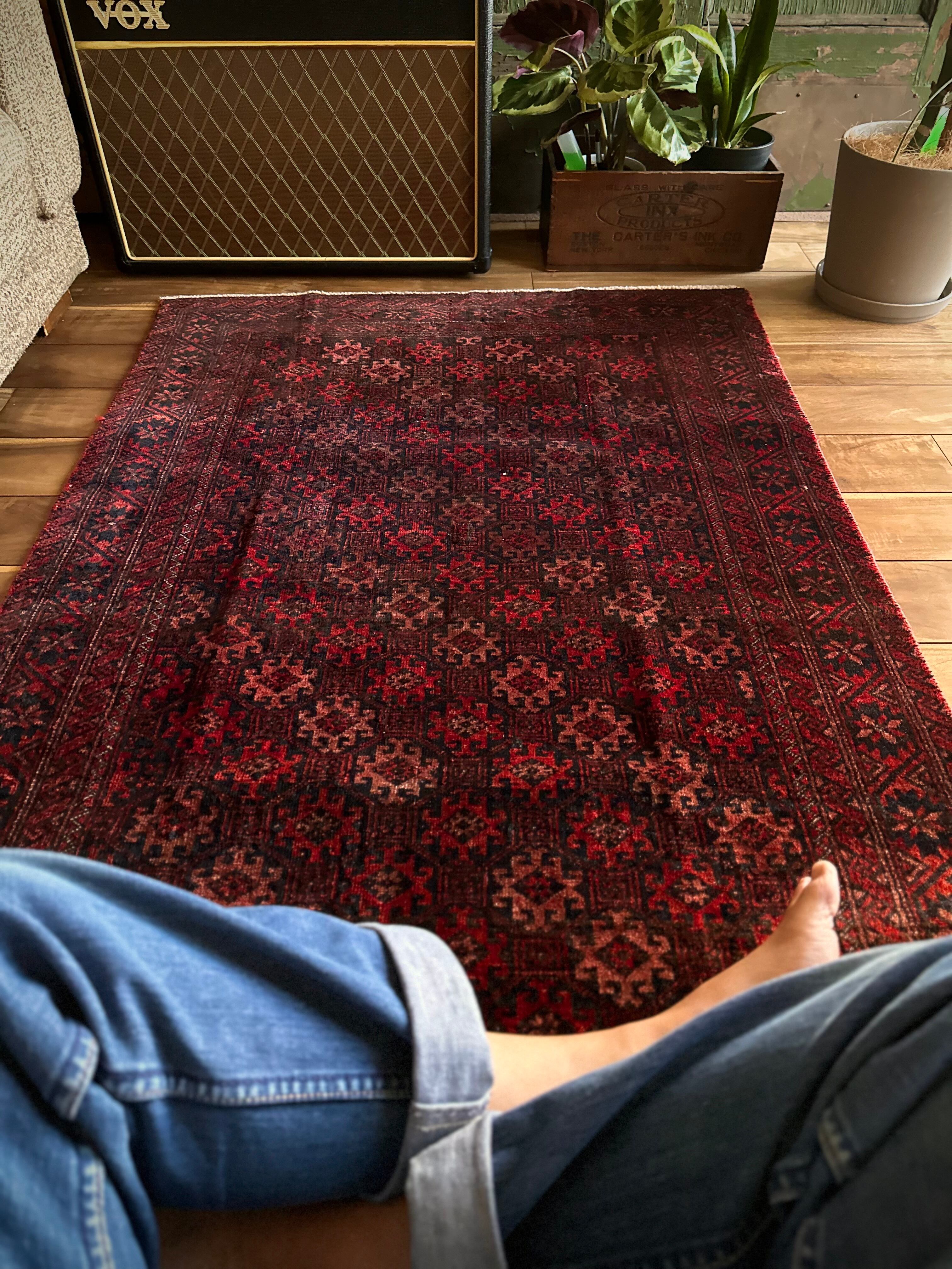 真紅に染まったフィールドの連続紋様に、バイアスにあしらわれたグラデーションの配色がシンプルでいてかっこいい、イラン東部のマシュハド近郊に居住するバルーチ族のトライバルラグになります。