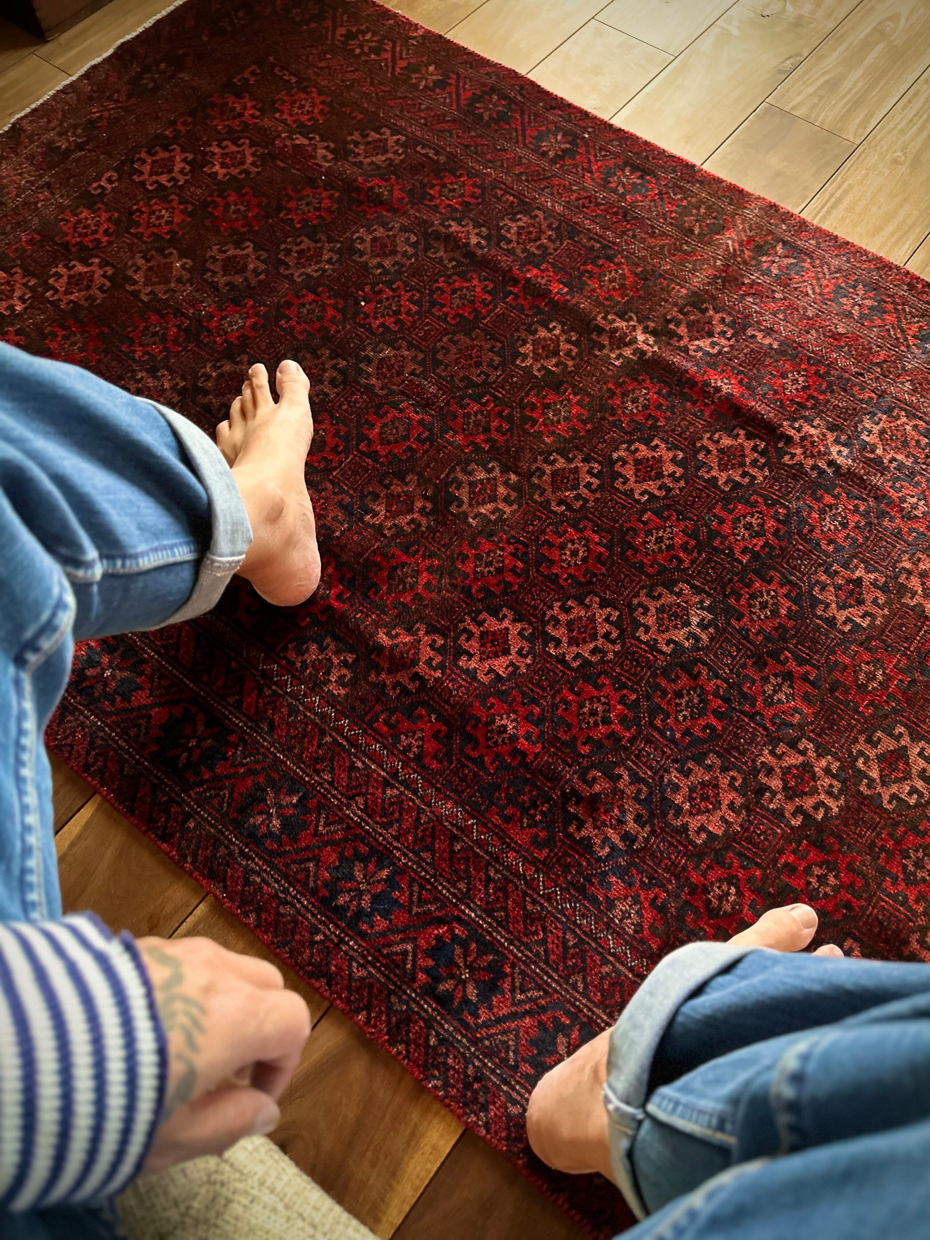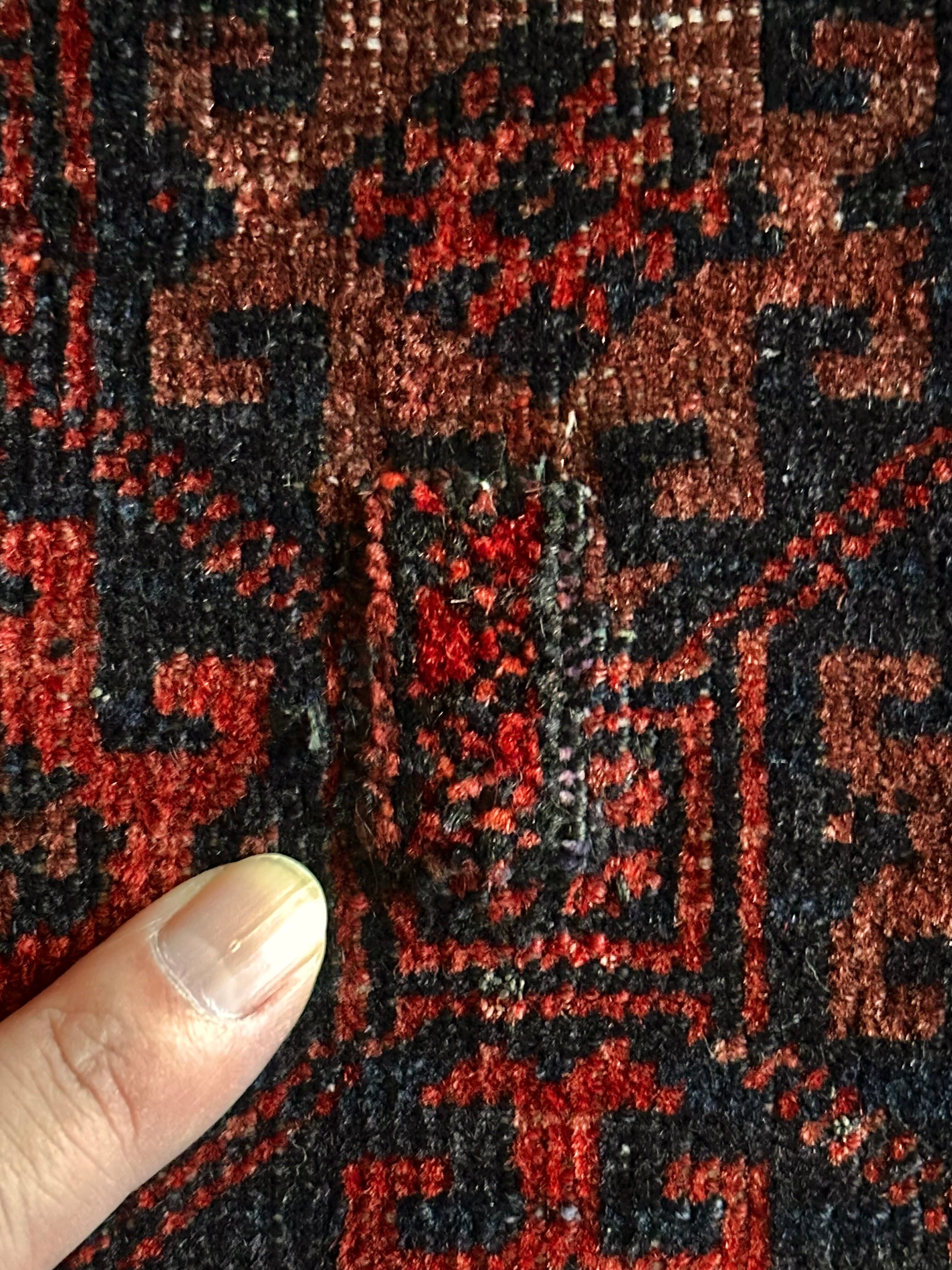 如何にもイラン産バルーチらしいガシッとした織りで、大きさ的にもよくあるシングル・サイズとなり、3人掛けソファ前やベッドサイドに適したサイズ感の1枚で、パイル自体はかなり短めになりますがサラッとした肌触りでチクチク感はありません。