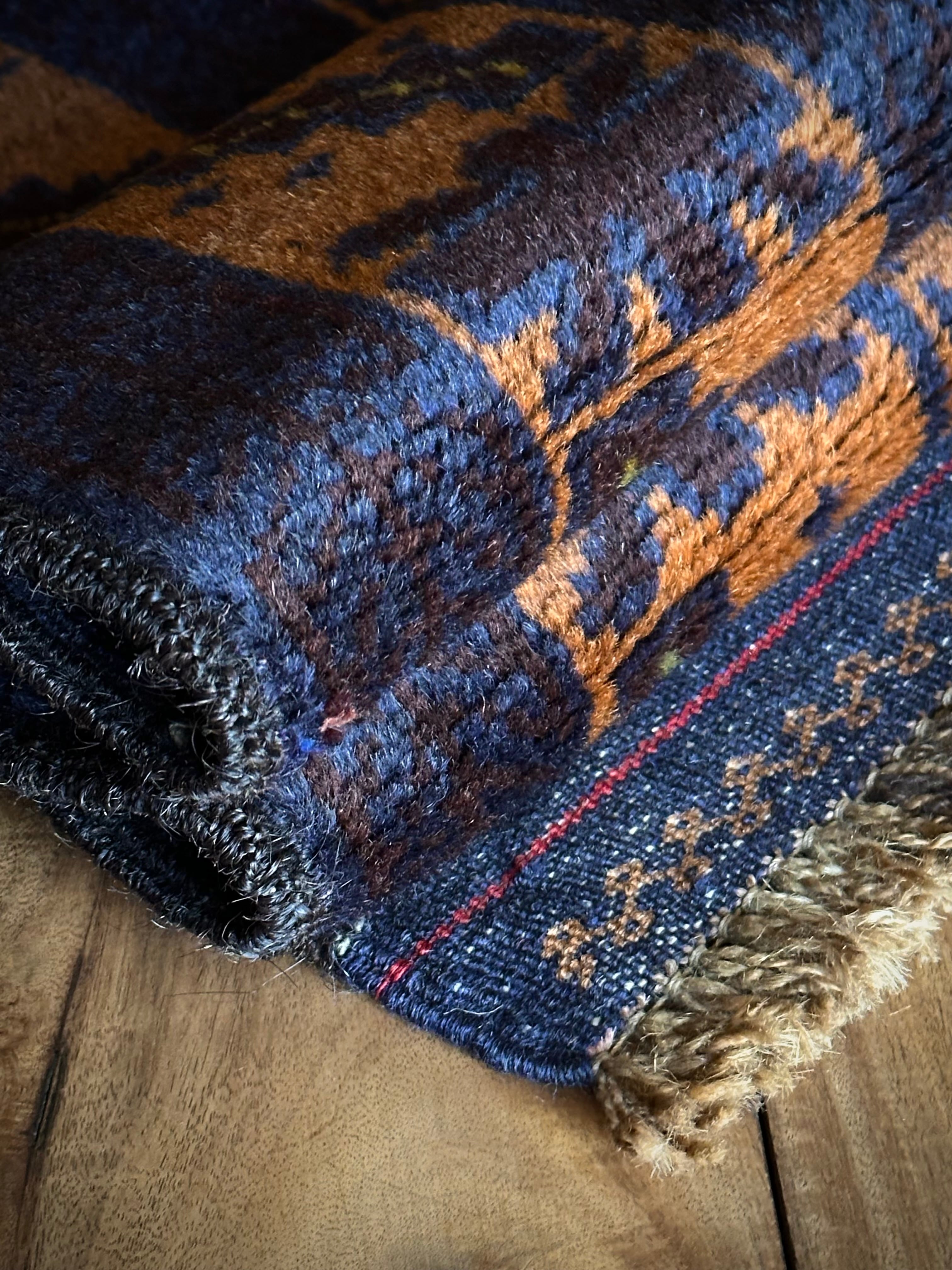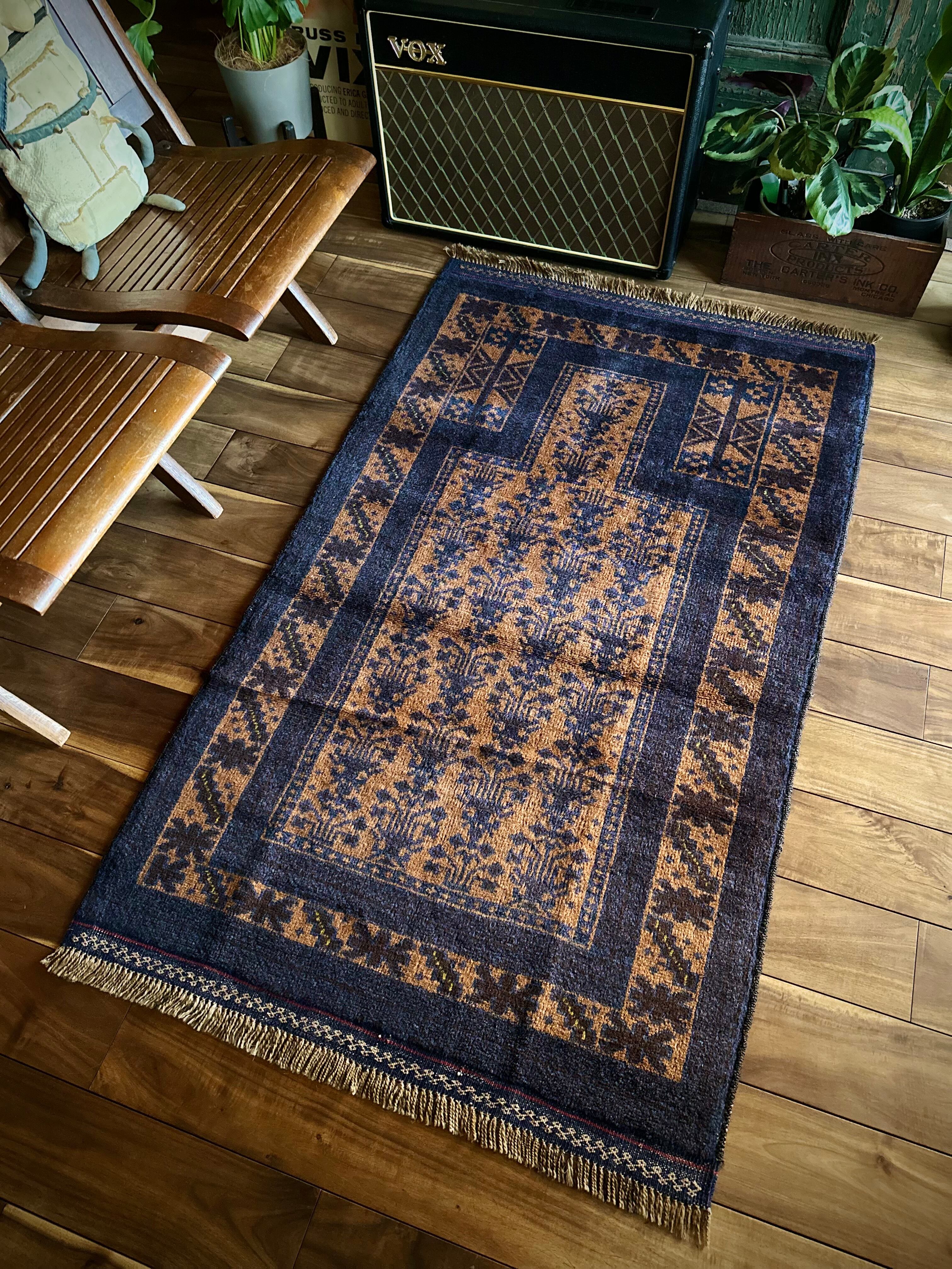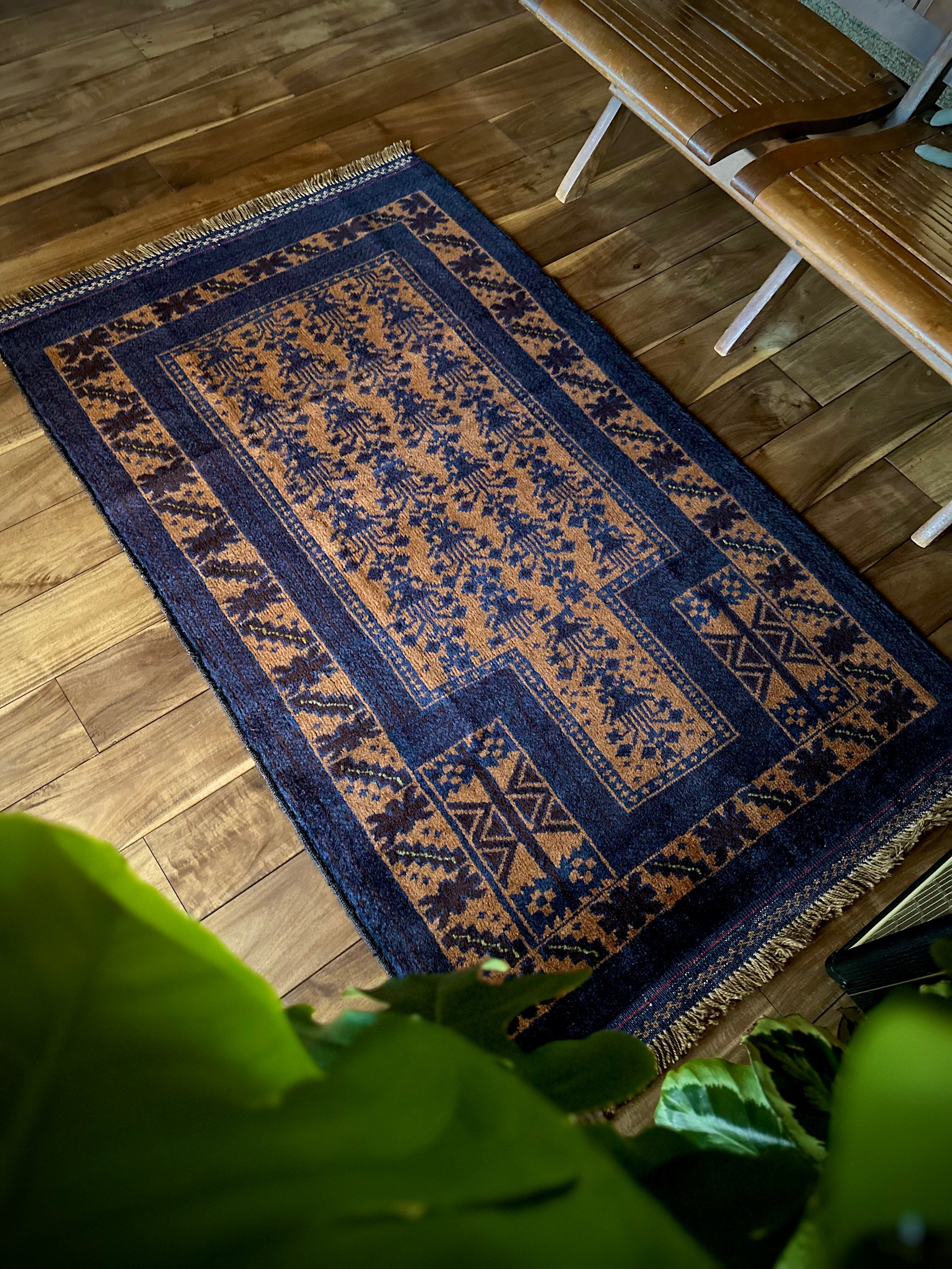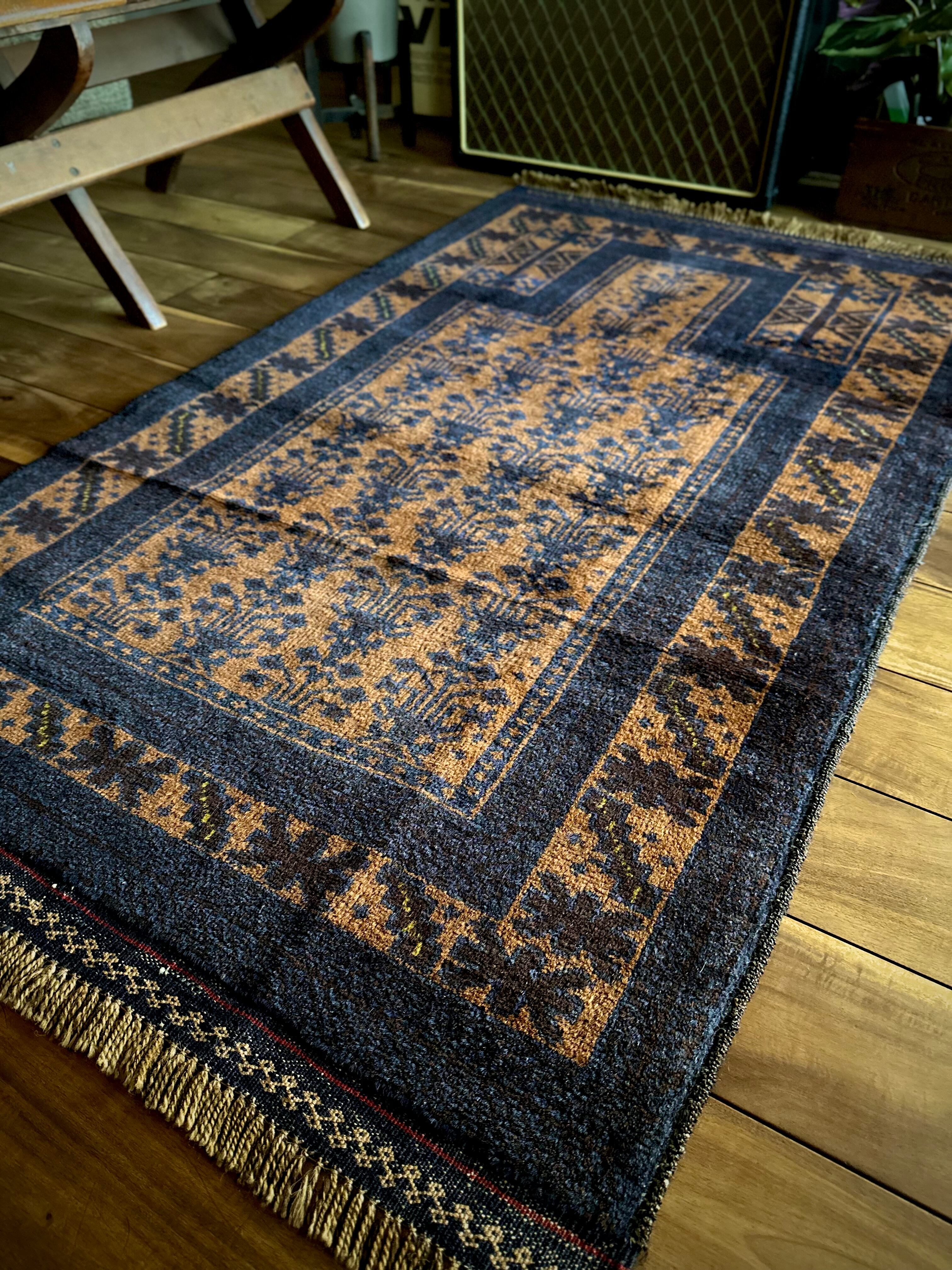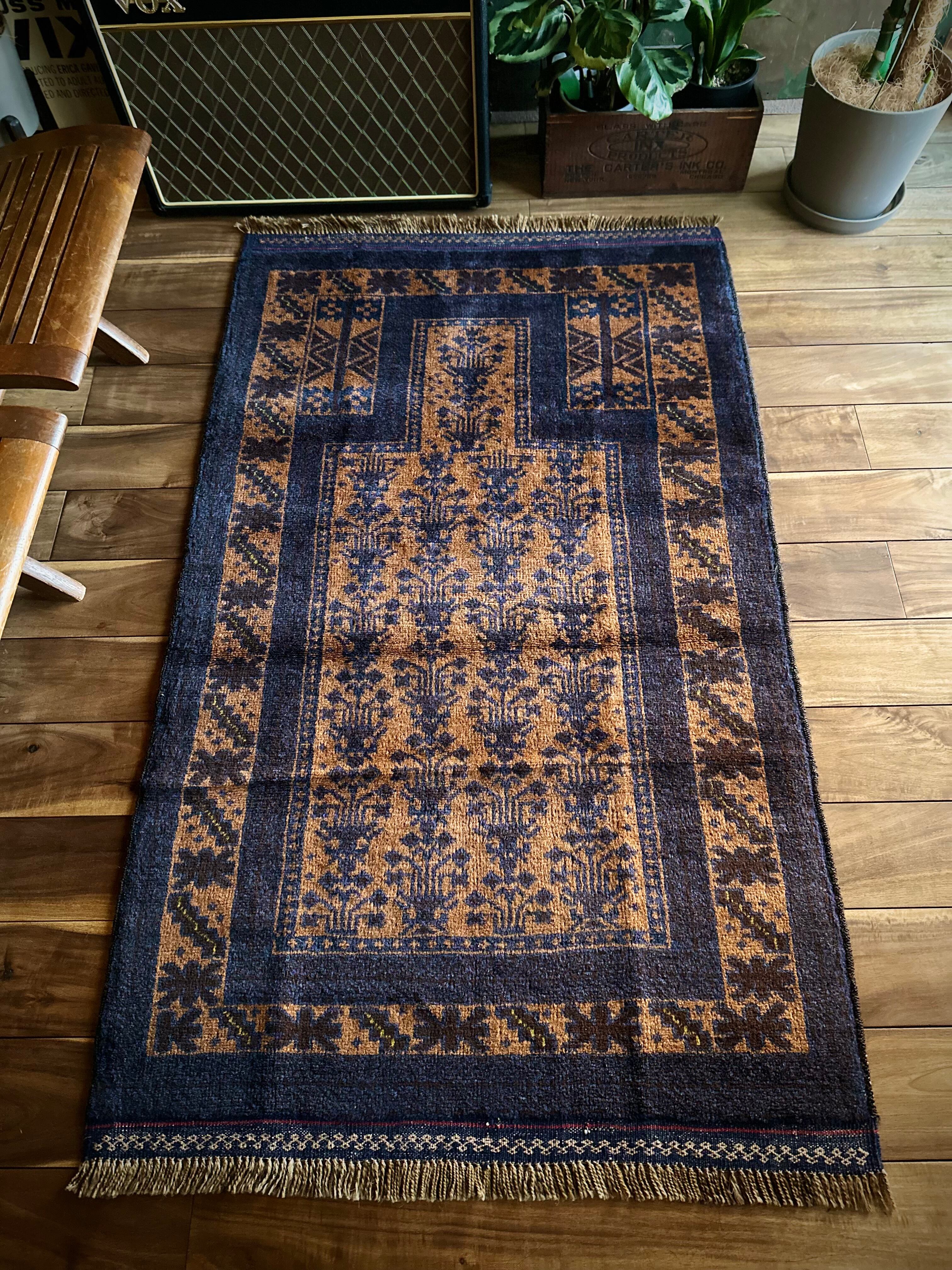 艶の出たネイビーベースにカフェブラウンがシンプルでいて潔い、アフガニスタンはヘラートしに居住するバルーチ族のトライバルラグで、ミフラープと呼ばれる凸形状の祈祷用プレイヤーラグになります。