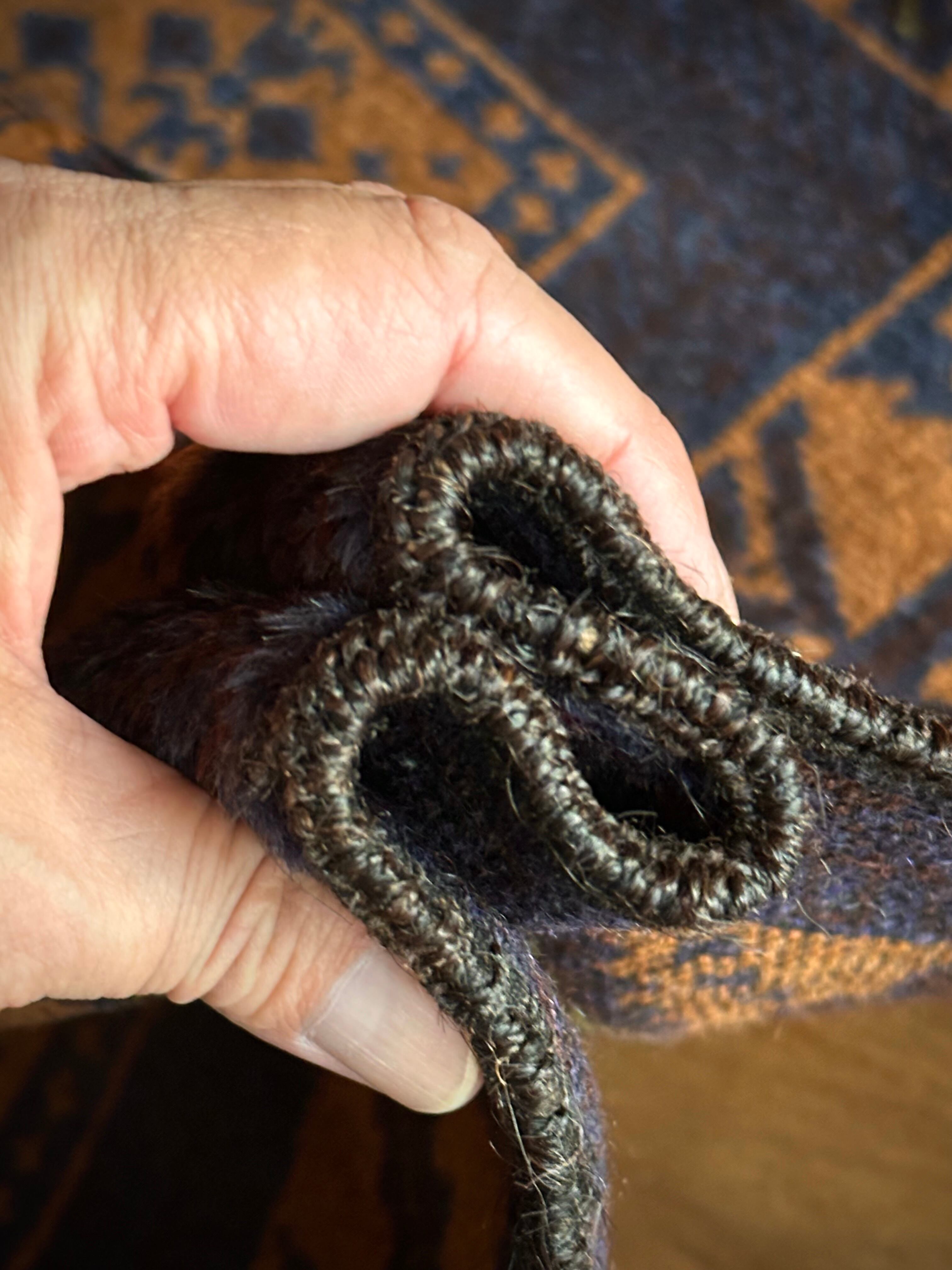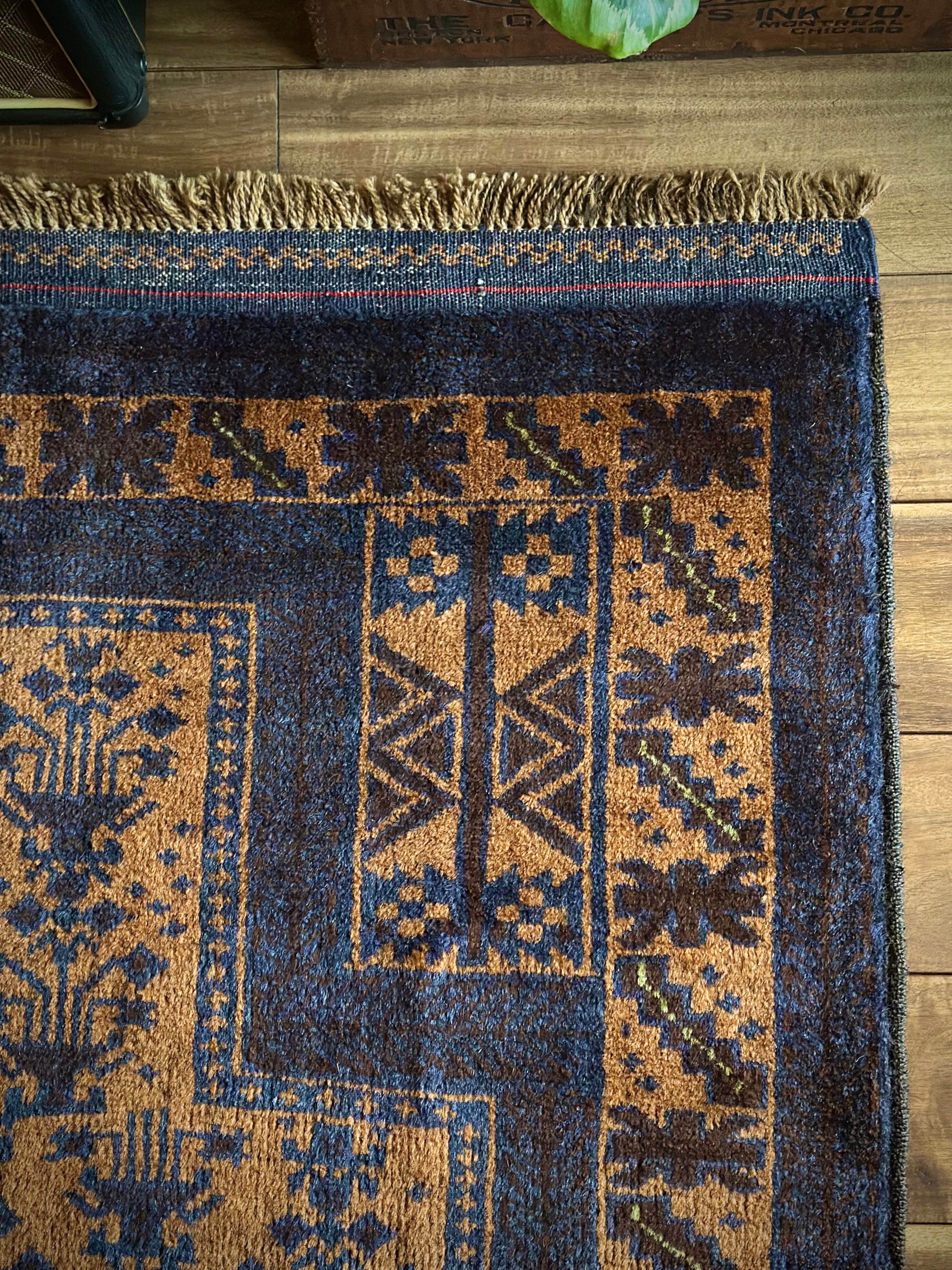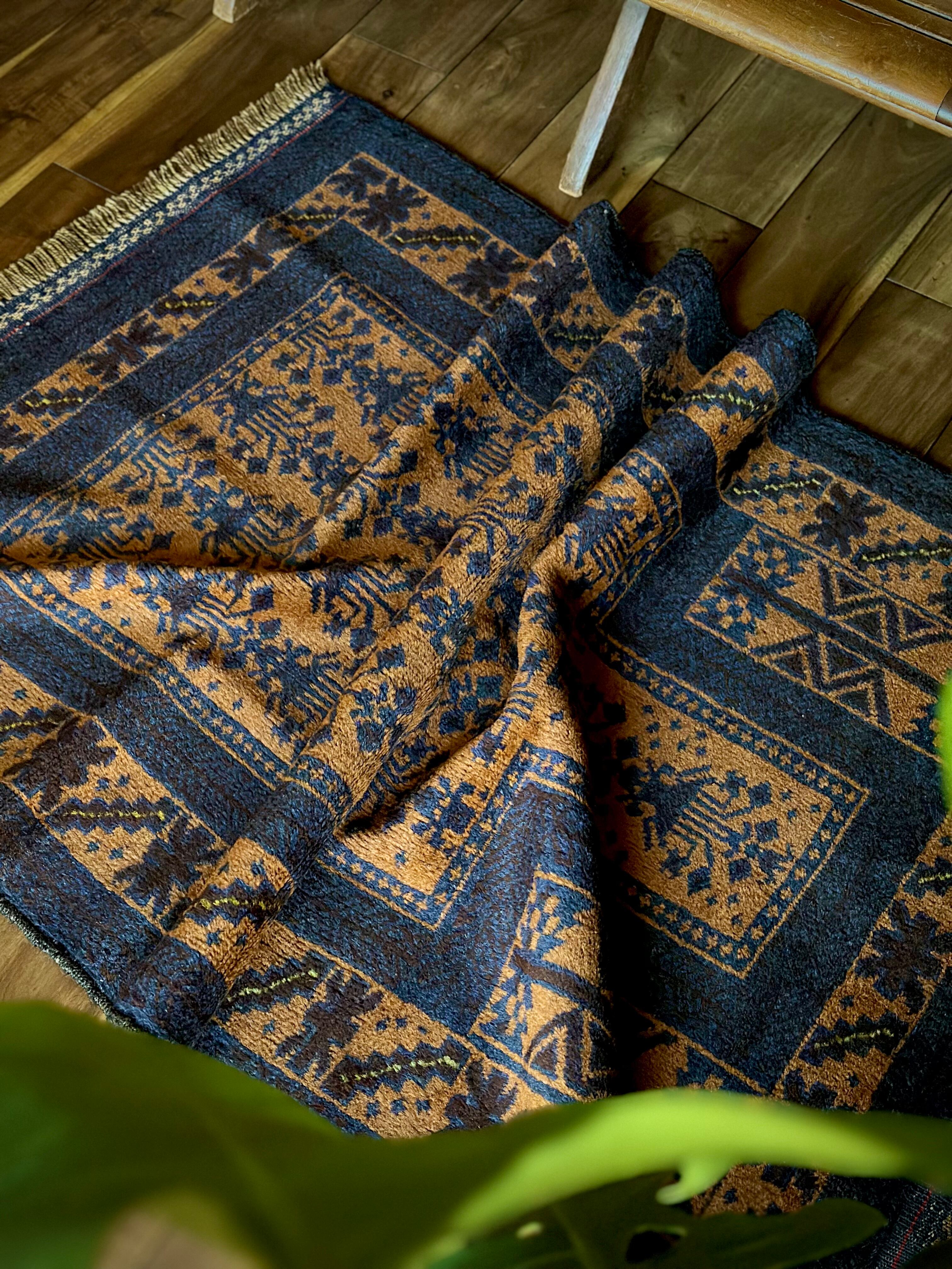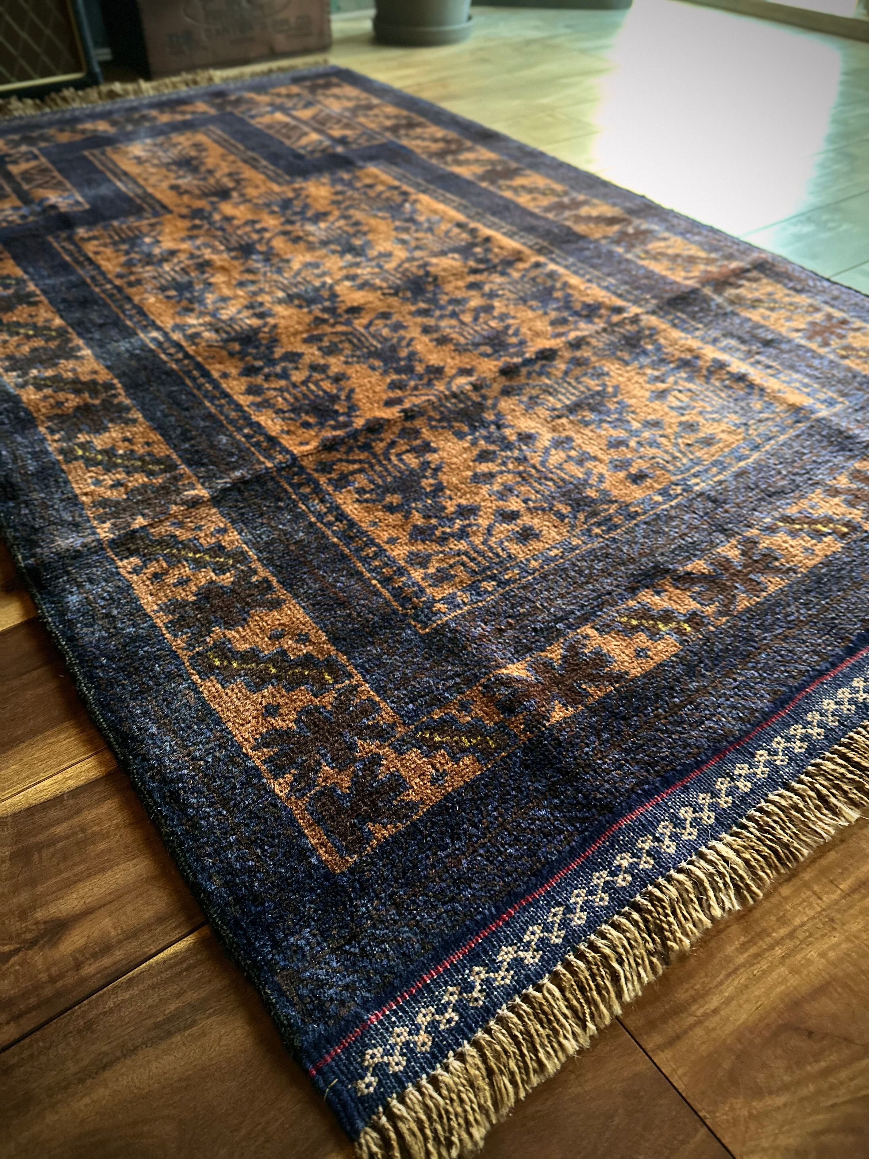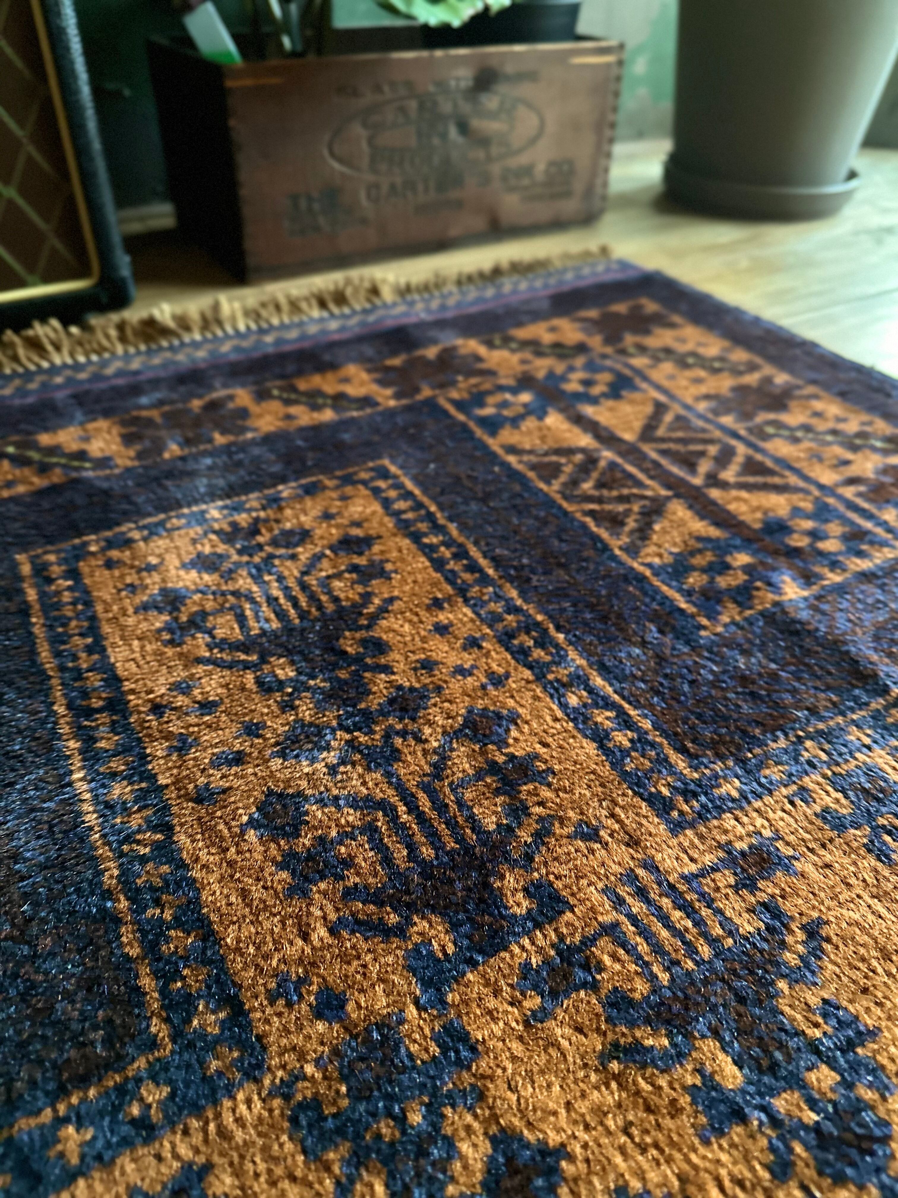 艶の出たネイビーベースにカフェブラウンがシンプルでいて潔い、アフガニスタンはヘラートしに居住するバルーチ族のトライバルラグで、ミフラープと呼ばれる凸形状の祈祷用プレイヤーラグになります。