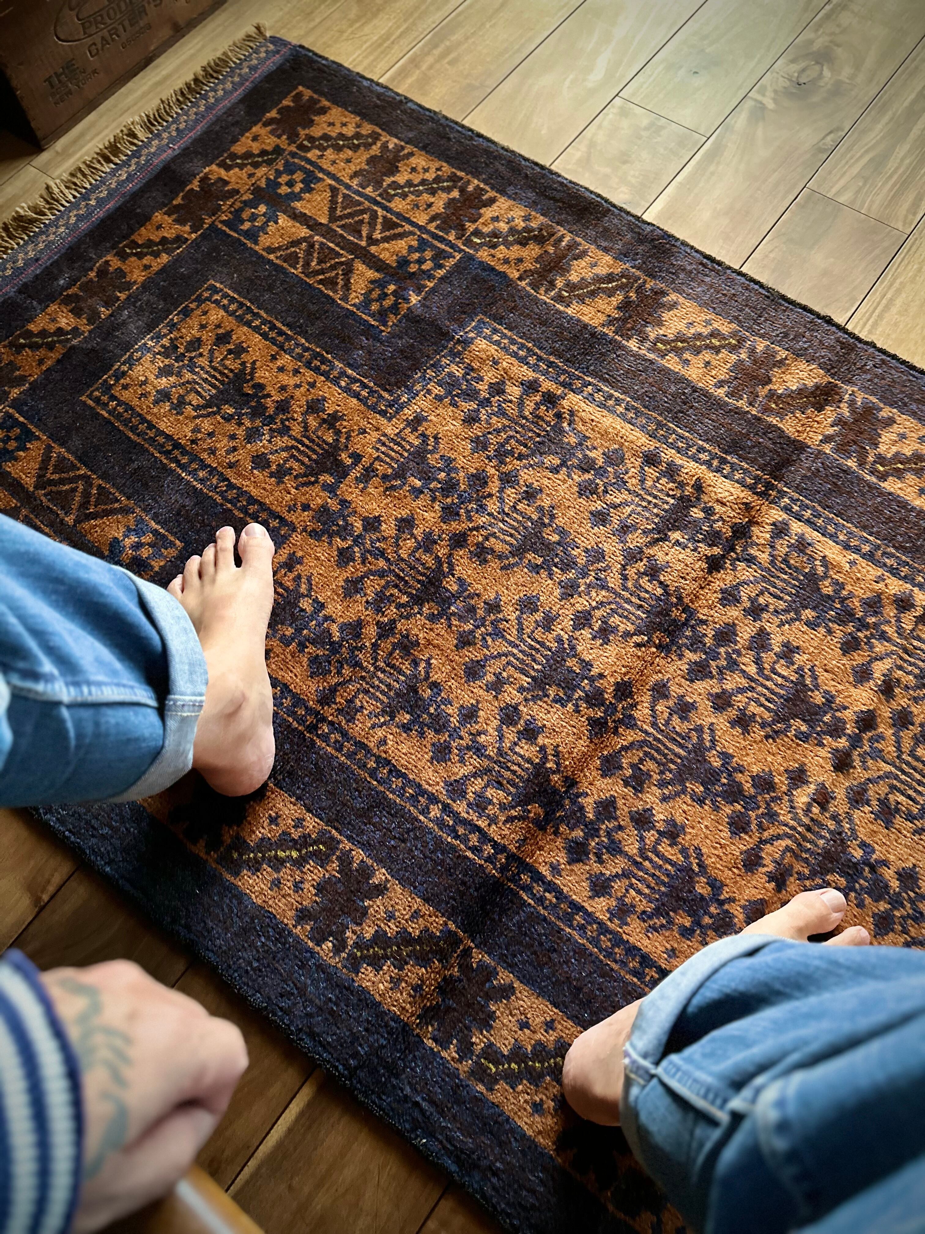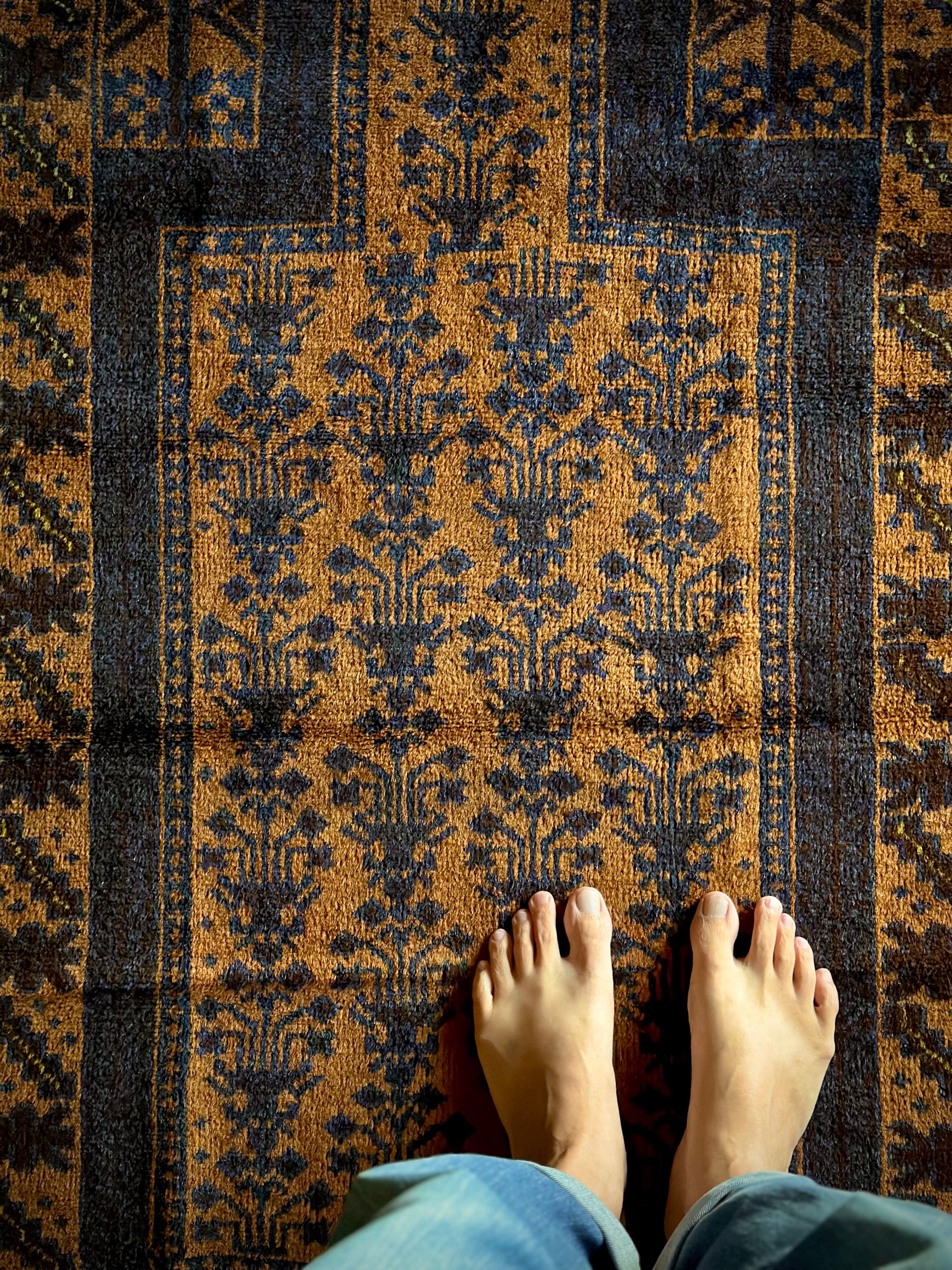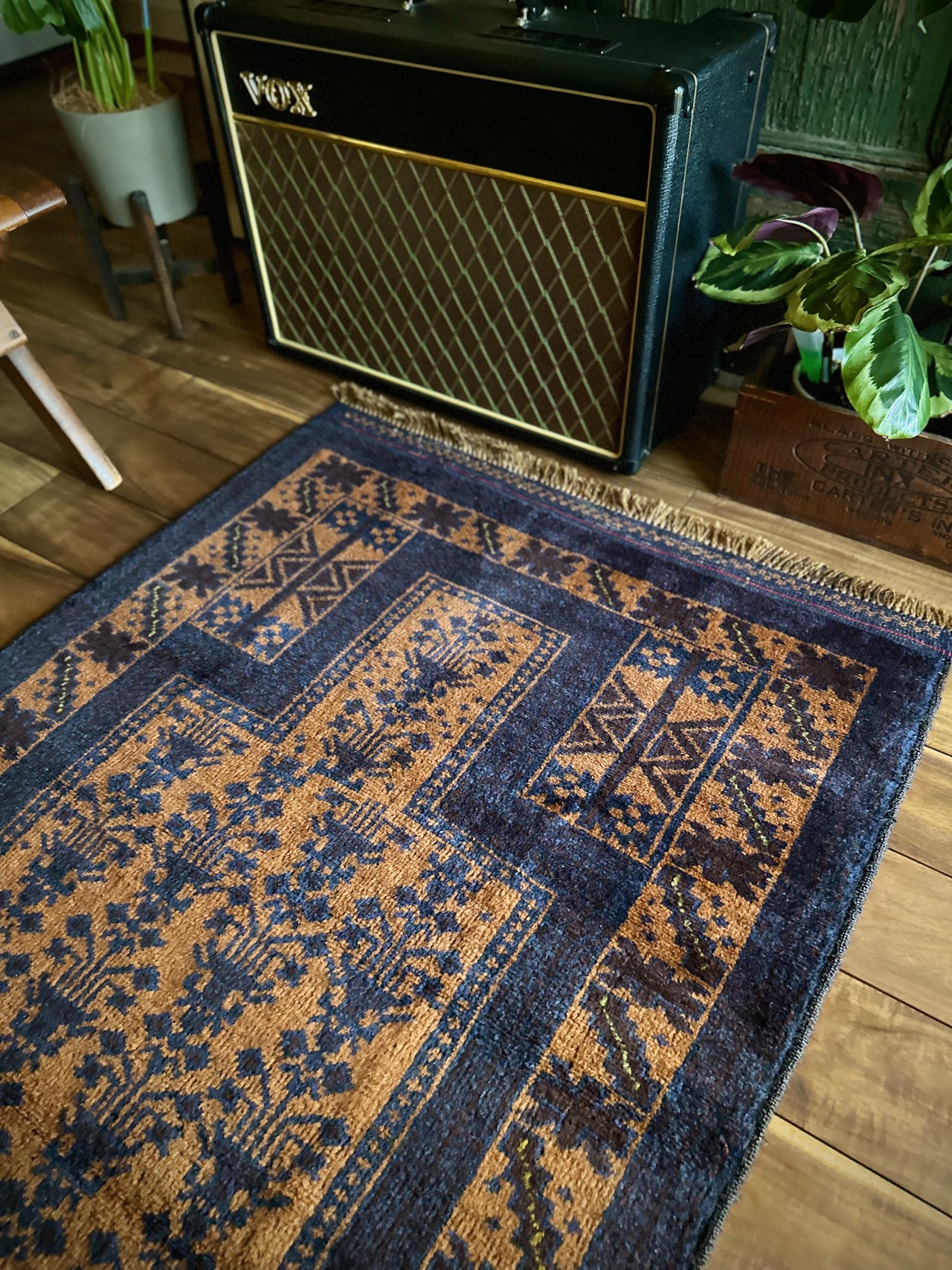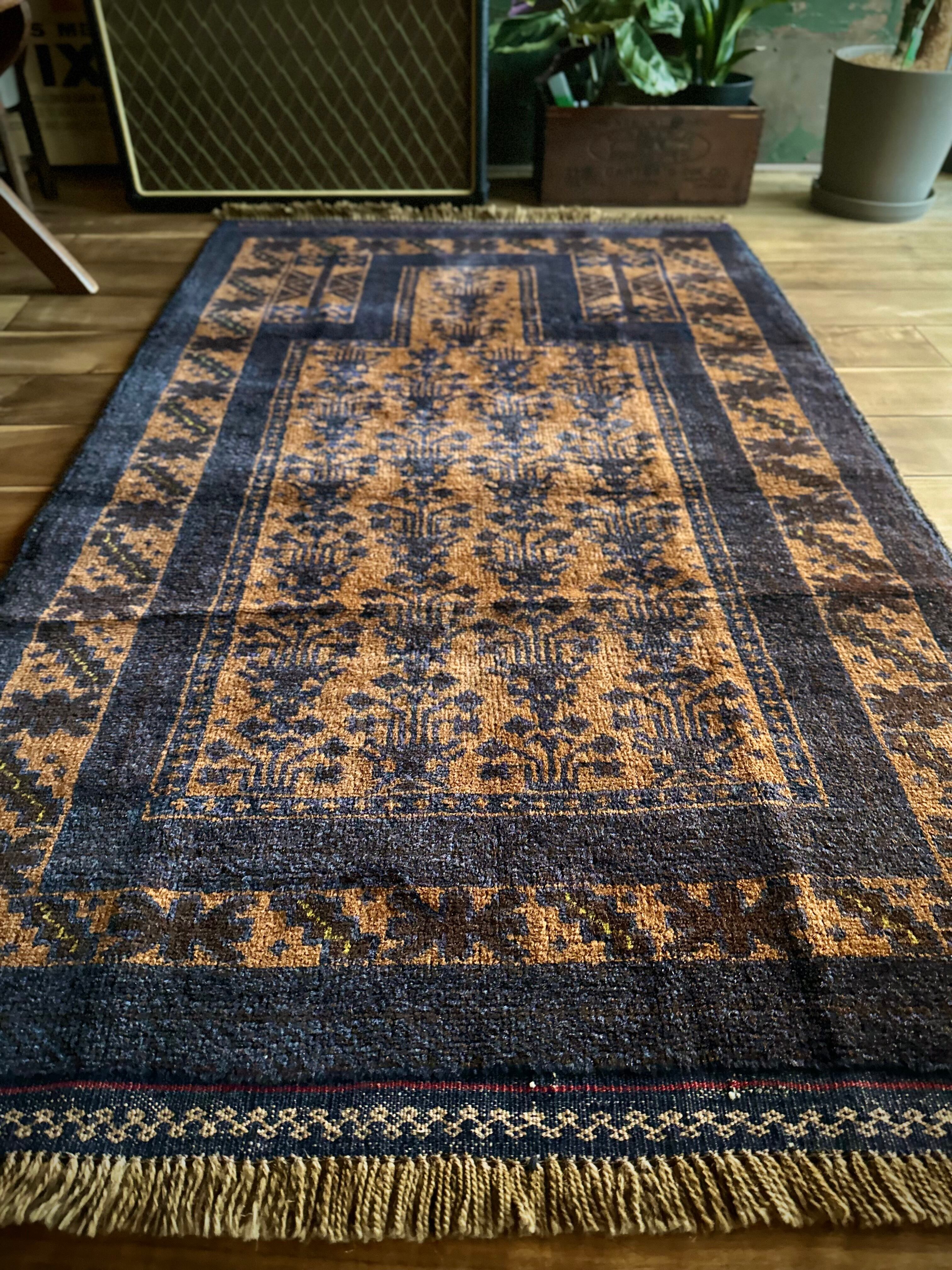 みっちりとした密度で織られたうえに毛足長めのパイルが気持ち良い1枚で、アラーへの祈りもさぞかし心がこもったでしょうか。大きさ的には1人掛けの椅子やチェスト前のアクセントラグとして、個人的にはアンプの前で座り込みお祈りみたくギターを弾くのが理想です。