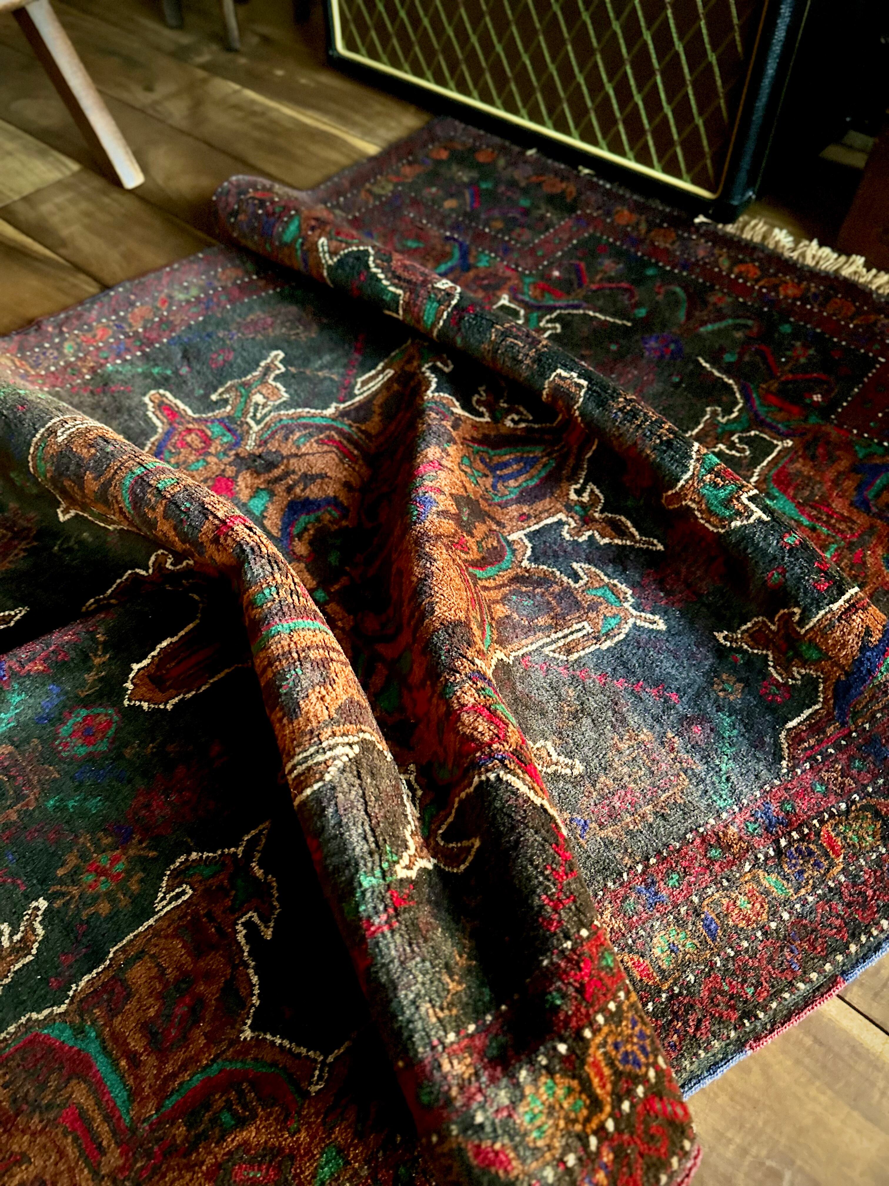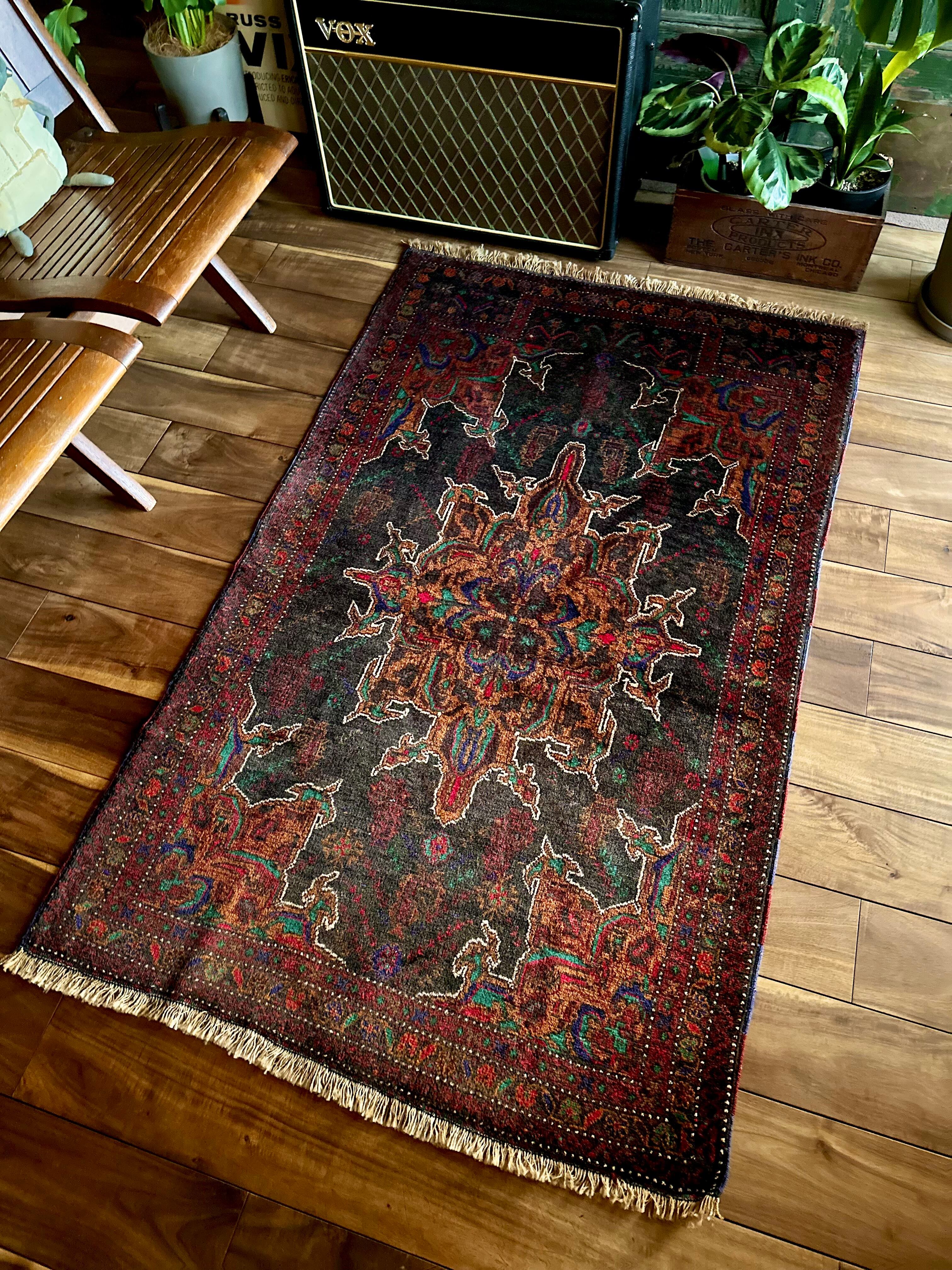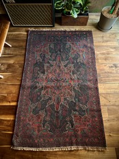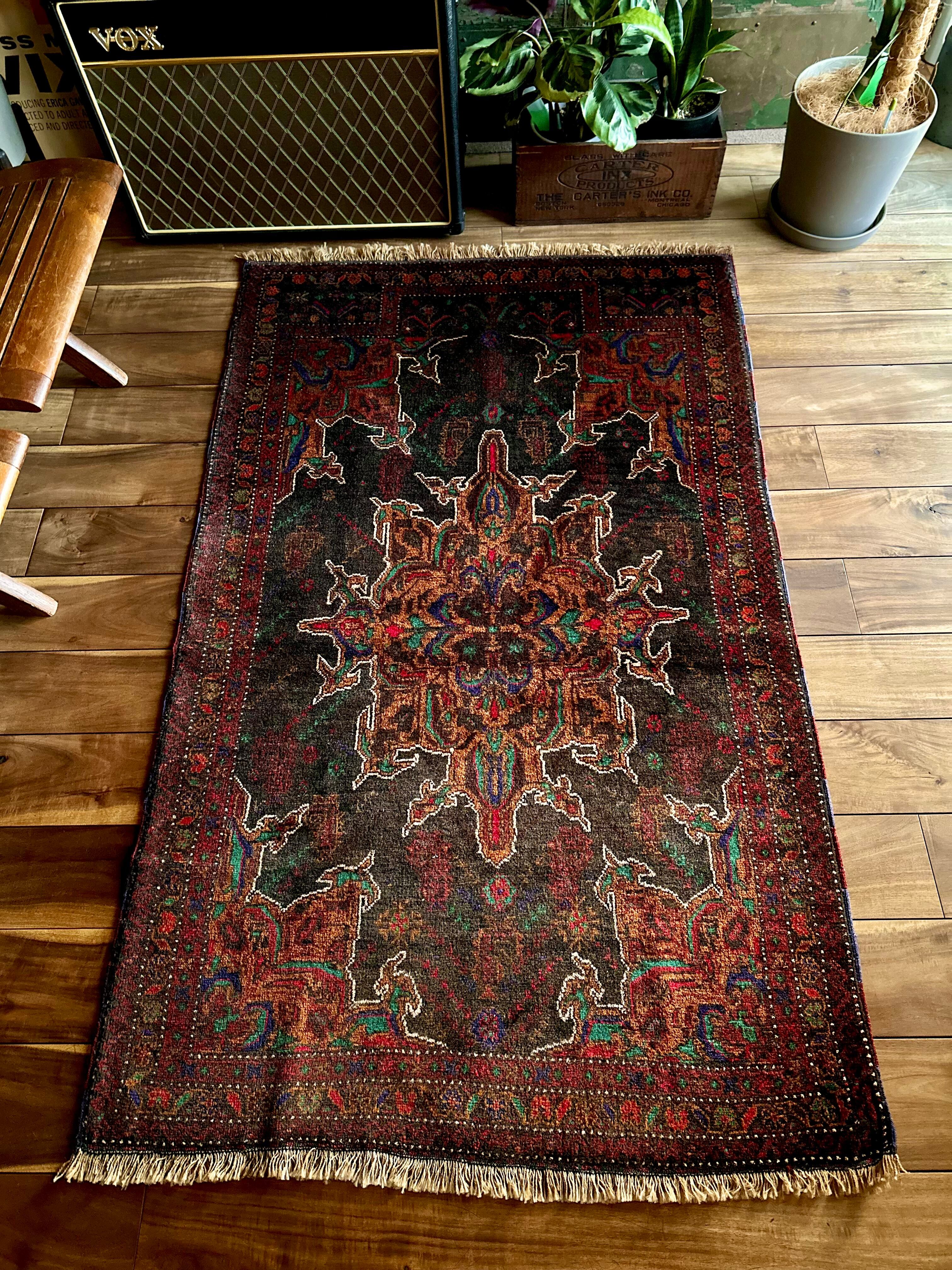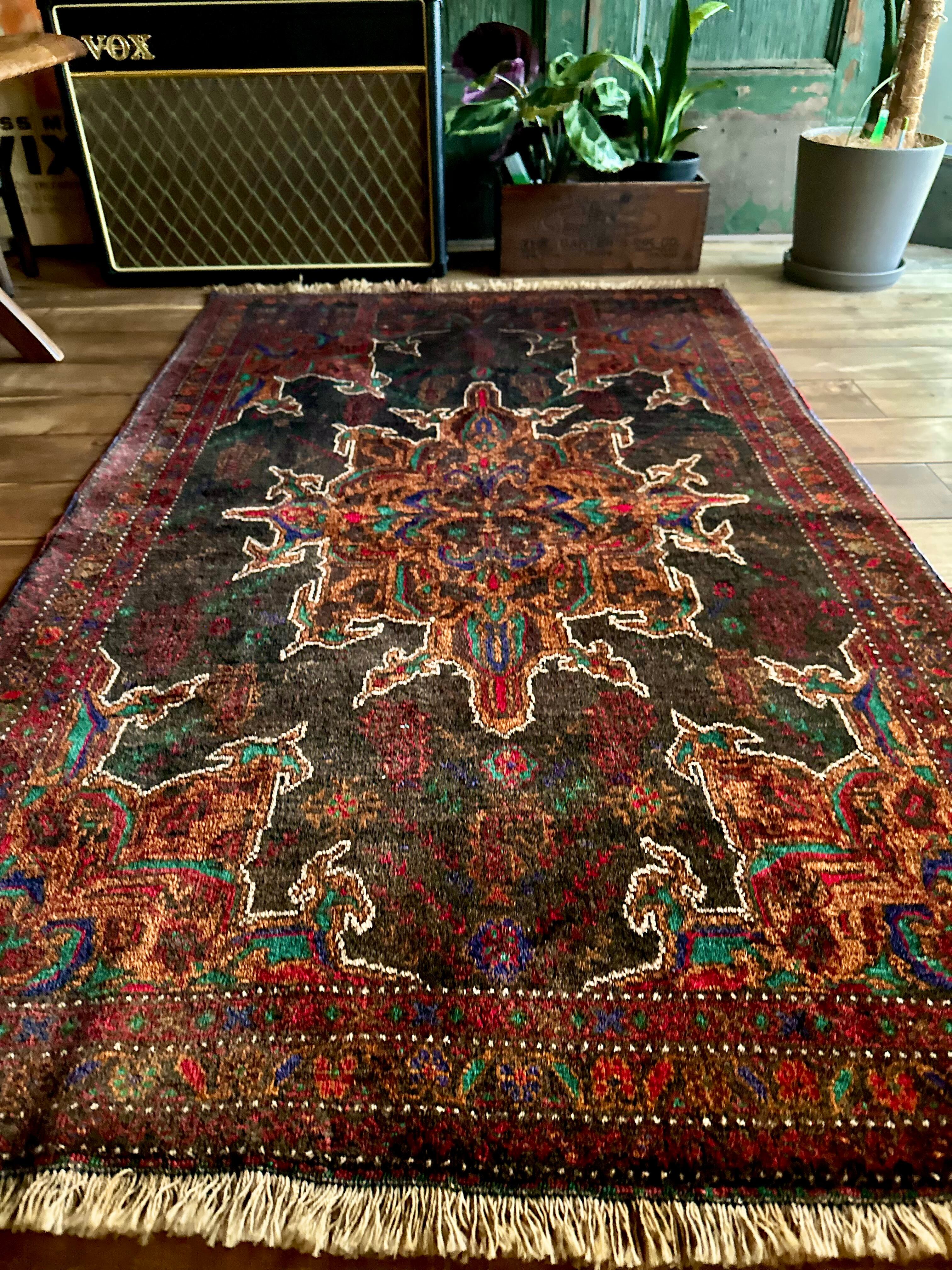 なんとも神秘的な絵柄で細かく織り込まれたアフガンらしい奇抜な1枚で、ブラックをベースにテラコッタにボルドー、また細かなグリーンやレッドといったアクセントを散らばせた配色に度肝を抜かれてしまう、アフガニスタンはヘラート州に居住するバルーチ族のトライバルラグになります。
