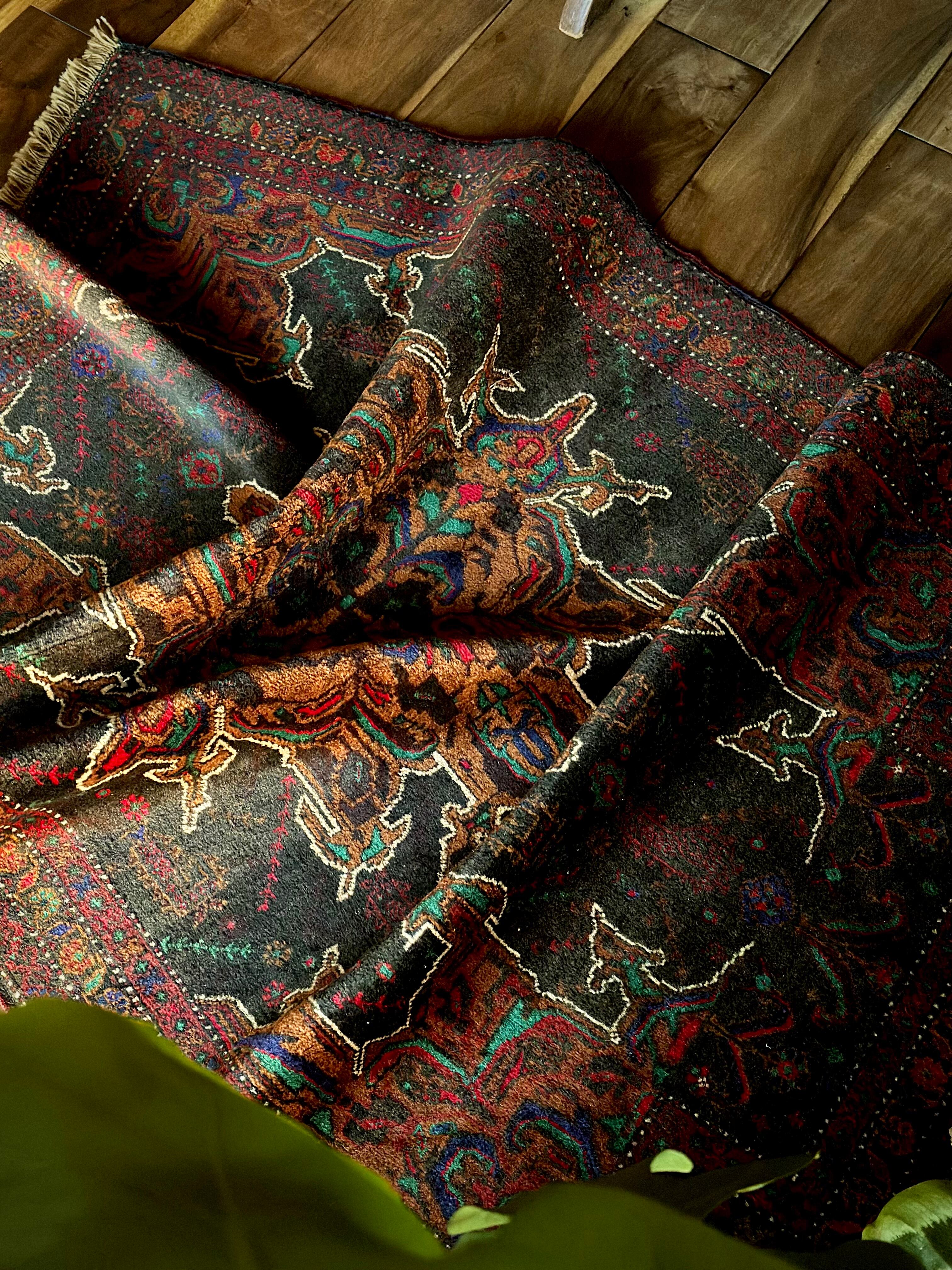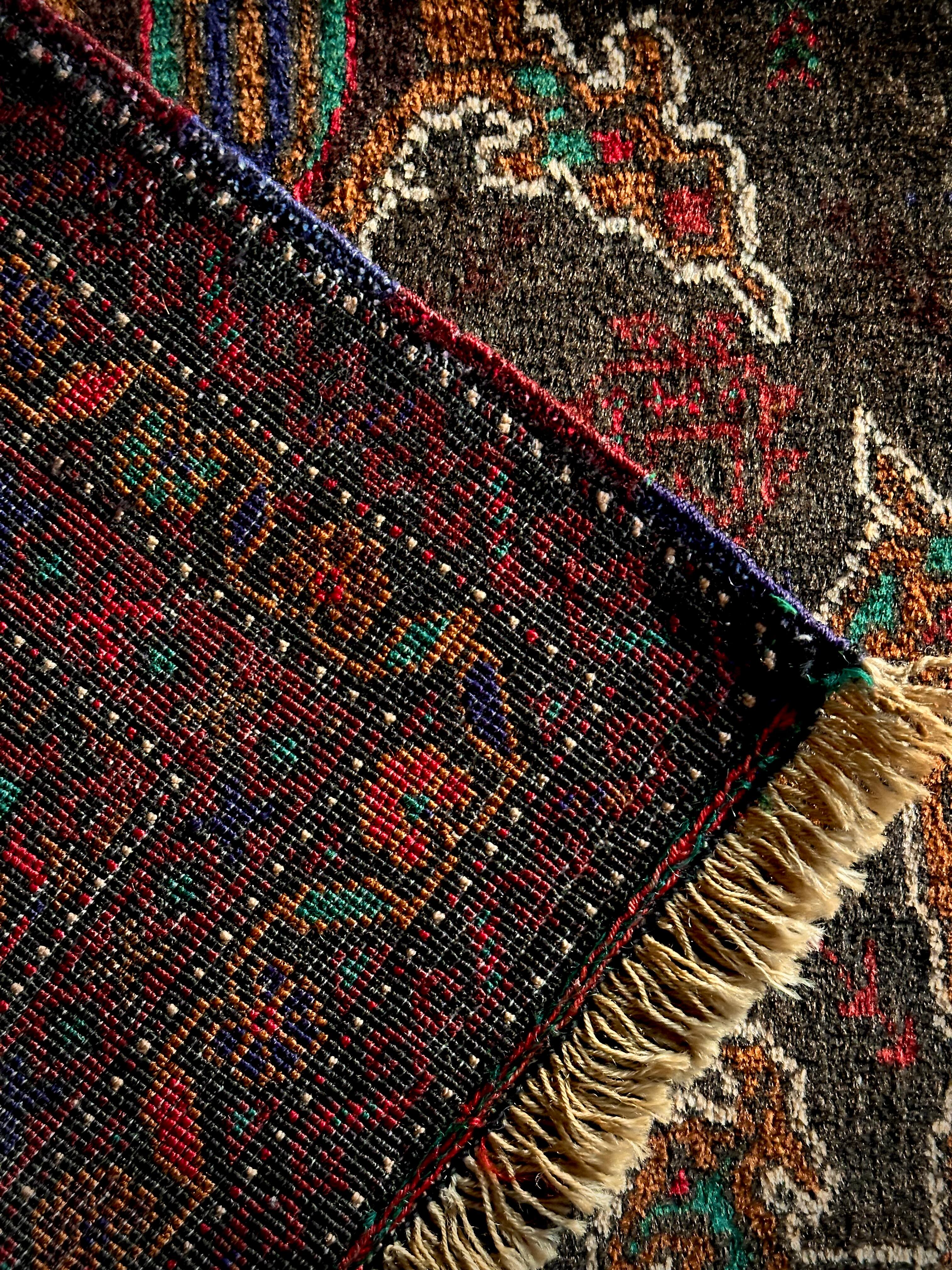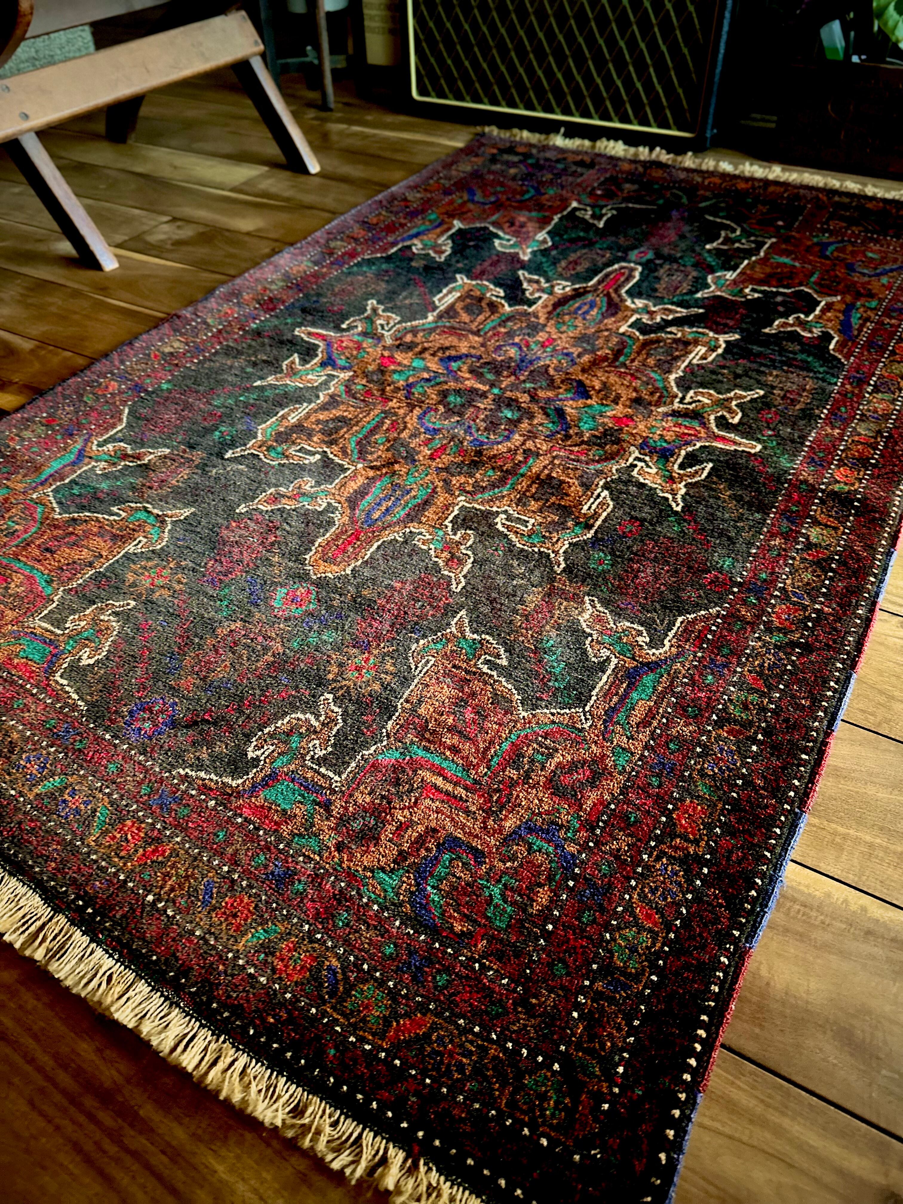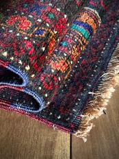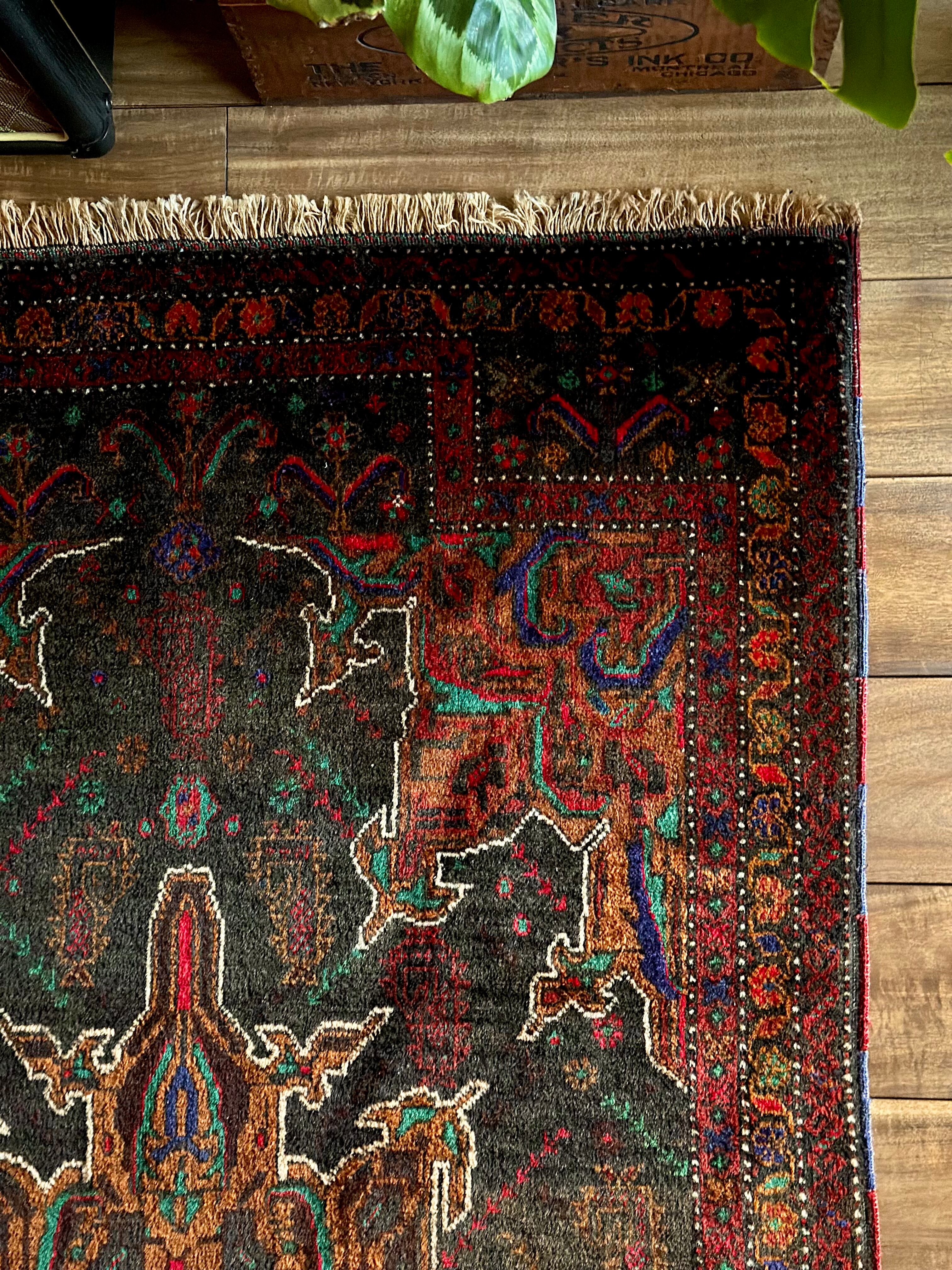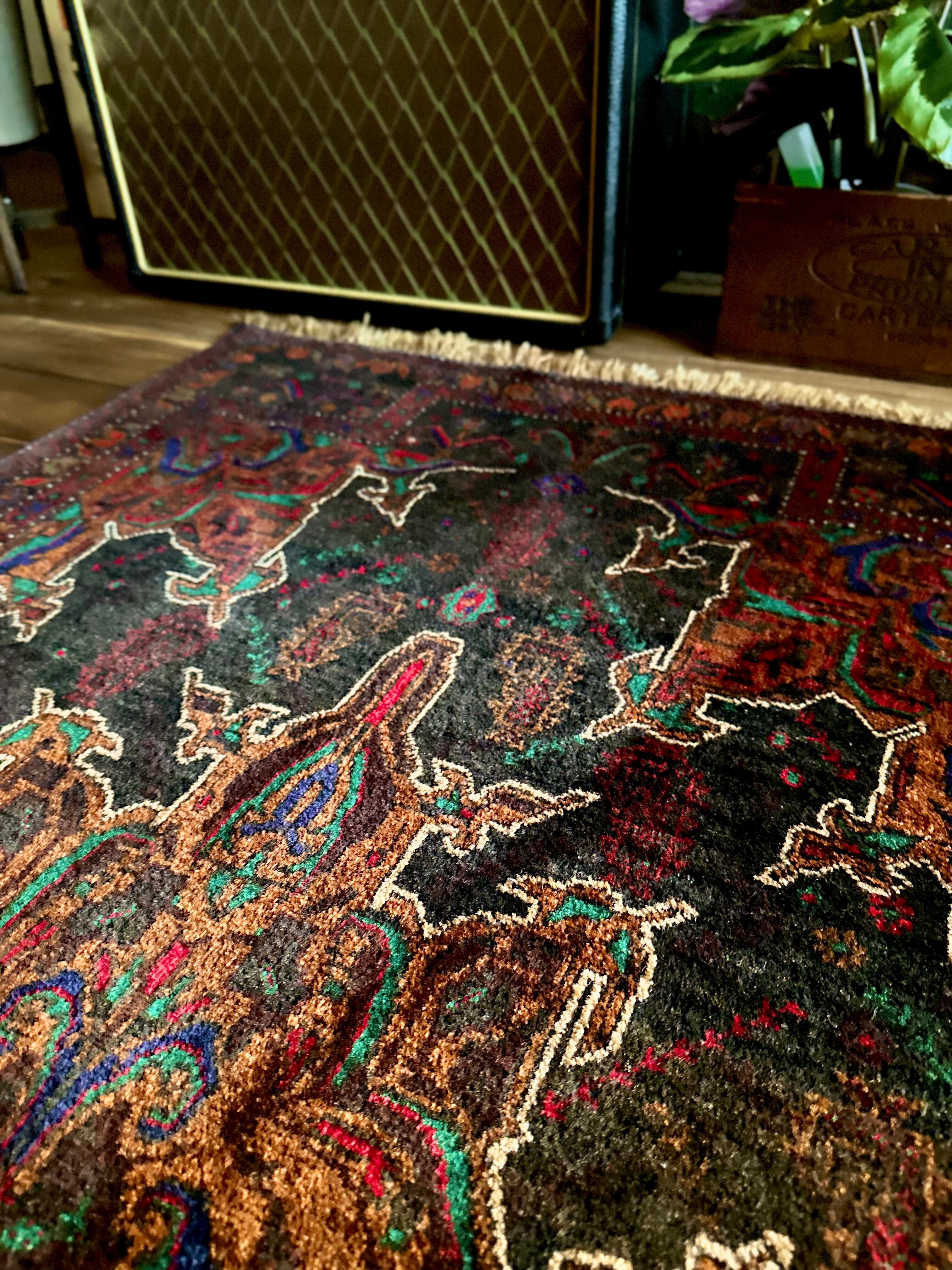 なんとも神秘的な絵柄で細かく織り込まれたアフガンらしい奇抜な1枚で、ブラックをベースにテラコッタにボルドー、また細かなグリーンやレッドといったアクセントを散らばせた配色に度肝を抜かれてしまう、アフガニスタンはヘラート州に居住するバルーチ族のトライバルラグになります。