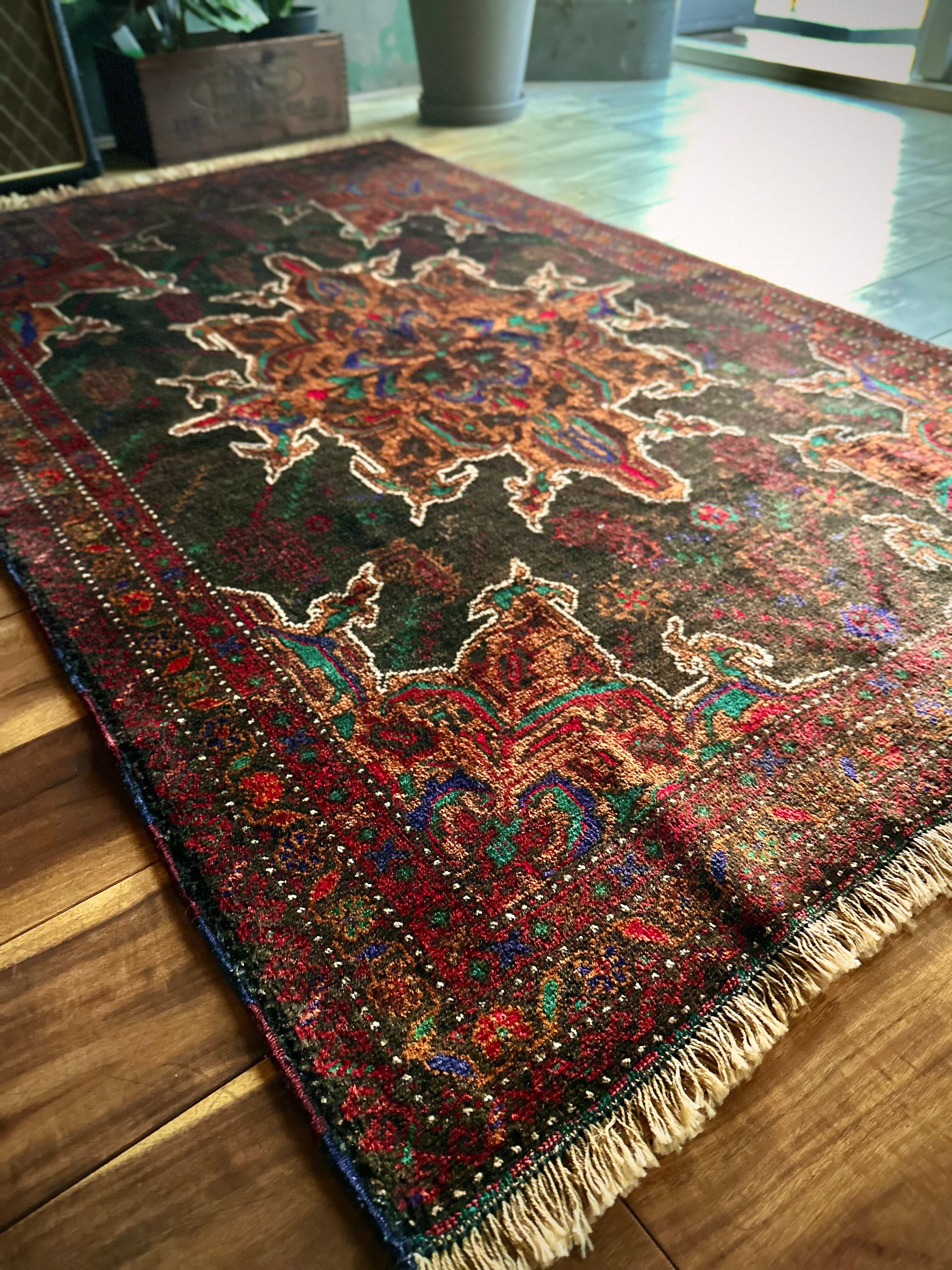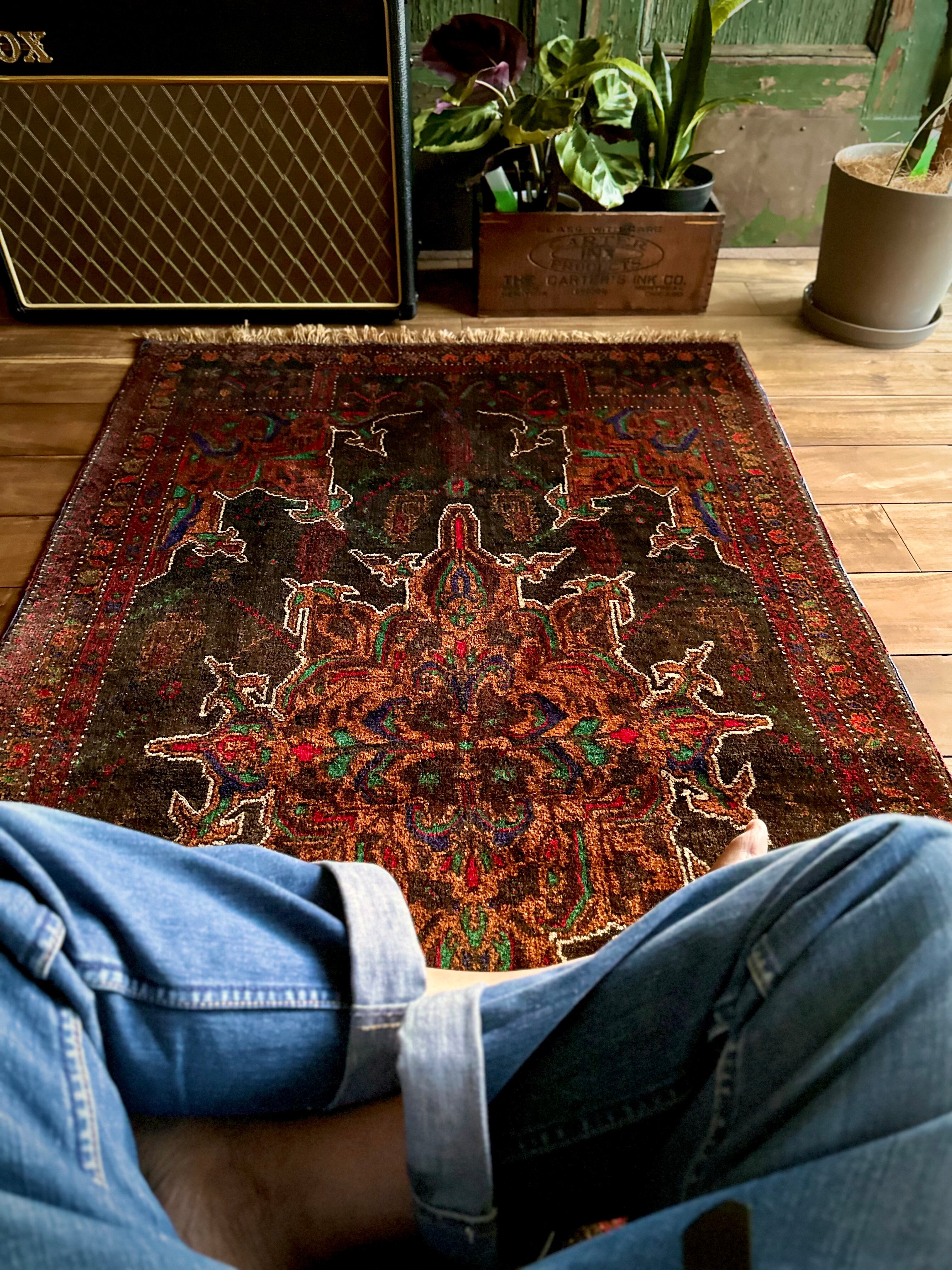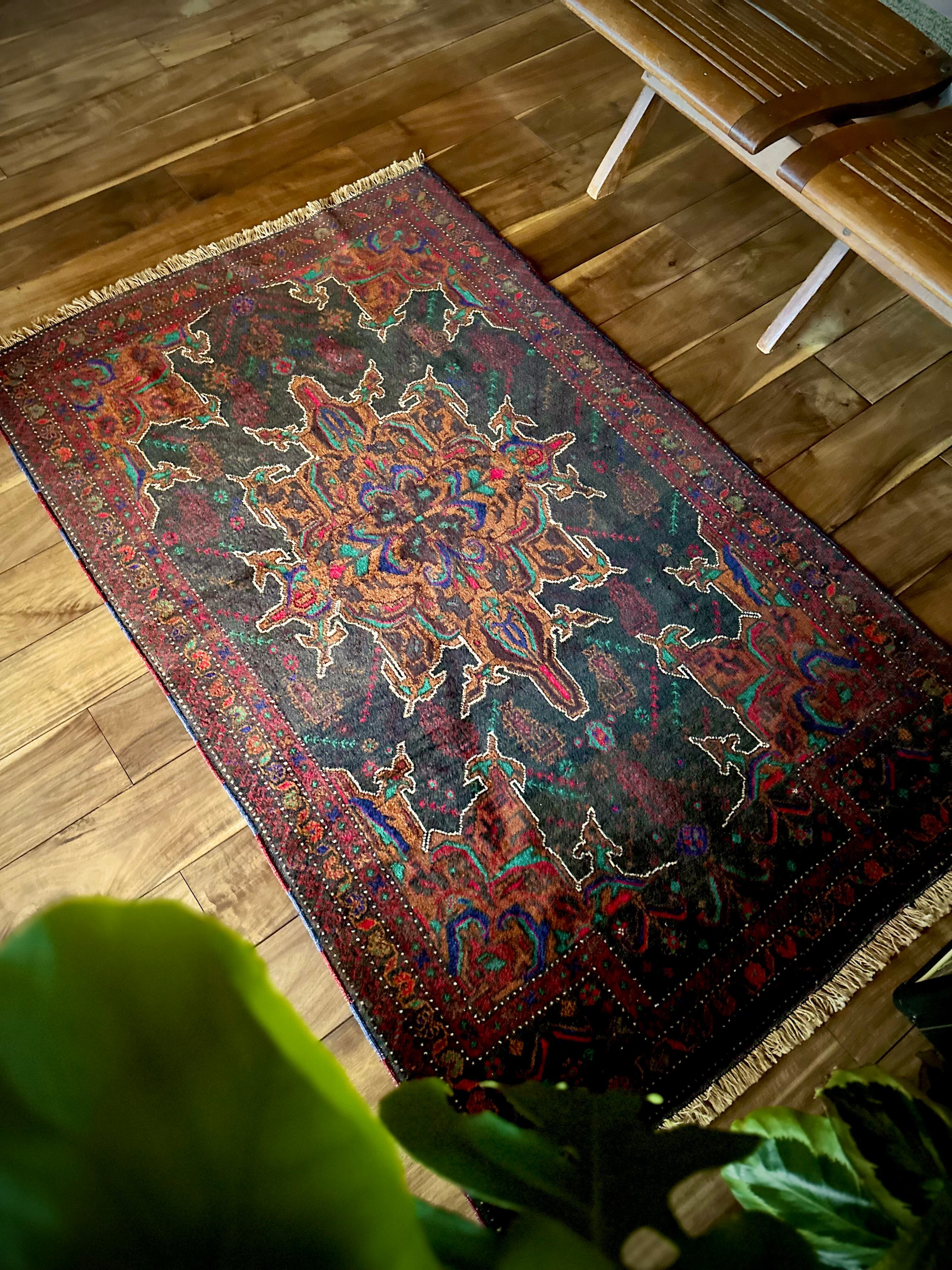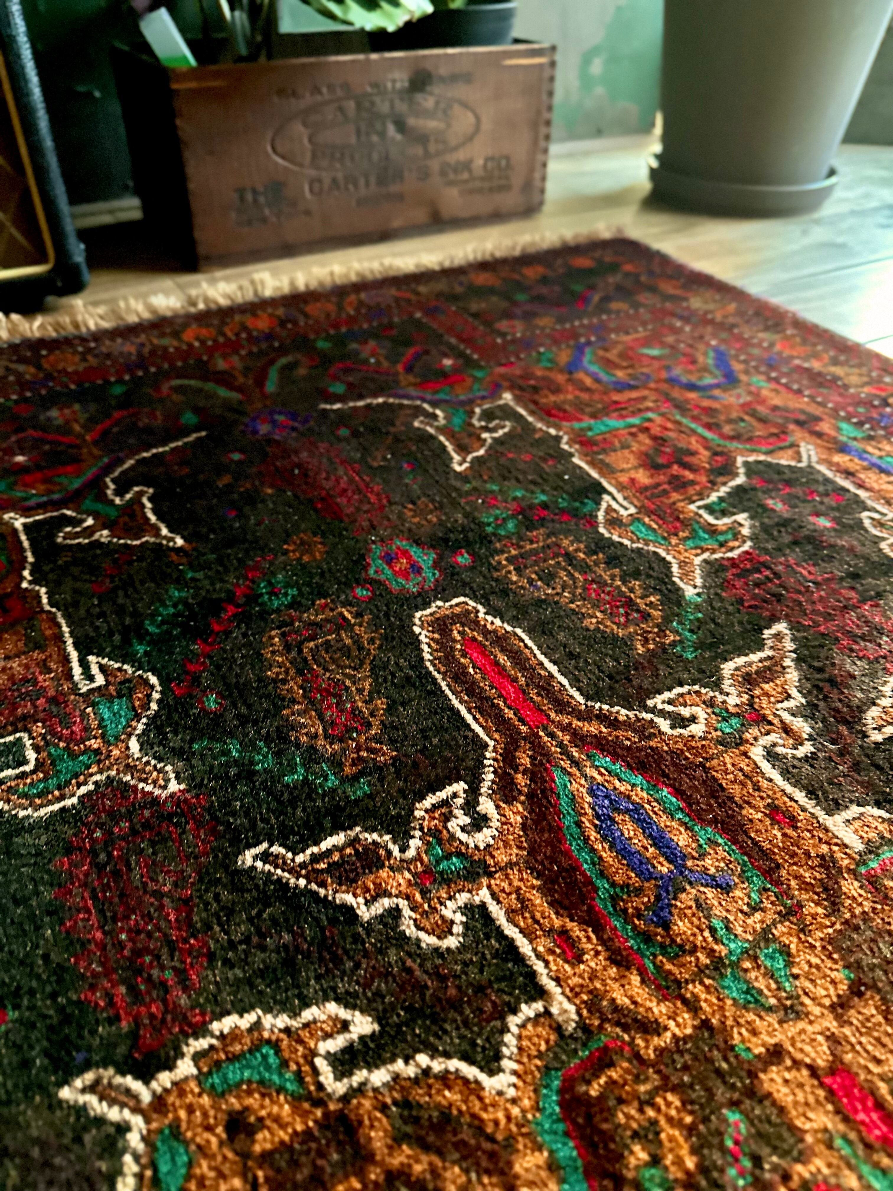 なんとも神秘的な絵柄で細かく織り込まれたアフガンらしい奇抜な1枚で、ブラックをベースにテラコッタにボルドー、また細かなグリーンやレッドといったアクセントを散らばせた配色に度肝を抜かれてしまう、アフガニスタンはヘラート州に居住するバルーチ族のトライバルラグになります。