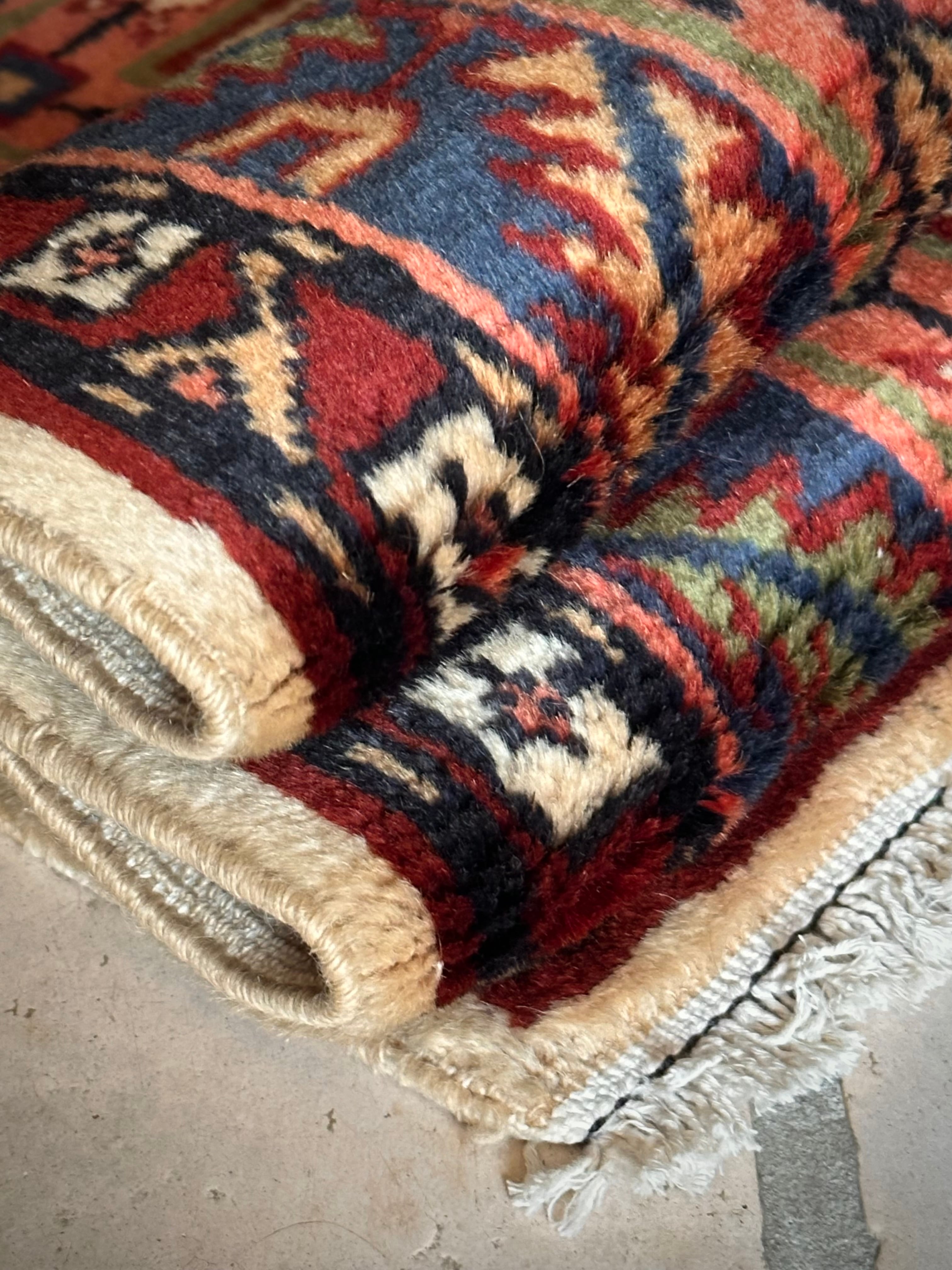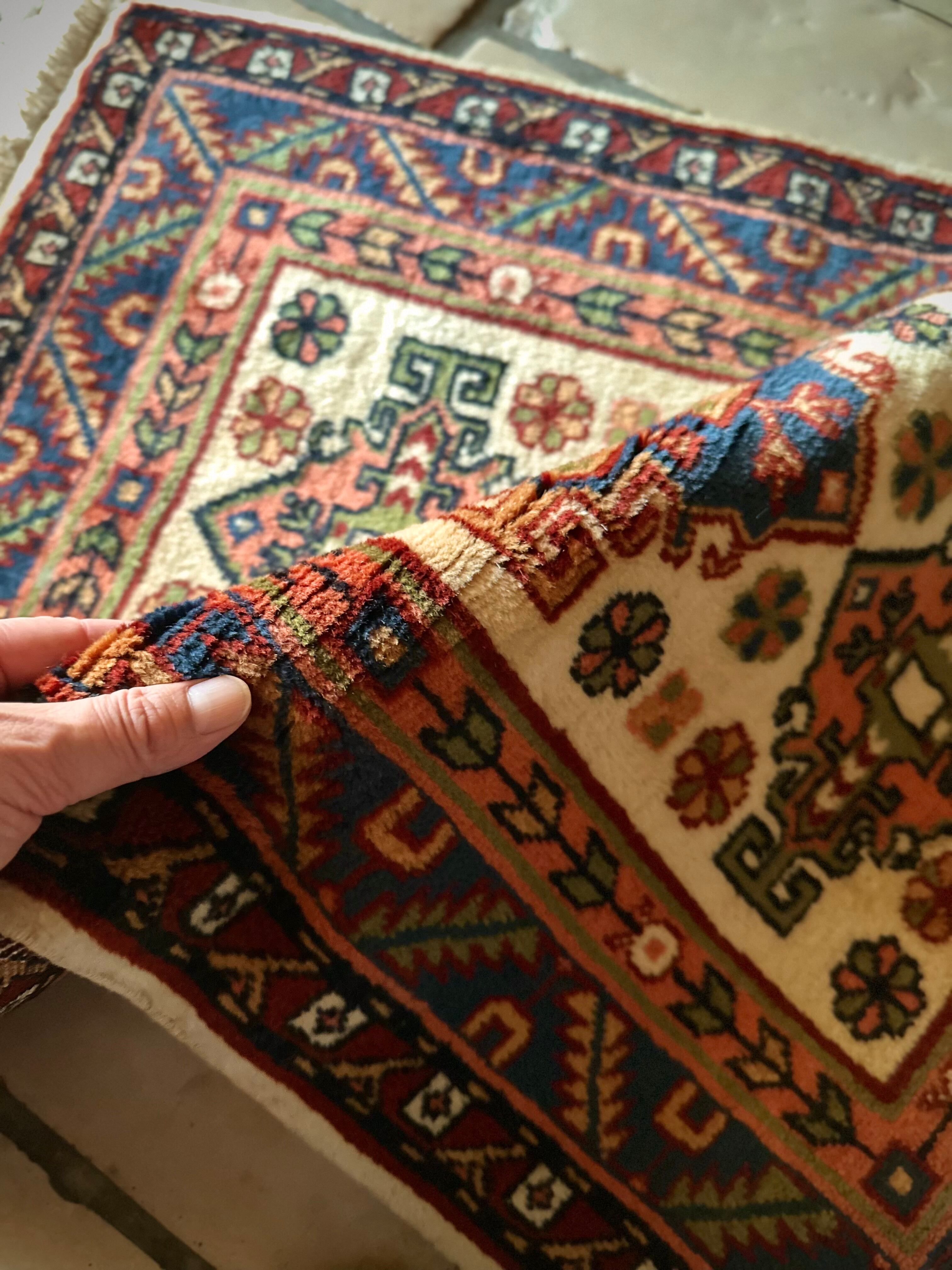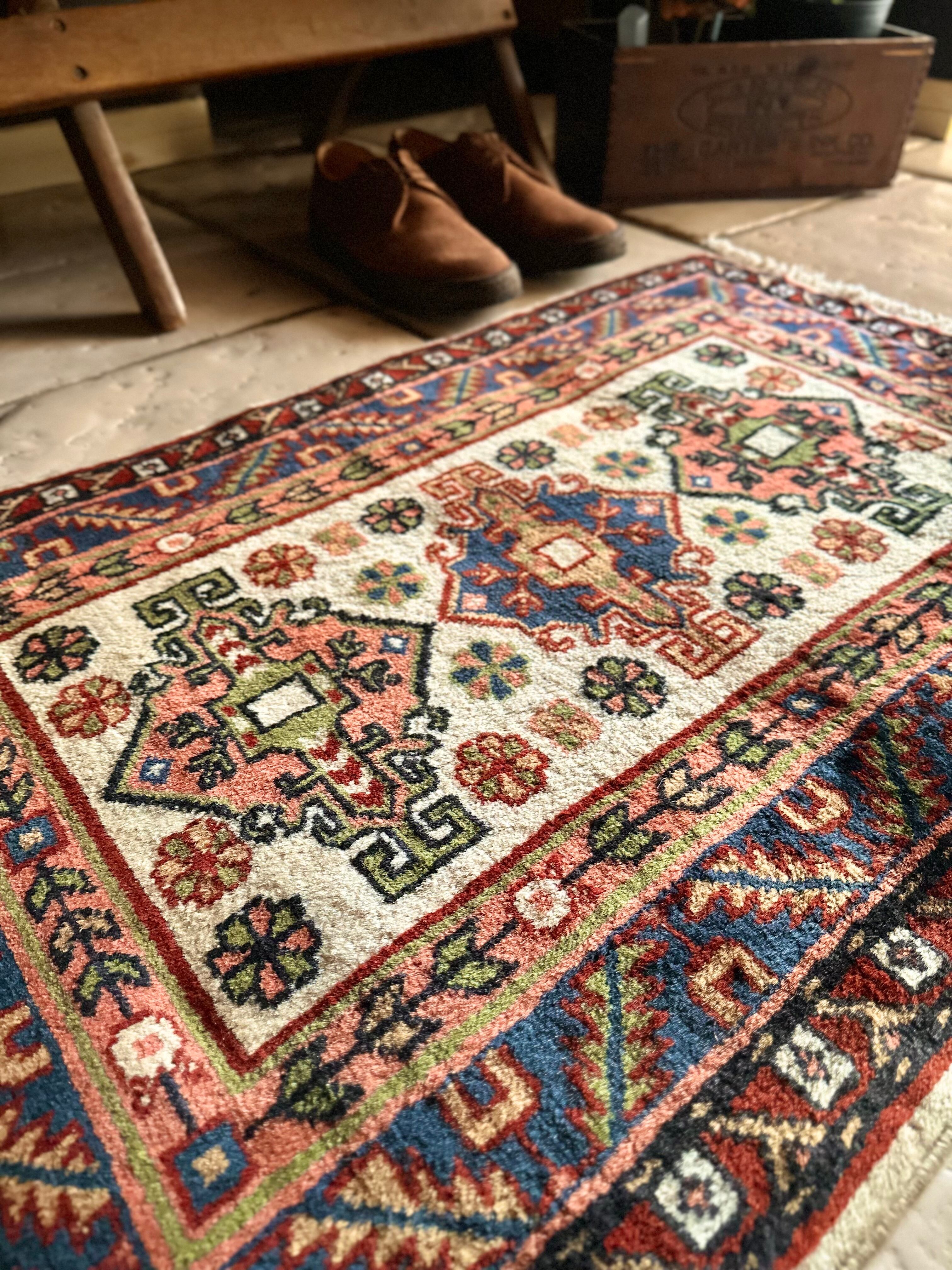 最後にラグそのものに関しては羊毛特有の匂いがあり、採寸は中央付近で計測していますが、手織りならではの歪みによる誤差や水洗いクリーニングによる縮み、また草木染めによる経年劣化の色ムラなどがありますが、それもまたヴィンテージラグの魅力かとご理解ください。