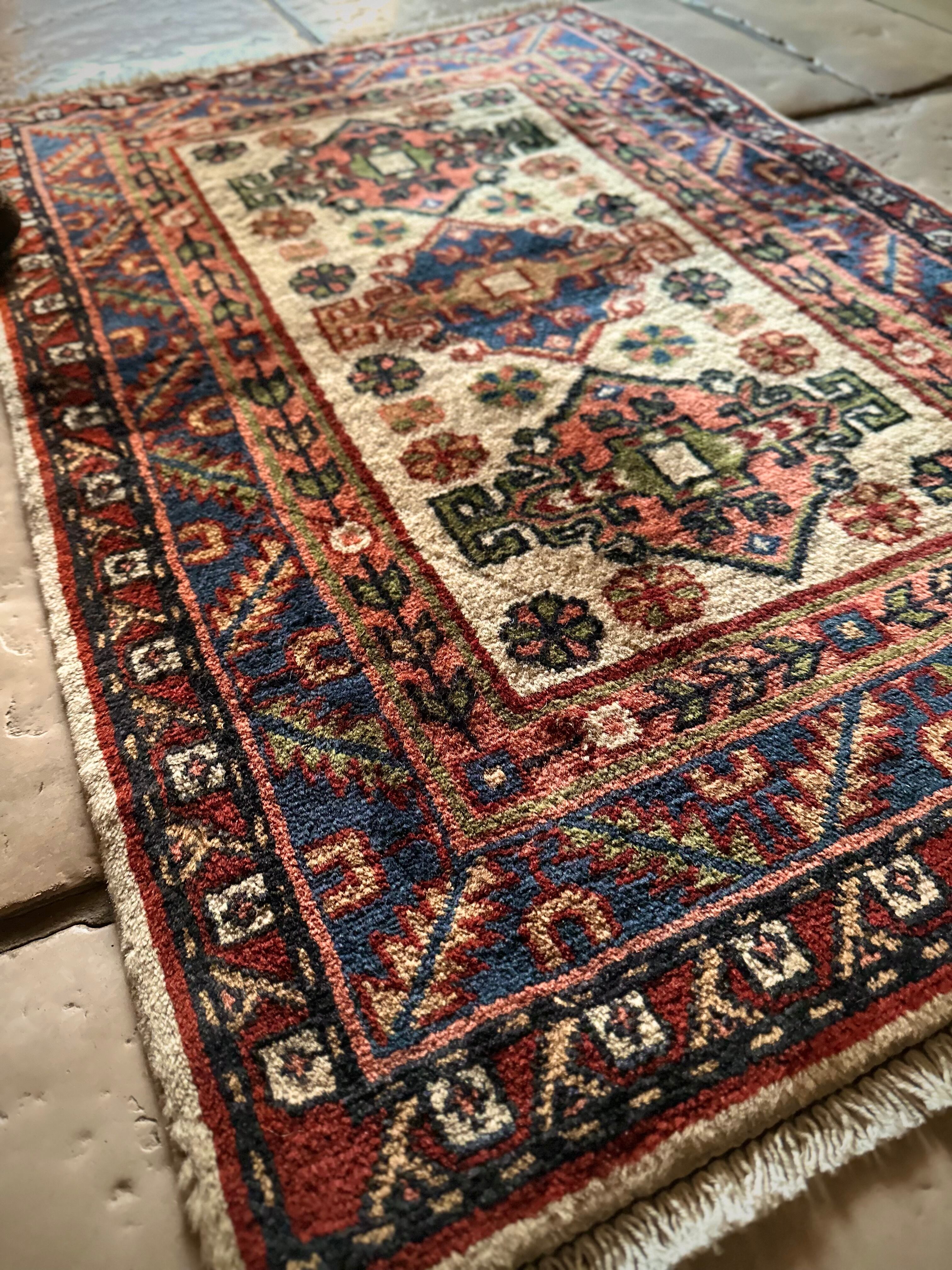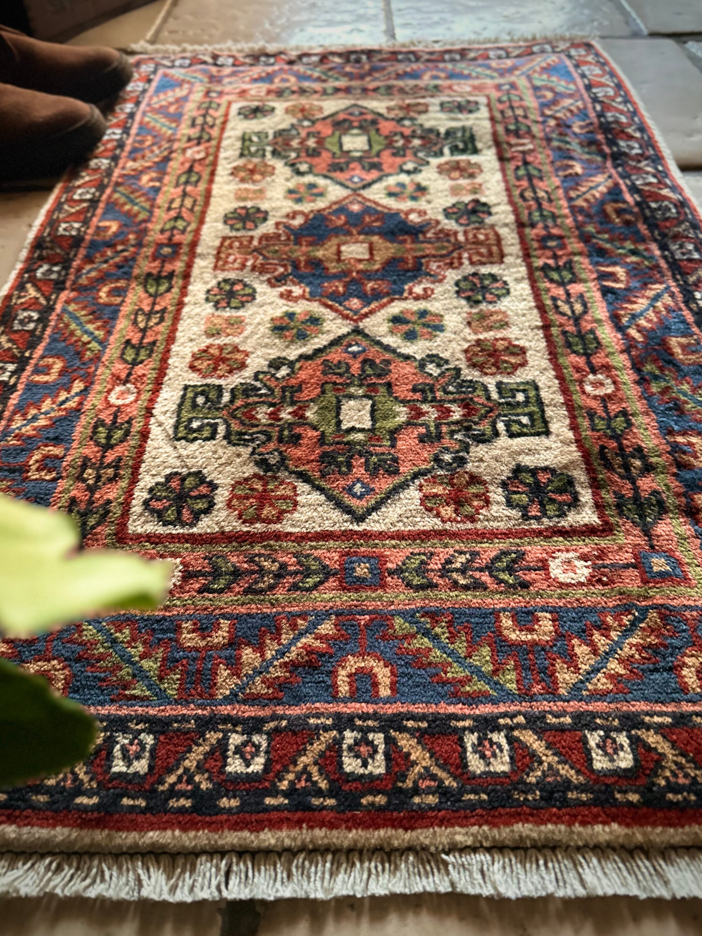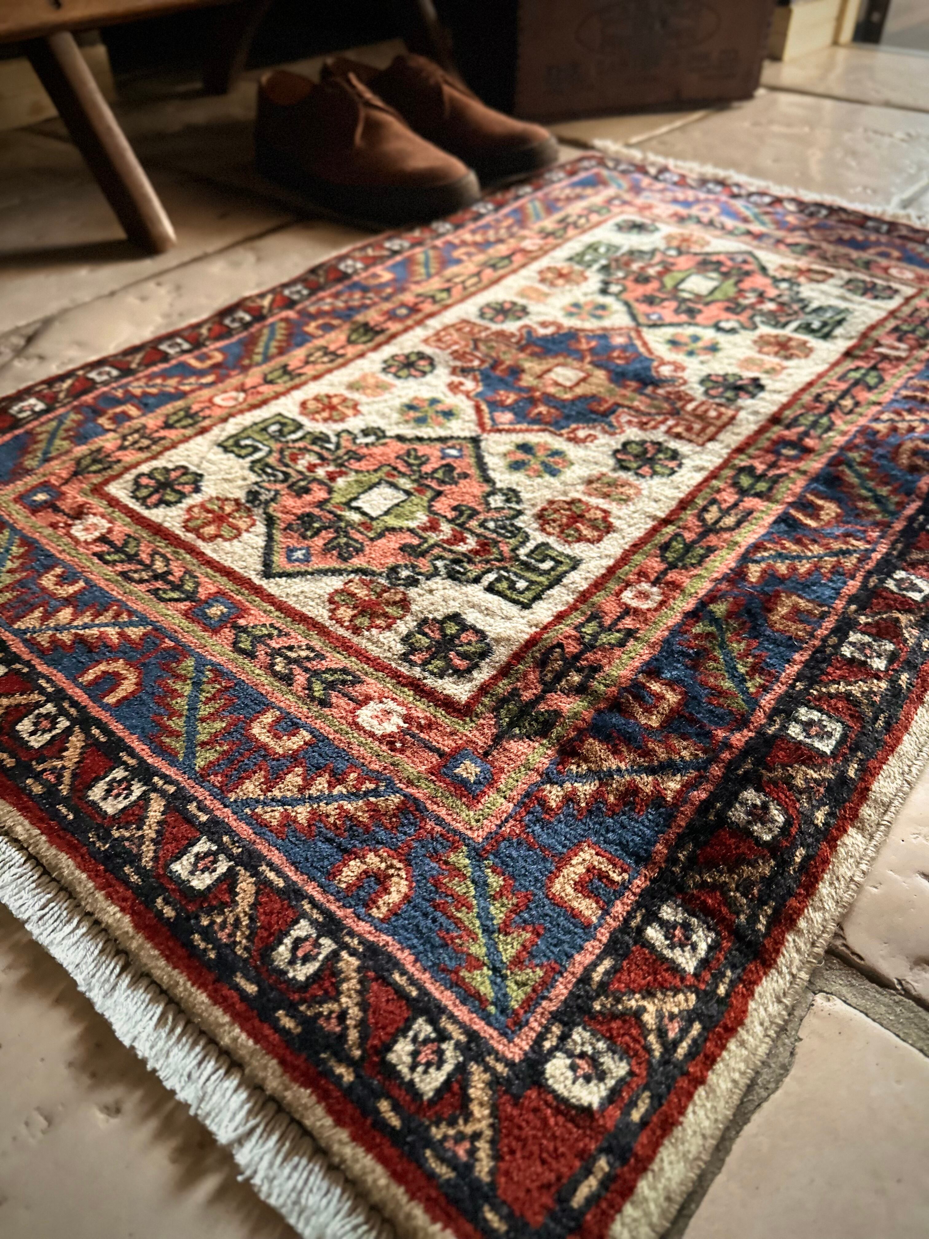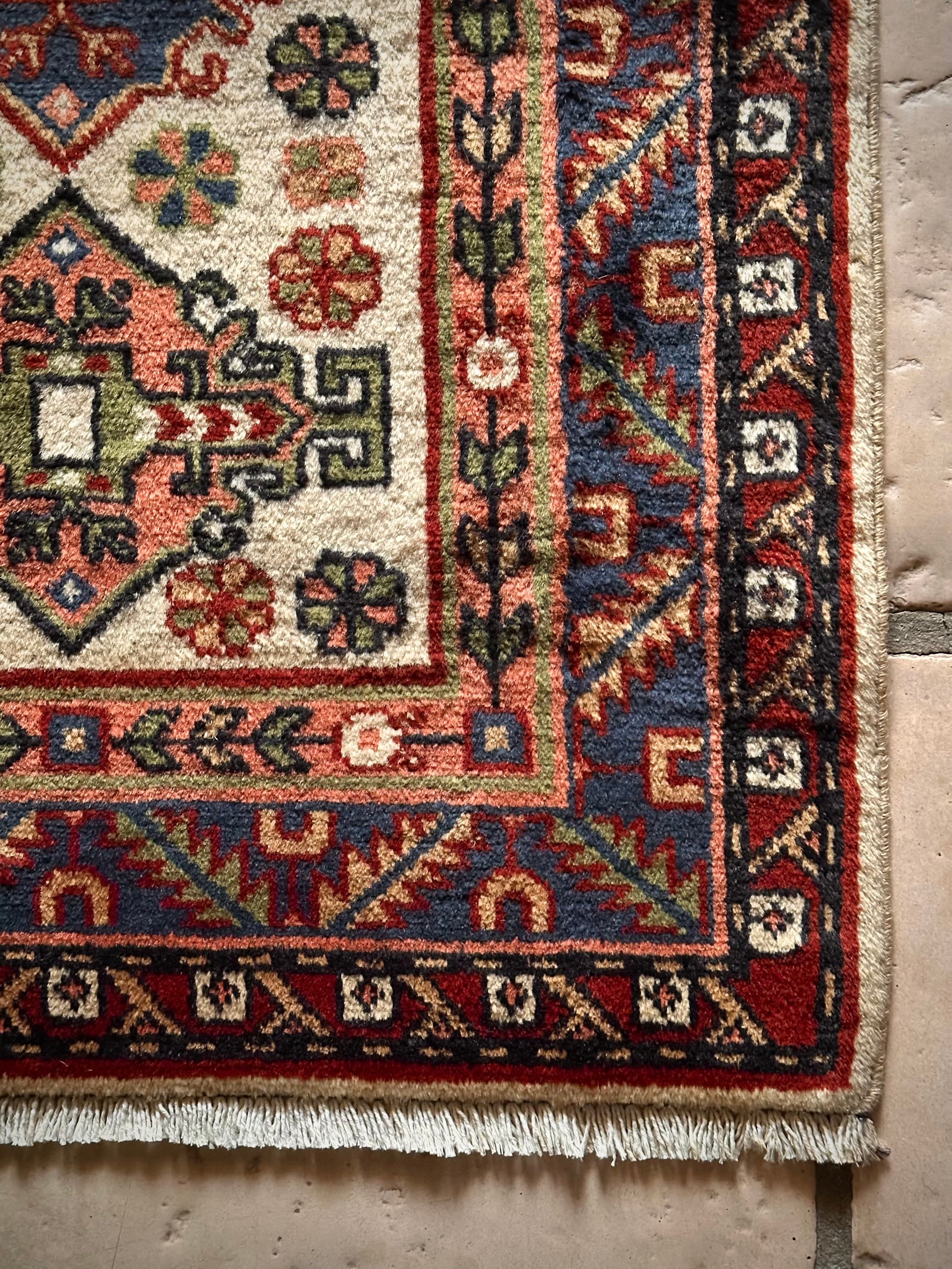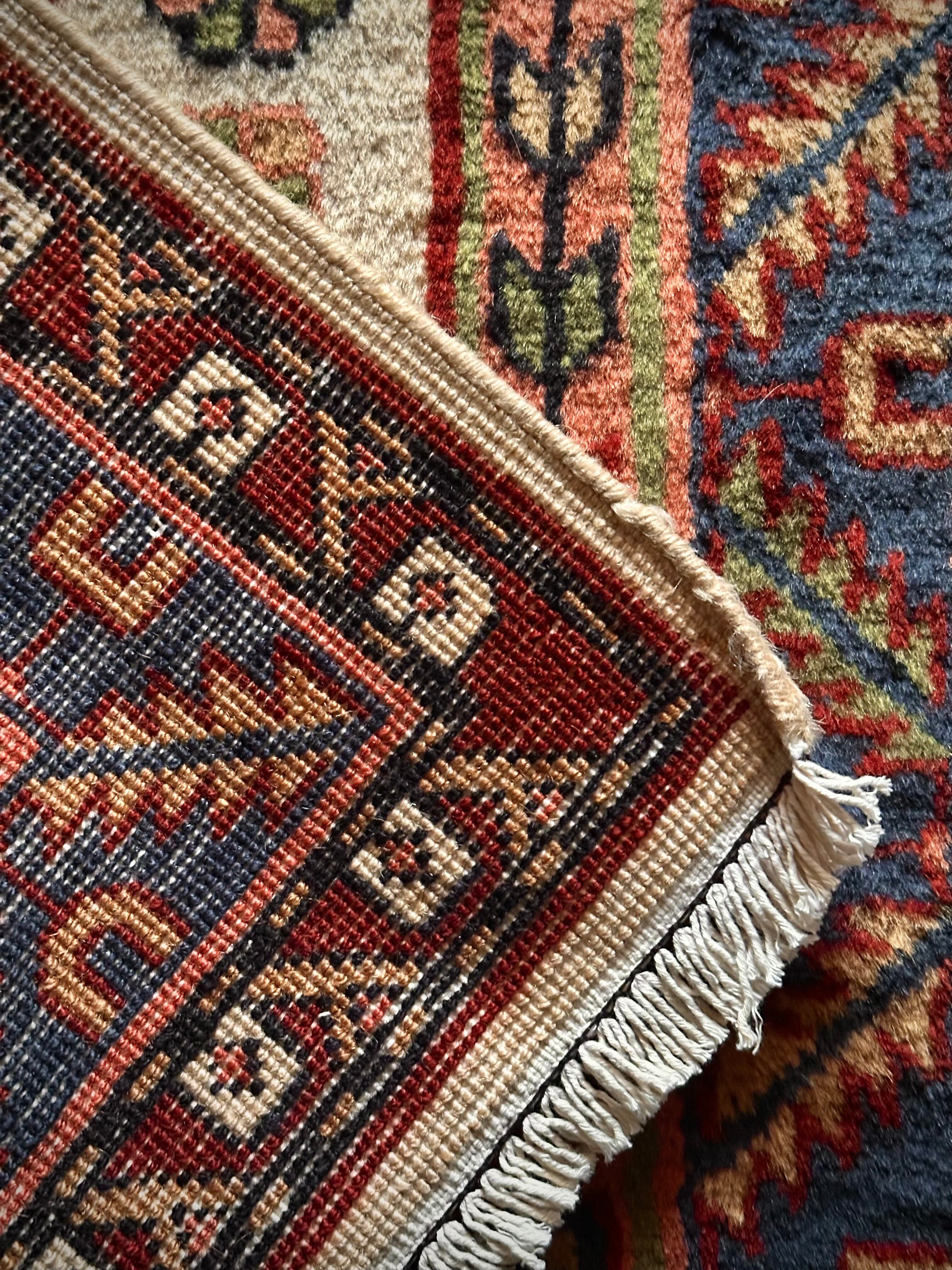 こちらあまり当店らしくないチョイスでたまの息抜きにピックアップしてしまう愛らしい系と、ベージュにピンク、ネイビーブルーにワインレッドのガーリーな配色が可愛らしい、イラン北西部はアルダビール近郊で手織りされたヴィレッジラグになります。