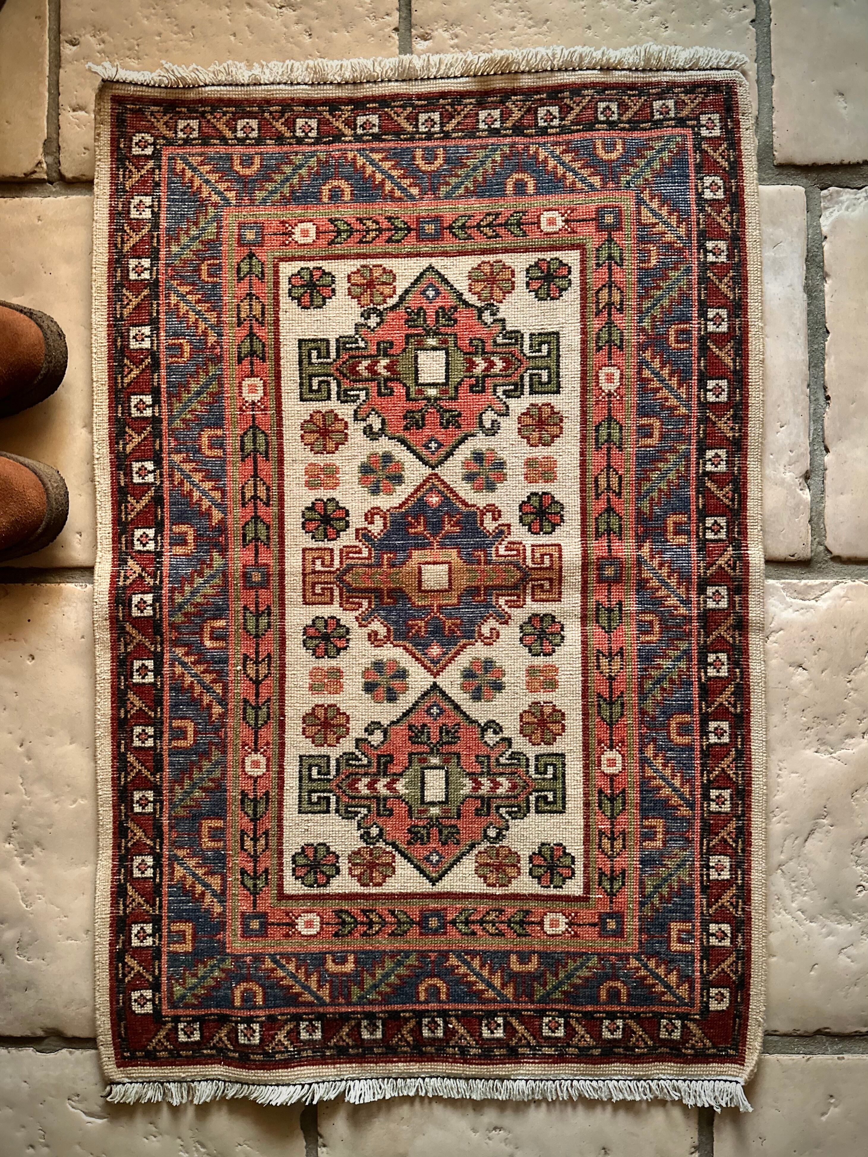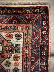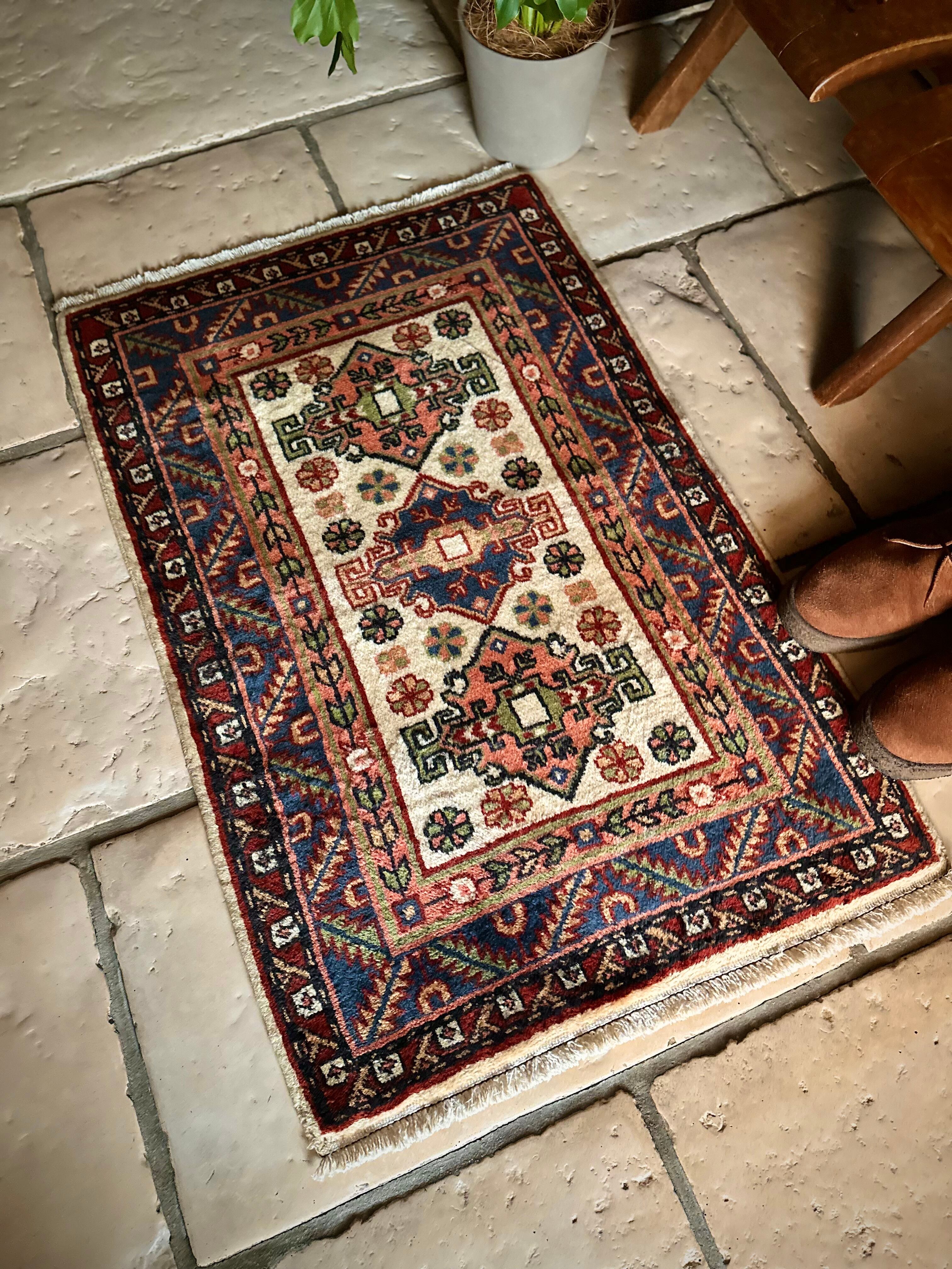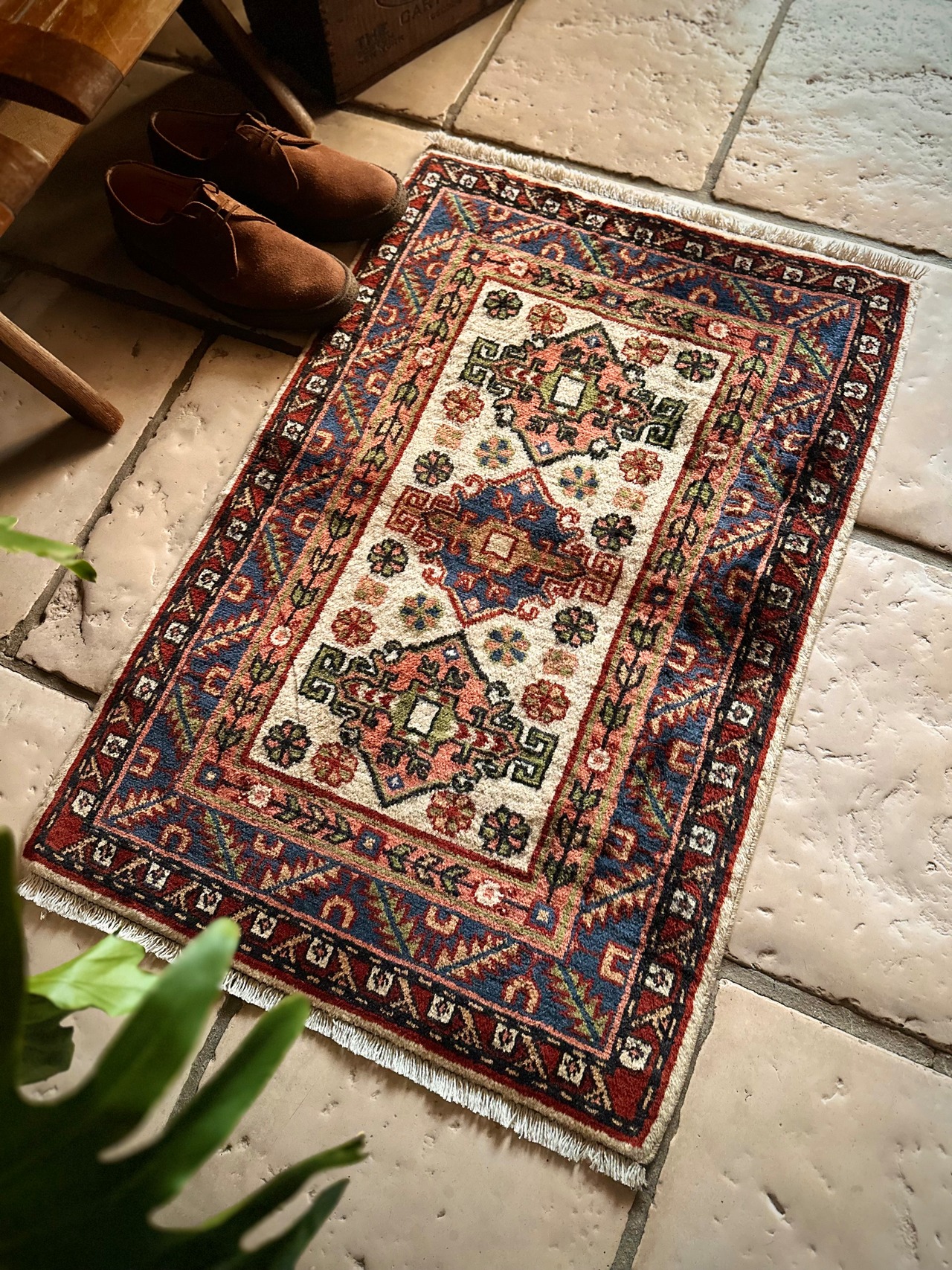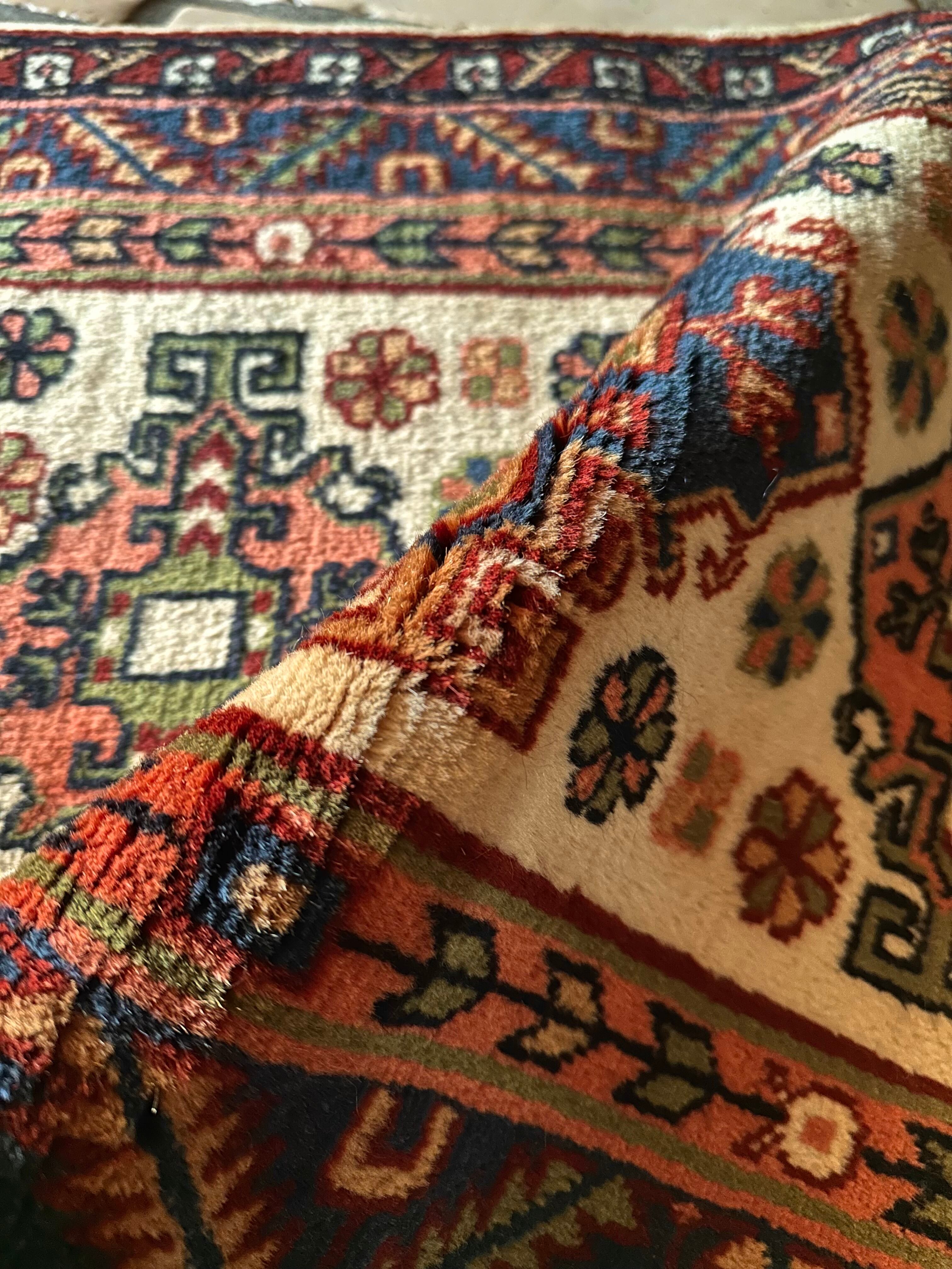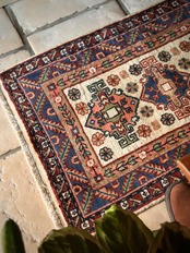 イラン北西部の都市タブリーズから車で3時間ほどの小さな街アルダビール周辺には平織りのキリムが盛んな村が点在していて、それらはコーカサス地方独特の紋様や絵柄が楽しく、こちらもそんな大らかな絵柄で、大きさとしては日本の一般的な玄関マットサイズとなります。