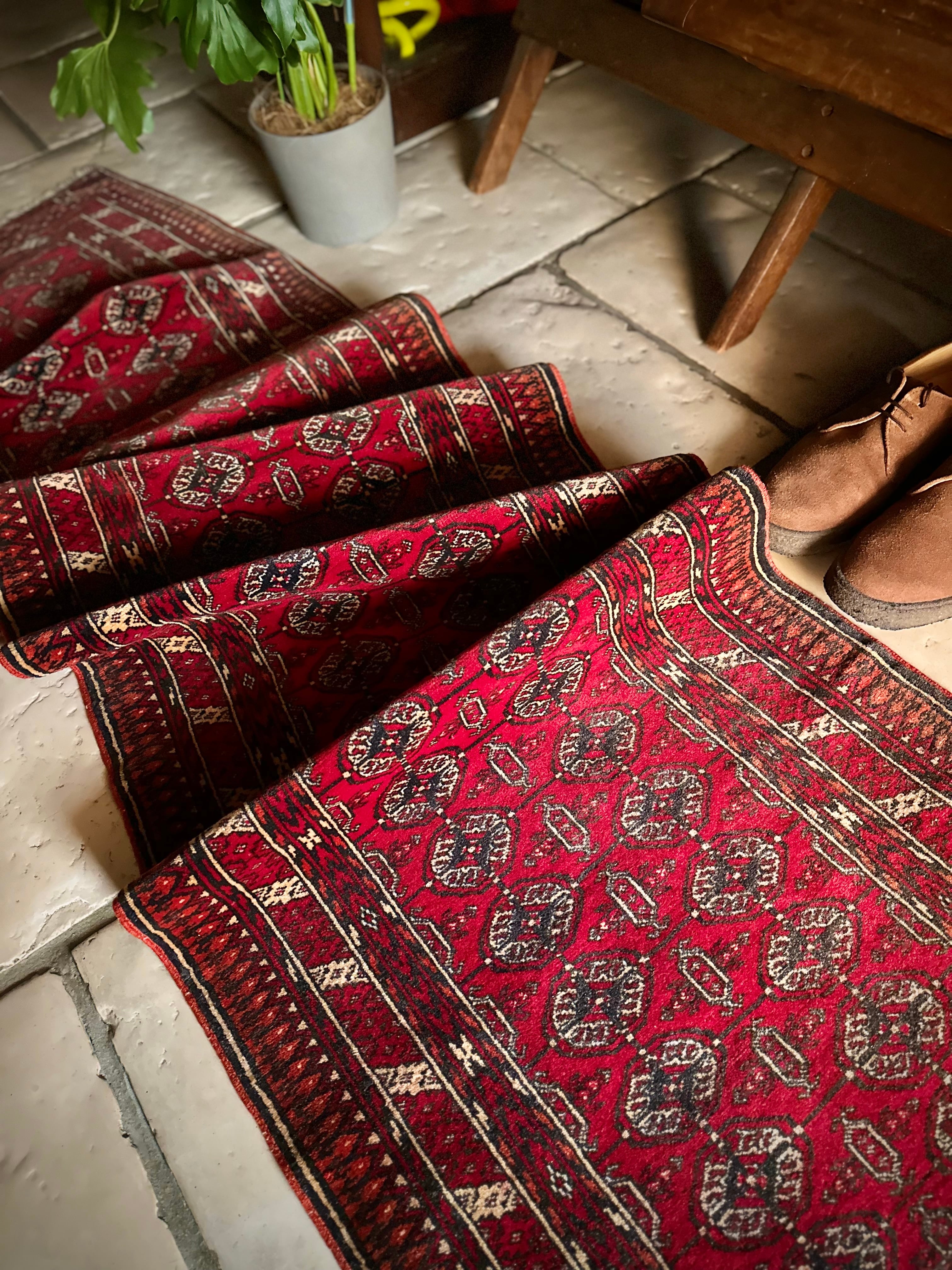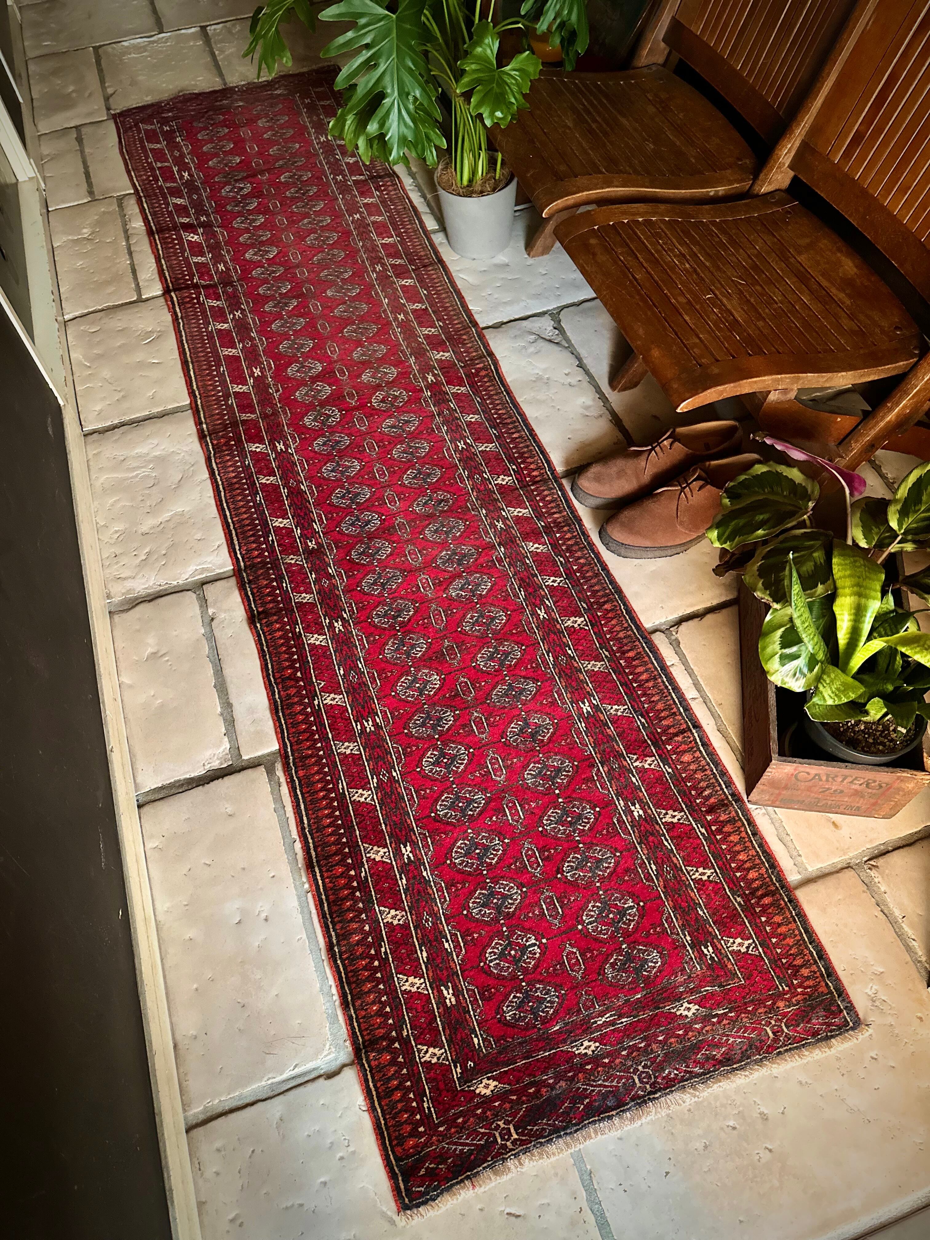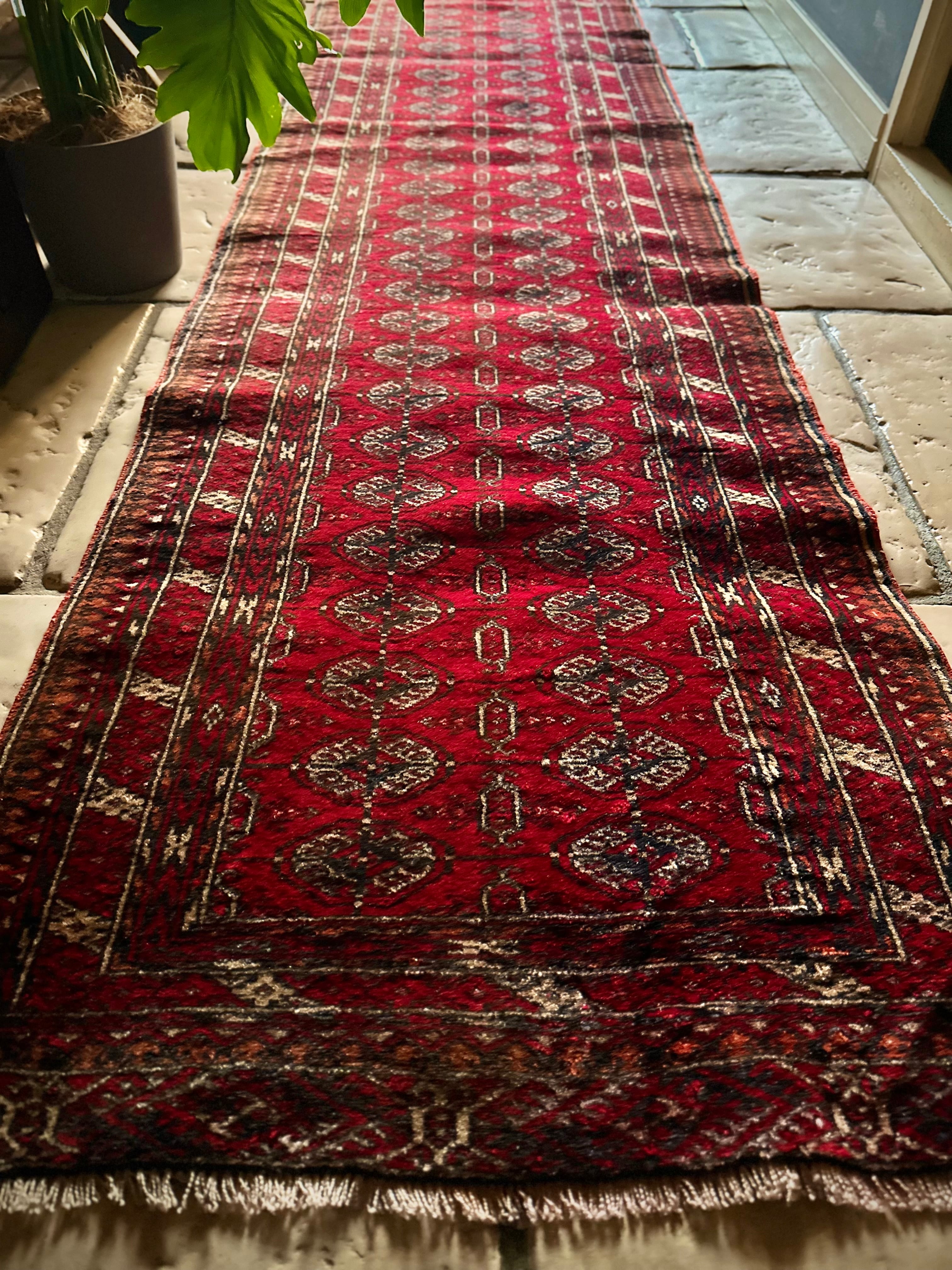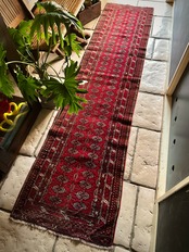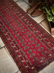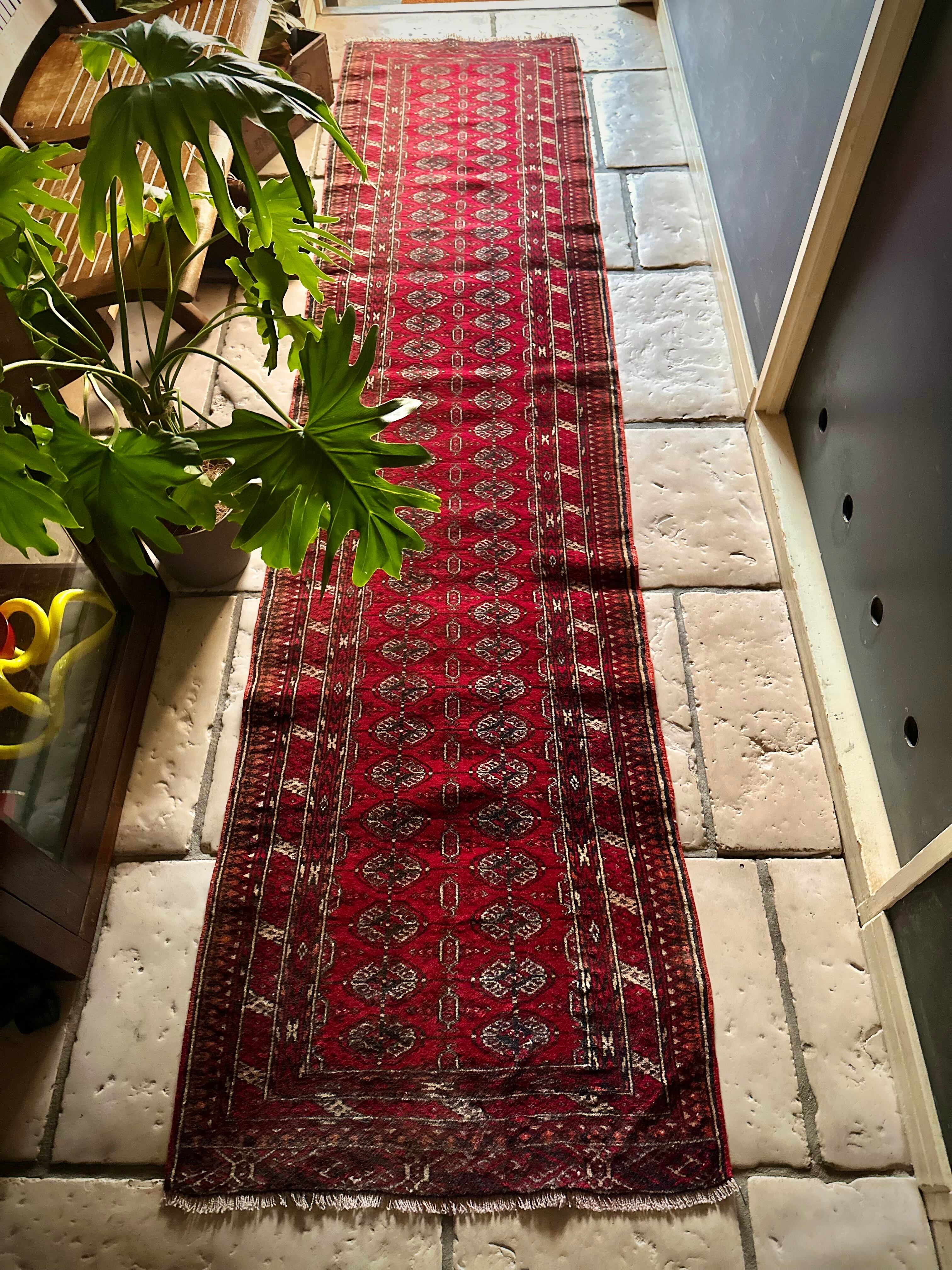 60cmという細幅に2.5メートルの長尺なランナータイプで、家内の廊下はもちろん室内での動線を導く敷物としても最適な1枚ですが、トルクメン特有の5ミリという薄手なラグになりますので滑り止めはお忘れなく。