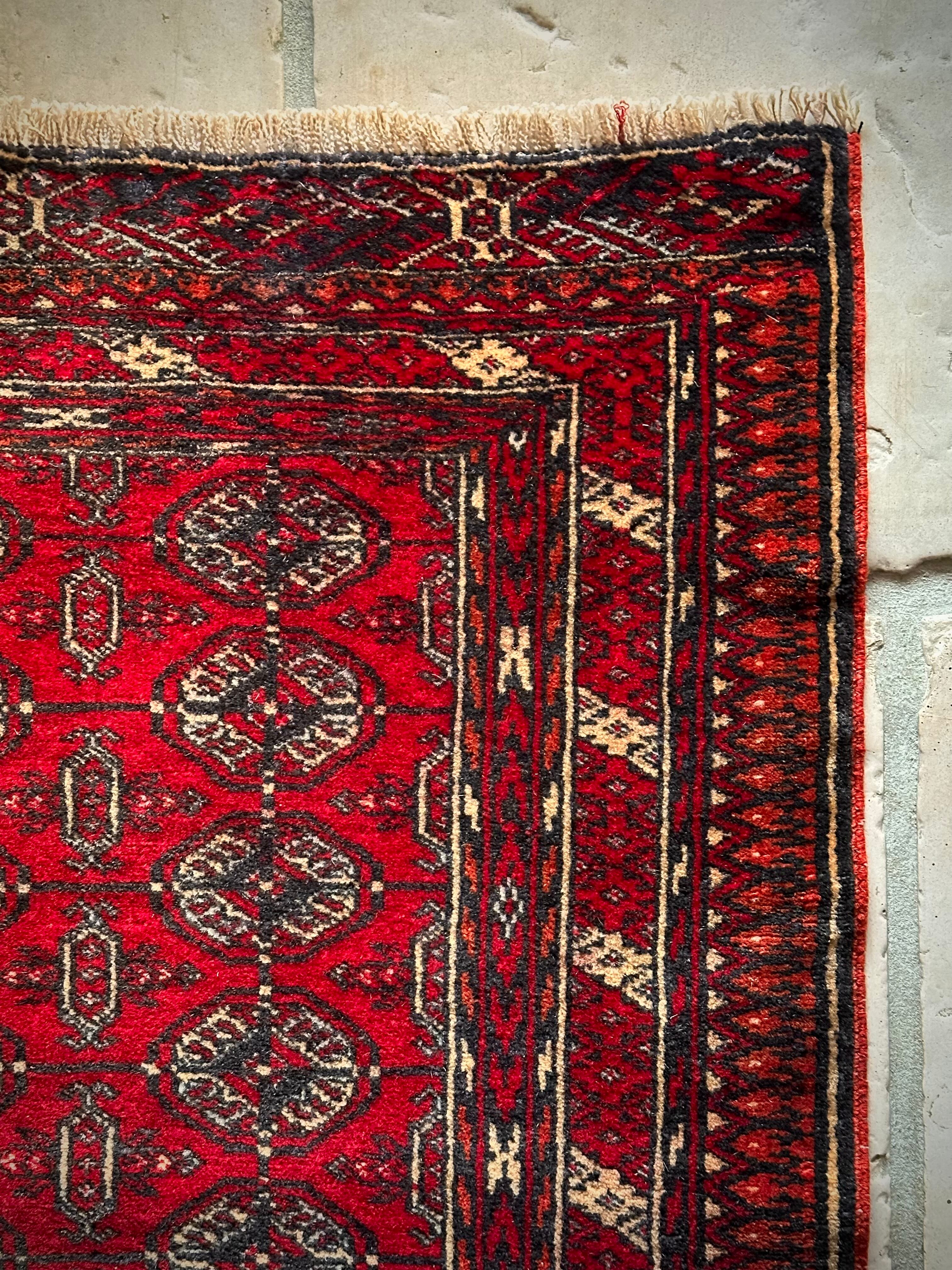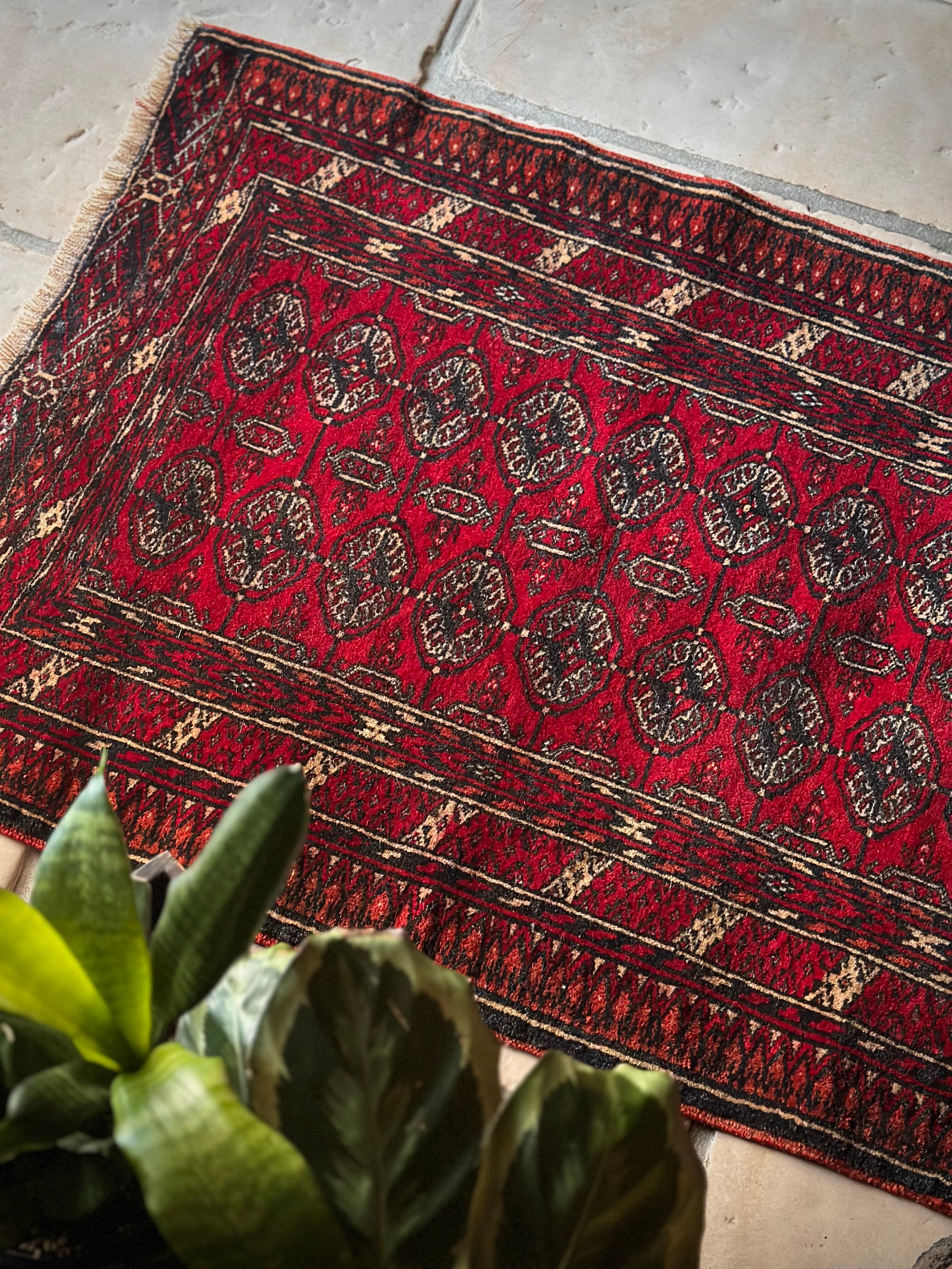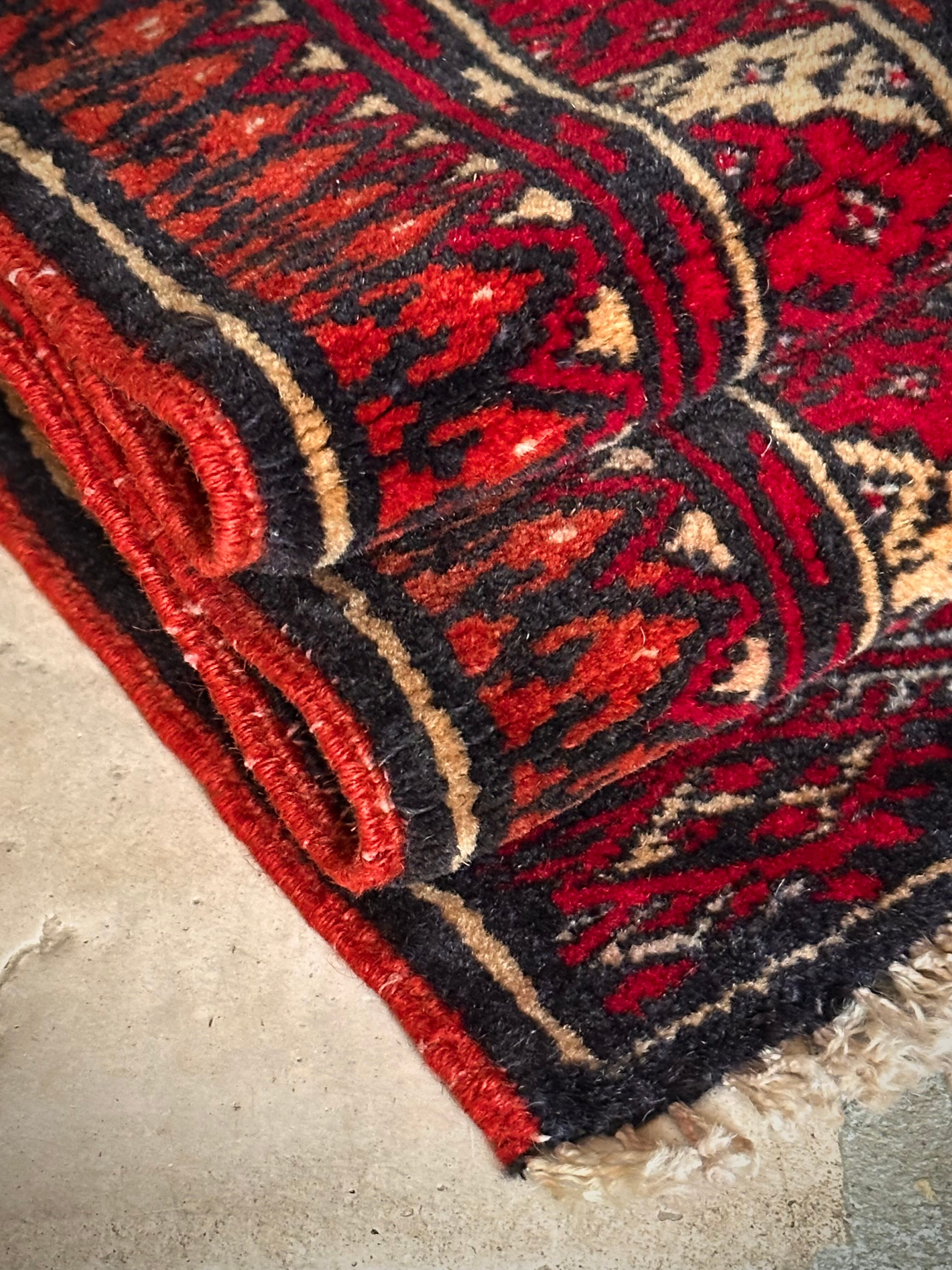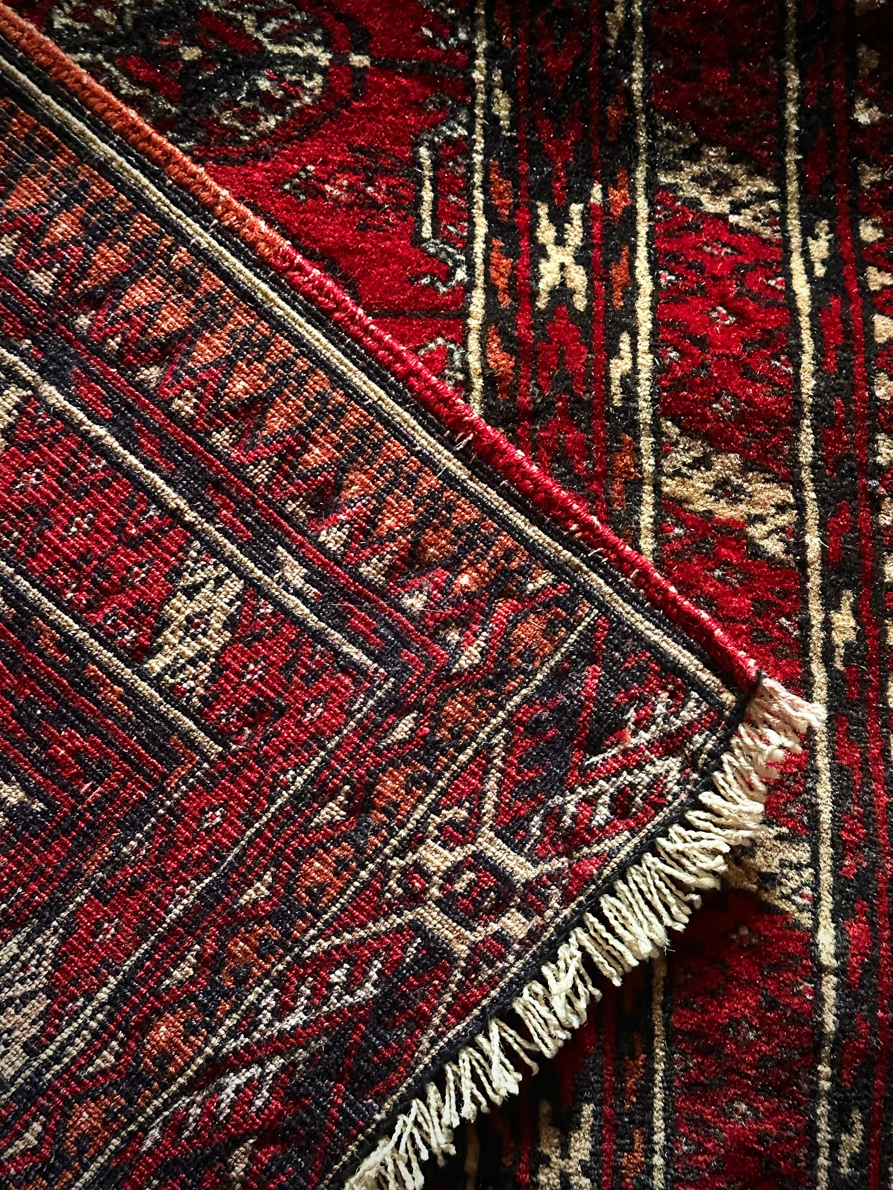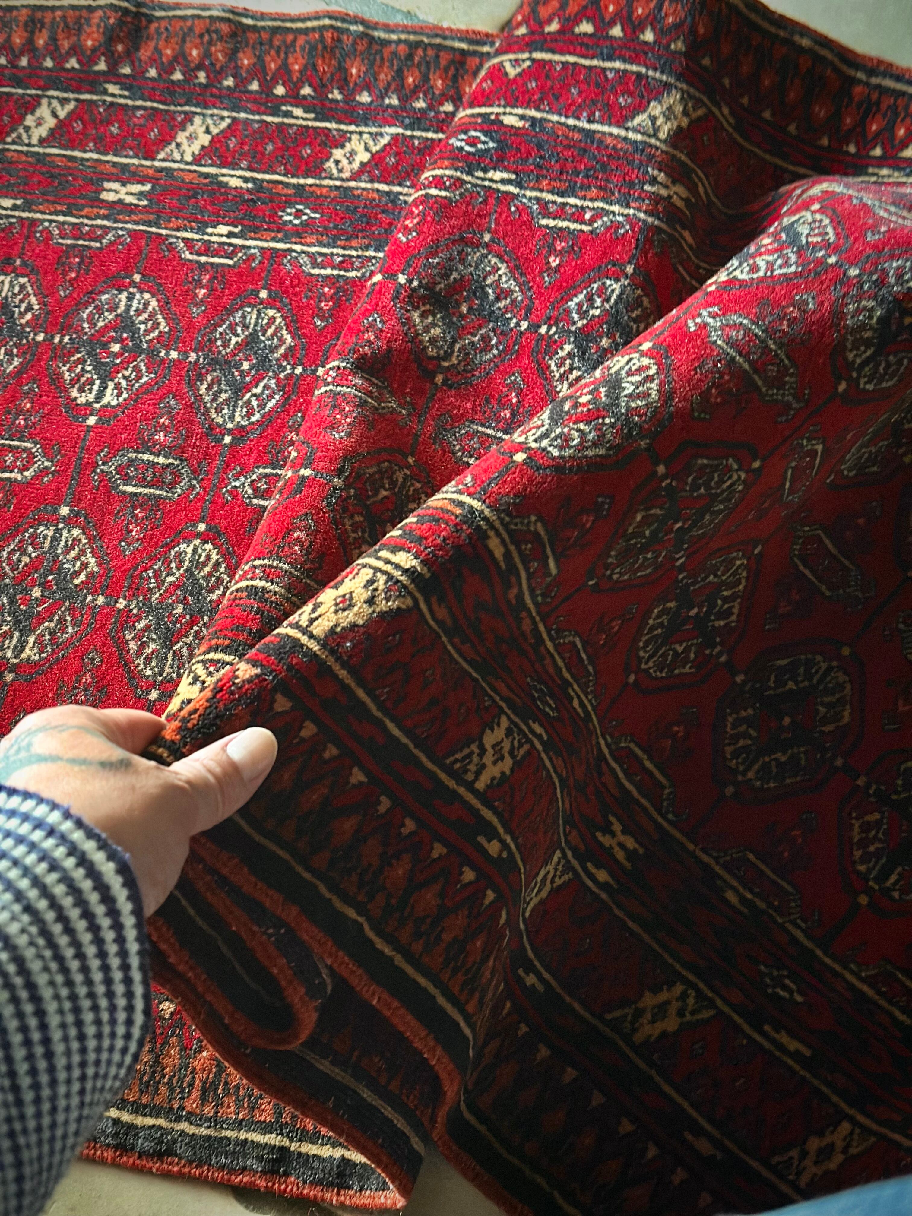 これぞレッドカーペットと言わんばかりの真紅な色合いに”Mori gul”と呼ばれる細かな連続紋様が部族絨毯という風格を表現していてかっこいい、アフガニスタン北部に居住するトルクメン族のトライバルラグになります。