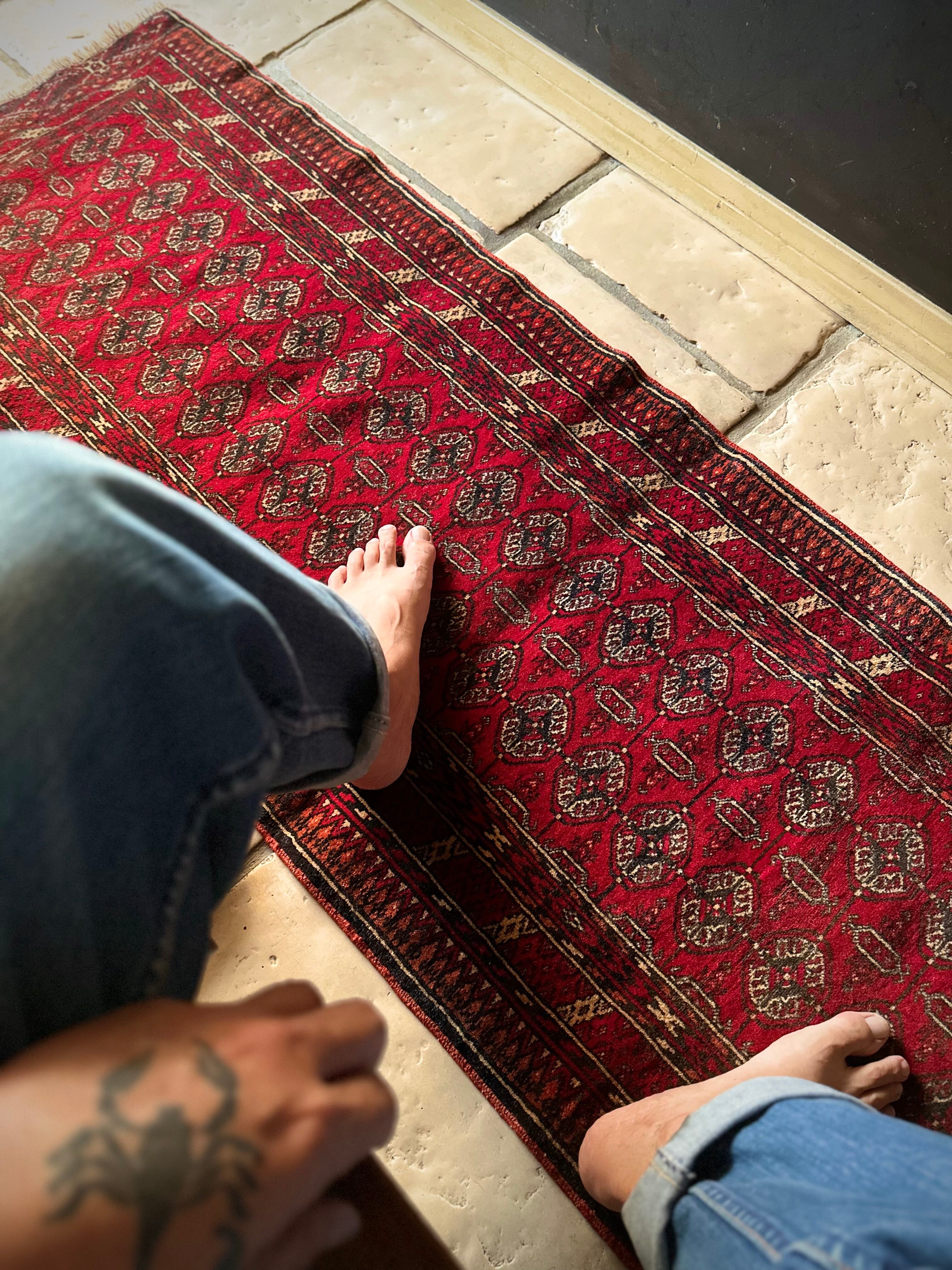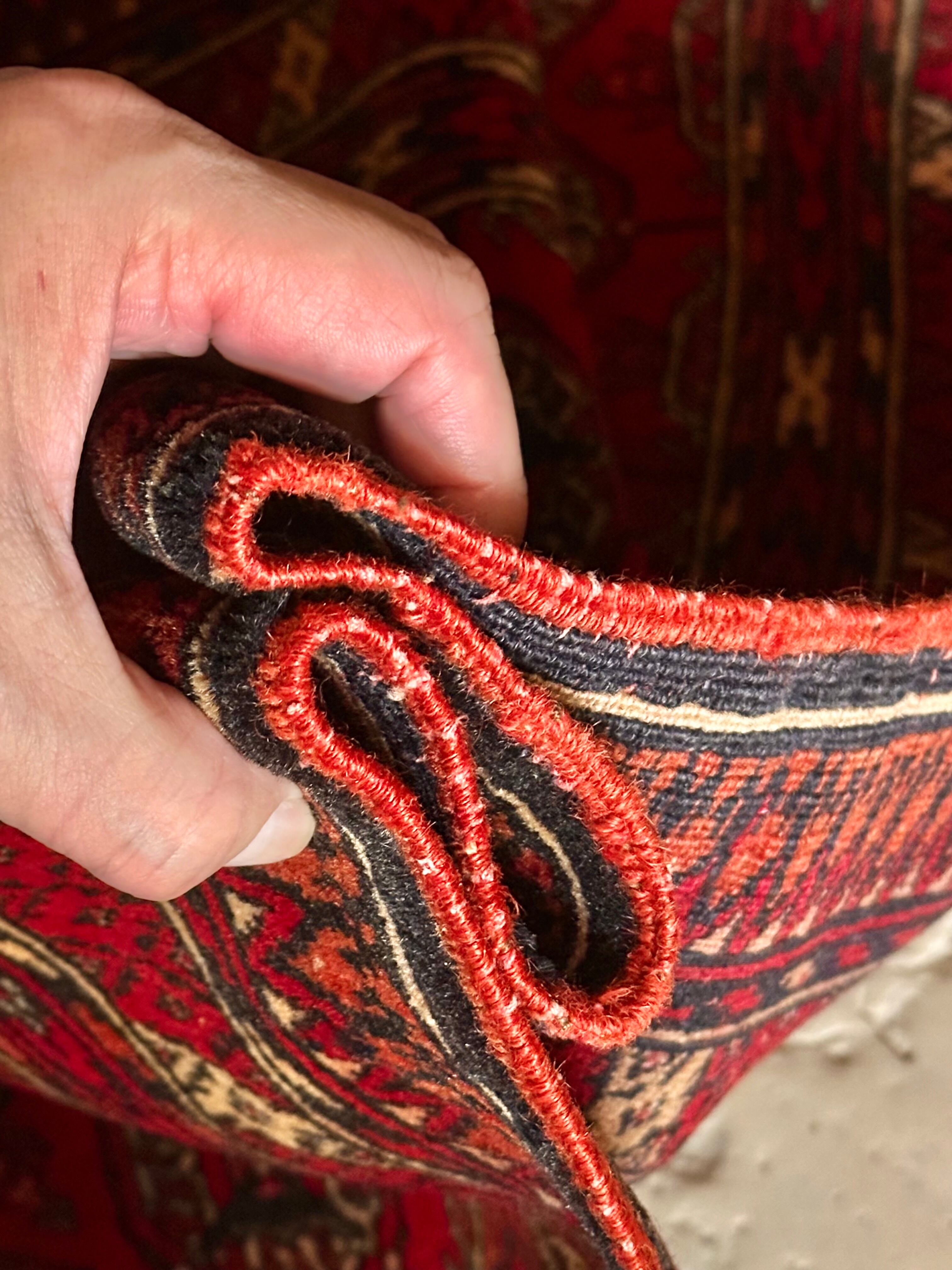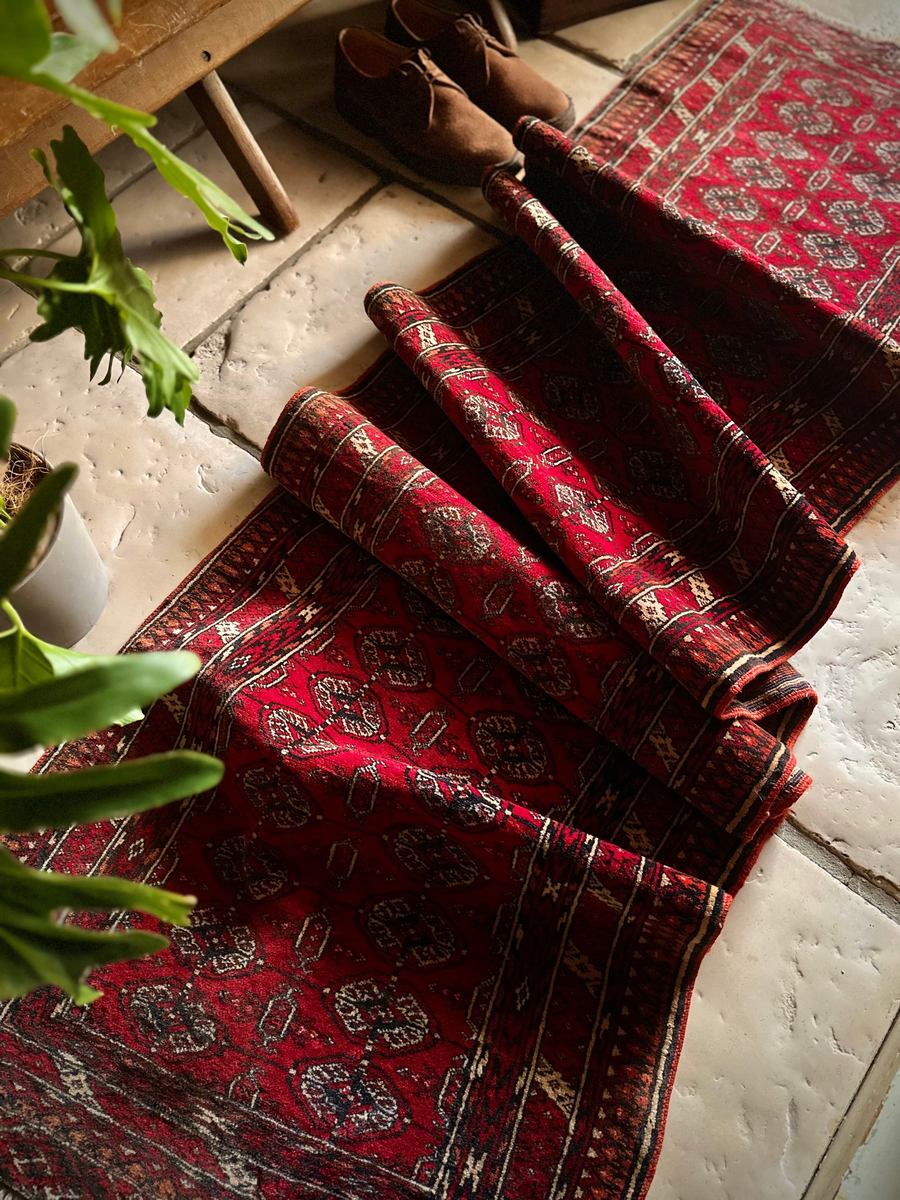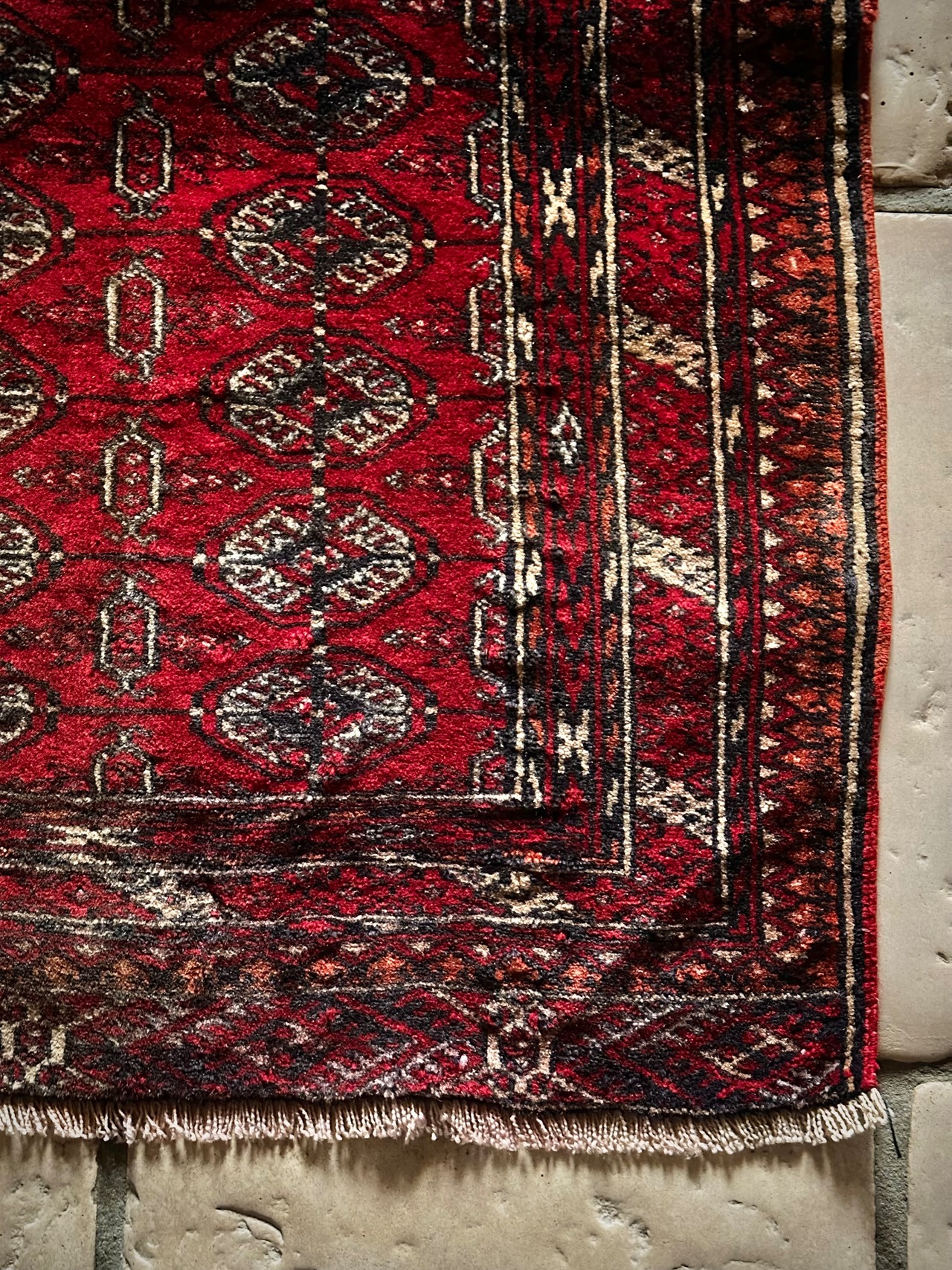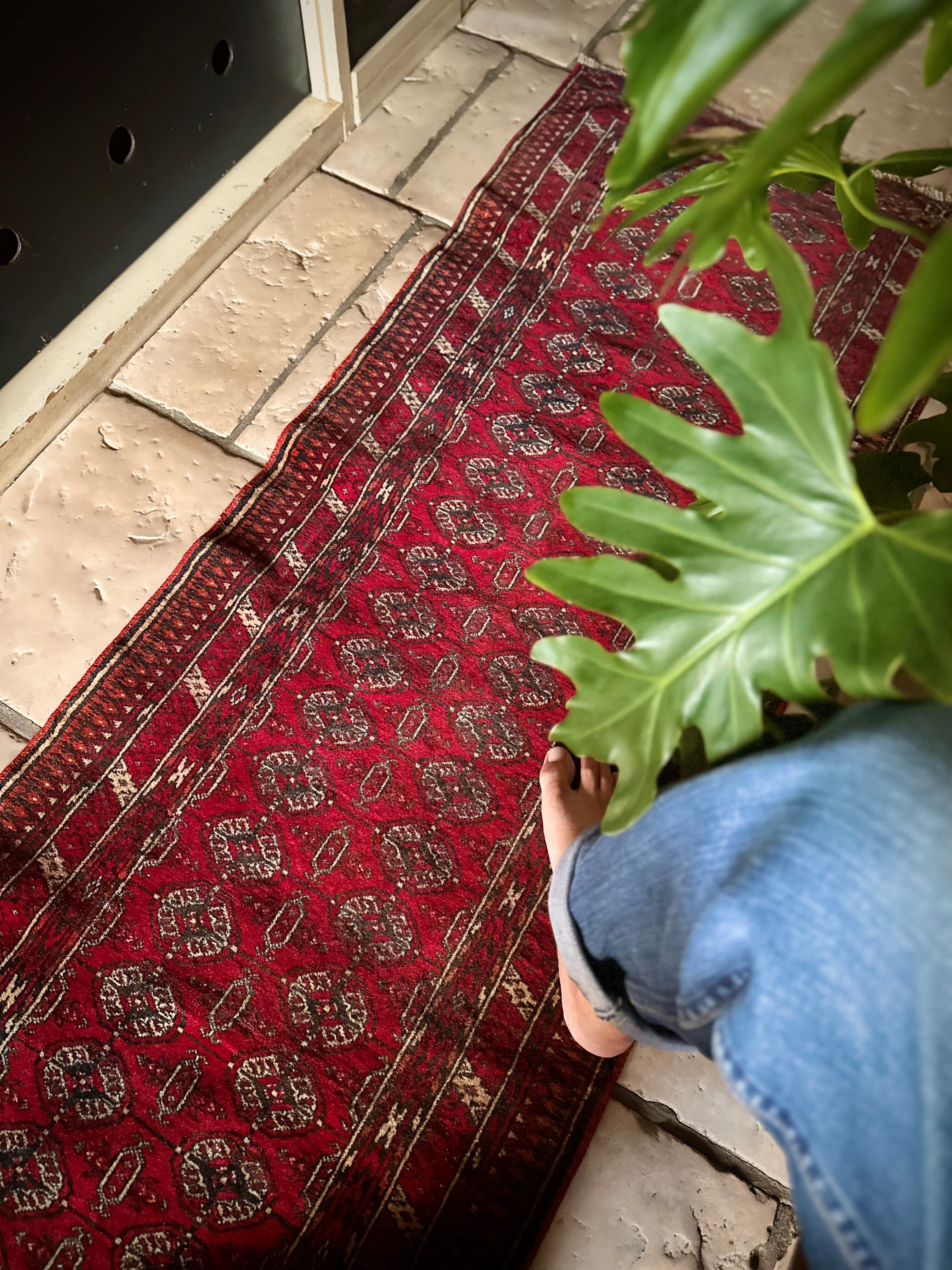 これぞレッドカーペットと言わんばかりの真紅な色合いに”Mori gul”と呼ばれる細かな連続紋様が部族絨毯という風格を表現していてかっこいい、アフガニスタン北部に居住するトルクメン族のトライバルラグになります。