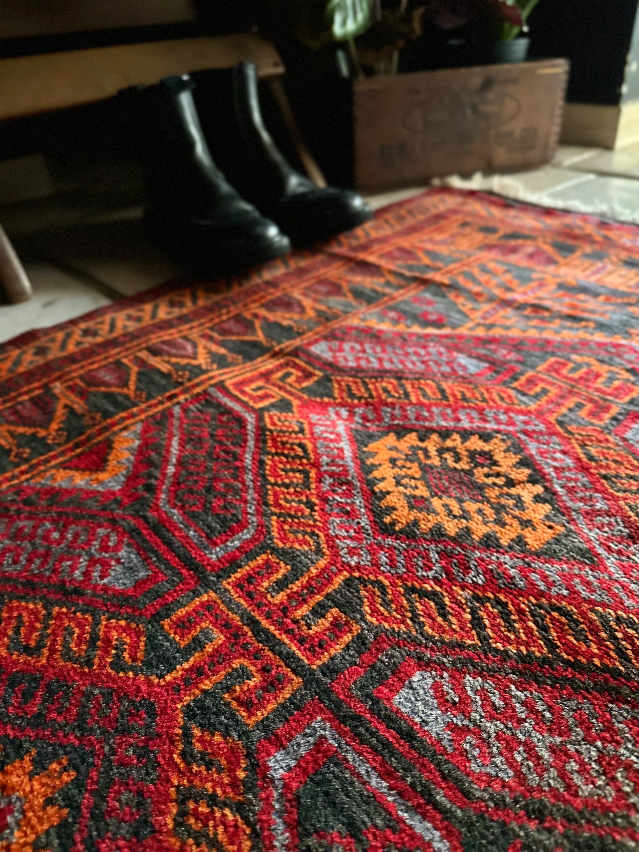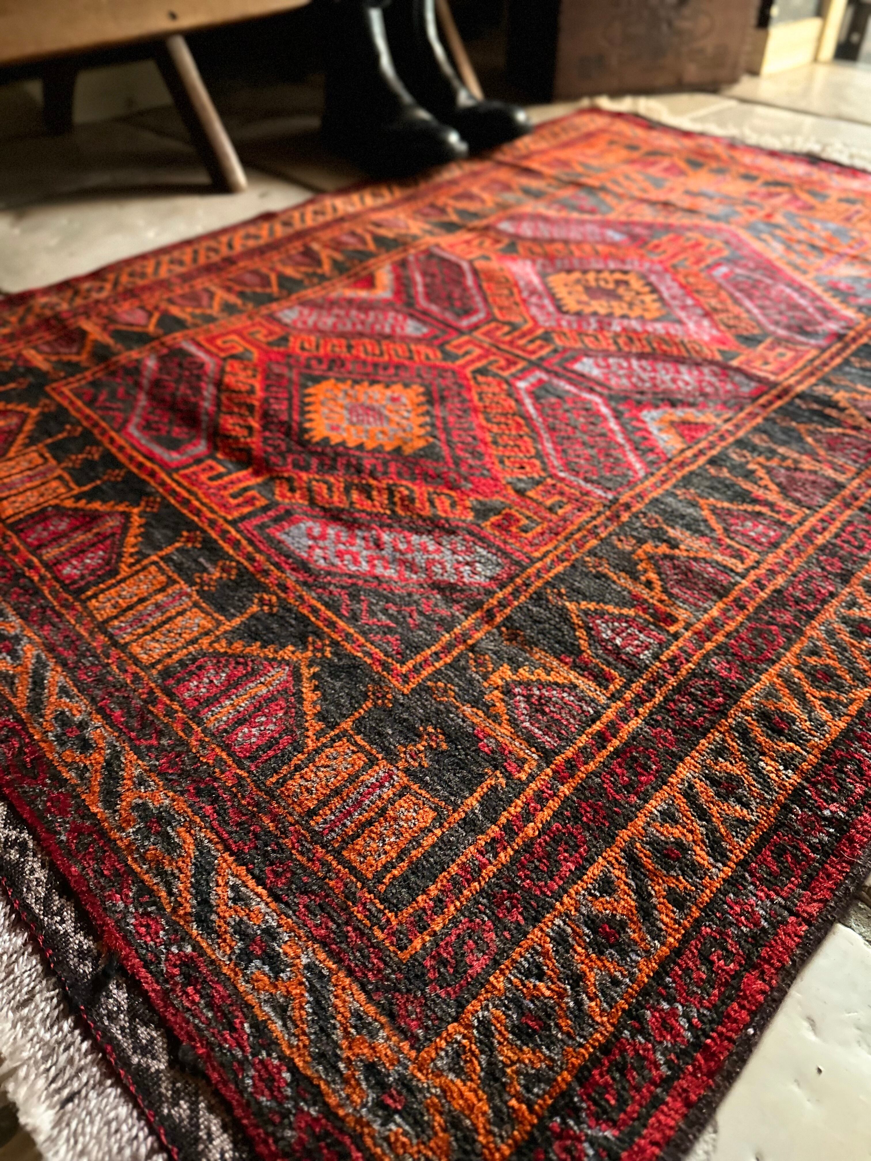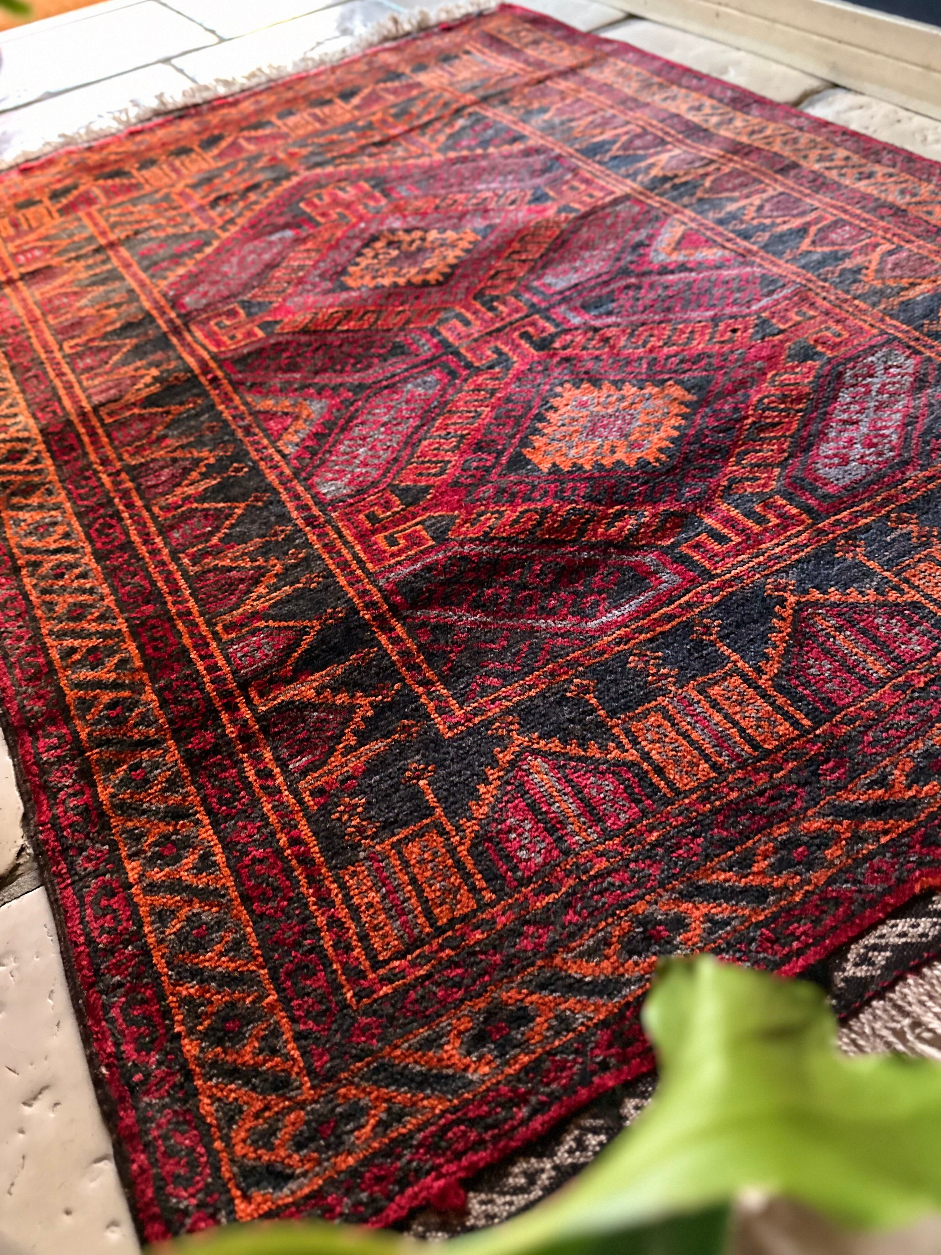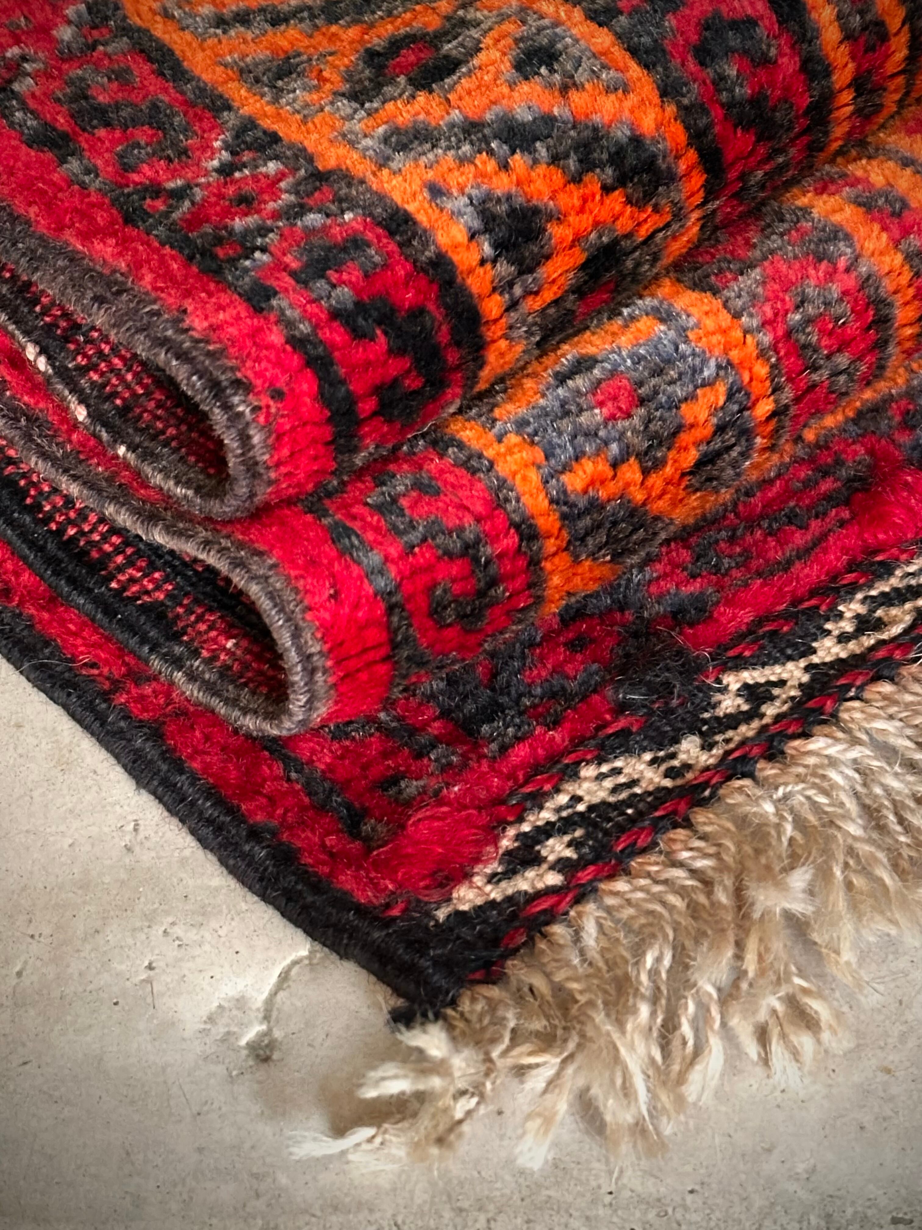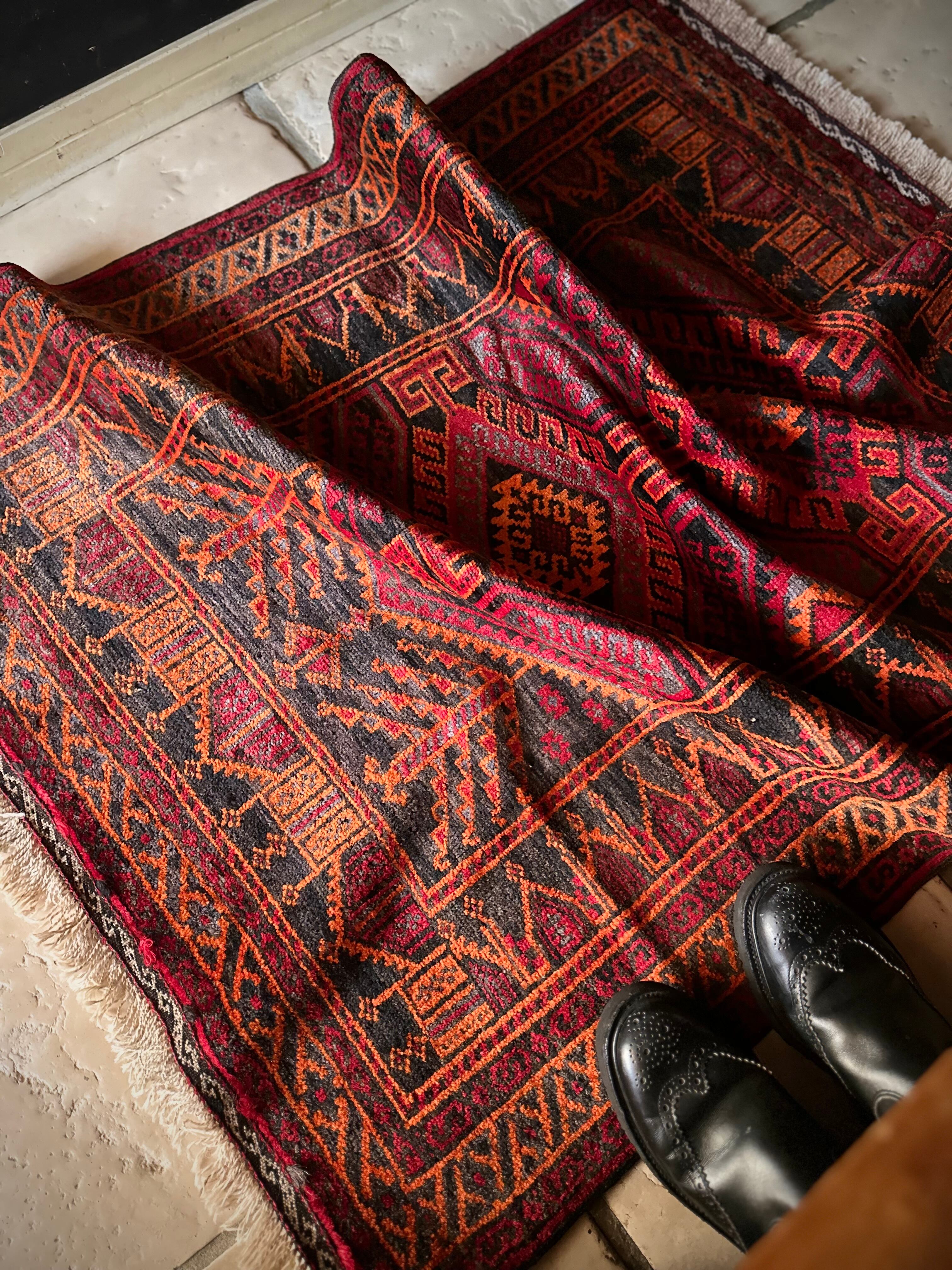 ブラックを背景に赤とオレンジで燃えるような色彩を現した祈祷用のプレイヤーラグで、何度か似たような配色に柄のモノを販売していますが、全てはアフガニスタンのヘラート産バルーチからのトライバルラグで、個人的にも好きな類いでついついピックアップしてしまいます。