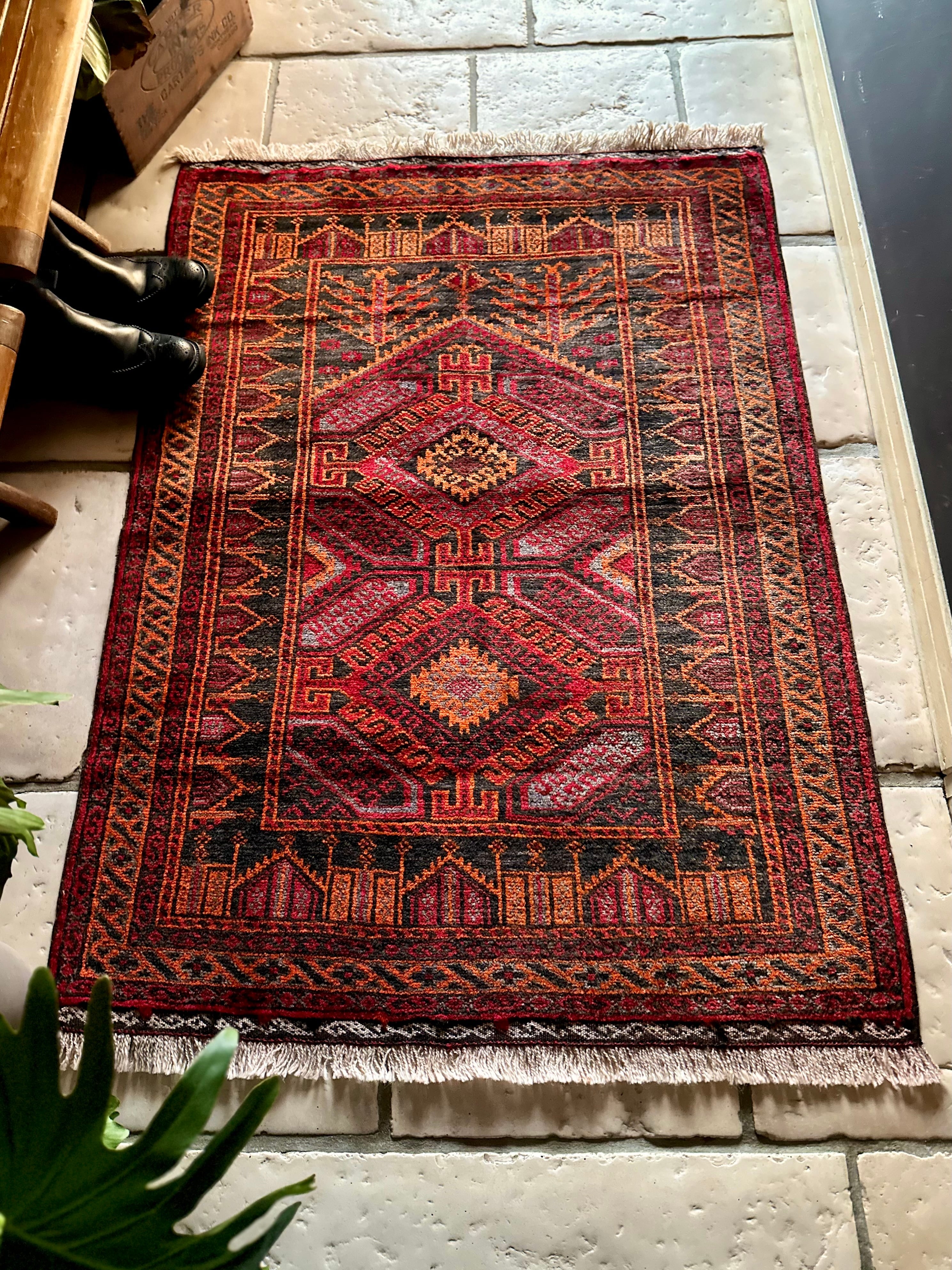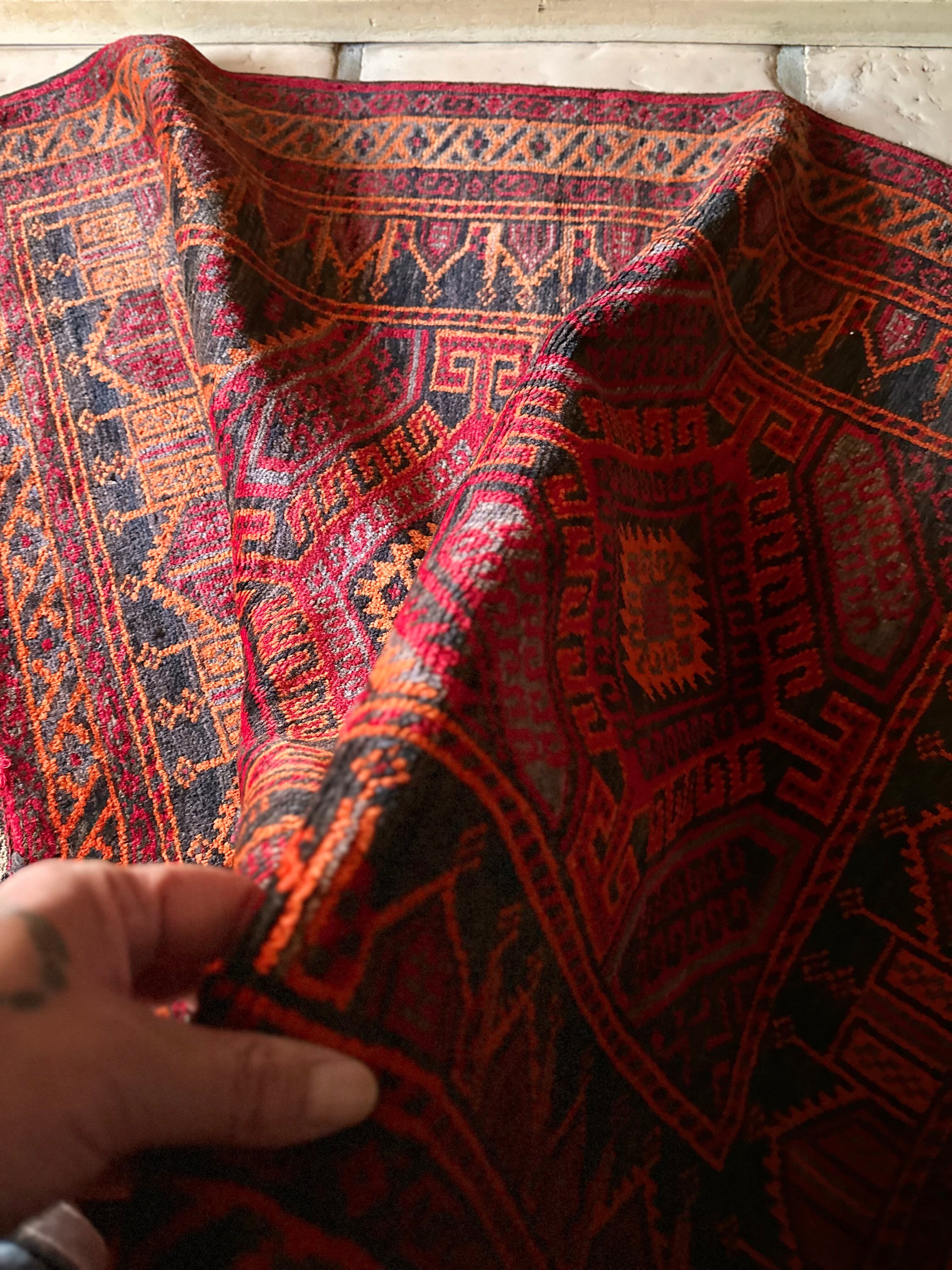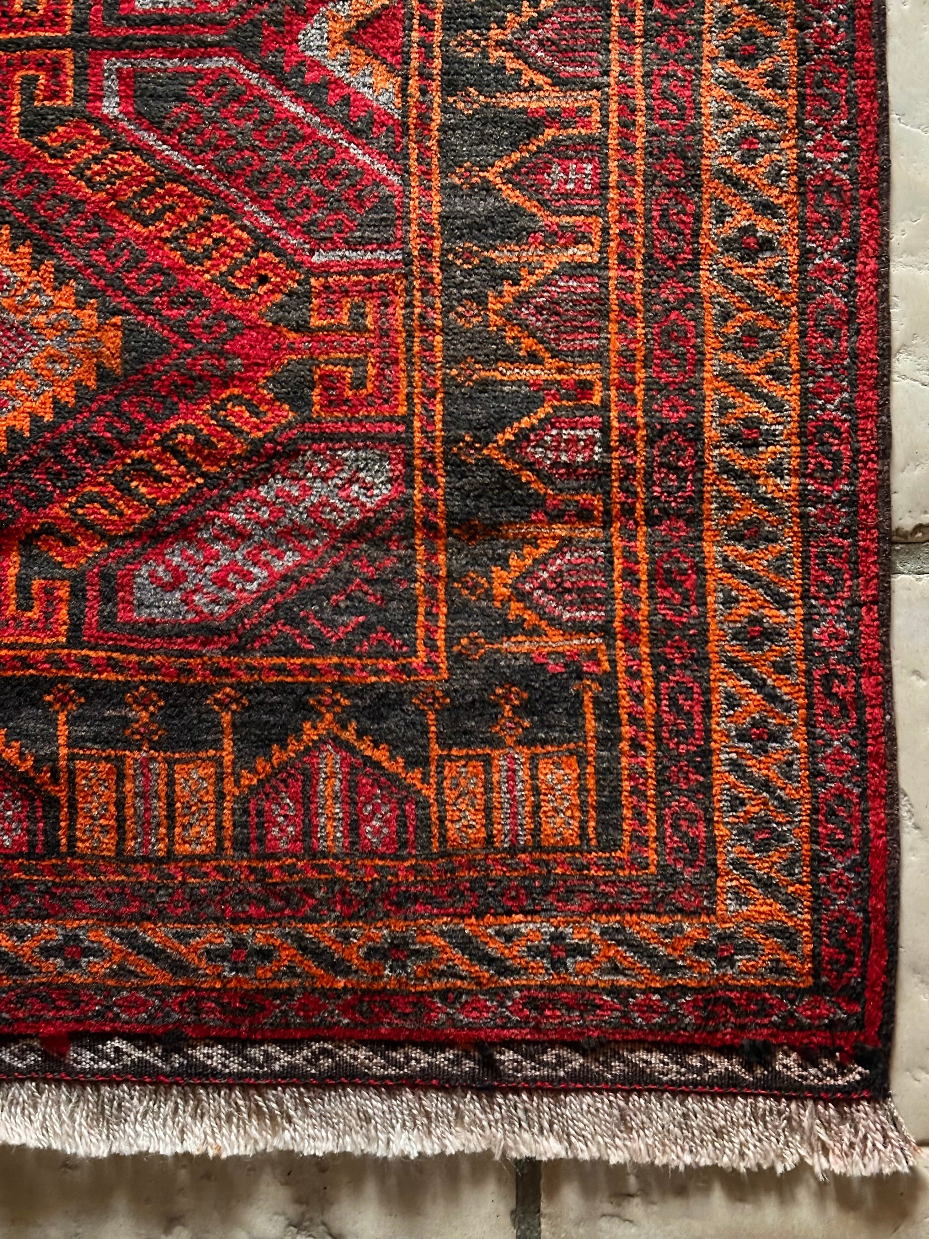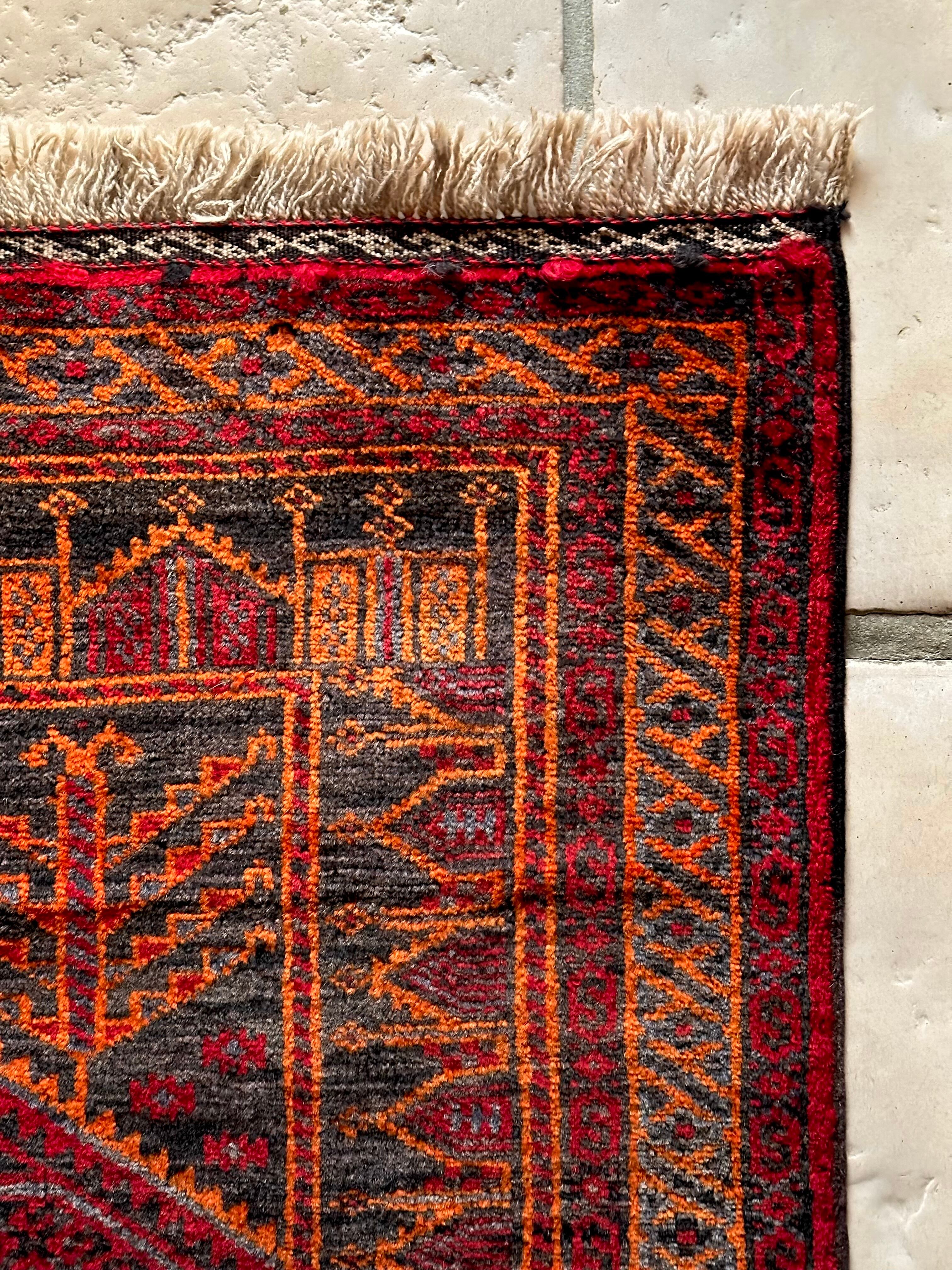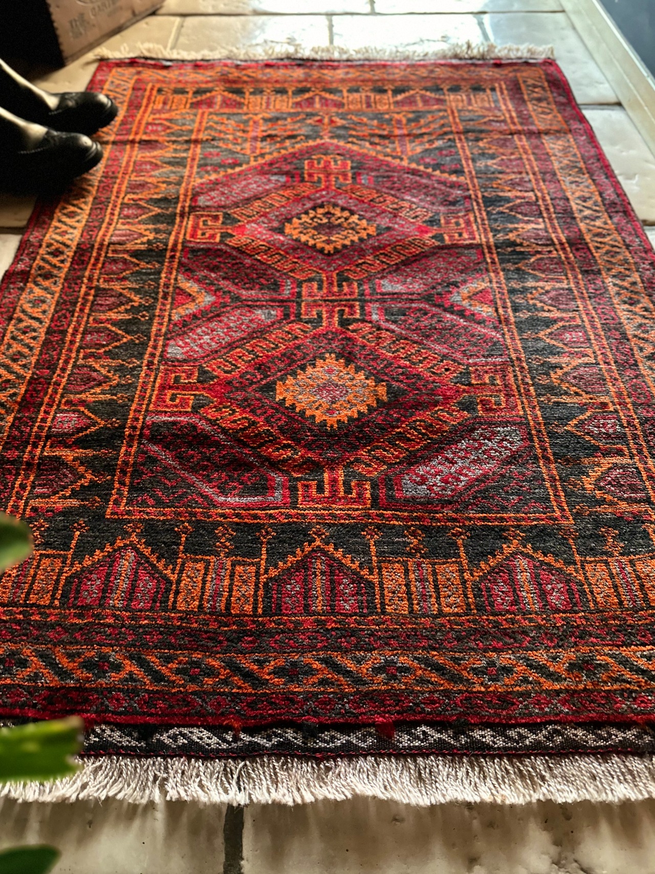 ブラックを背景に赤とオレンジで燃えるような色彩を現した祈祷用のプレイヤーラグで、何度か似たような配色に柄のモノを販売していますが、全てはアフガニスタンのヘラート産バルーチからのトライバルラグで、個人的にも好きな類いでついついピックアップしてしまいます。