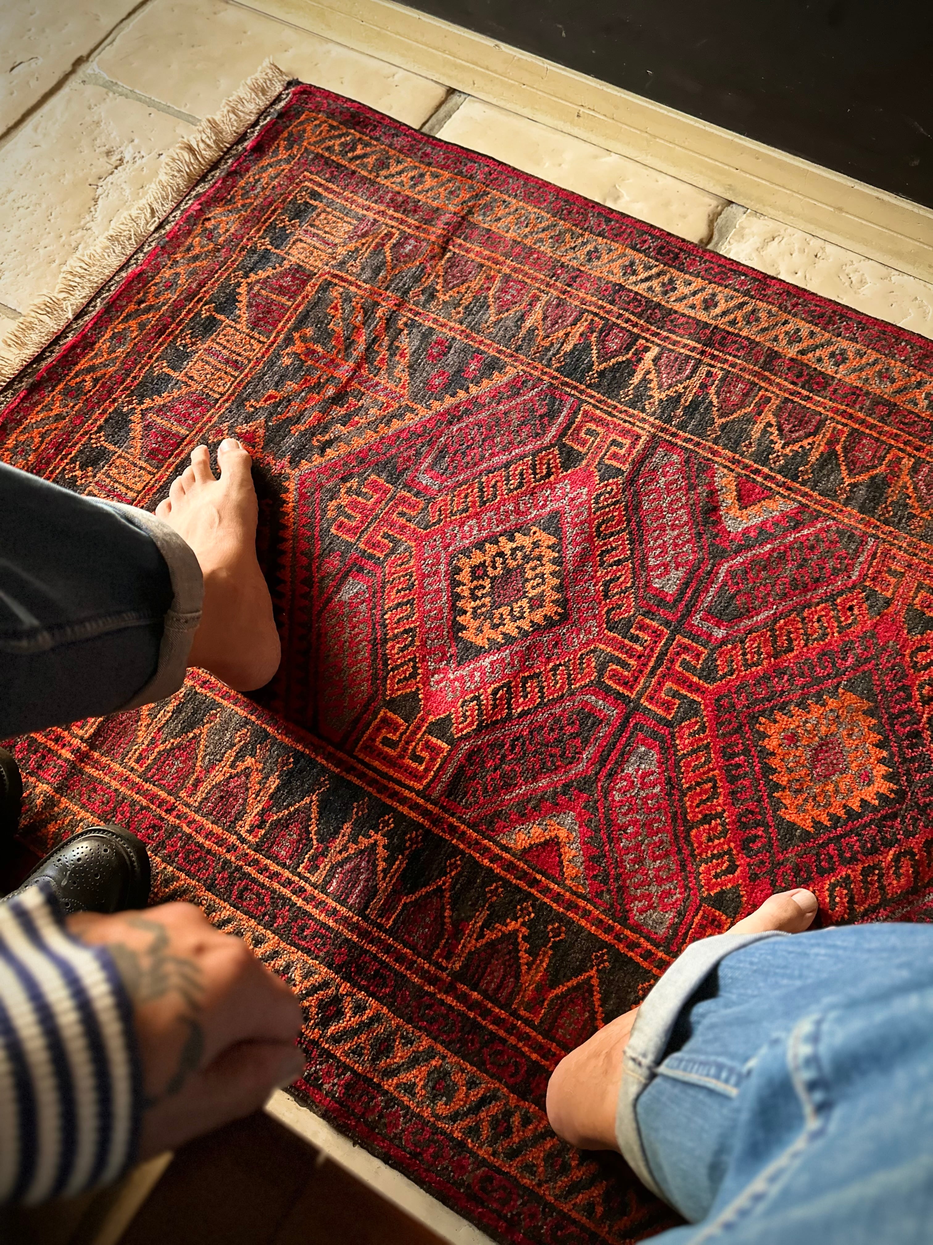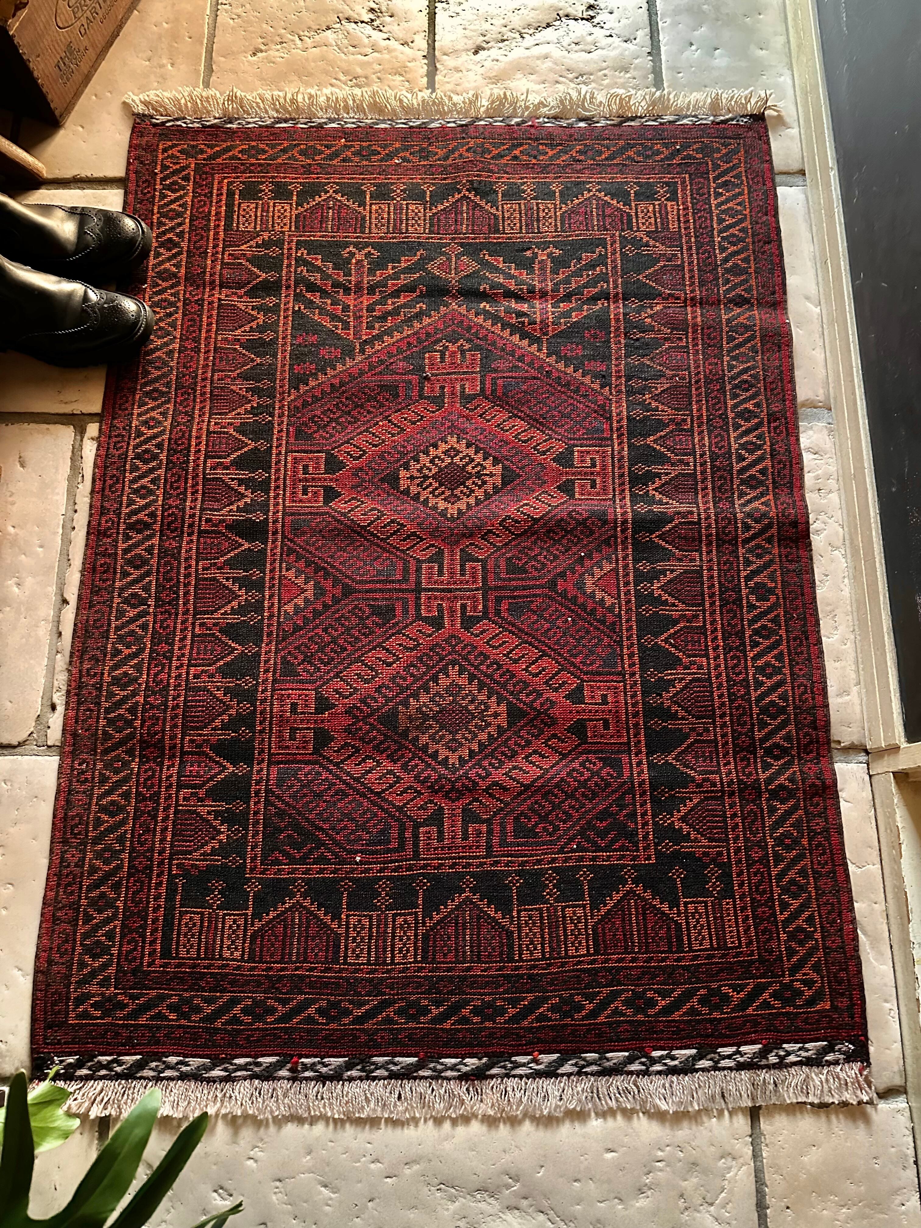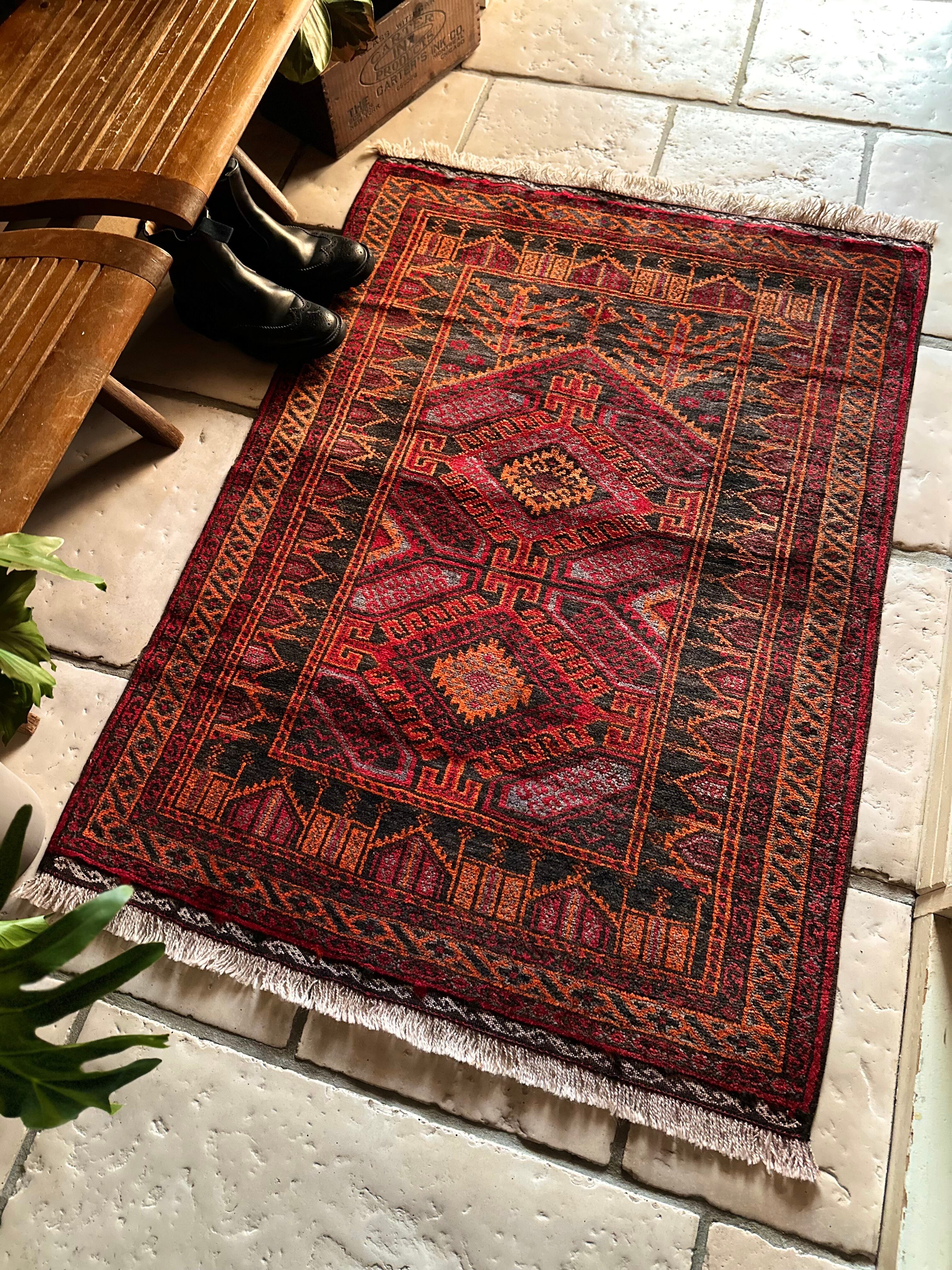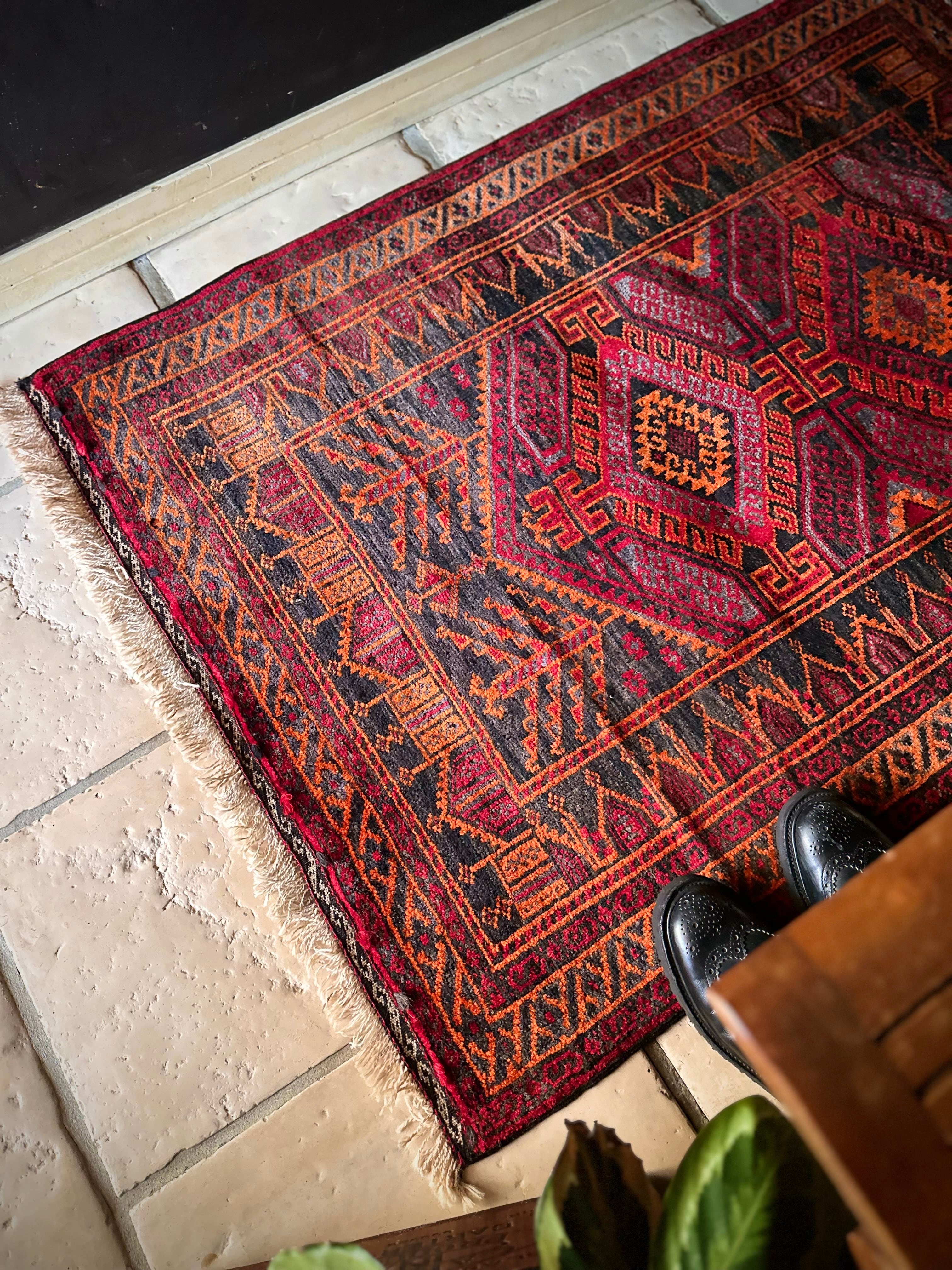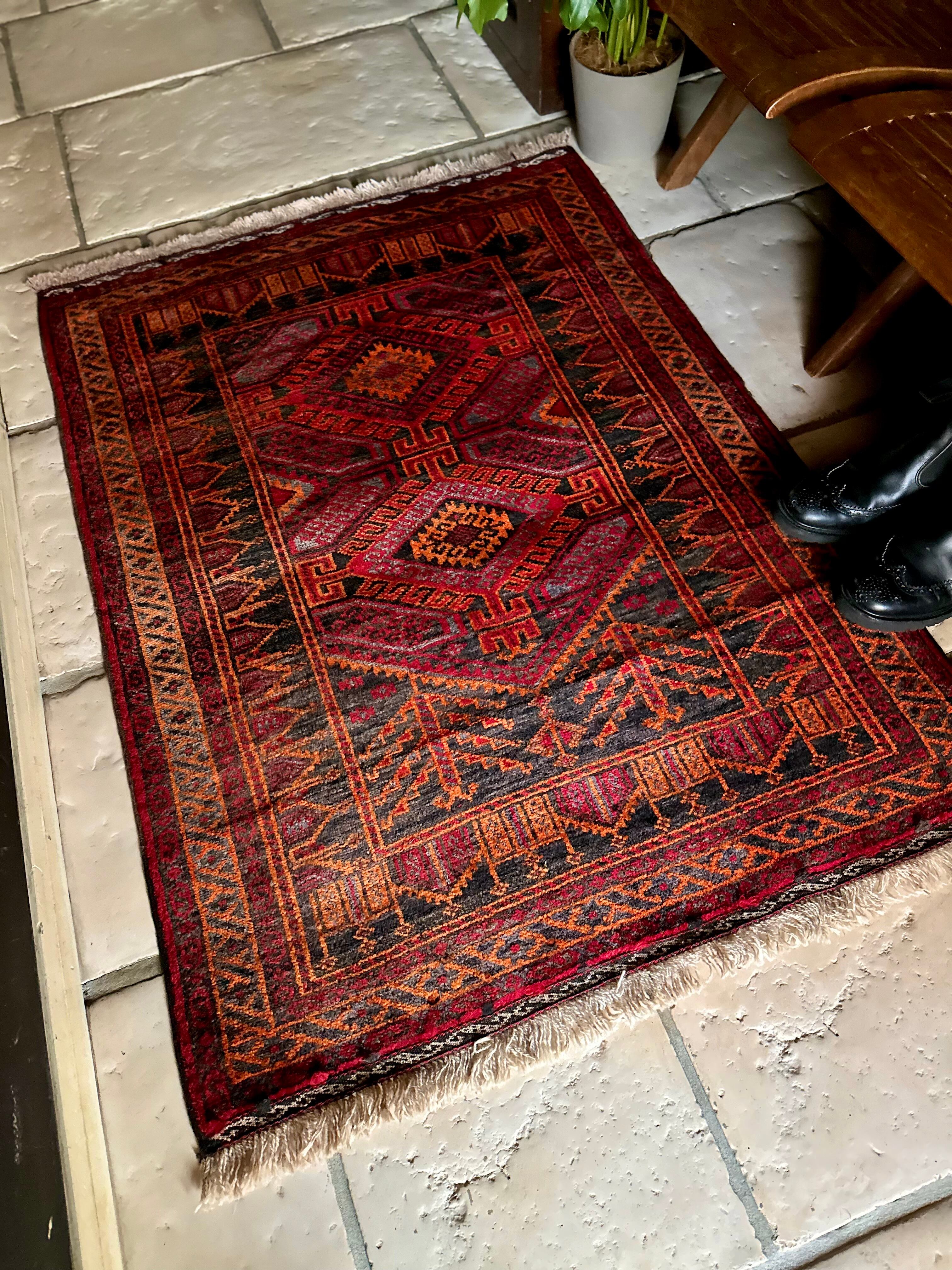 ブラックを背景に赤とオレンジで燃えるような色彩を現した祈祷用のプレイヤーラグで、何度か似たような配色に柄のモノを販売していますが、全てはアフガニスタンのヘラート産バルーチからのトライバルラグで、個人的にも好きな類いでついついピックアップしてしまいます。