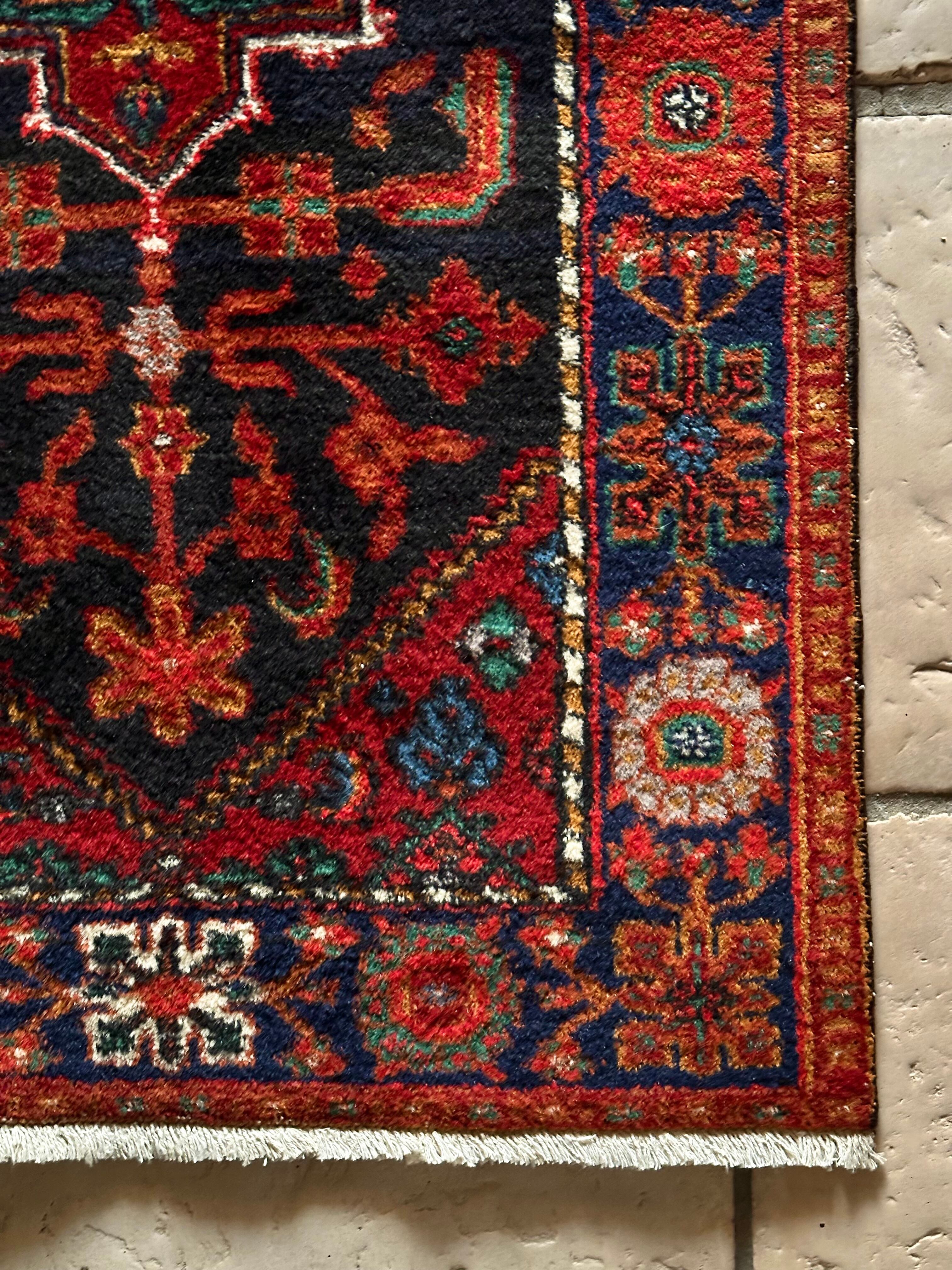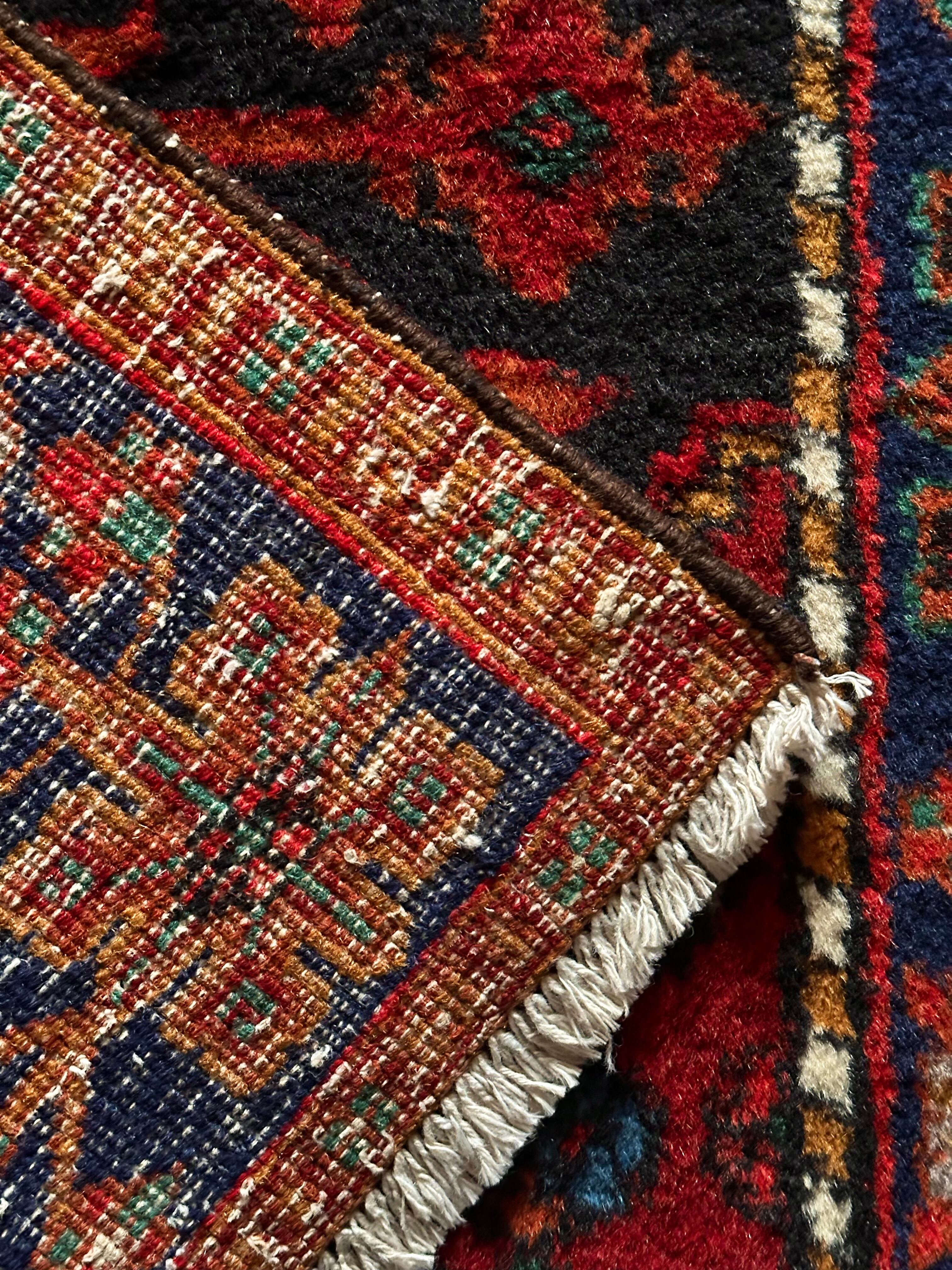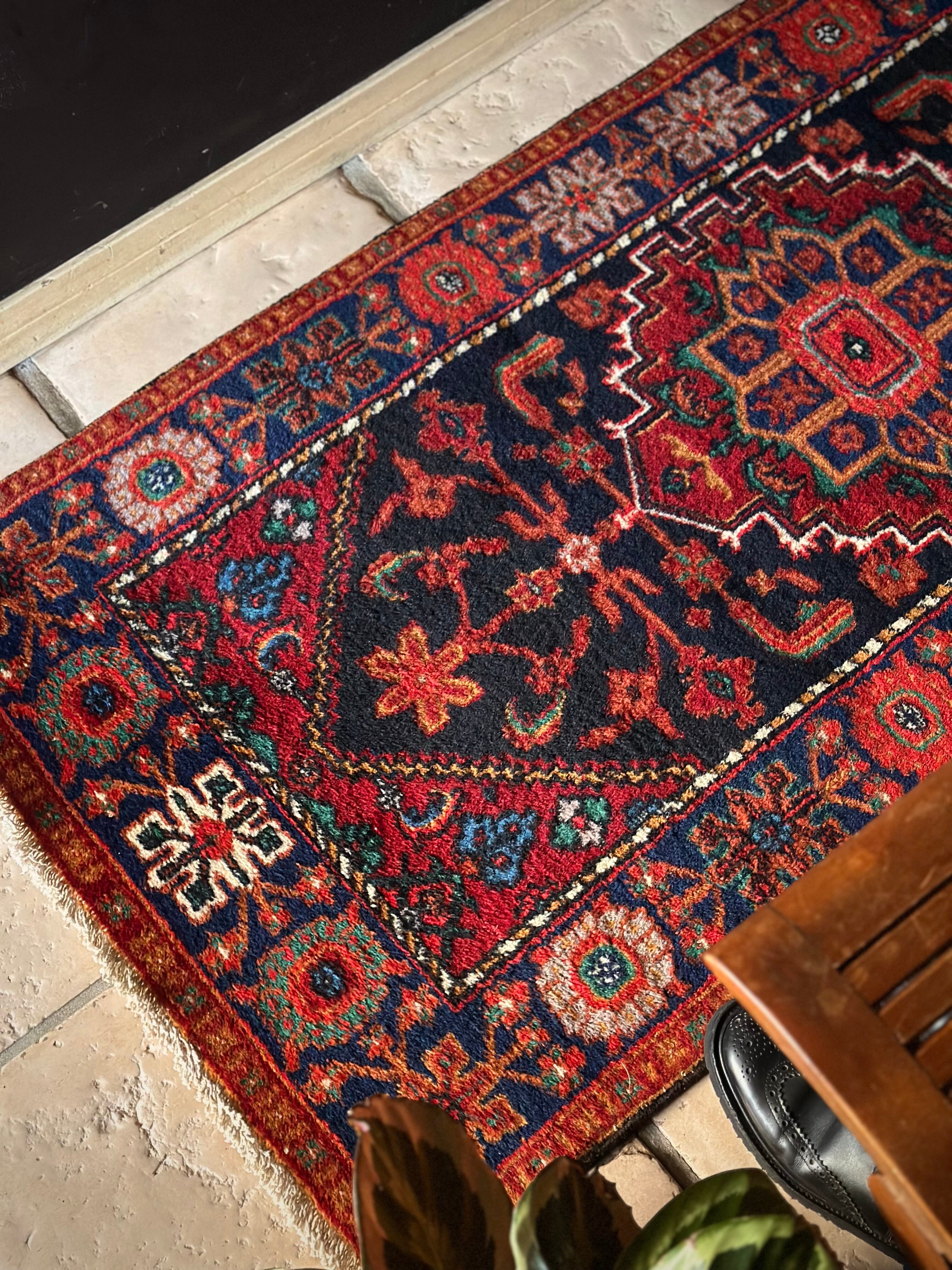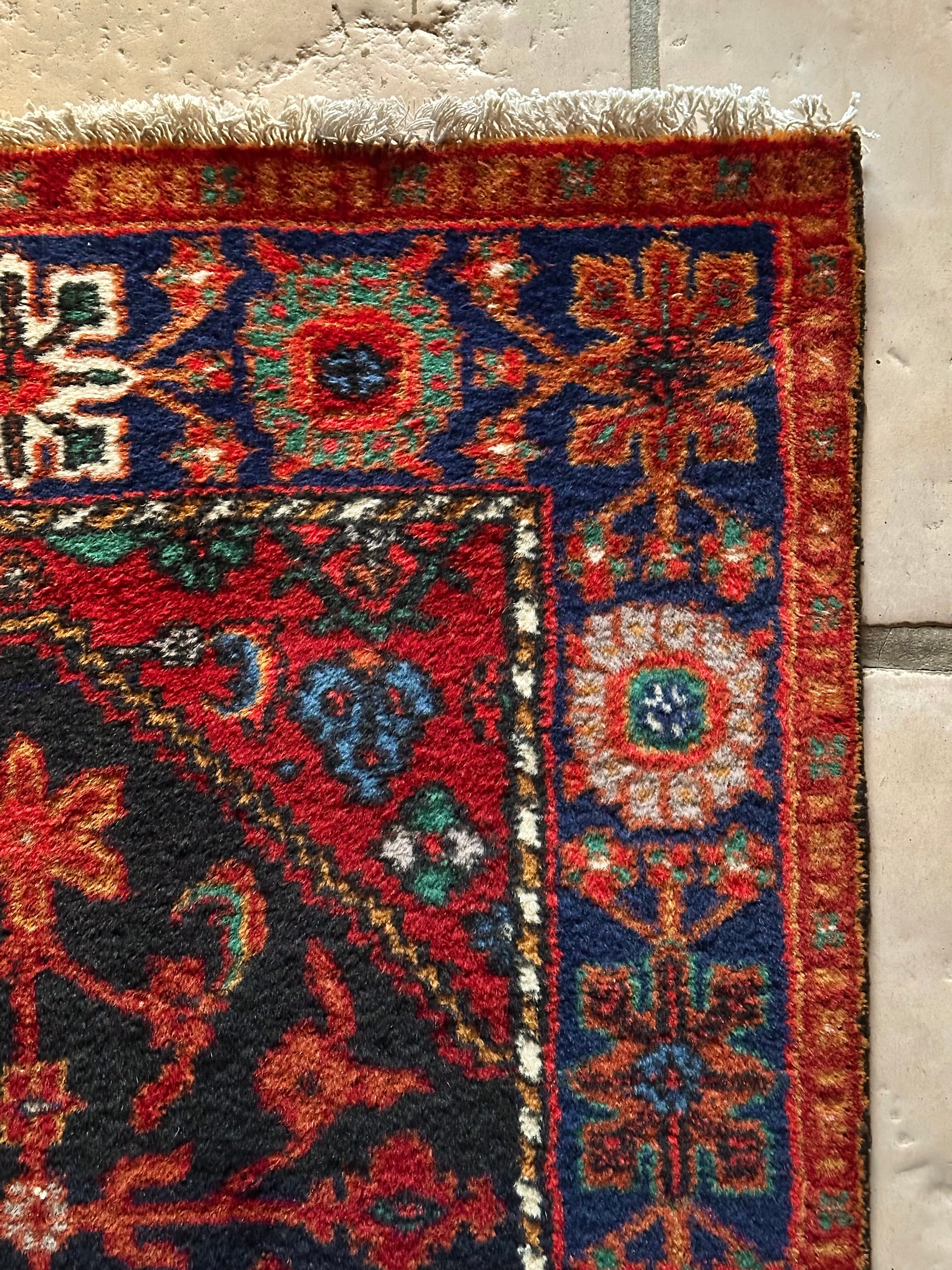 ブラックベースのフィールドとネイビーのボーダーに鮮やかなレッドやオレンジが映える、イラン西部のハマダン近郊で手織りされたヴィレッジラグで、ペルシャ文化特有の花や植物が描かれたハマダン産ならではのしっかりとした織りのアクセントラグになります。