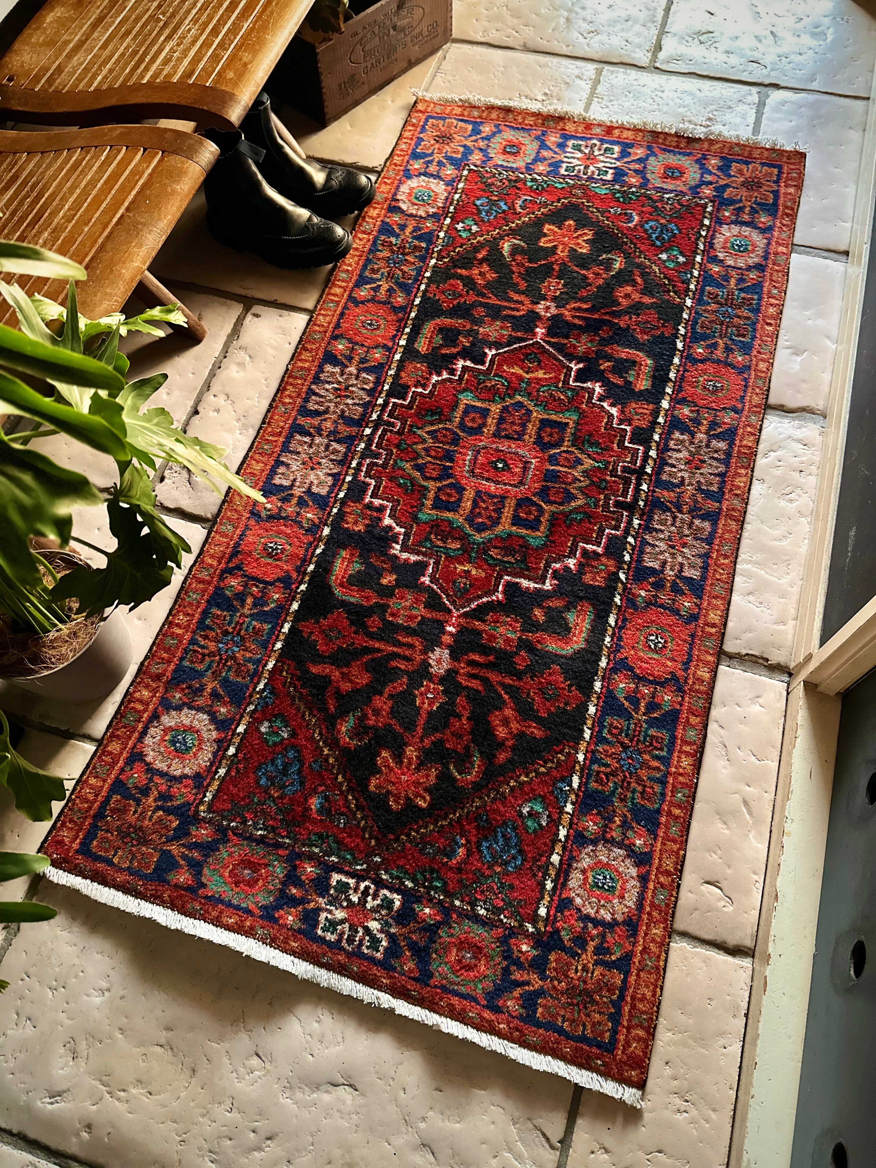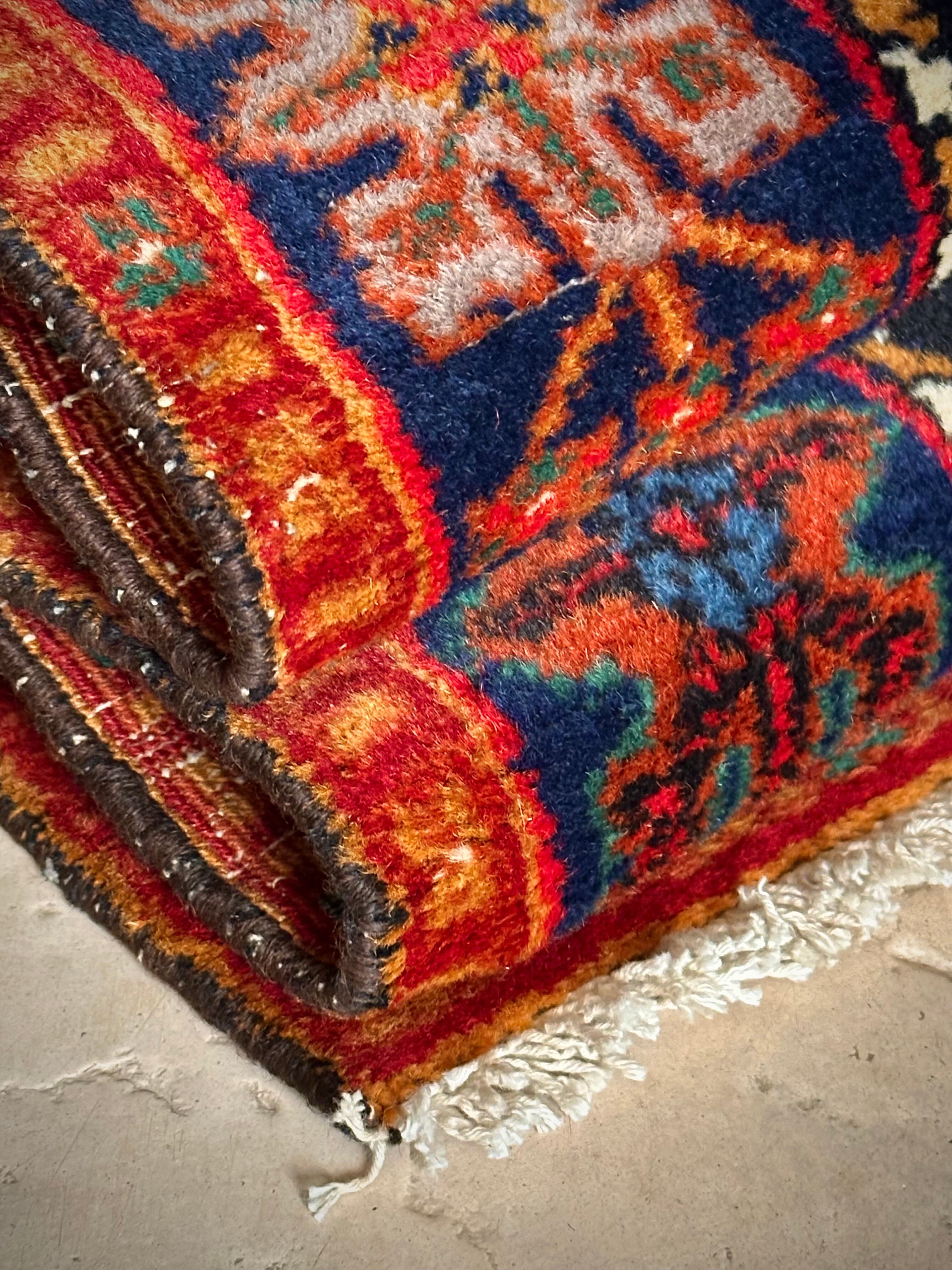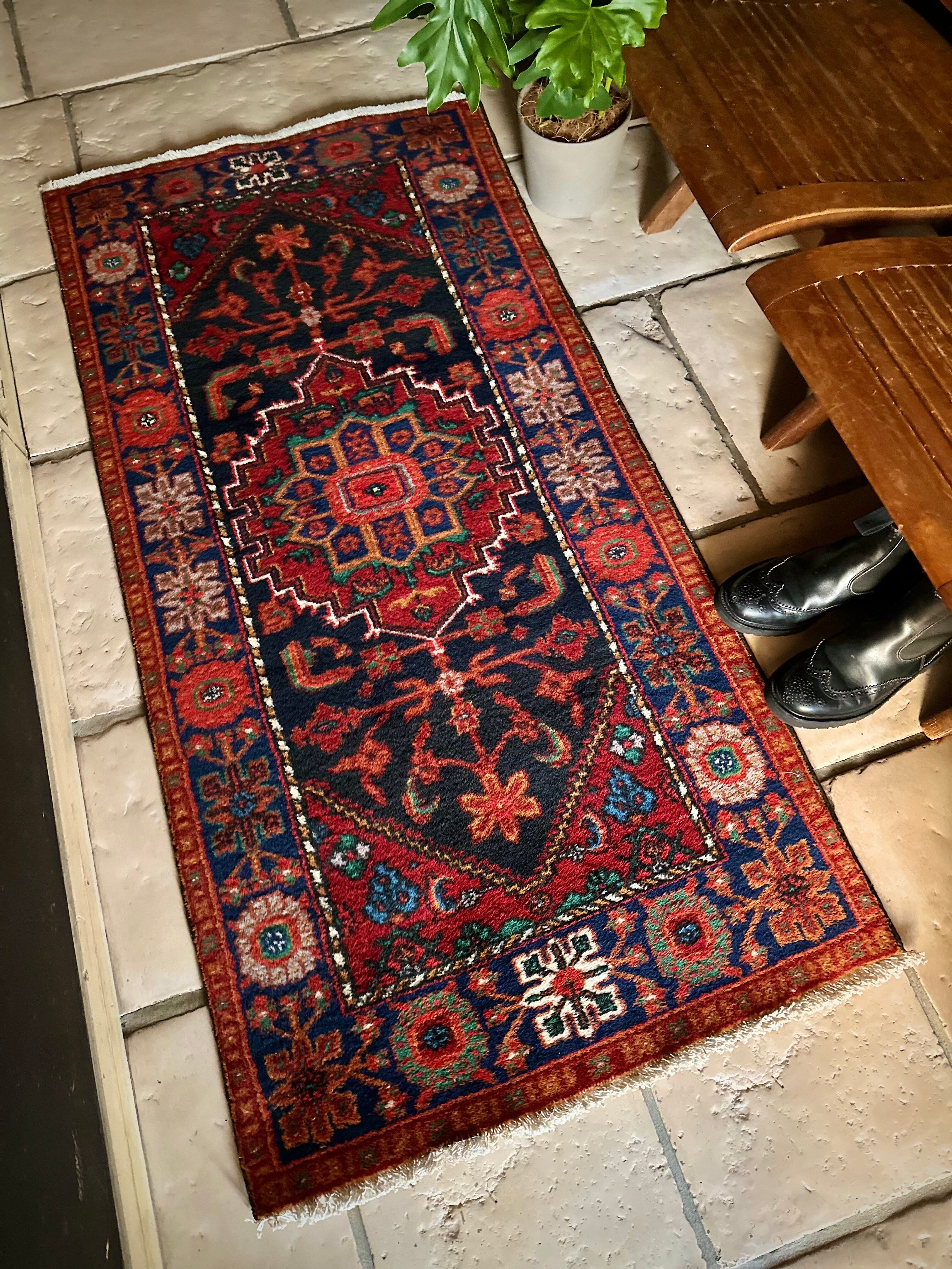ブラックベースのフィールドとネイビーのボーダーに鮮やかなレッドやオレンジが映える、イラン西部のハマダン近郊で手織りされたヴィレッジラグで、ペルシャ文化特有の花や植物が描かれたハマダン産ならではのしっかりとした織りのアクセントラグになります。