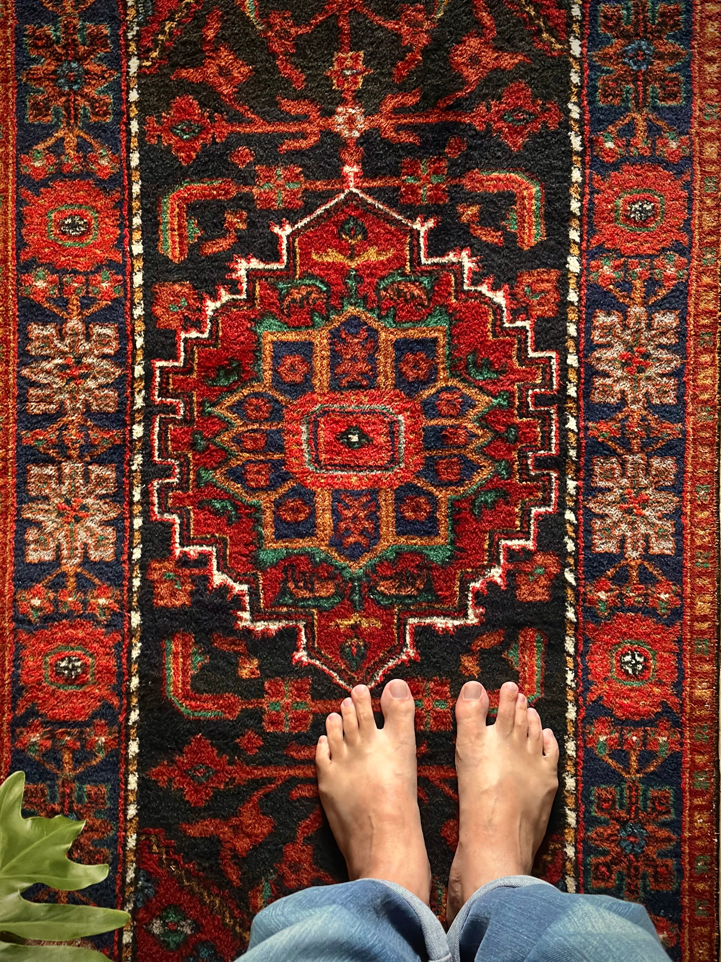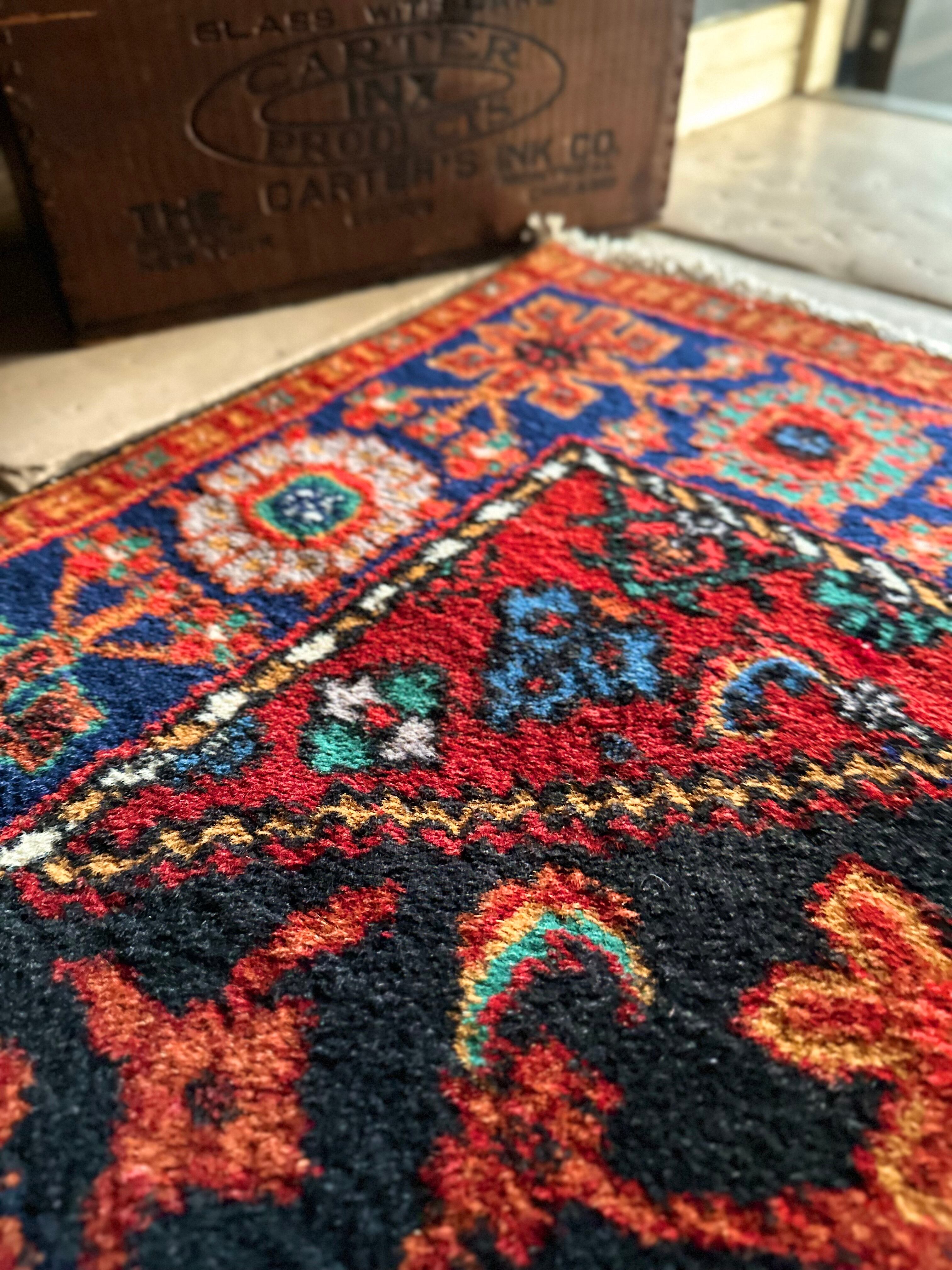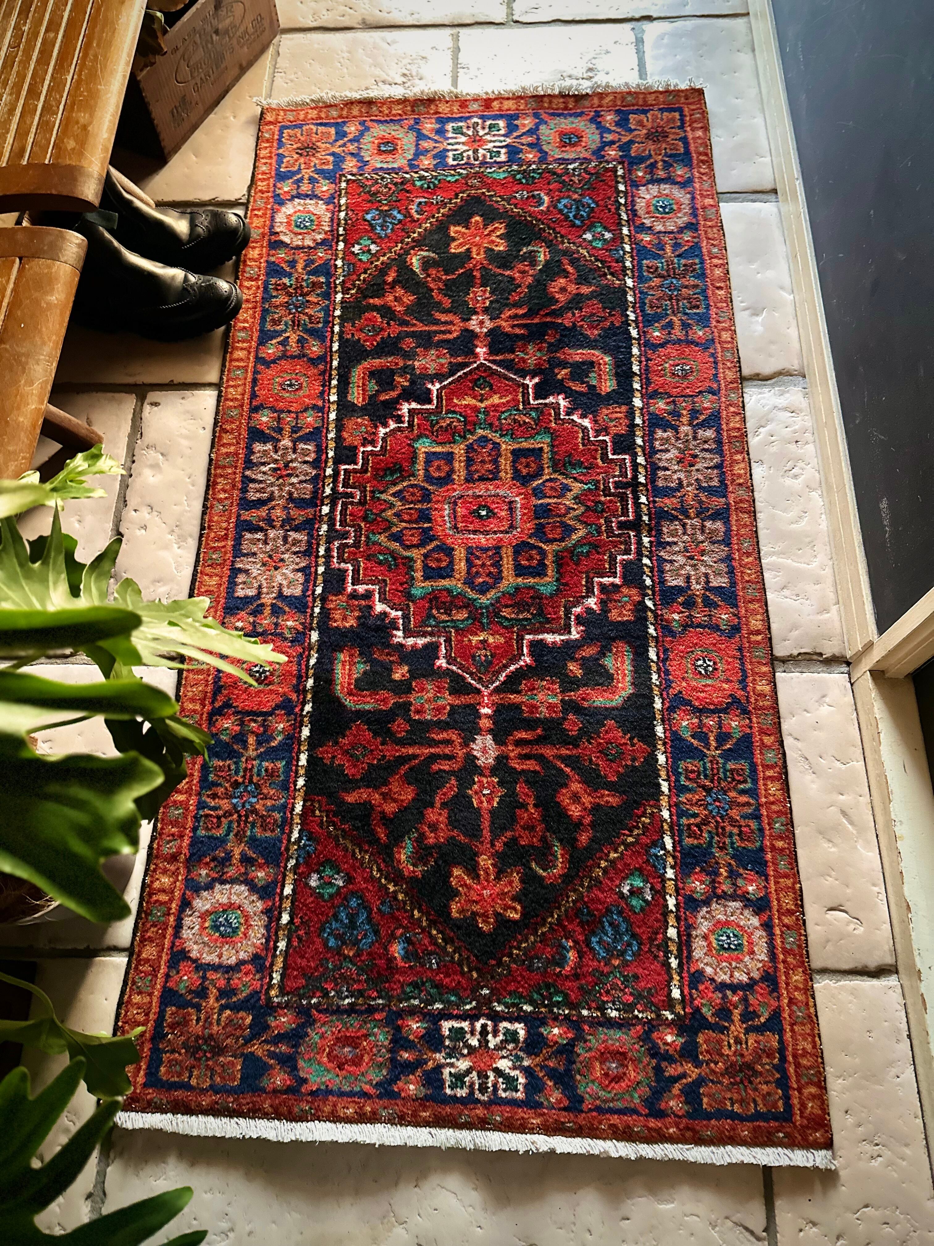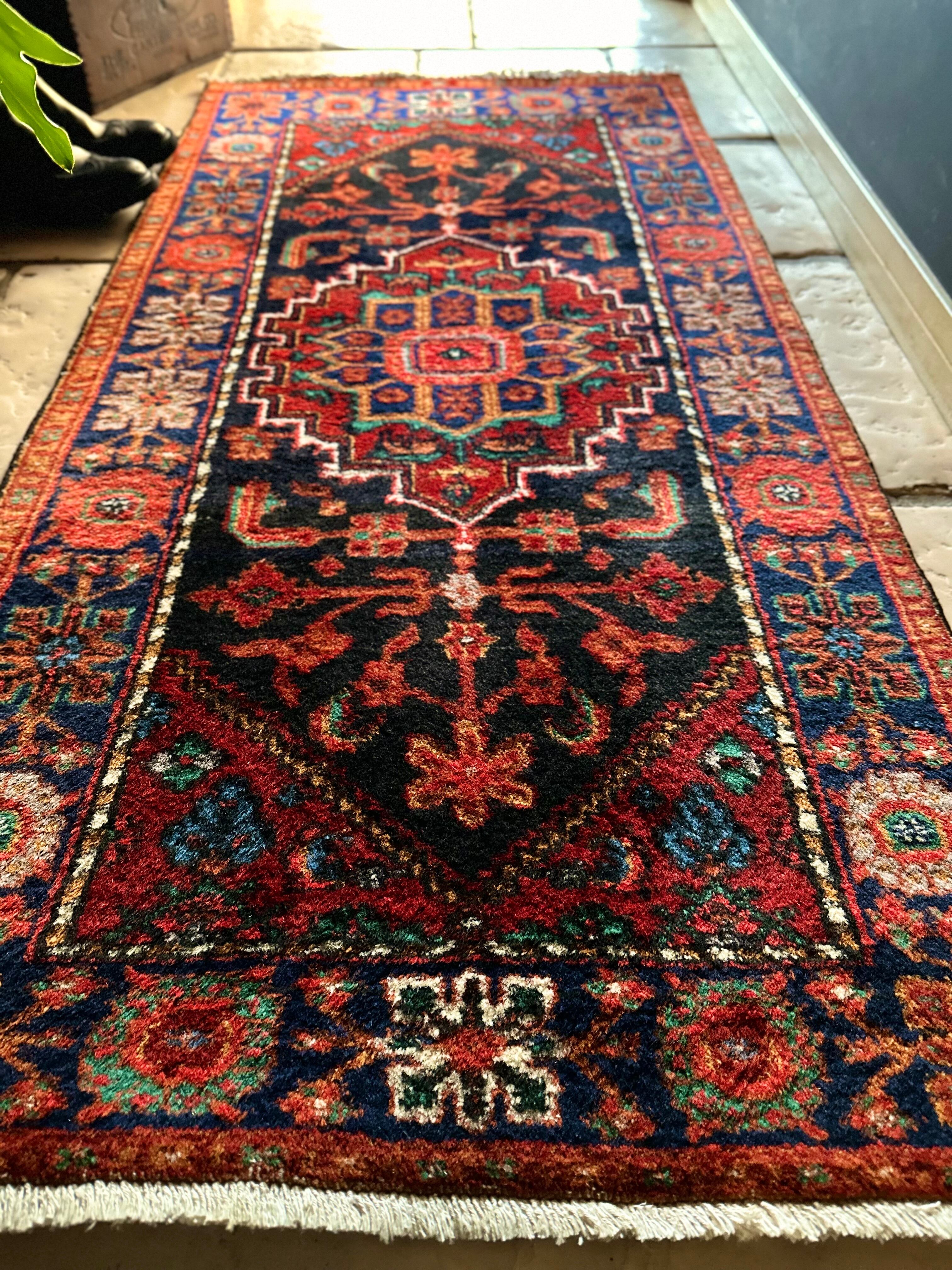 ブラックベースのフィールドとネイビーのボーダーに鮮やかなレッドやオレンジが映える、イラン西部のハマダン近郊で手織りされたヴィレッジラグで、ペルシャ文化特有の花や植物が描かれたハマダン産ならではのしっかりとした織りのアクセントラグになります。