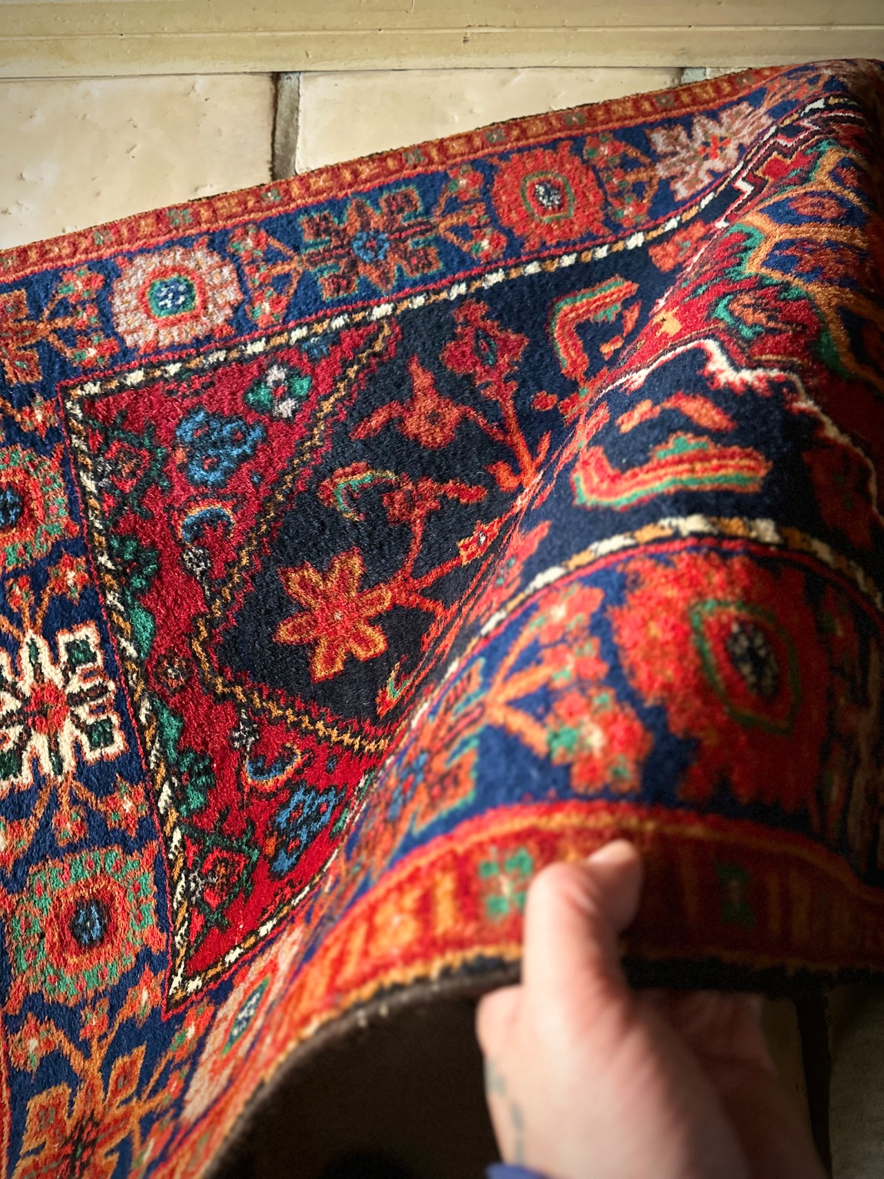 経年としては45年のヴィンテージラグとなり、それほどの使用感はなく目立つダメージにリペア箇所は見当たりませんが、裏返すとシャーリング後によるパイル屑が若干出ますので、掃除機がけをしている内に落ち着くかと思います。