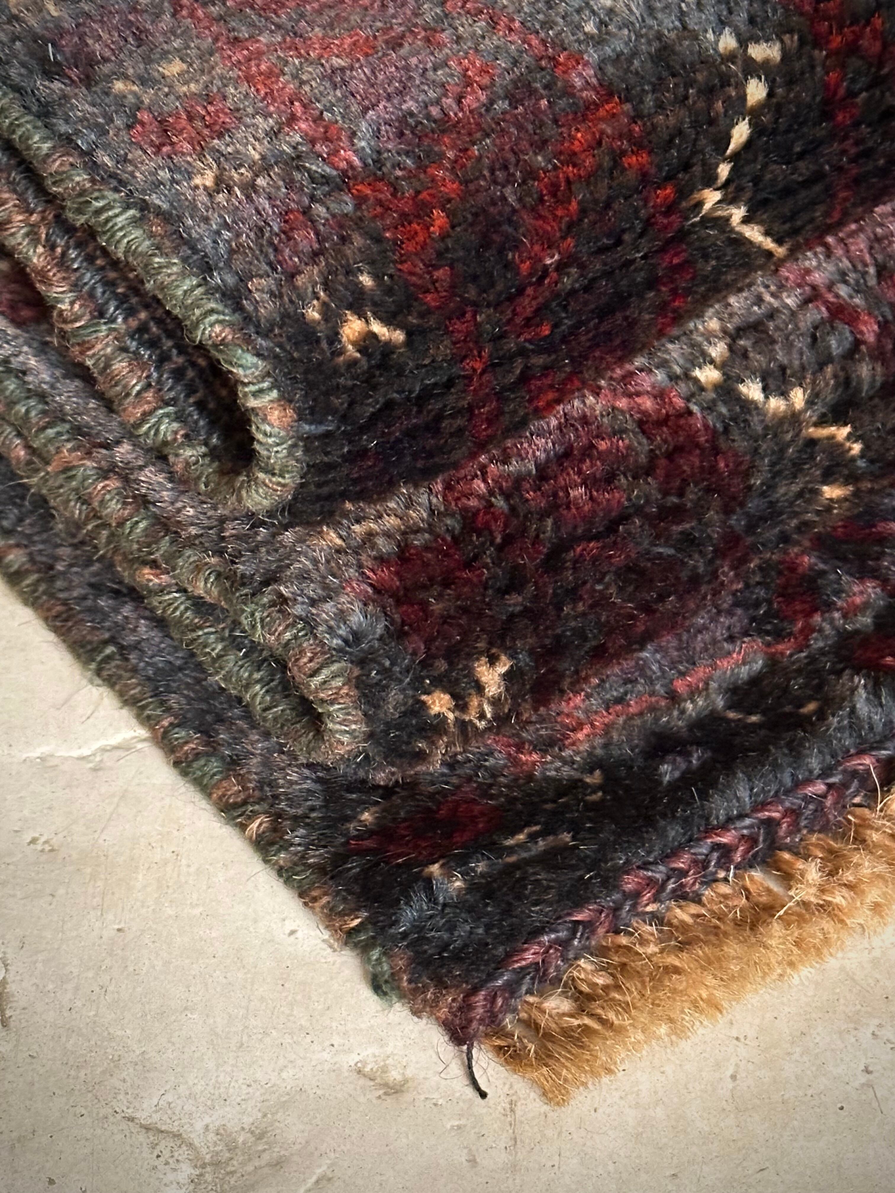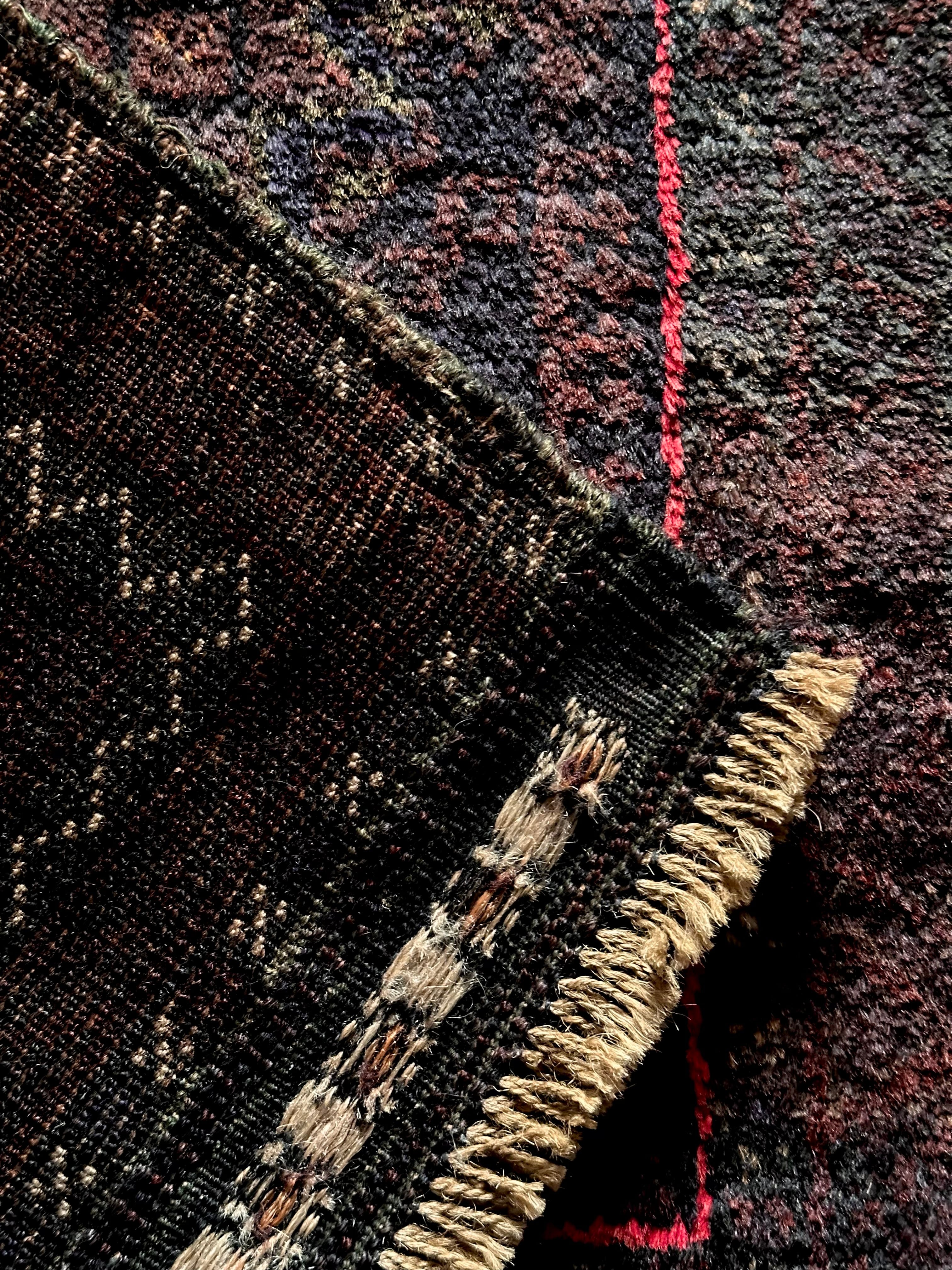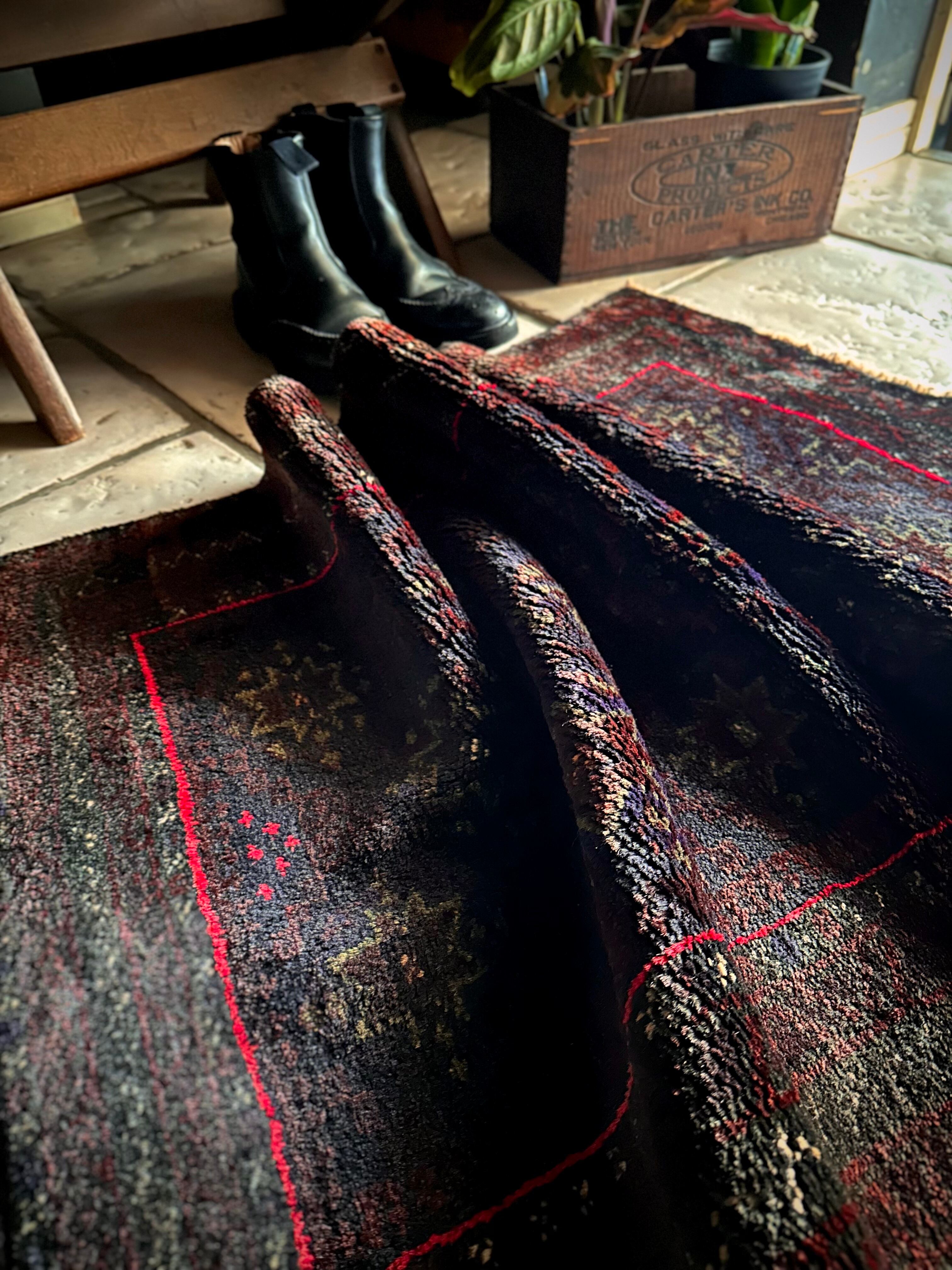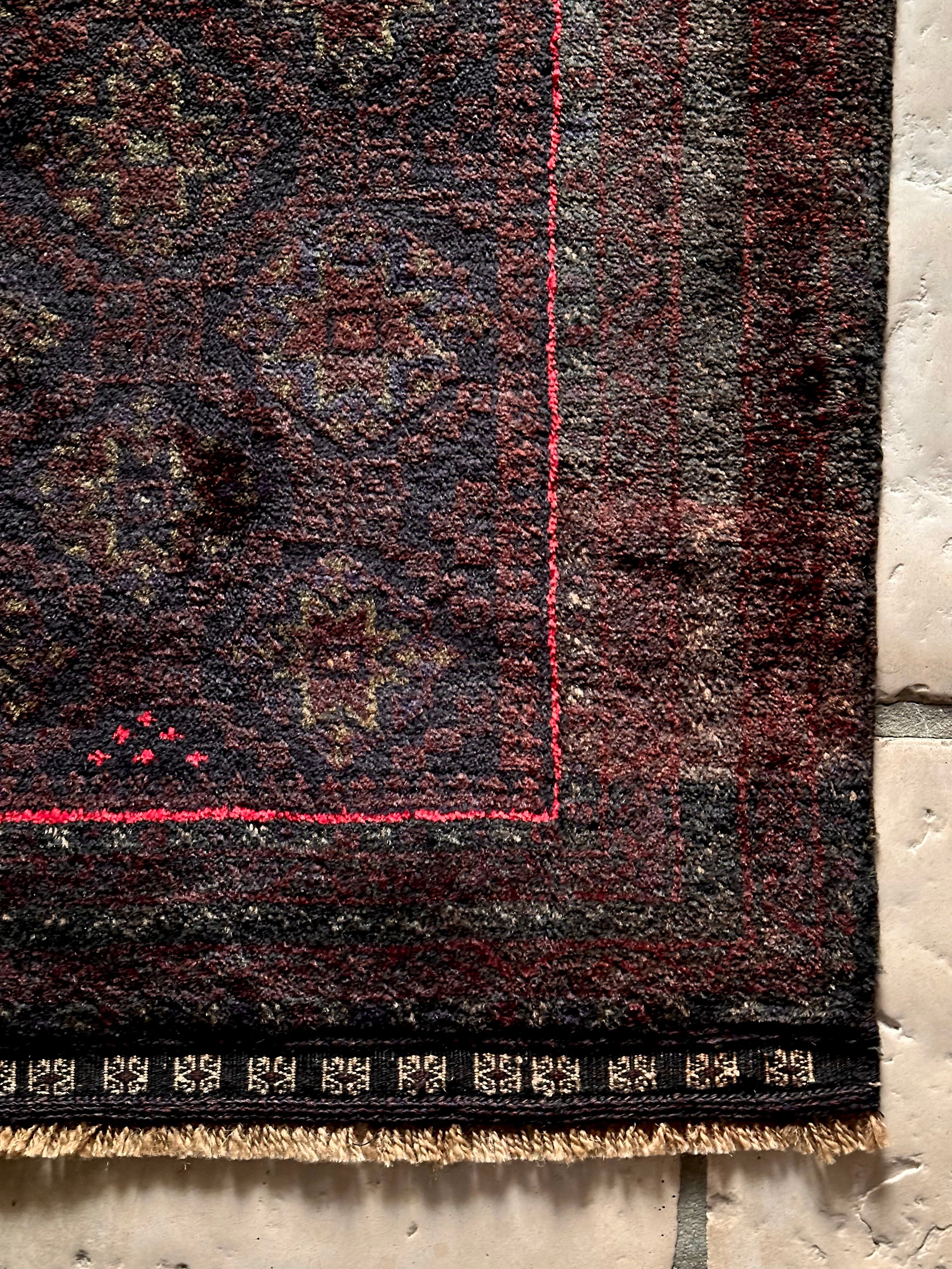 一見して真っ黒に見えてしまうこちらは陽の光によって模様が浮き出て見える、アフガニスタンはヘラート州に居住するタイマニ族のトライバルラグで、ブラックベースにバーガンディ、そして幸運を司るオリーブグリーンの八芒星に赤のアクセントがかっこいい見た目にもプリミティブな1枚になります。