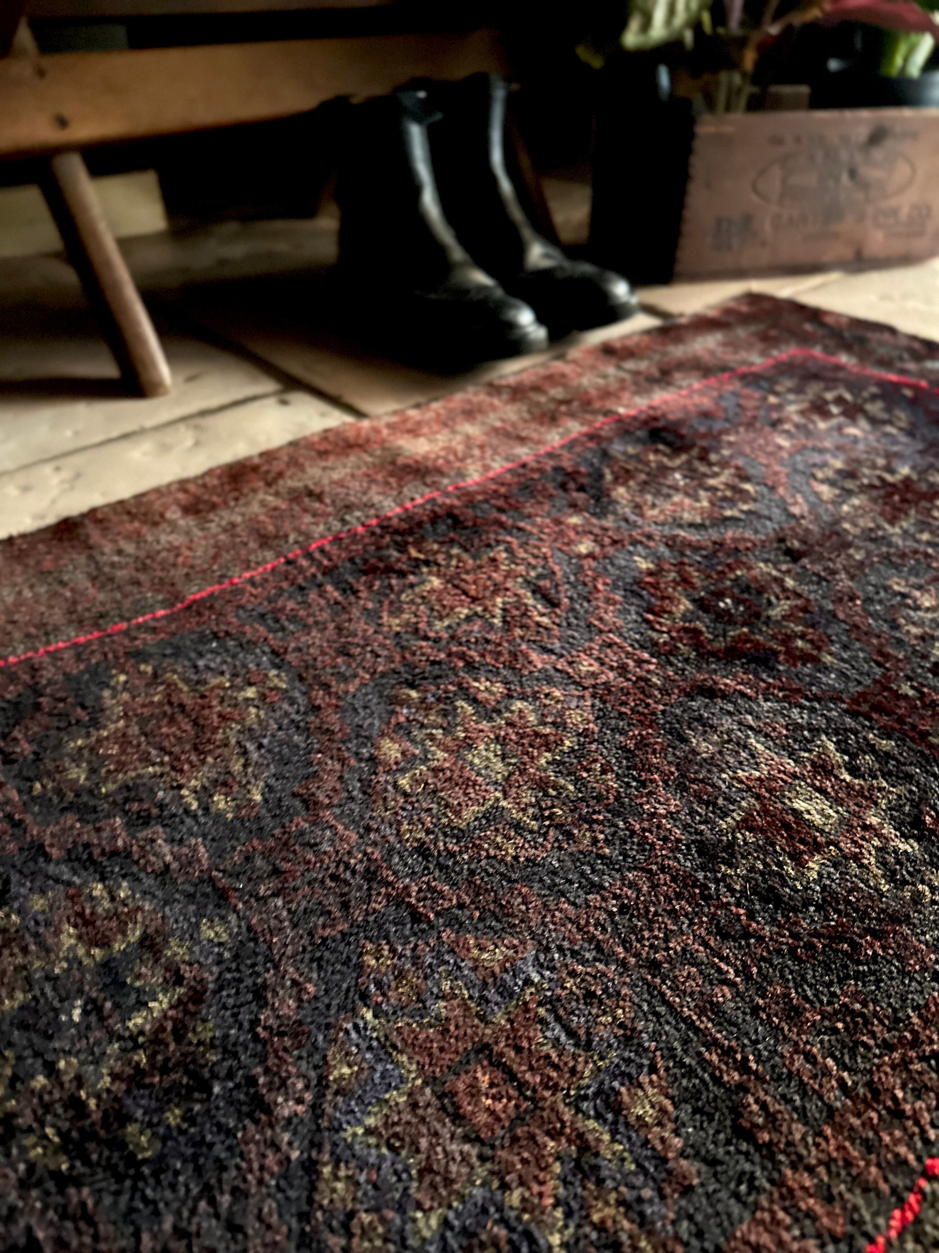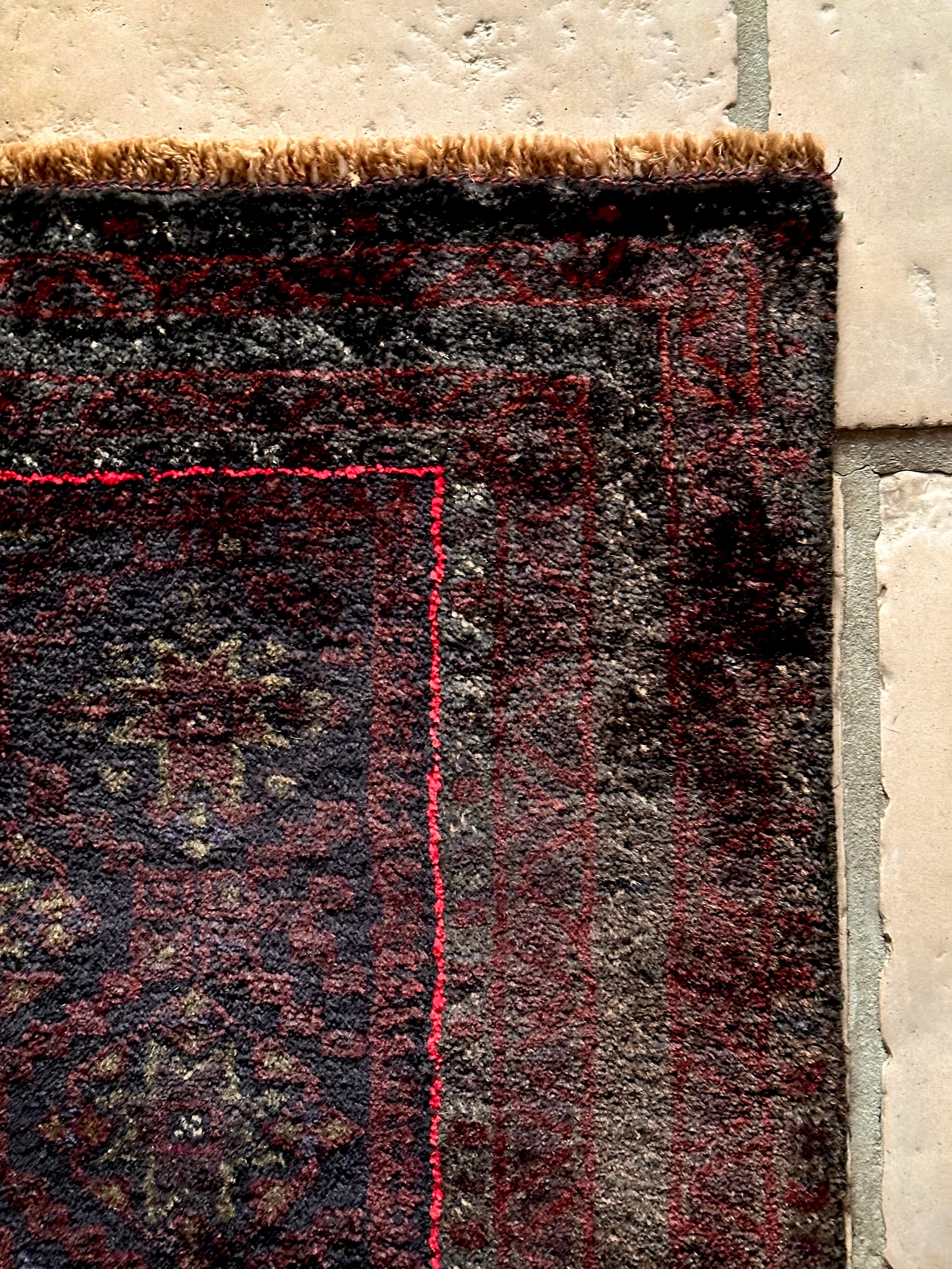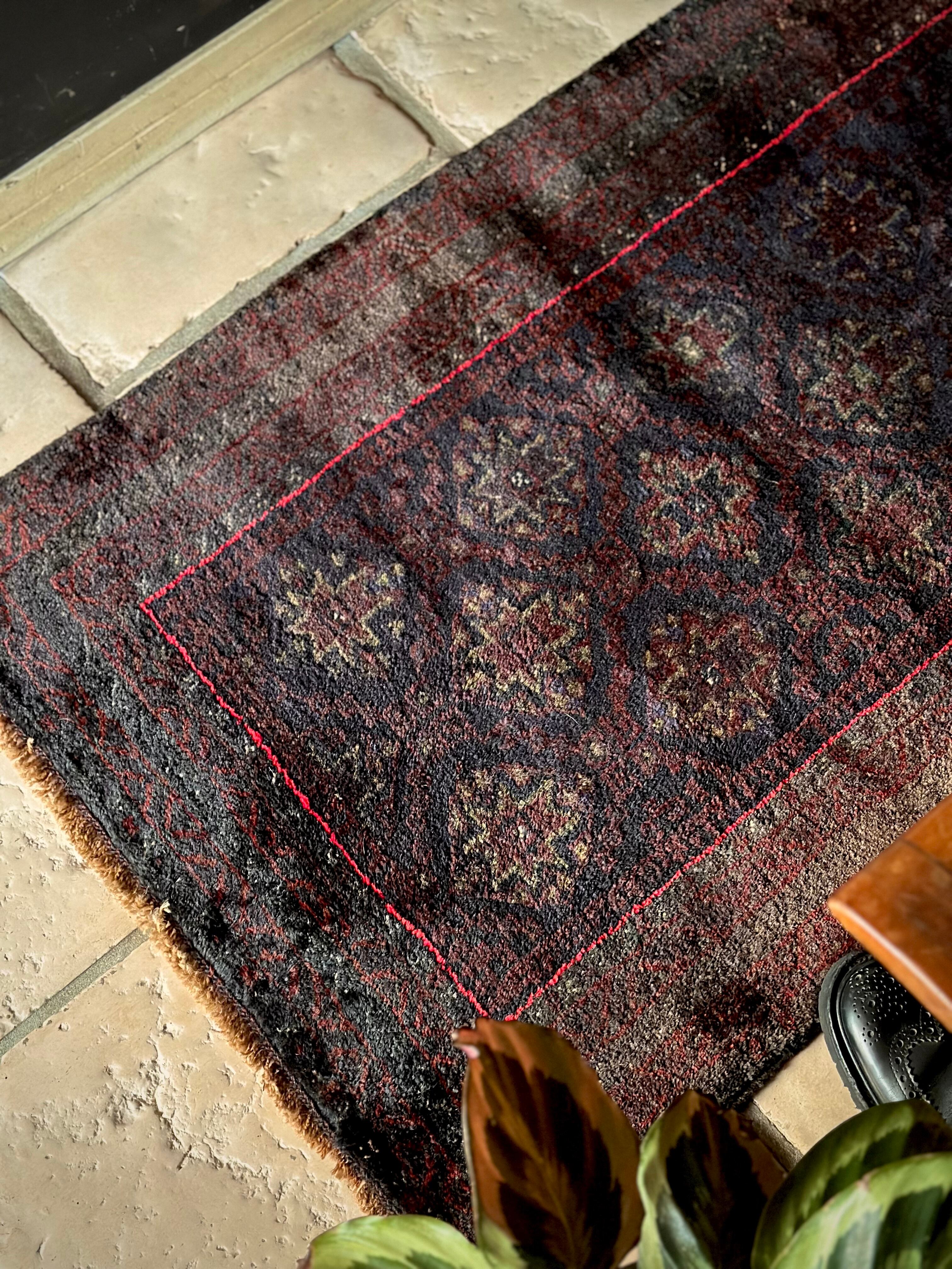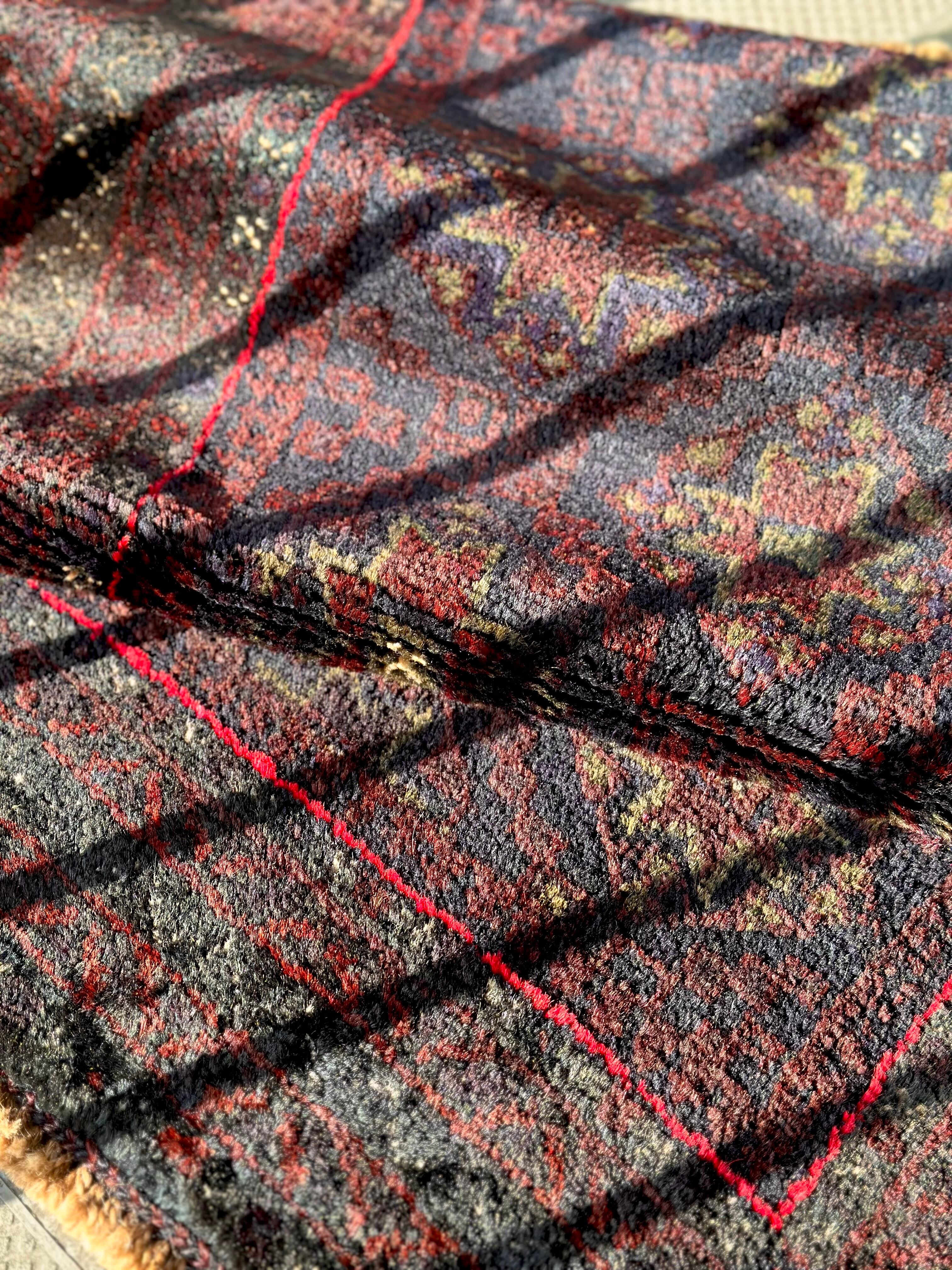 一見して真っ黒に見えてしまうこちらは陽の光によって模様が浮き出て見える、アフガニスタンはヘラート州に居住するタイマニ族のトライバルラグで、ブラックベースにバーガンディ、そして幸運を司るオリーブグリーンの八芒星に赤のアクセントがかっこいい見た目にもプリミティブな1枚になります。