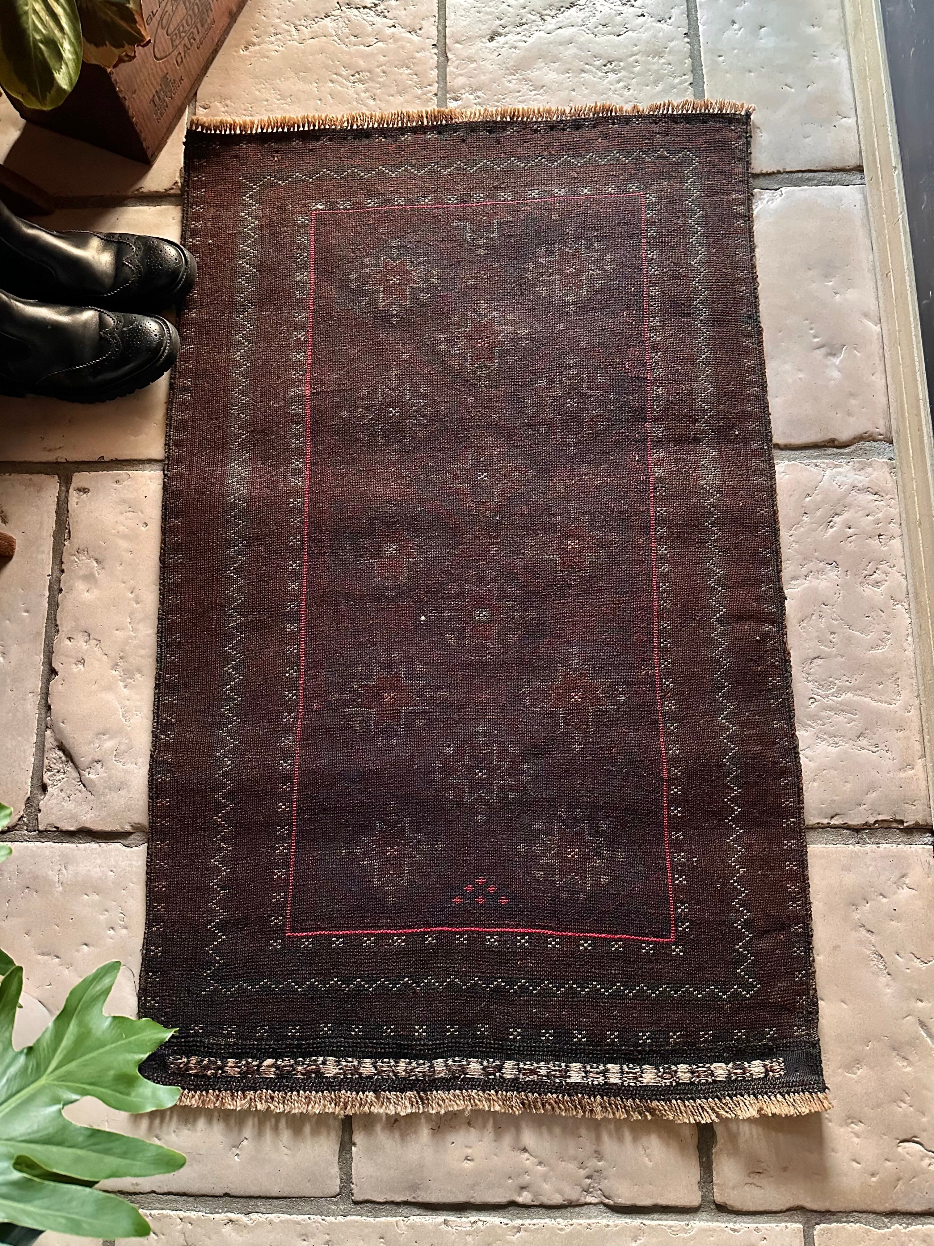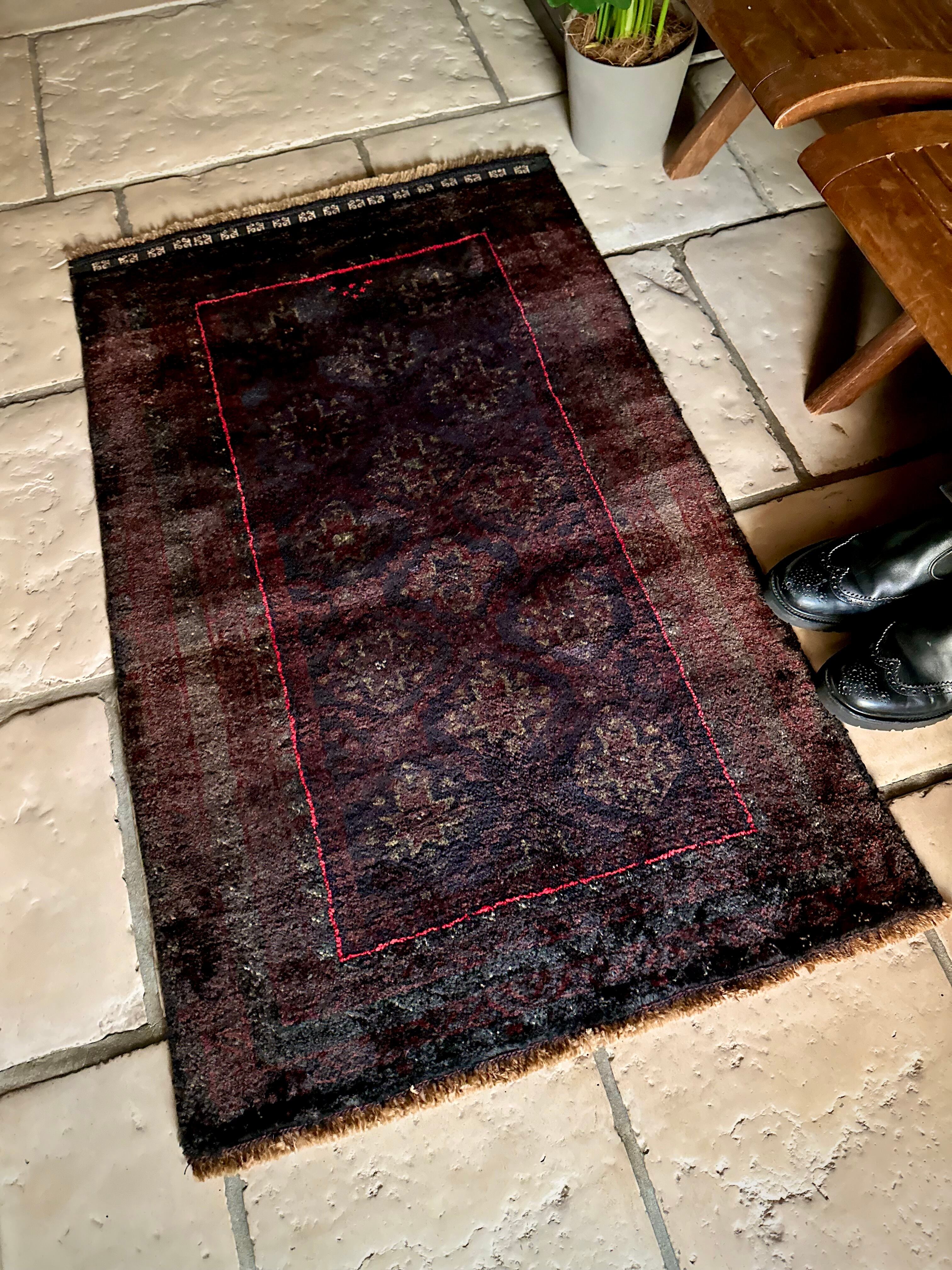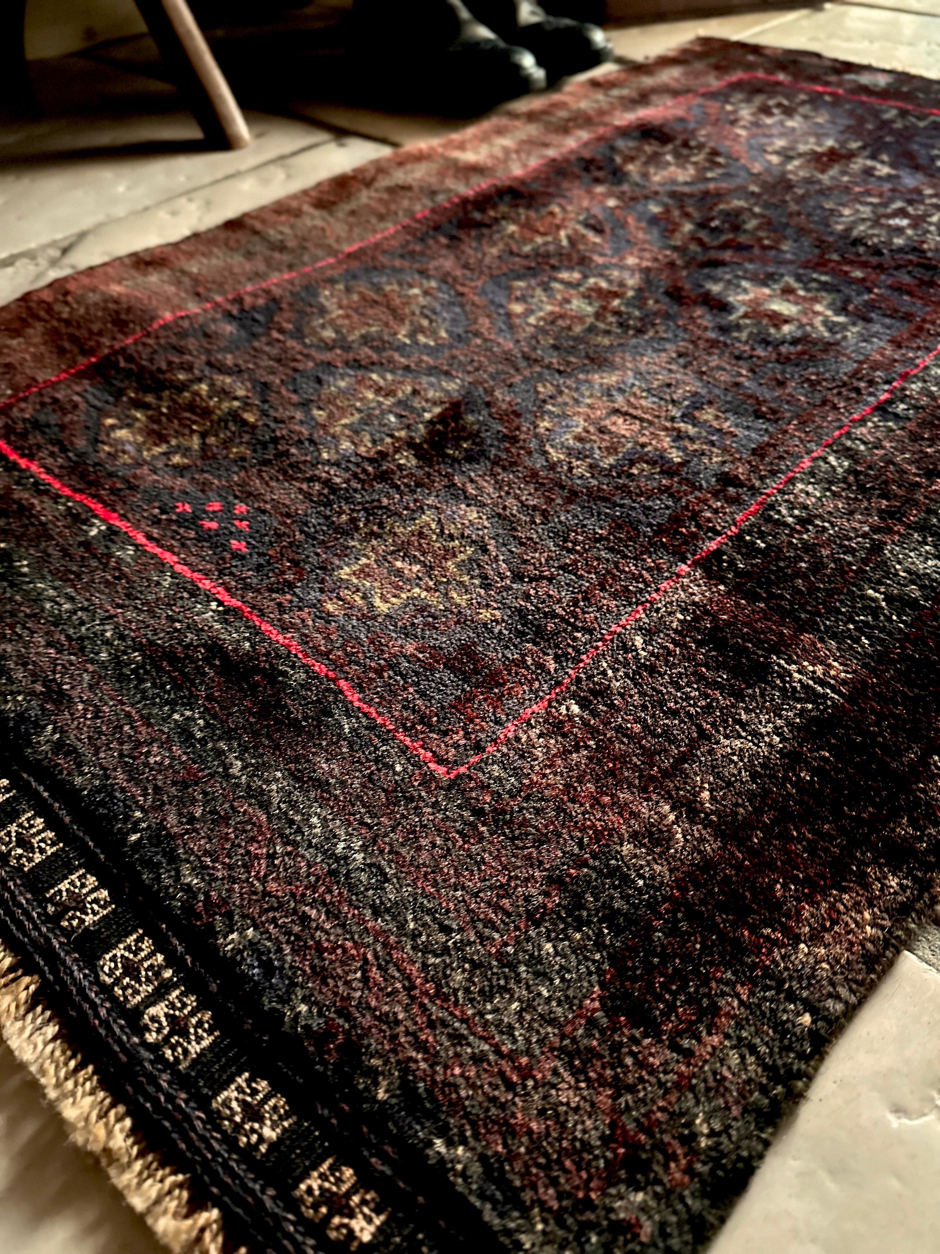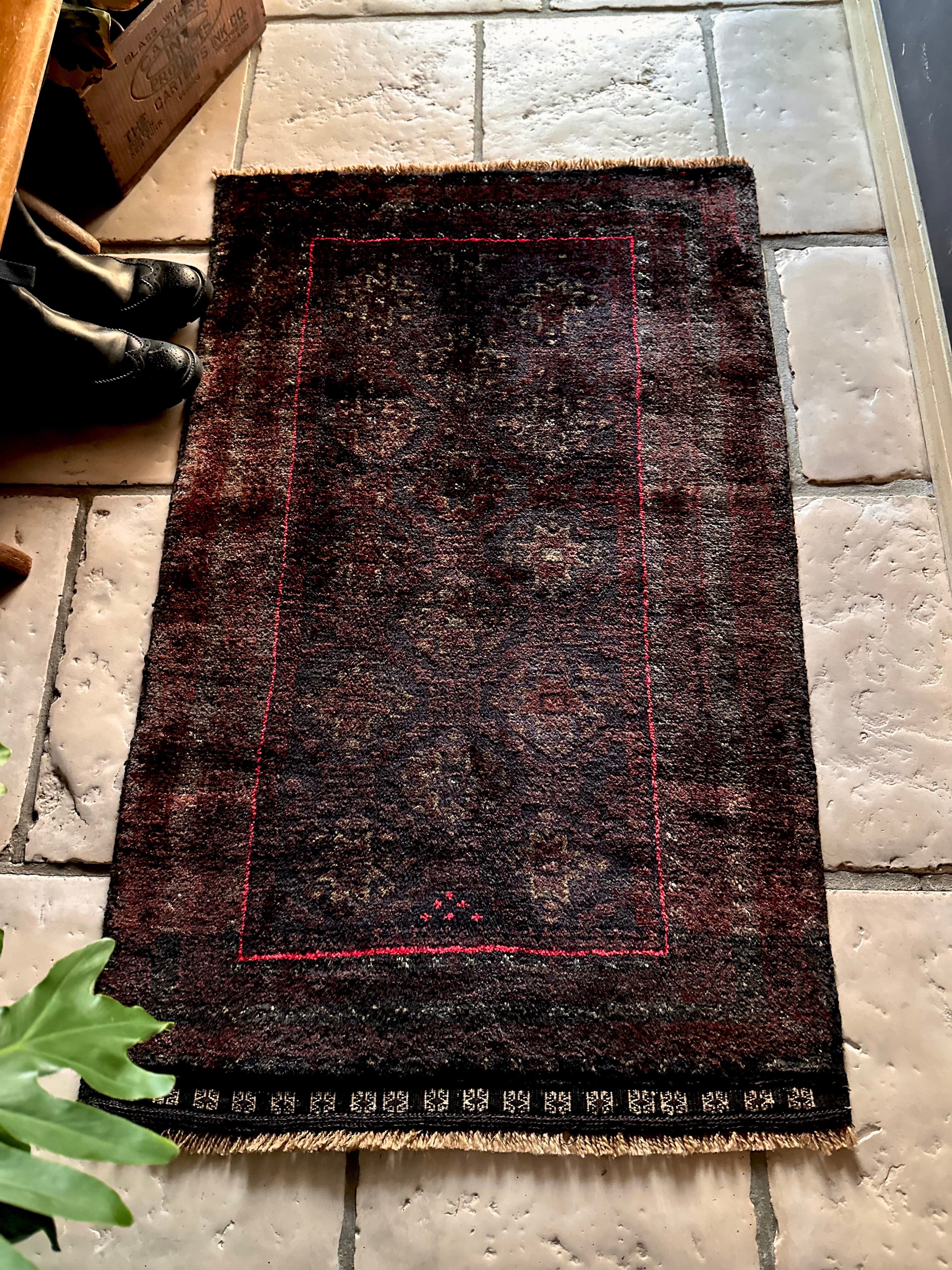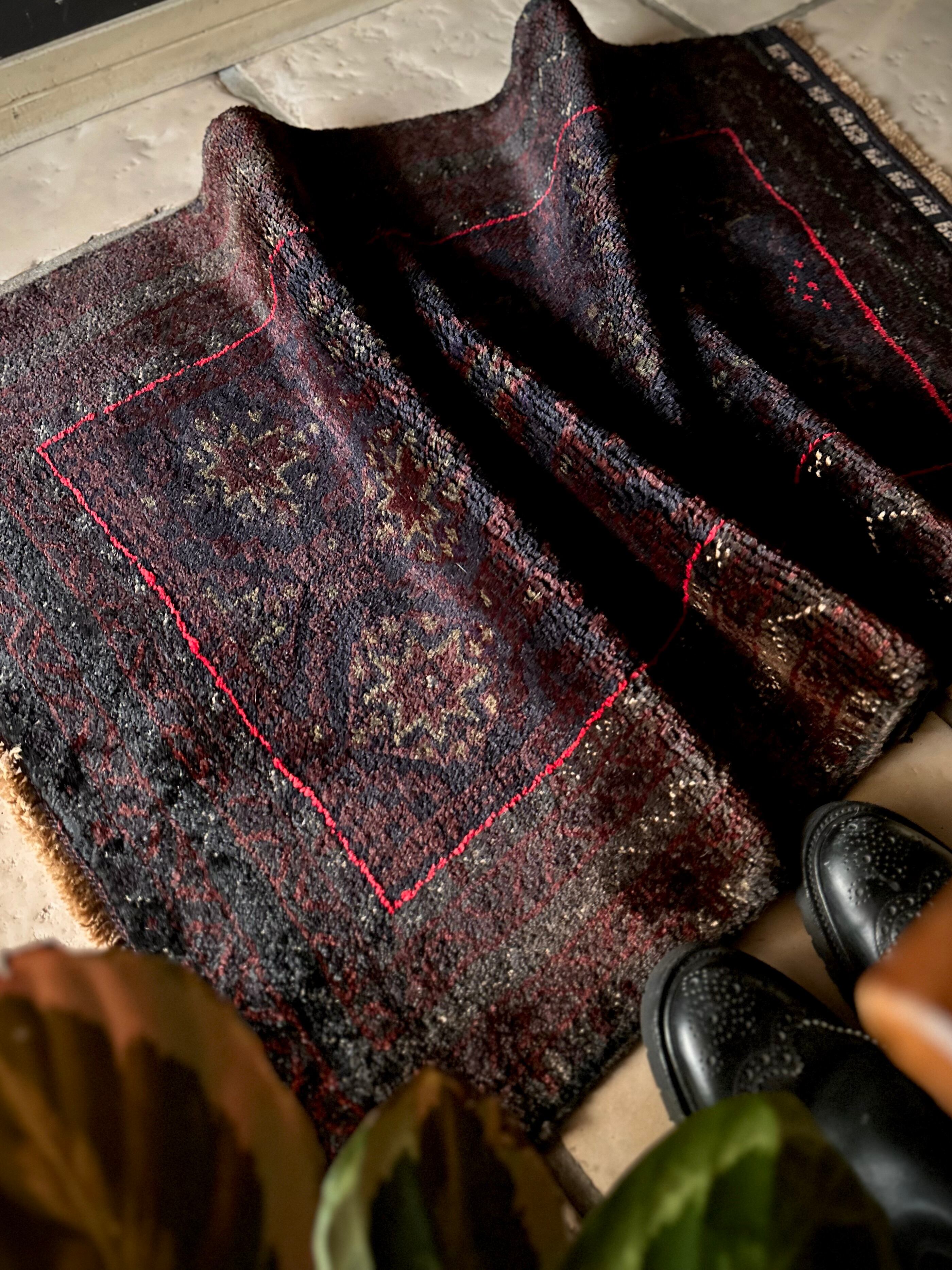 元々はクッションとして使用したり、家財道具などを収納するバーリシトと呼ばれる袋状の表皮のみをラグに仕立て直してもらったモノで、激渋なイカつさを放ちながらもパイルの毛足は長くフカフカとして素足が喜ぶのは必至で、8ミリという厚手にしっかりとした織りを感じられる玄関マットにはうってつけの1枚でしょうか。カッコよく装飾された片側のキリムエンドのアクセントも良いですね。