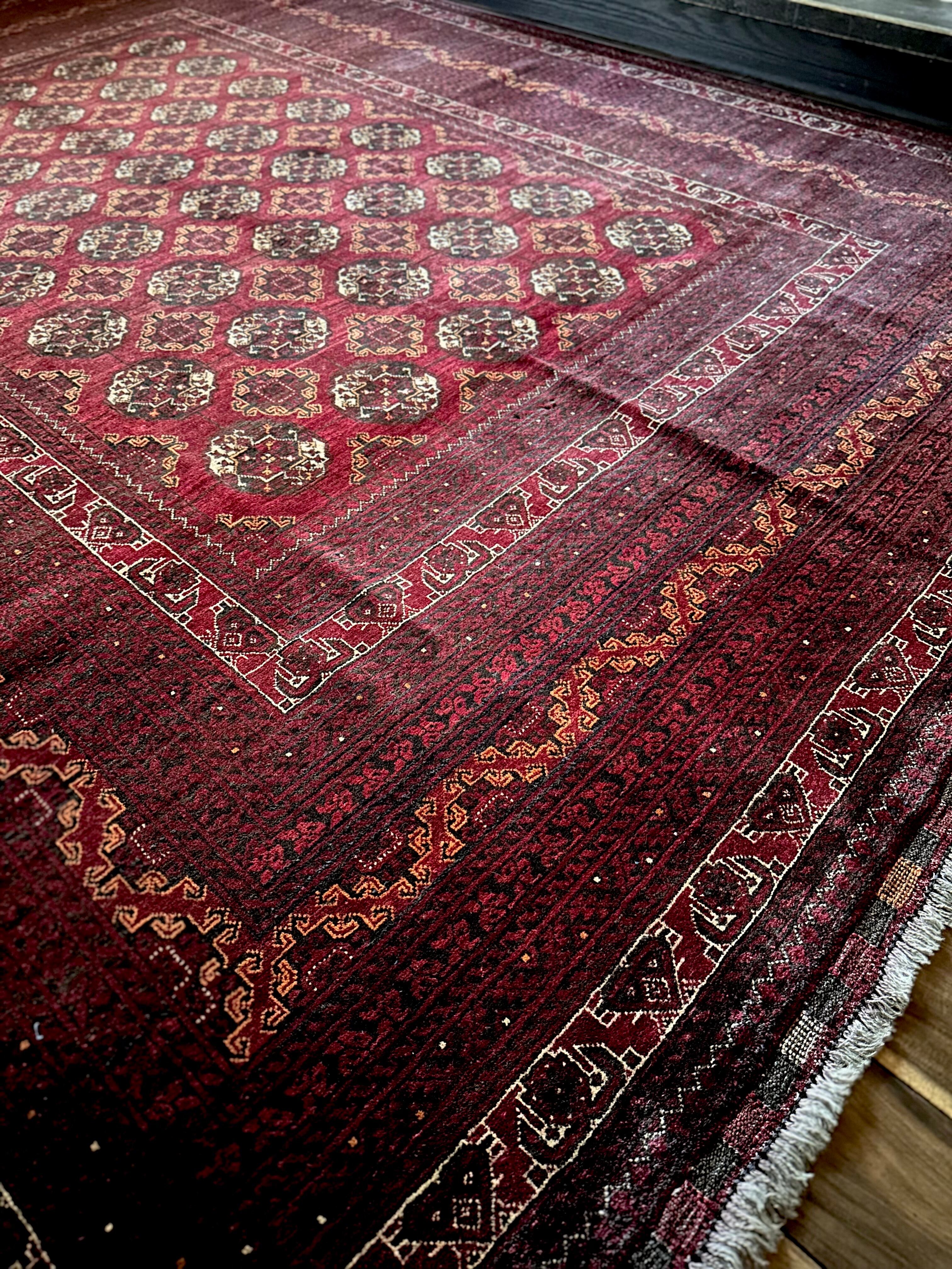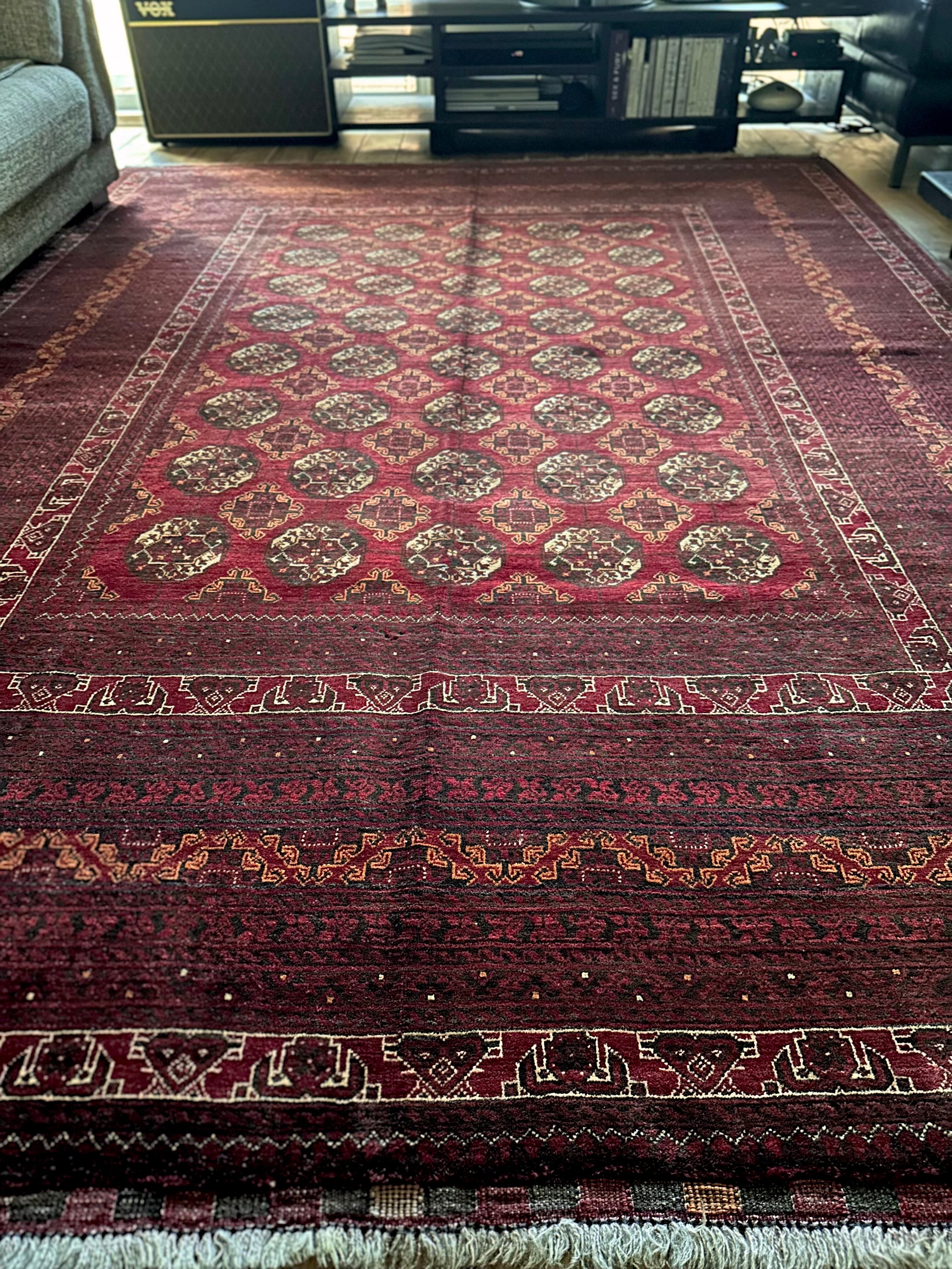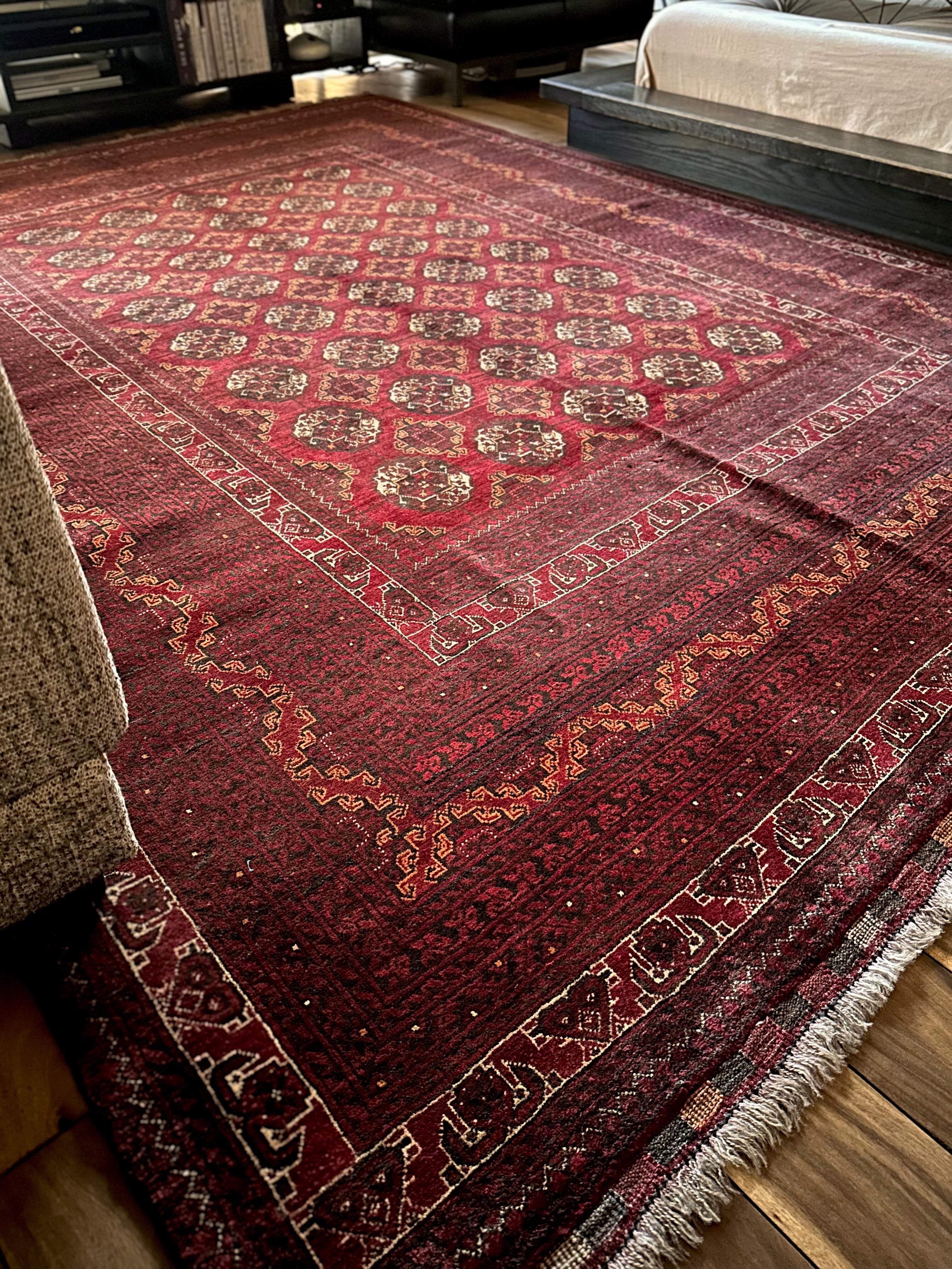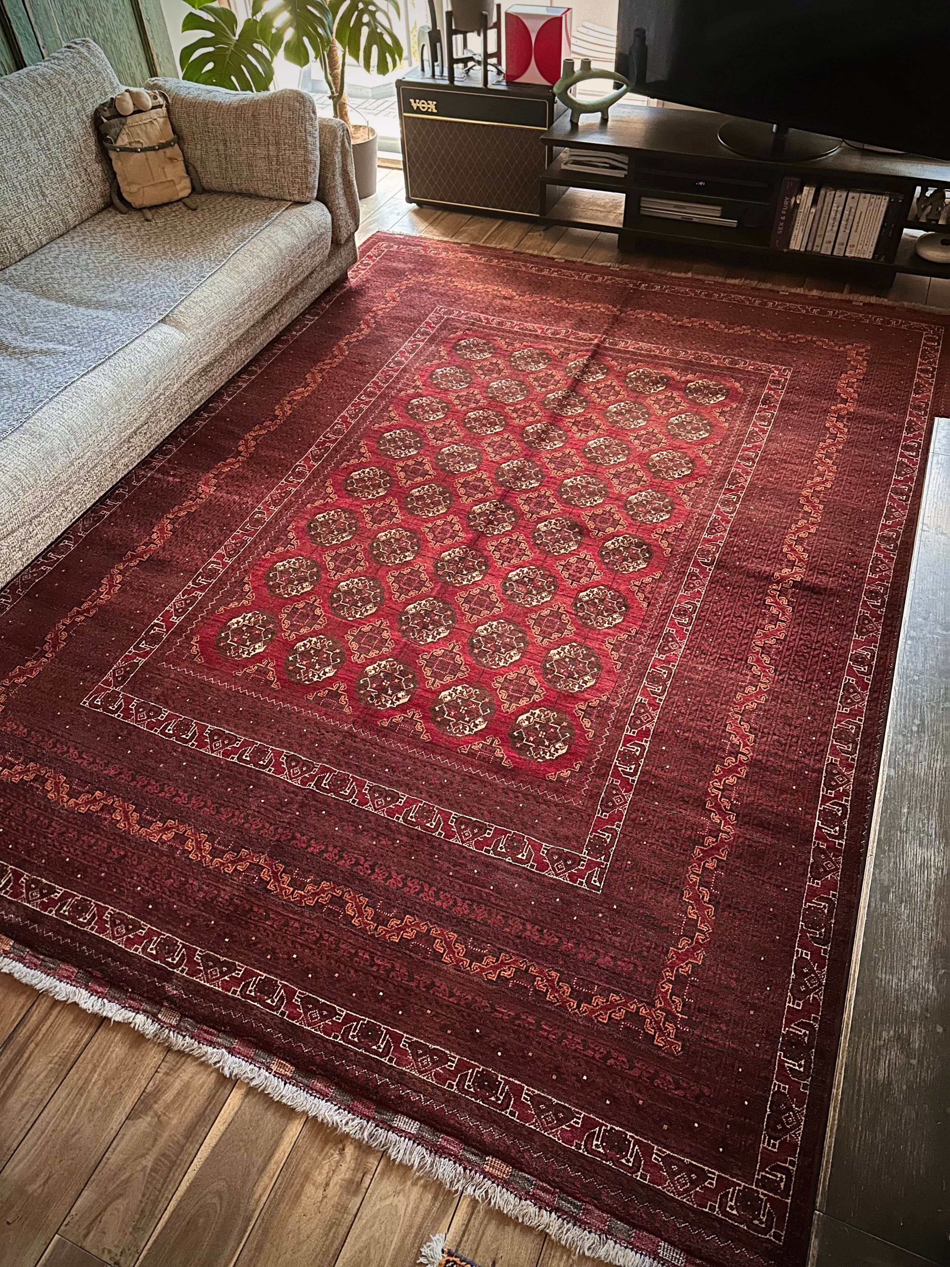 バーガンディの渋い色合いに整然と並んだテッケギュルの連続紋様がかっこいい、アフガニスタンの北部に居住する誇り高い騎馬民族らしいトルクメン族のトライバルラグで、自宅ではもう限界ですと言わんばかりの特大サイズの1枚になります。
