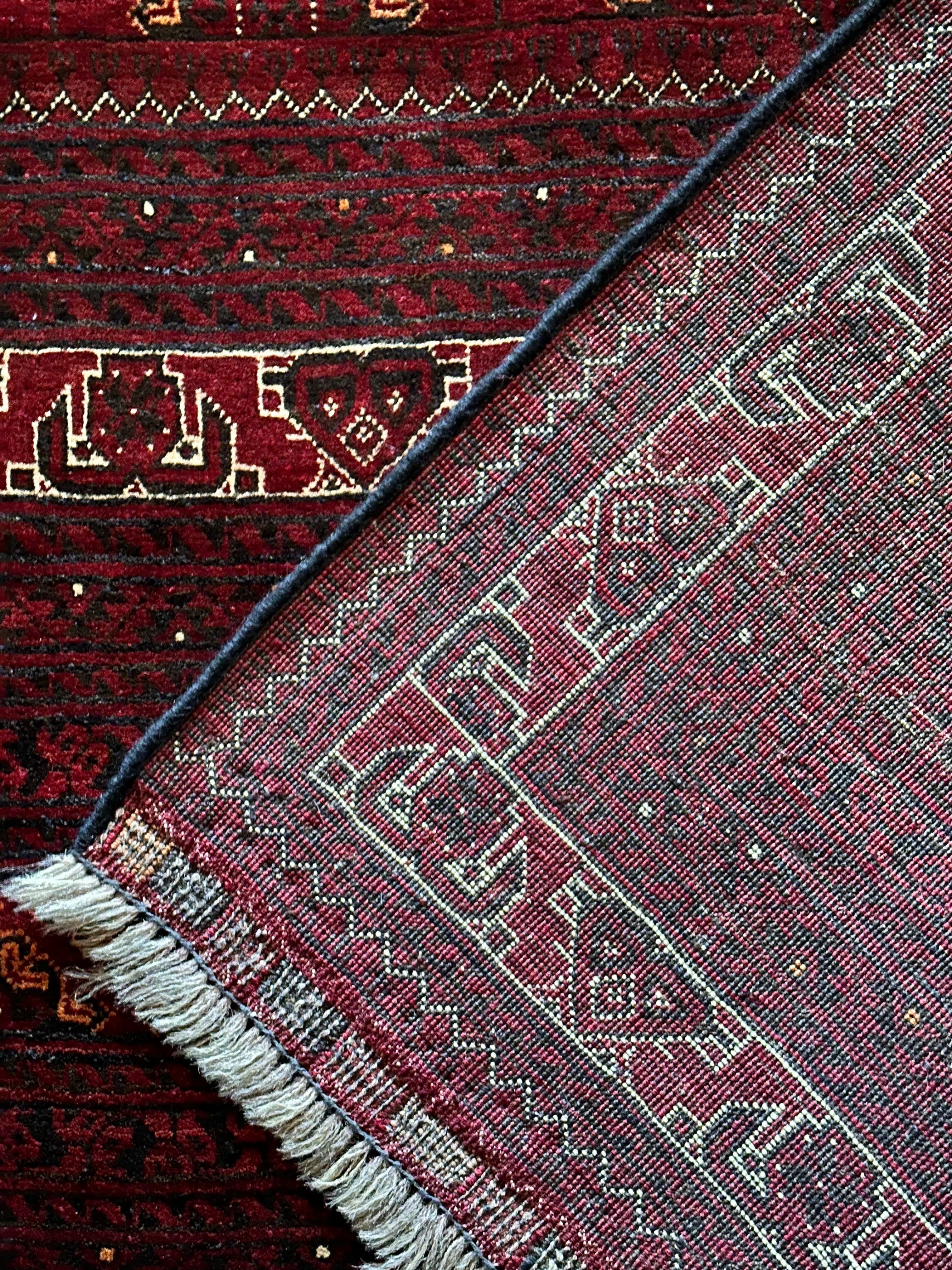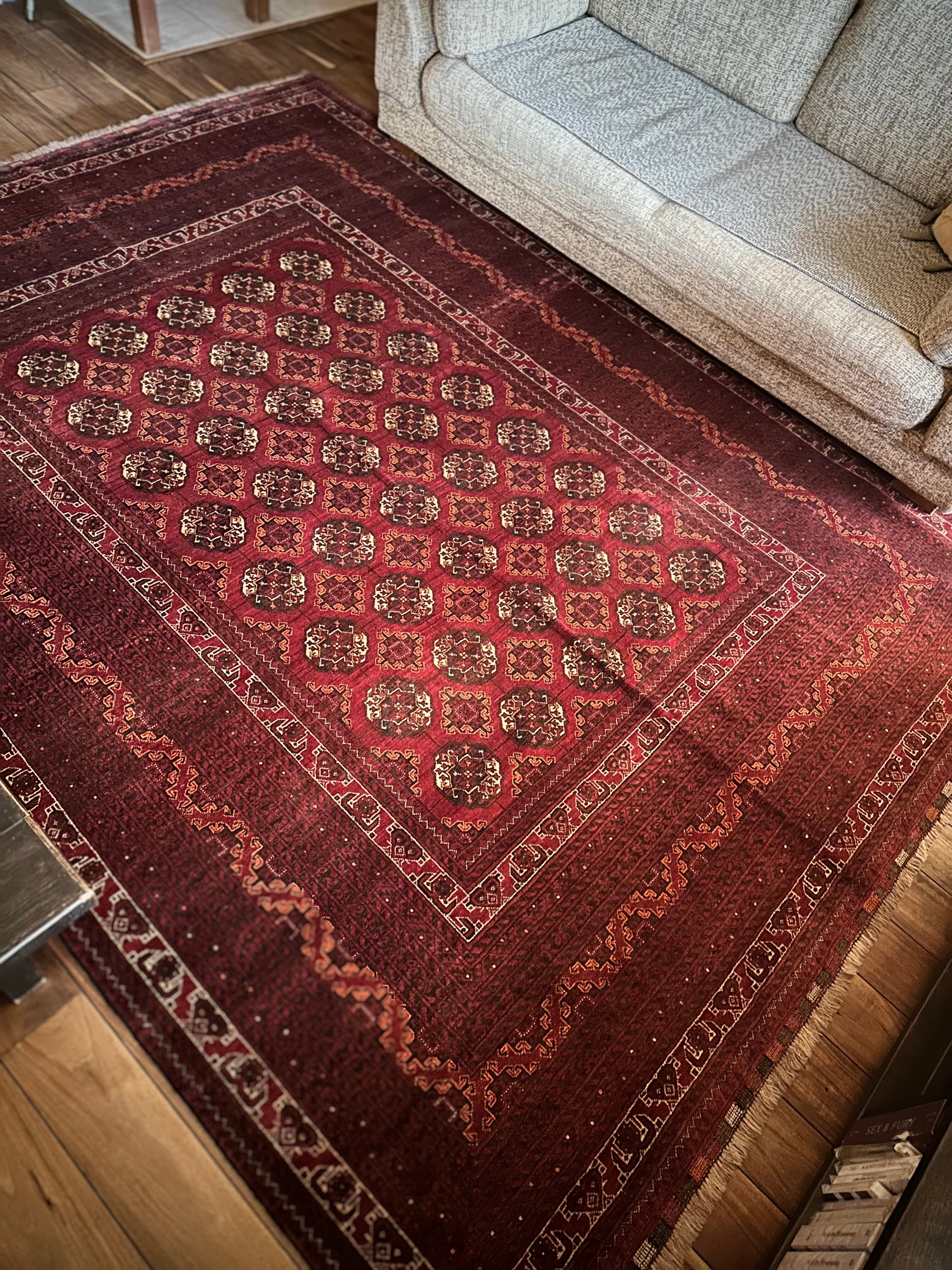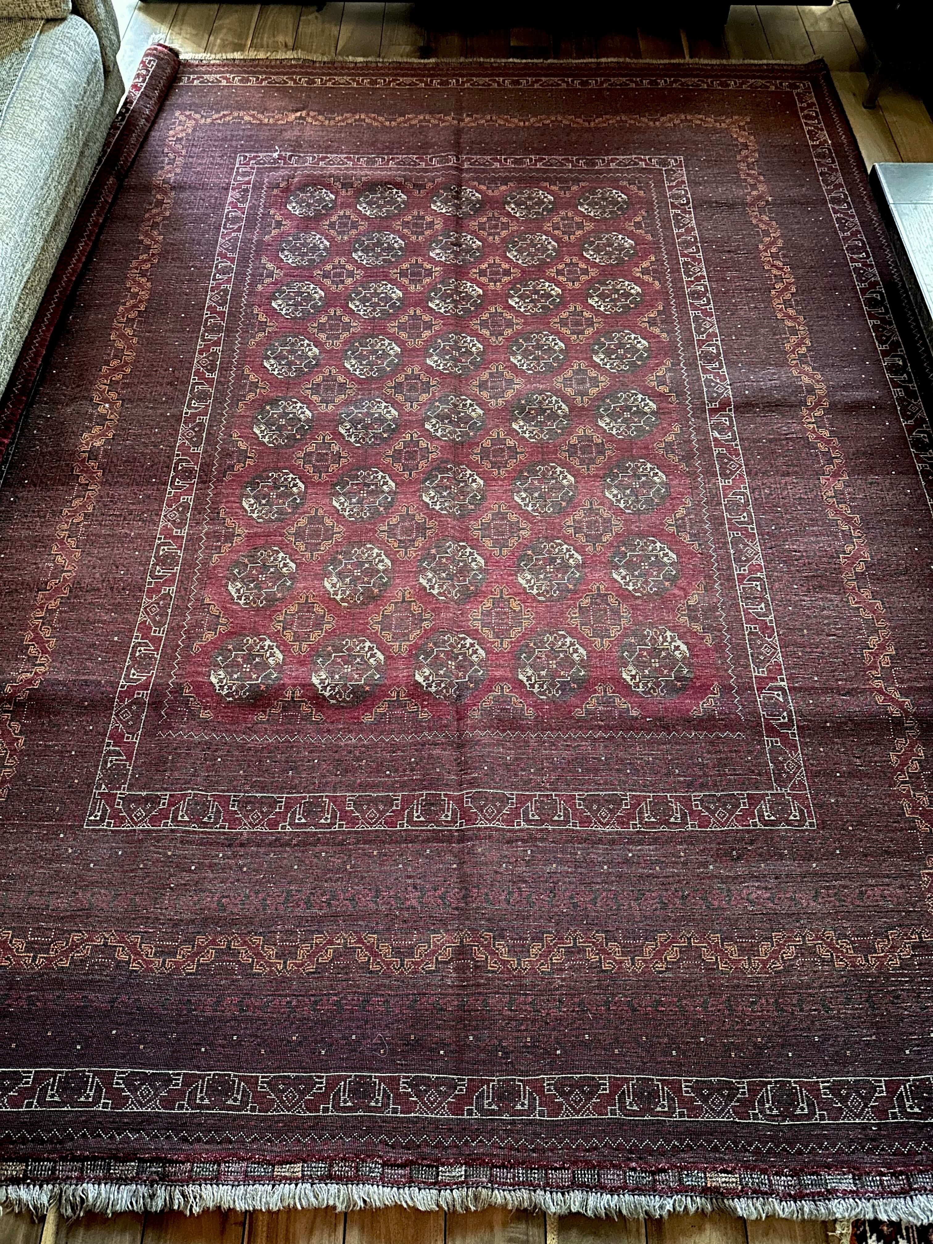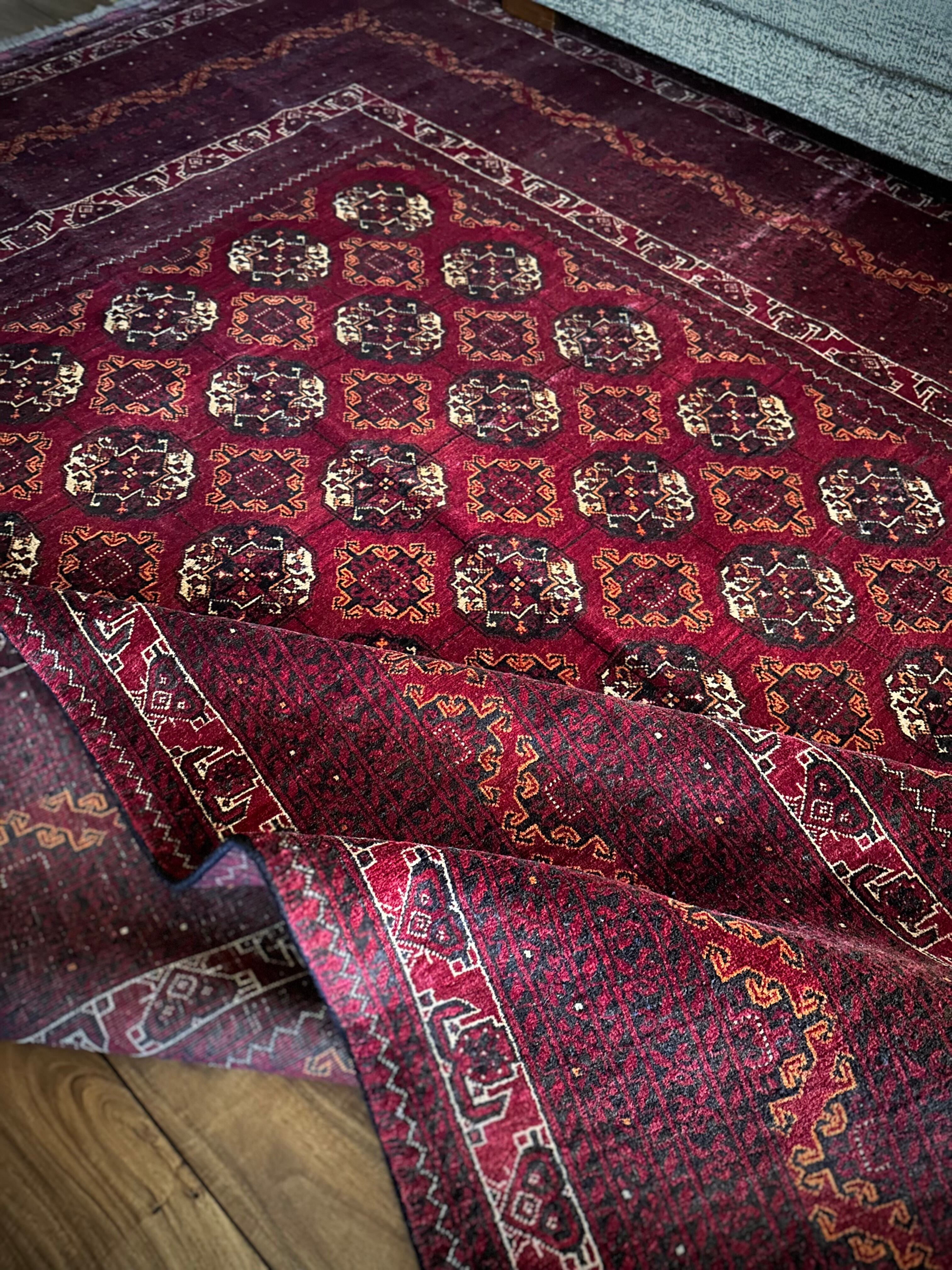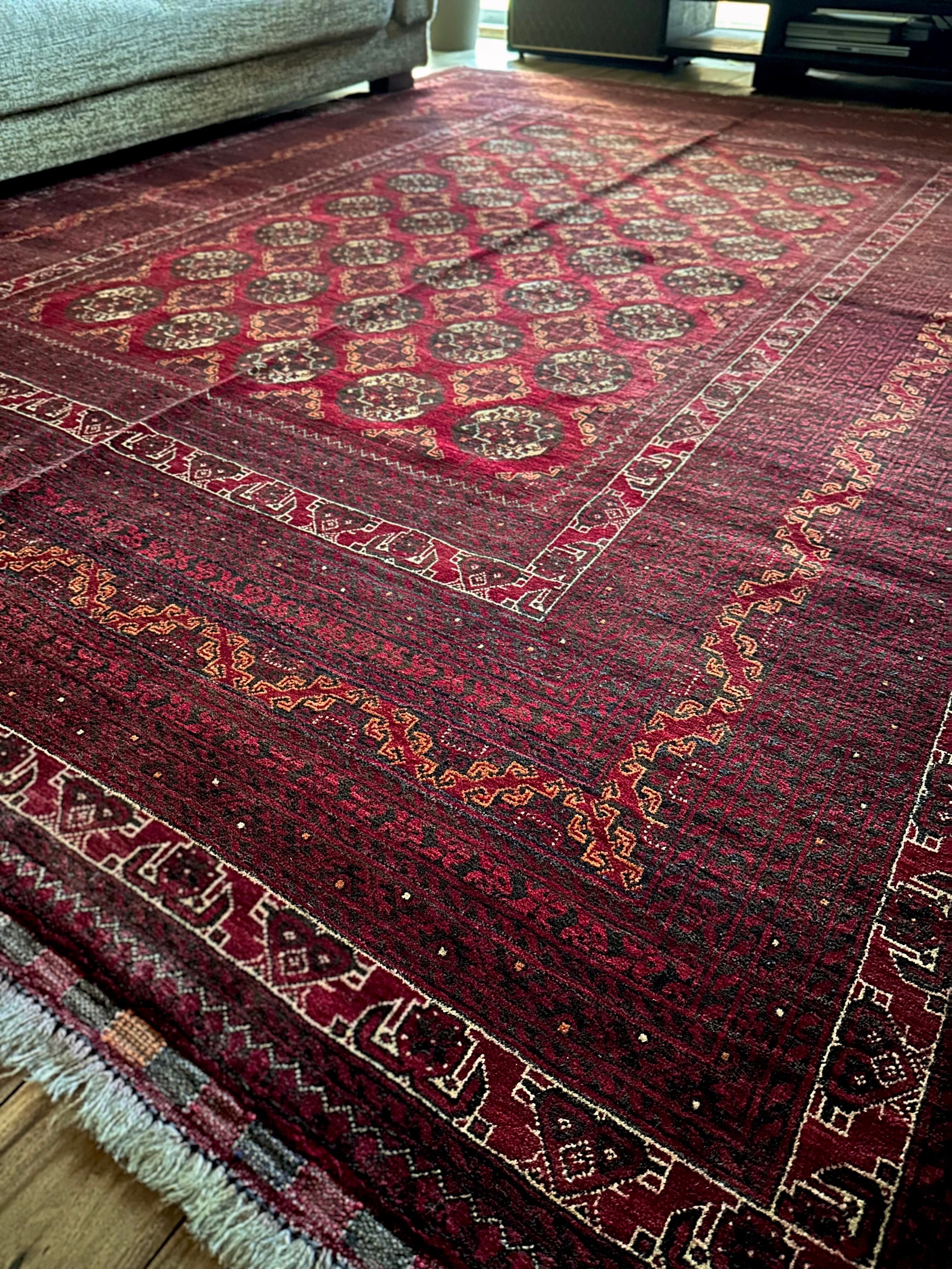 バーガンディの渋い色合いに整然と並んだテッケギュルの連続紋様がかっこいい、アフガニスタンの北部に居住する誇り高い騎馬民族らしいトルクメン族のトライバルラグで、自宅ではもう限界ですと言わんばかりの特大サイズの1枚になります。