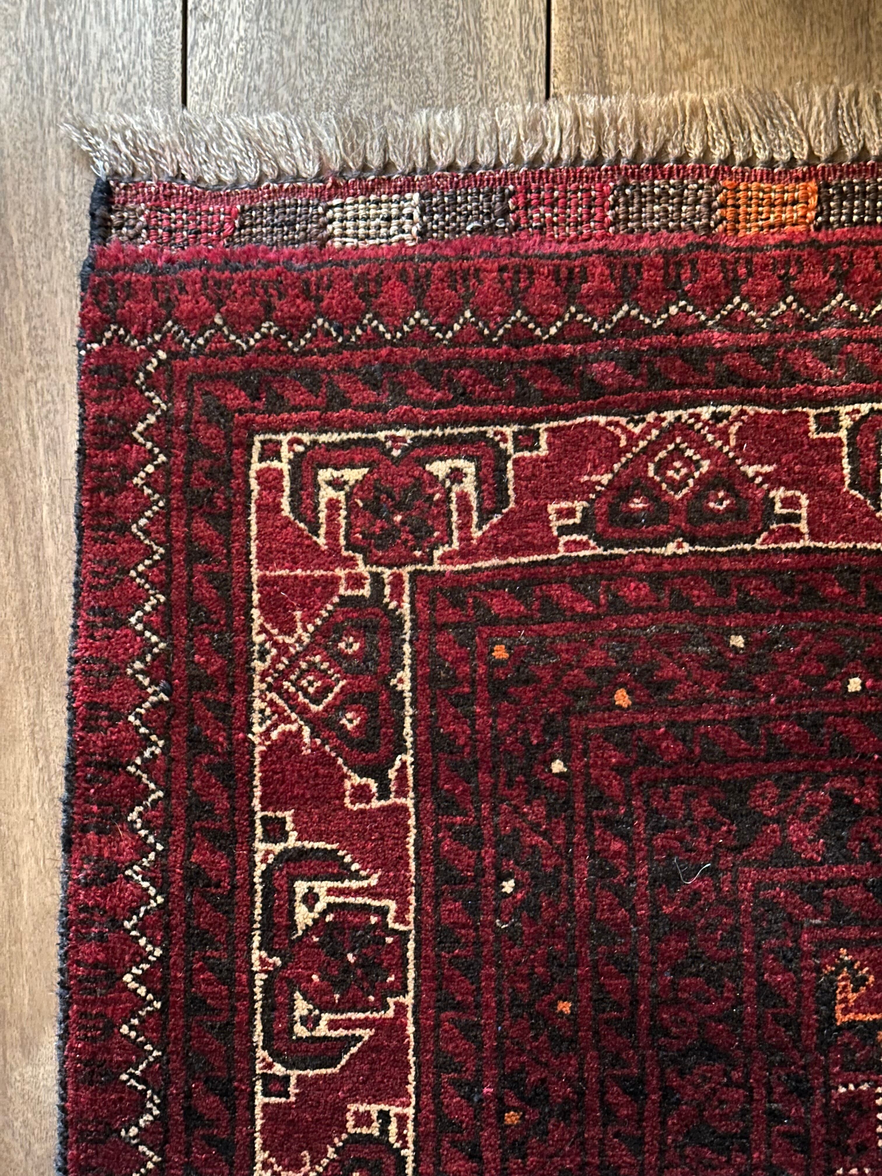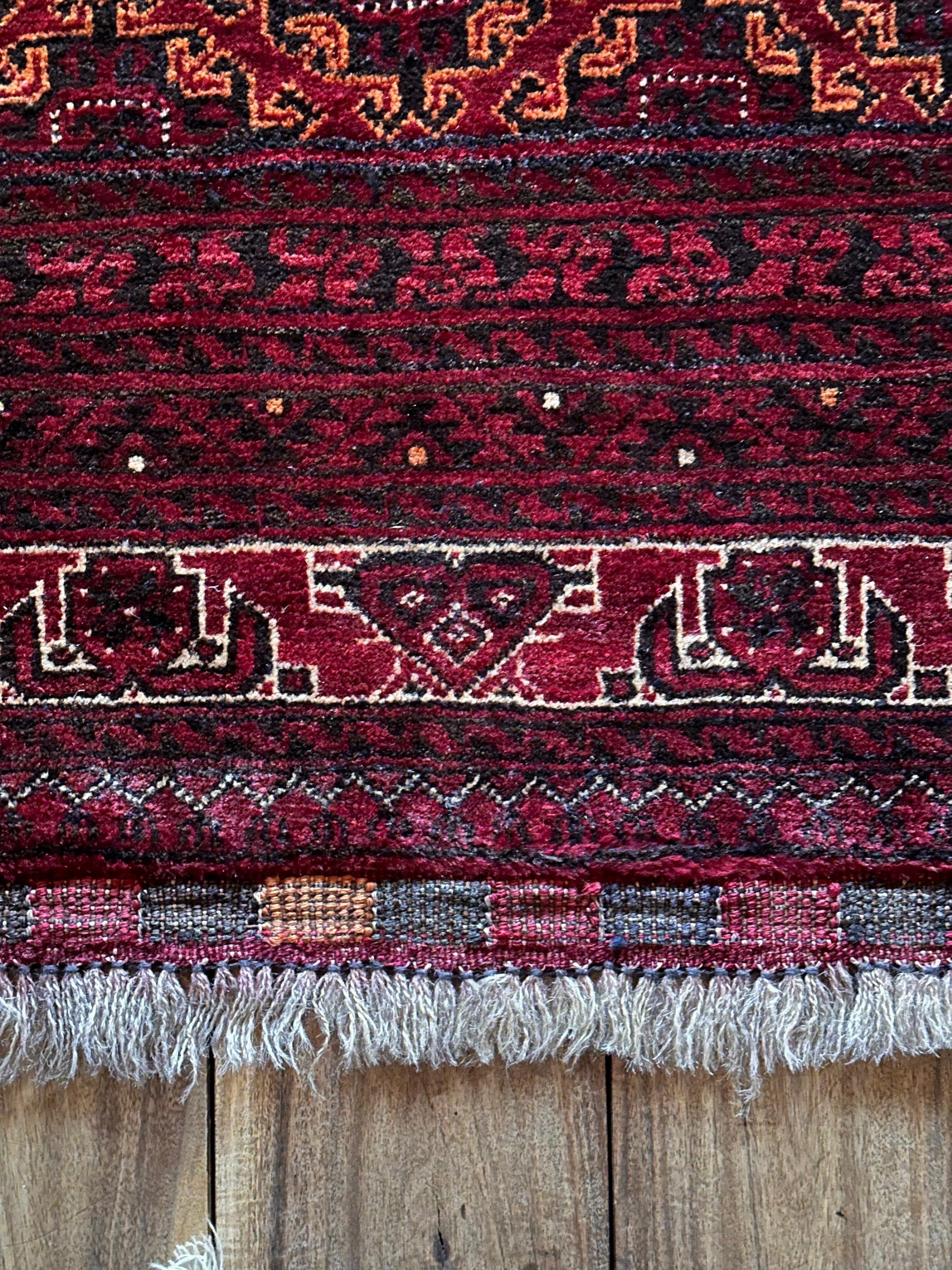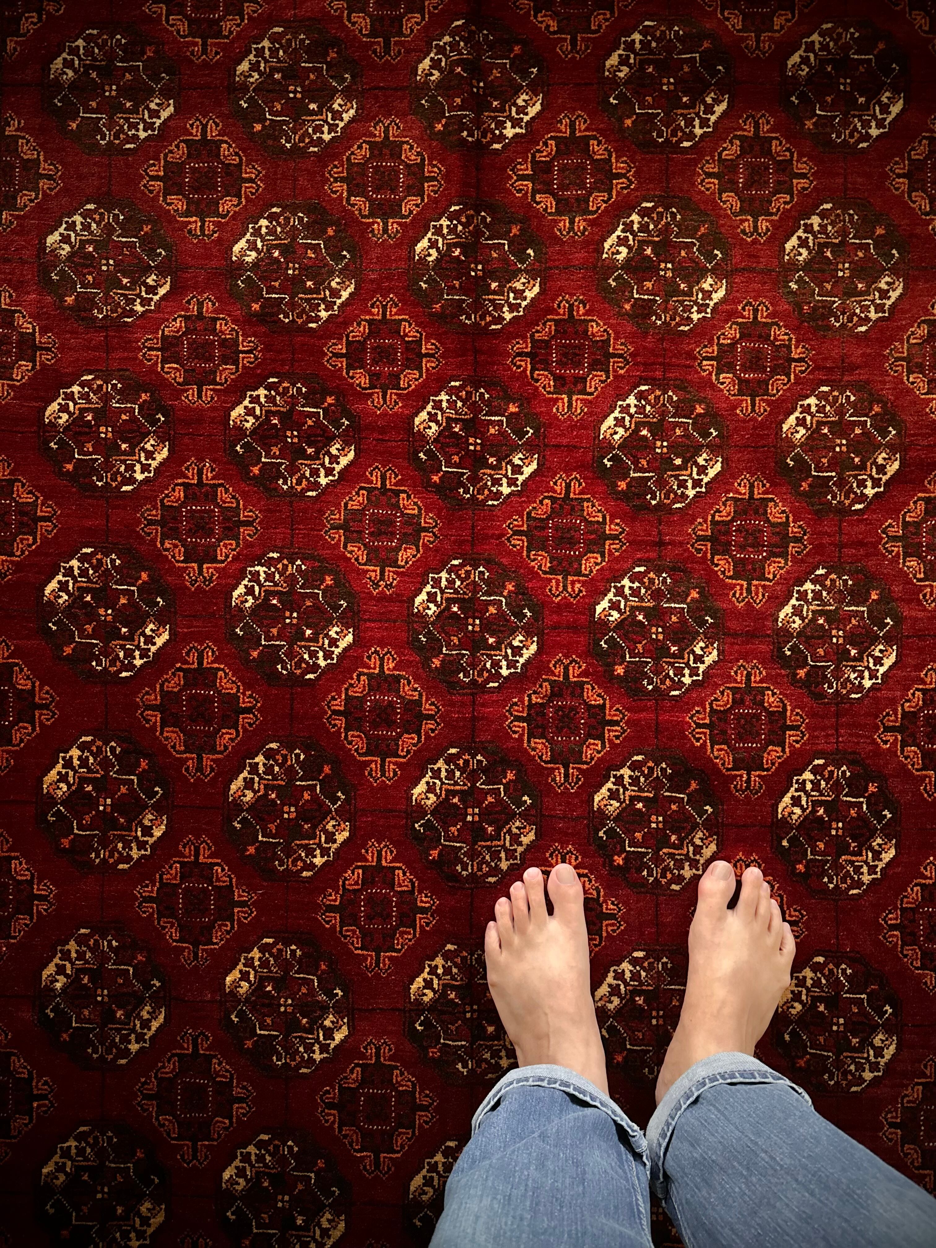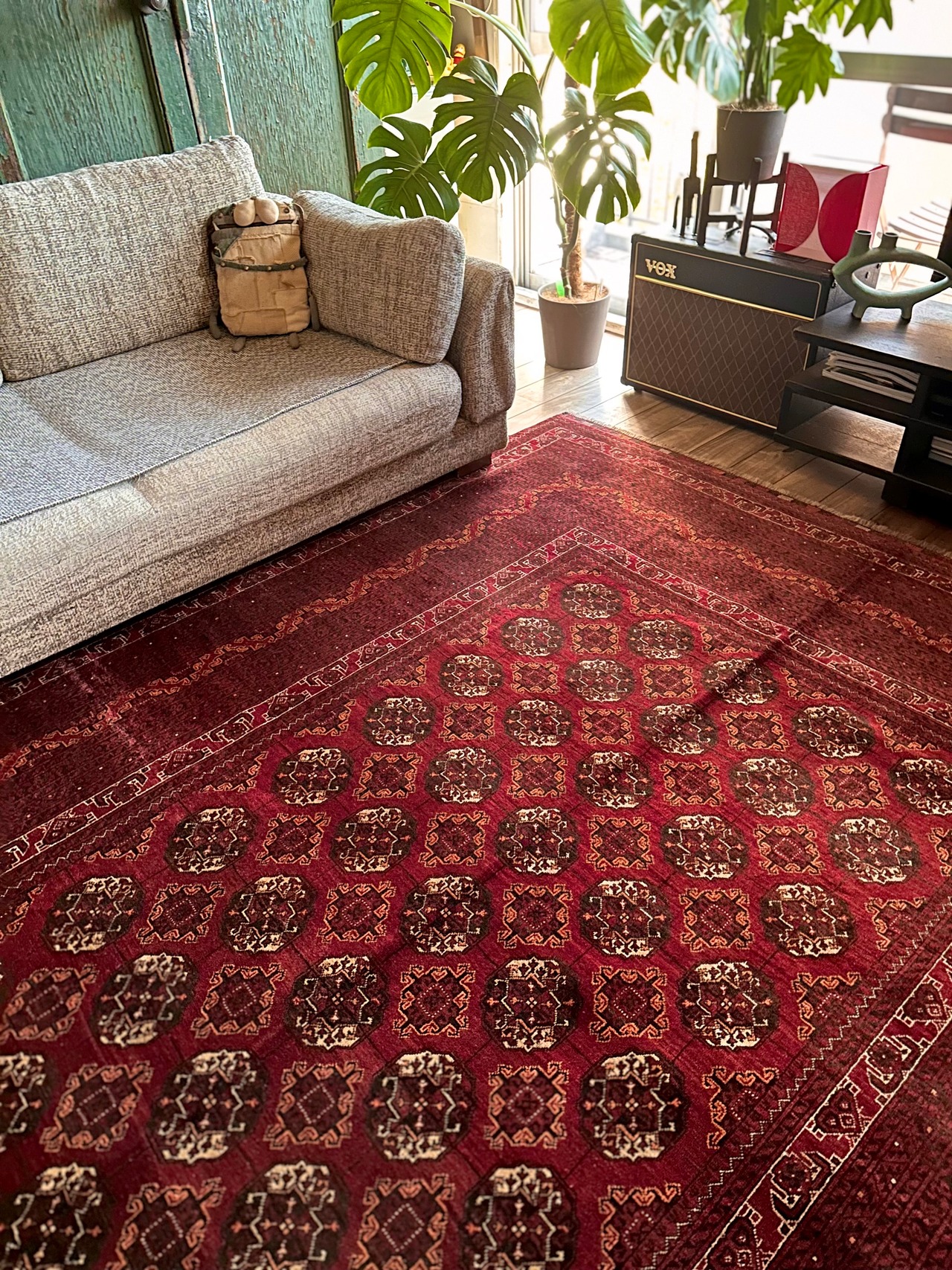 バーガンディの渋い色合いに整然と並んだテッケギュルの連続紋様がかっこいい、アフガニスタンの北部に居住する誇り高い騎馬民族らしいトルクメン族のトライバルラグで、自宅ではもう限界ですと言わんばかりの特大サイズの1枚になります。