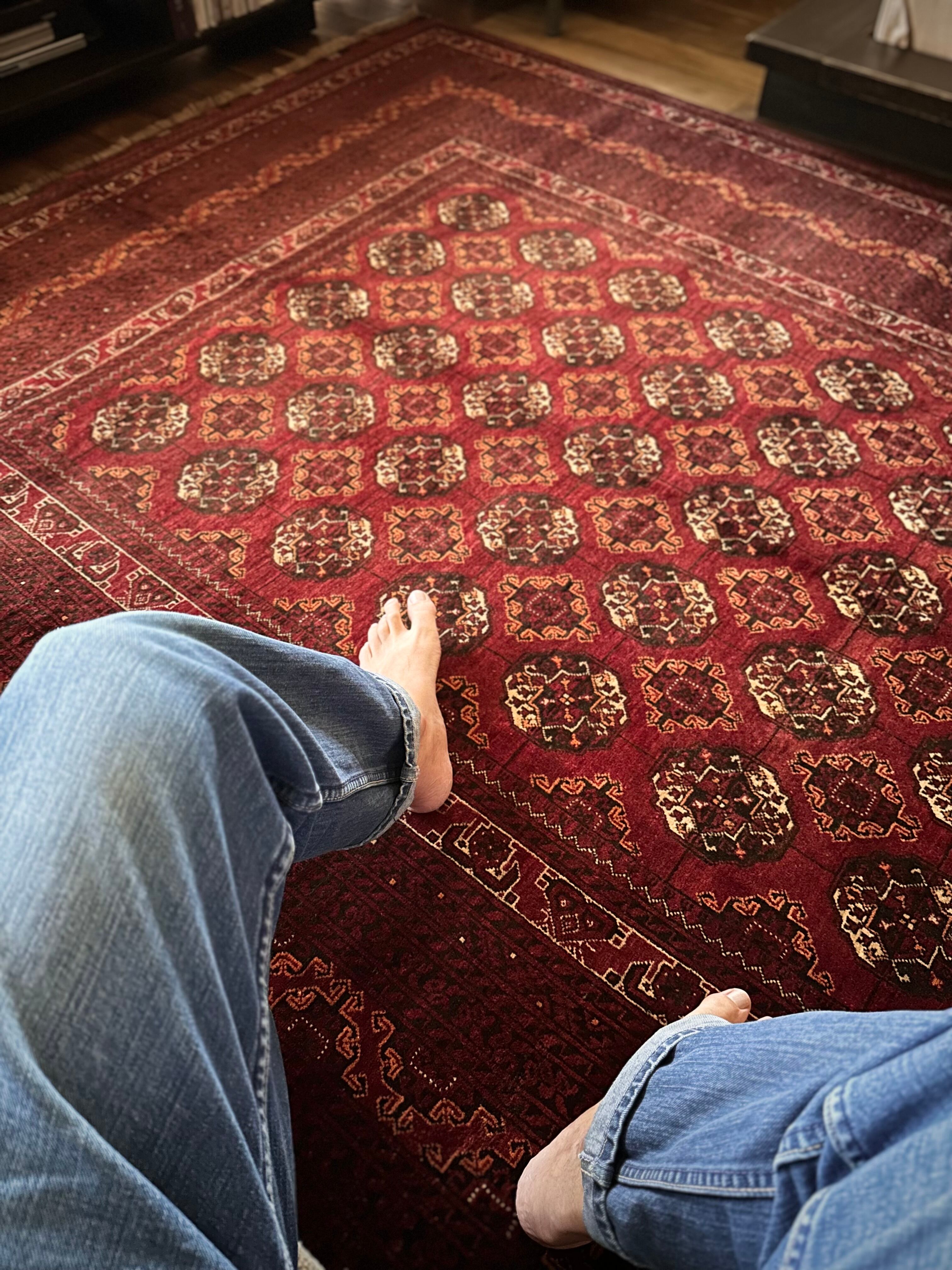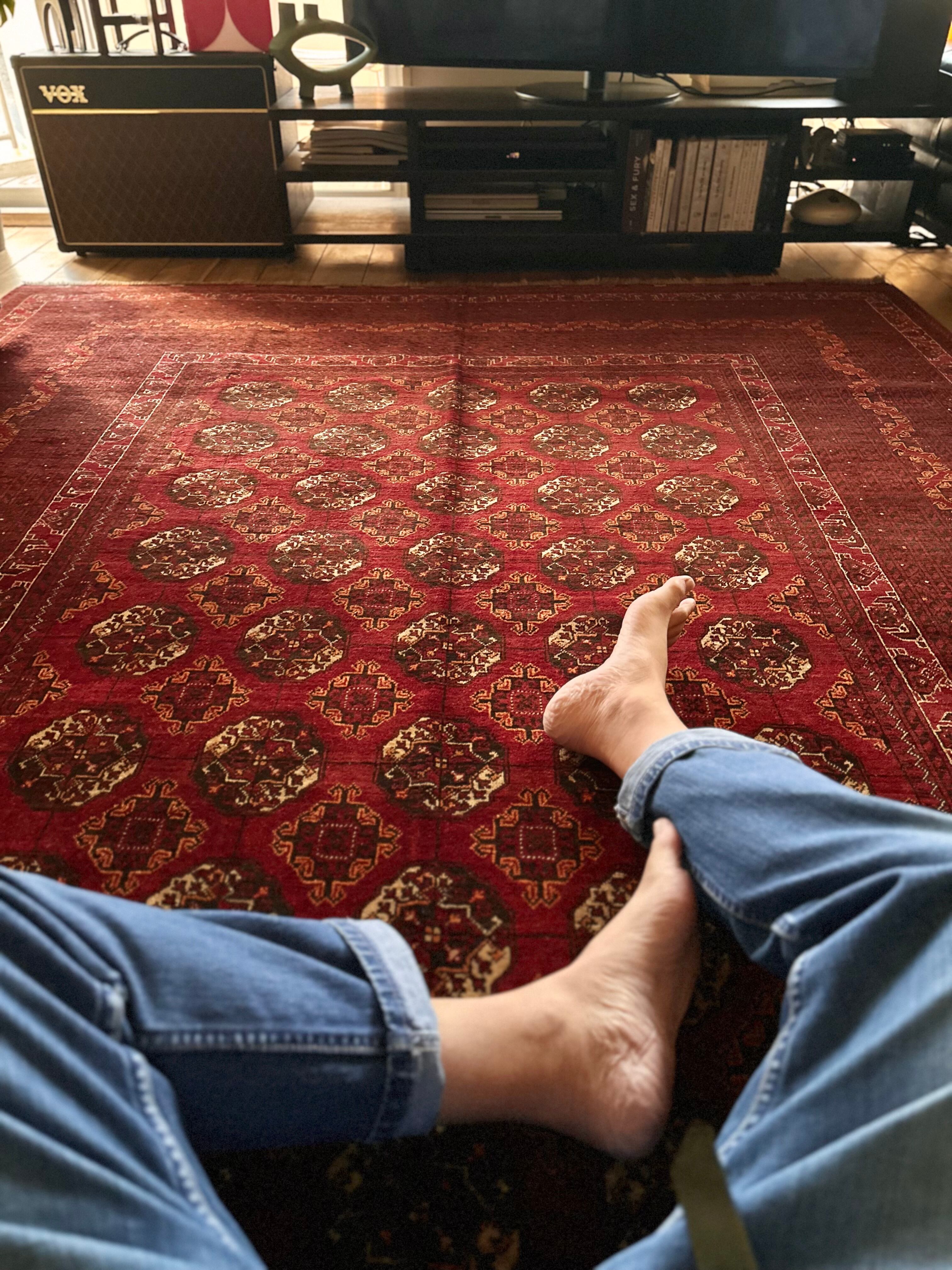 経年としては60年のヴィンテージラグとして、パイルは短めながらもそれほどの使用感はなく、特に目立つダメージにリペア箇所は見当たらないグッドなコンディションで、重厚感のある厚みにサラッとした肌触りが気持ちいいでしょうか。ここまでの特大サイズは仕入れるにも躊躇いたしますが、かなりのお値打ち価格でご用意できましたと、ひとり撮影するだけでクタクタになってしまいます。