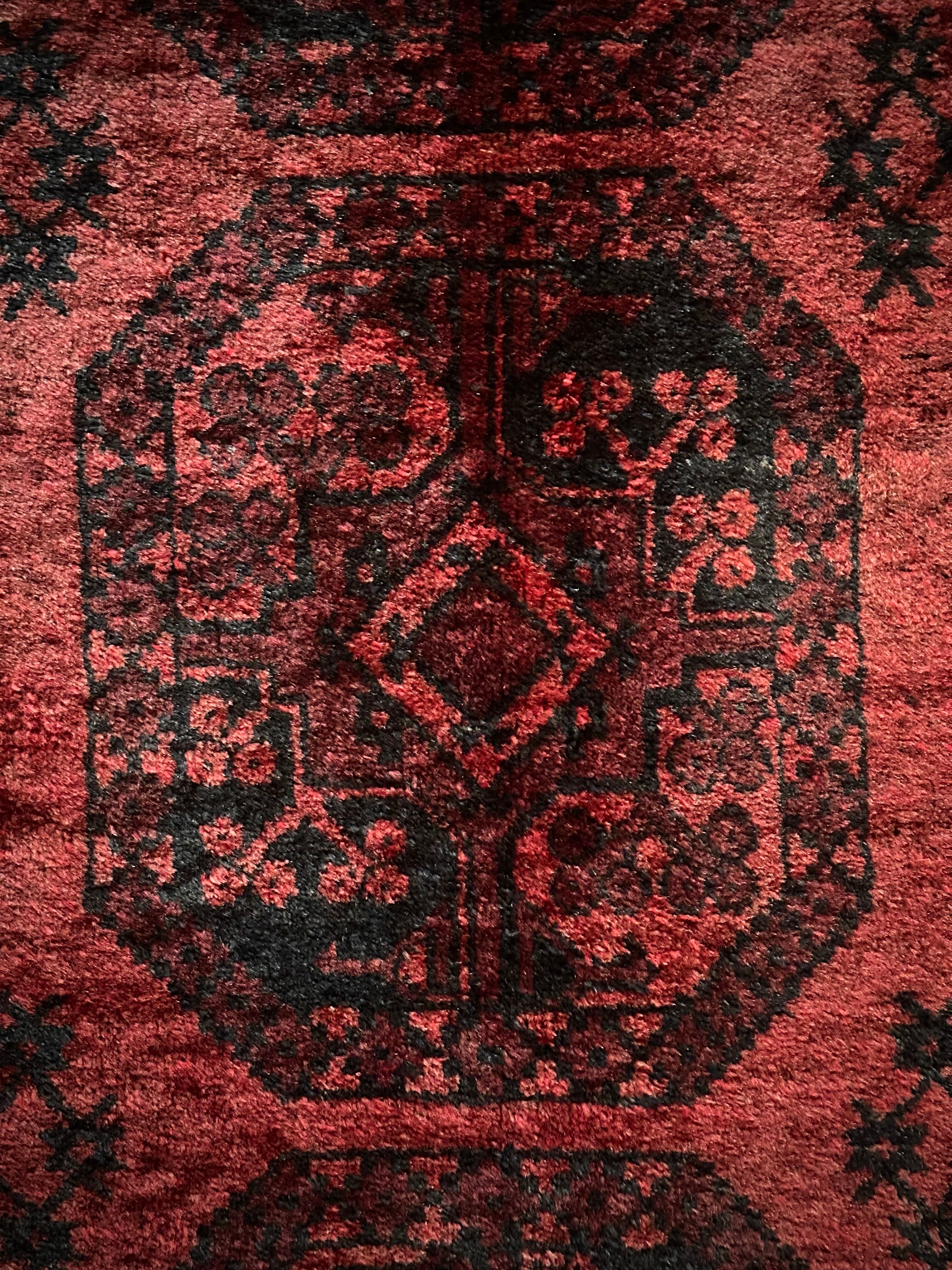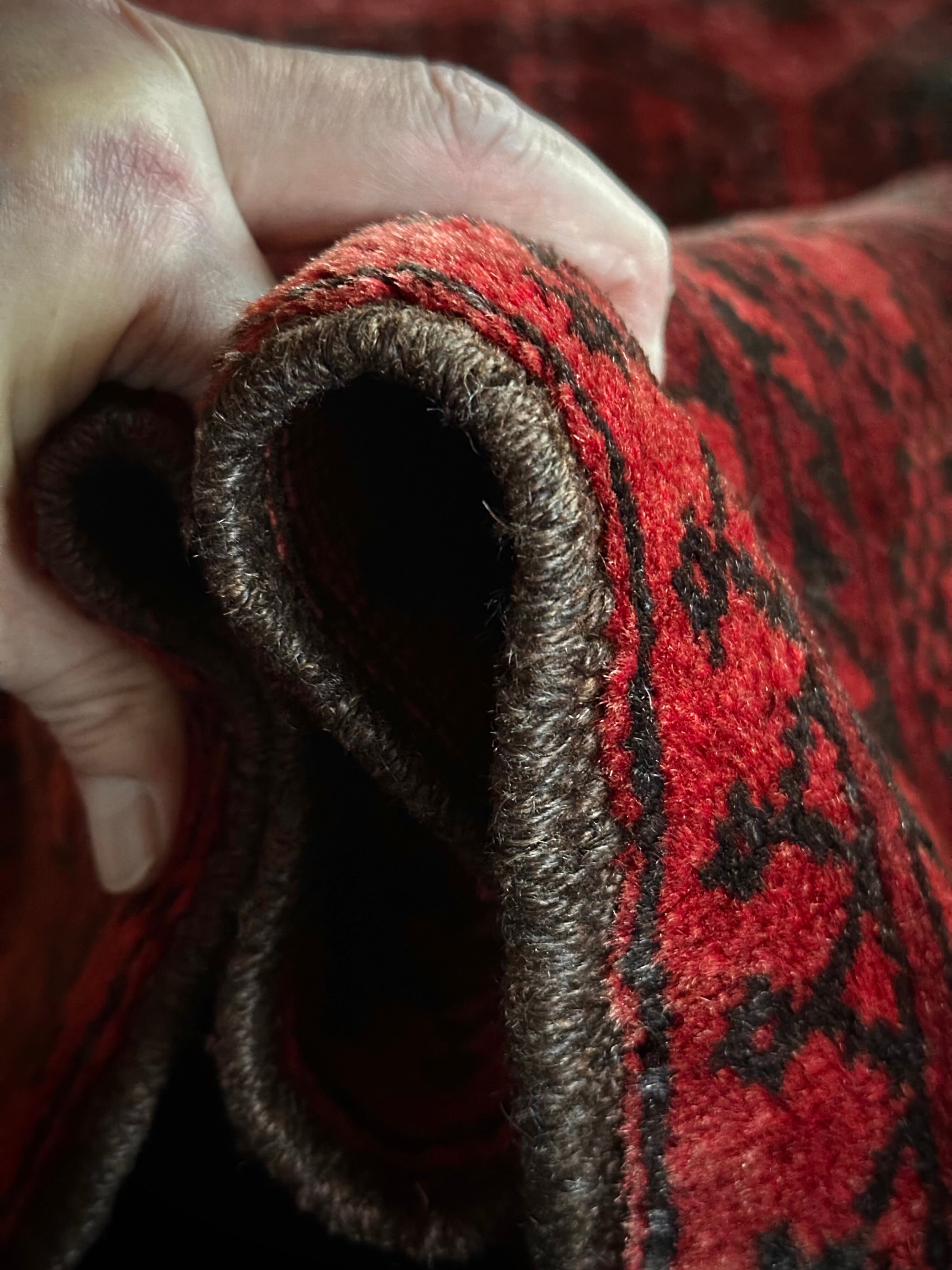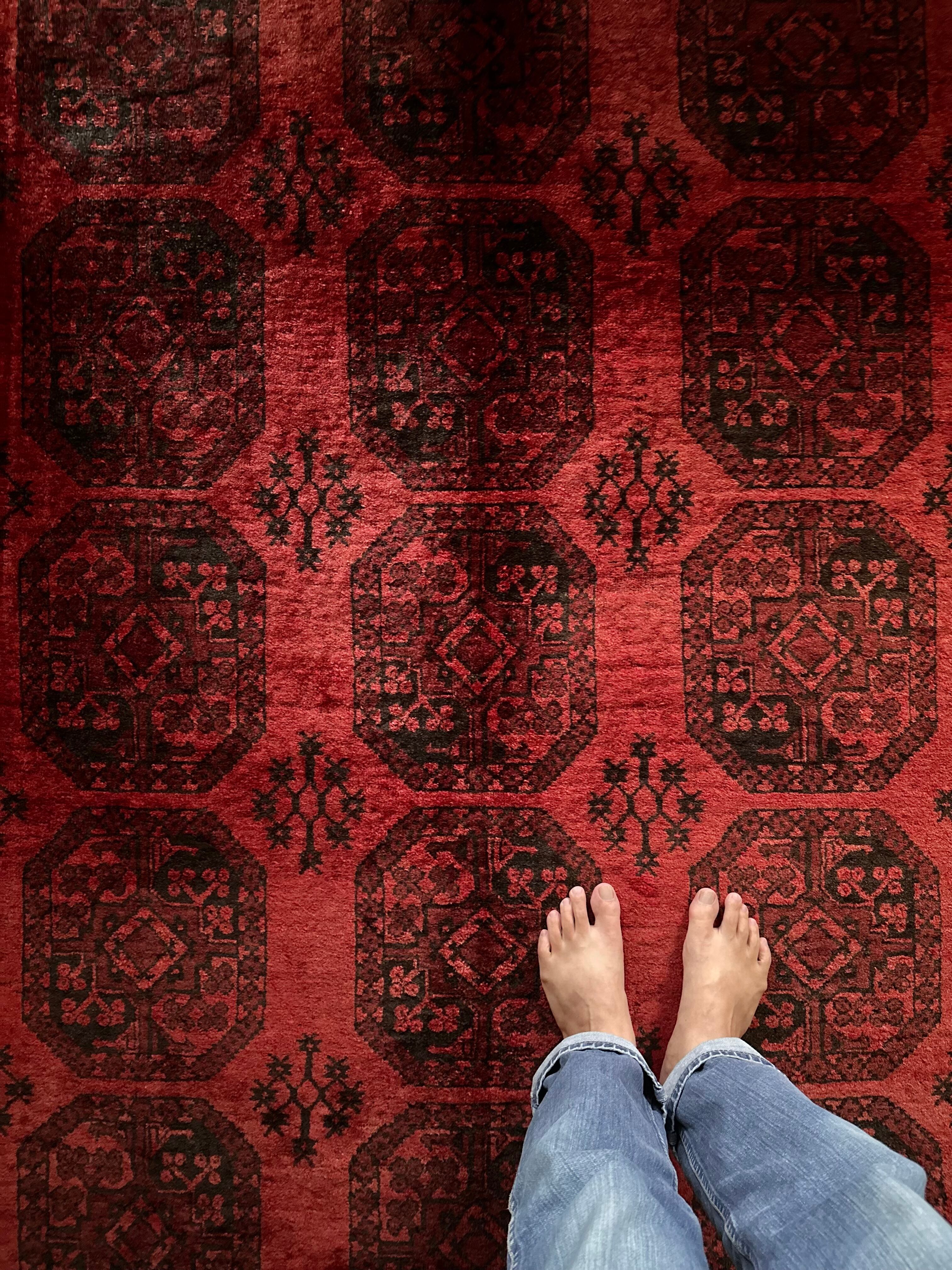 真紅のレッドカーペットにエルサリ族の証でもある象の足跡と言われるフィルパイ柄のスレイマン・ギュルが18連も並んだ圧巻の見た目で、細かく織り込まれたミルフィーユ状のボーダー柄も素晴らしい、ありそうでなかなか無い極上品の1枚に、かっこよく男前な部屋が仕上がるのは言うまでもありません。