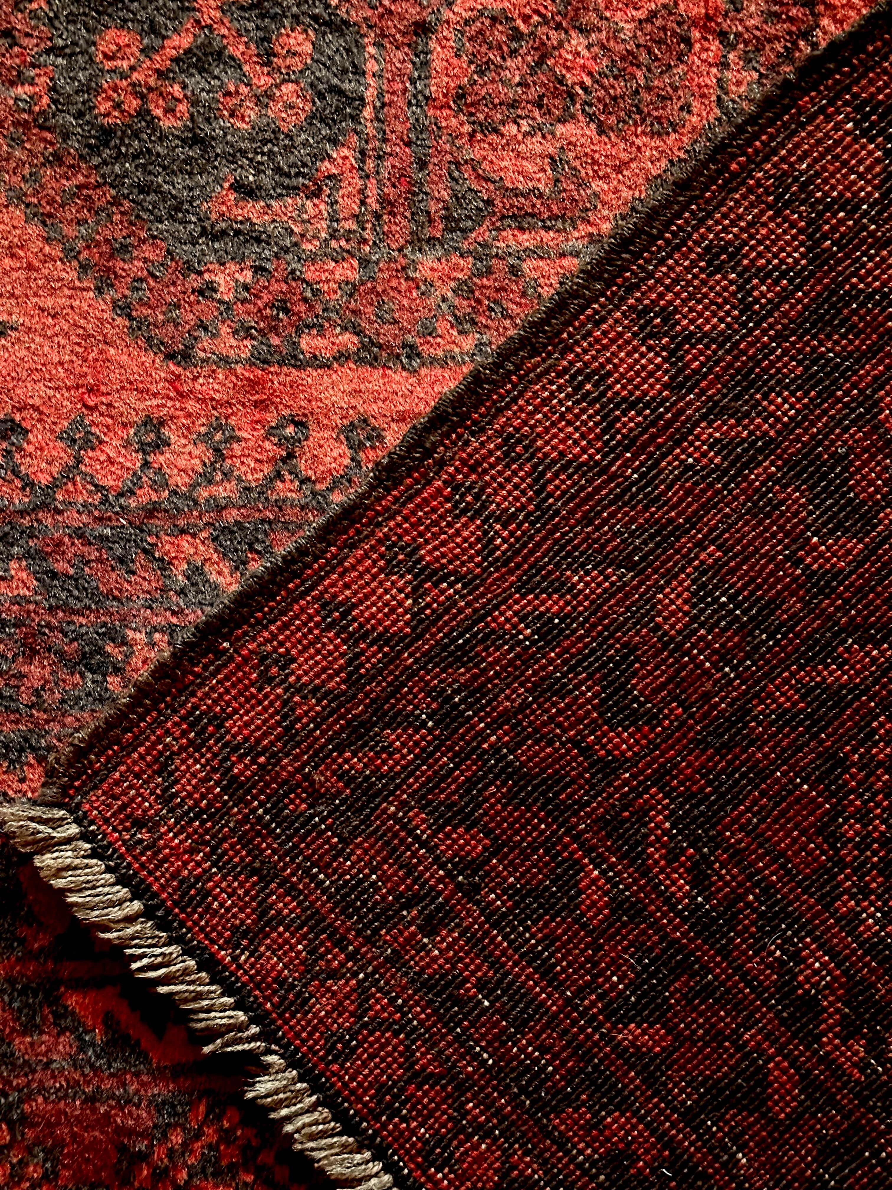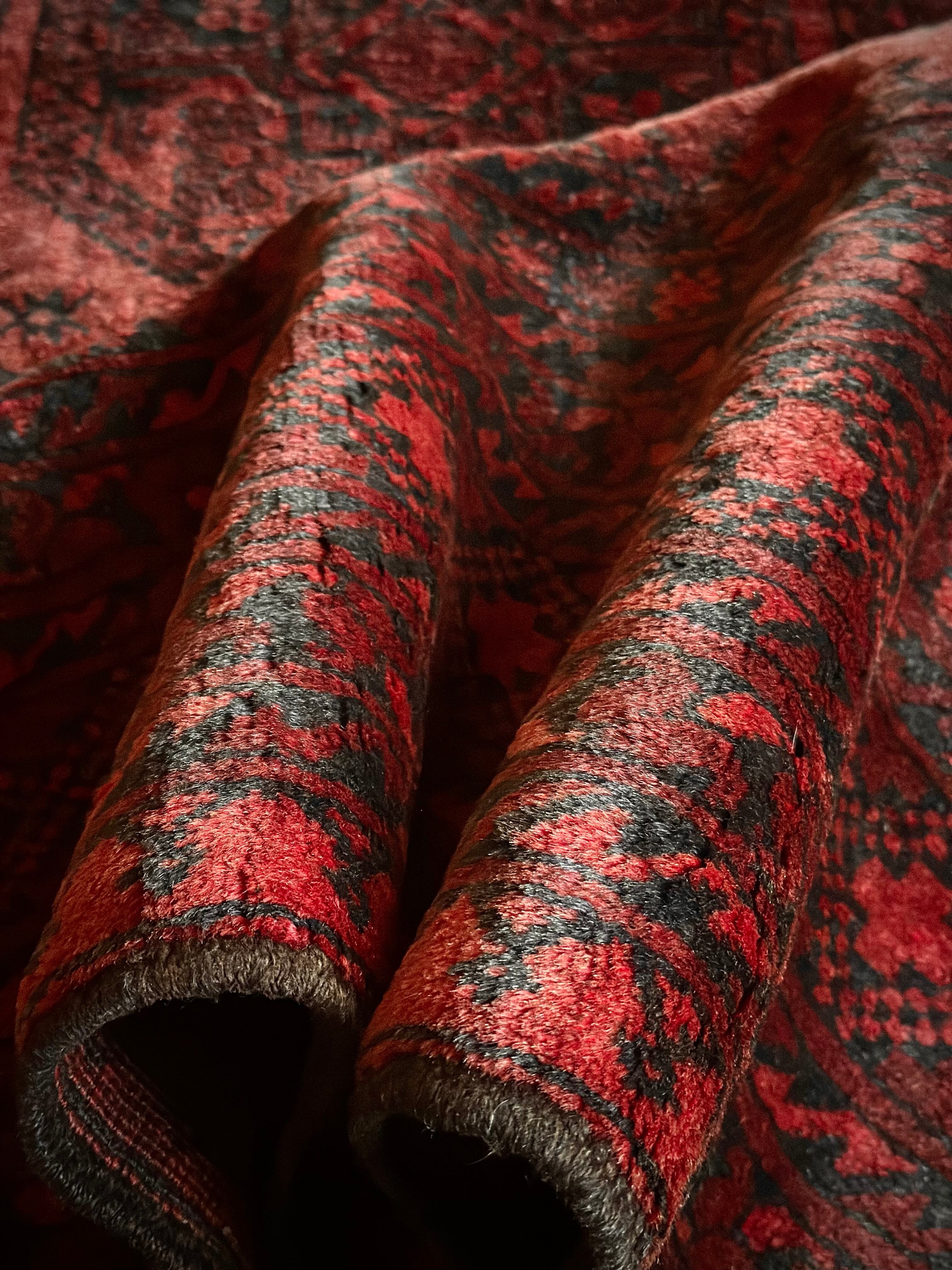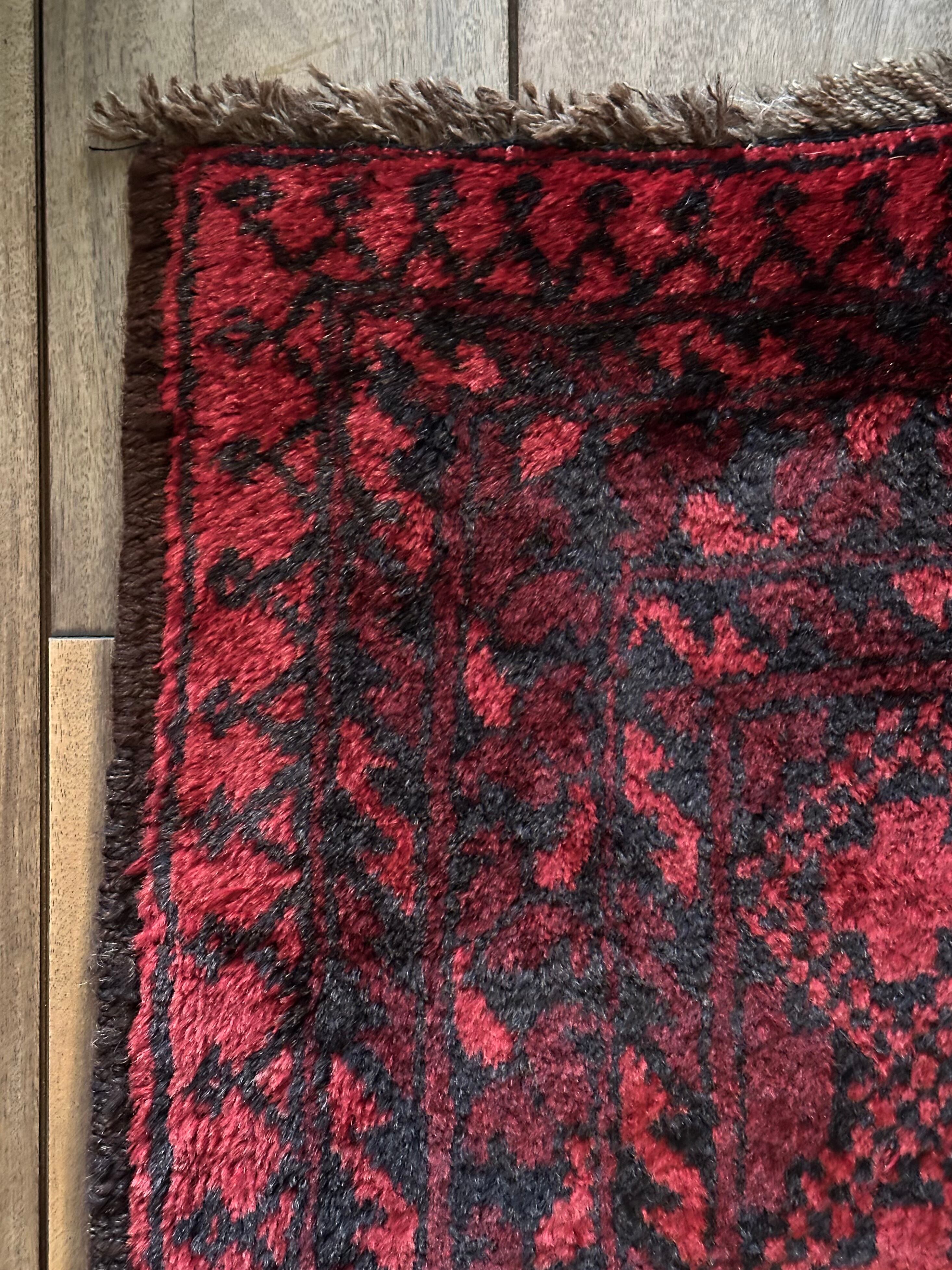 真紅のレッドカーペットにエルサリ族の証でもある象の足跡と言われるフィルパイ柄のスレイマン・ギュルが18連も並んだ圧巻の見た目で、細かく織り込まれたミルフィーユ状のボーダー柄も素晴らしい、ありそうでなかなか無い極上品の1枚に、かっこよく男前な部屋が仕上がるのは言うまでもありません。