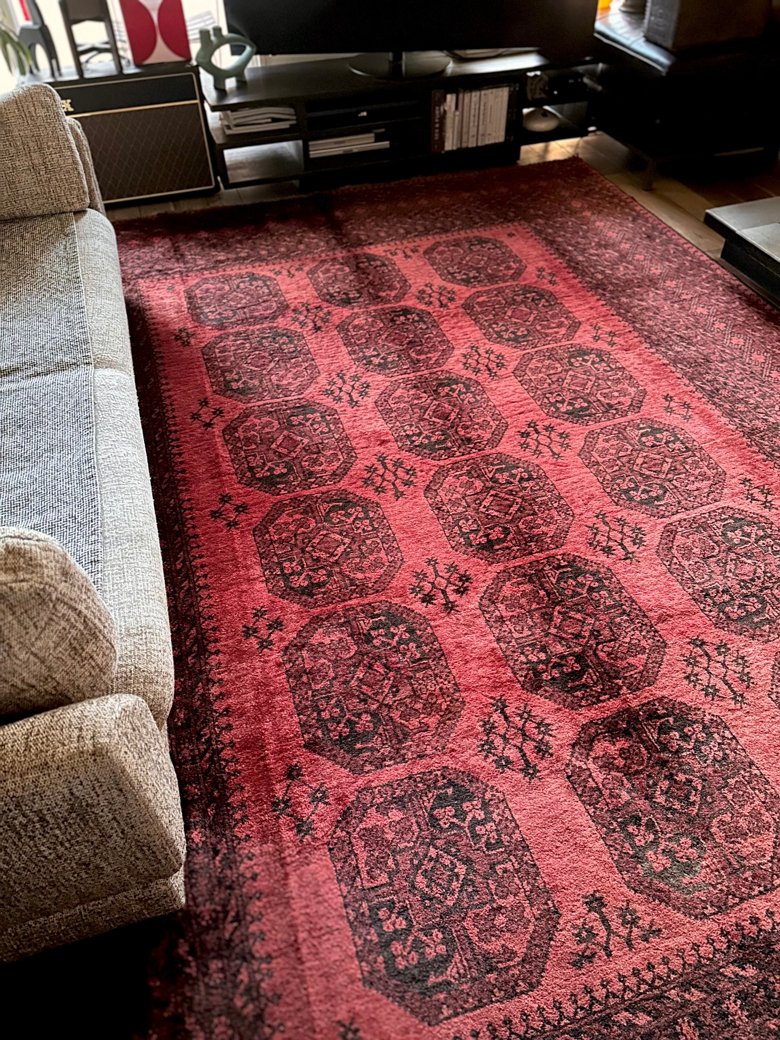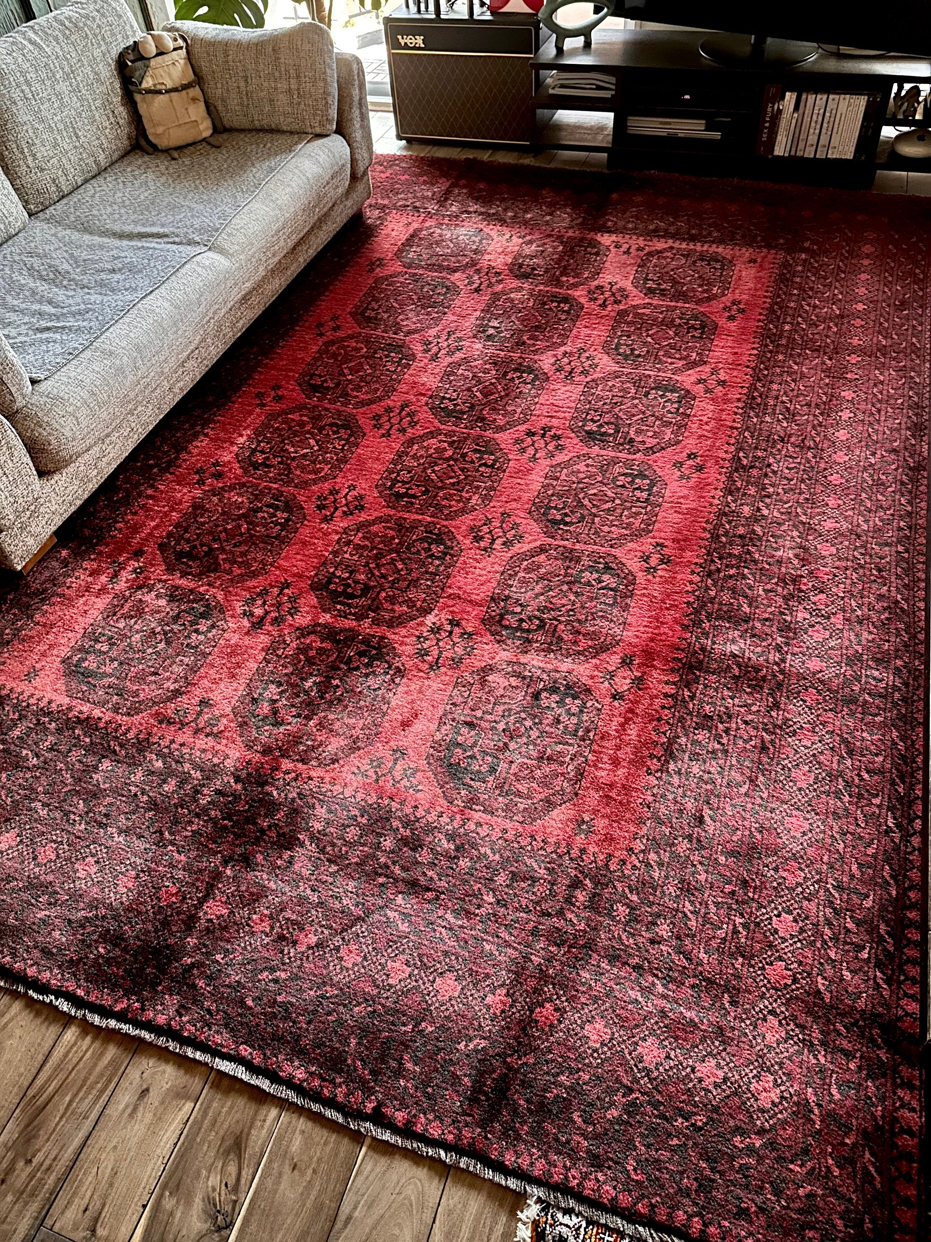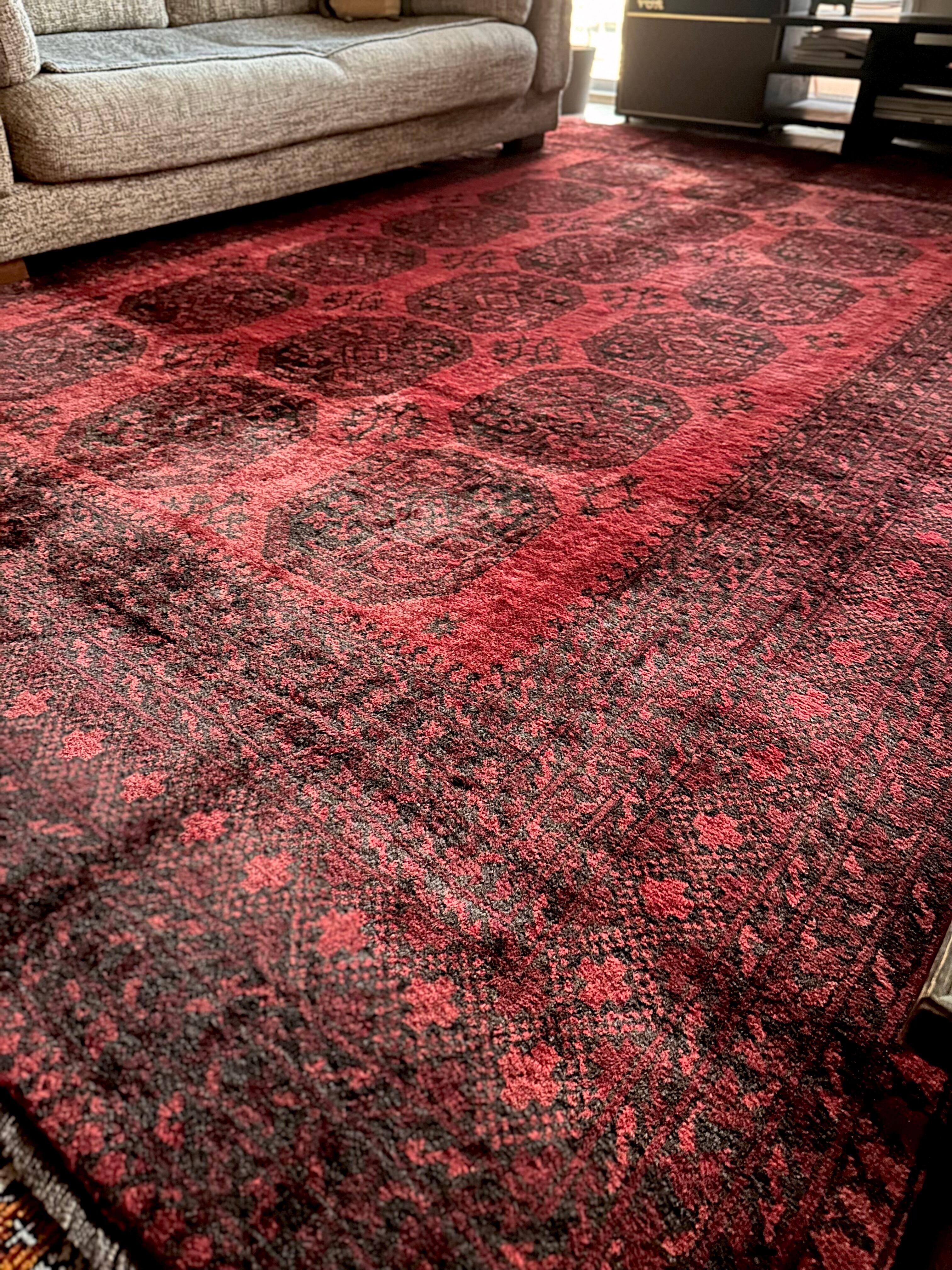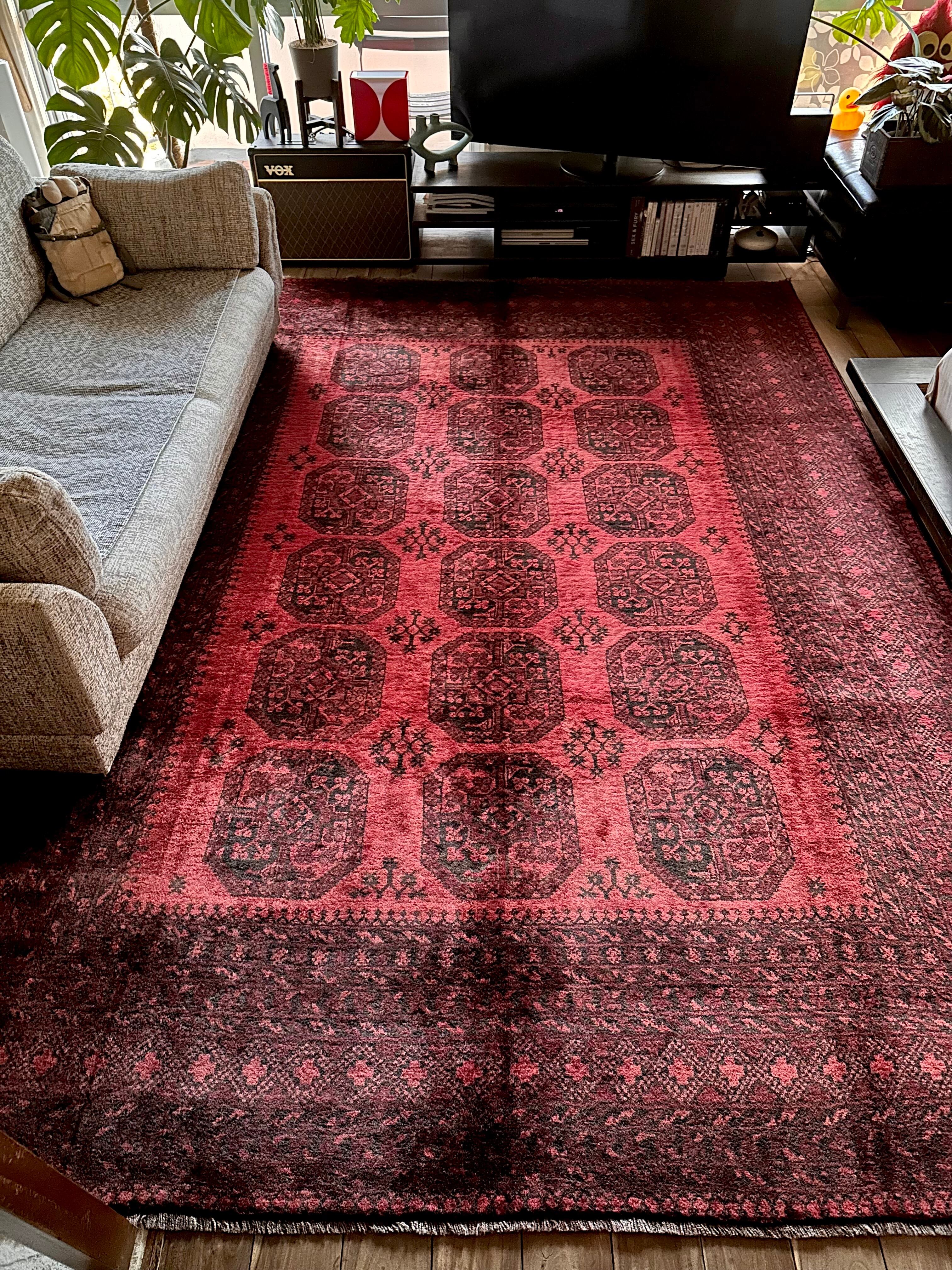 こちら見るからに特大サイズ過ぎてソファが半分乗っかるくらい、今まで仕入れたラグの中でも一番大きく、そして一番重く腰が砕けそうになりましたが、敷いてみるとやっぱりかっこいいアフガニスタン北部に居住するトルクメンの種族であるエルサリ族のトライバルラグになります。