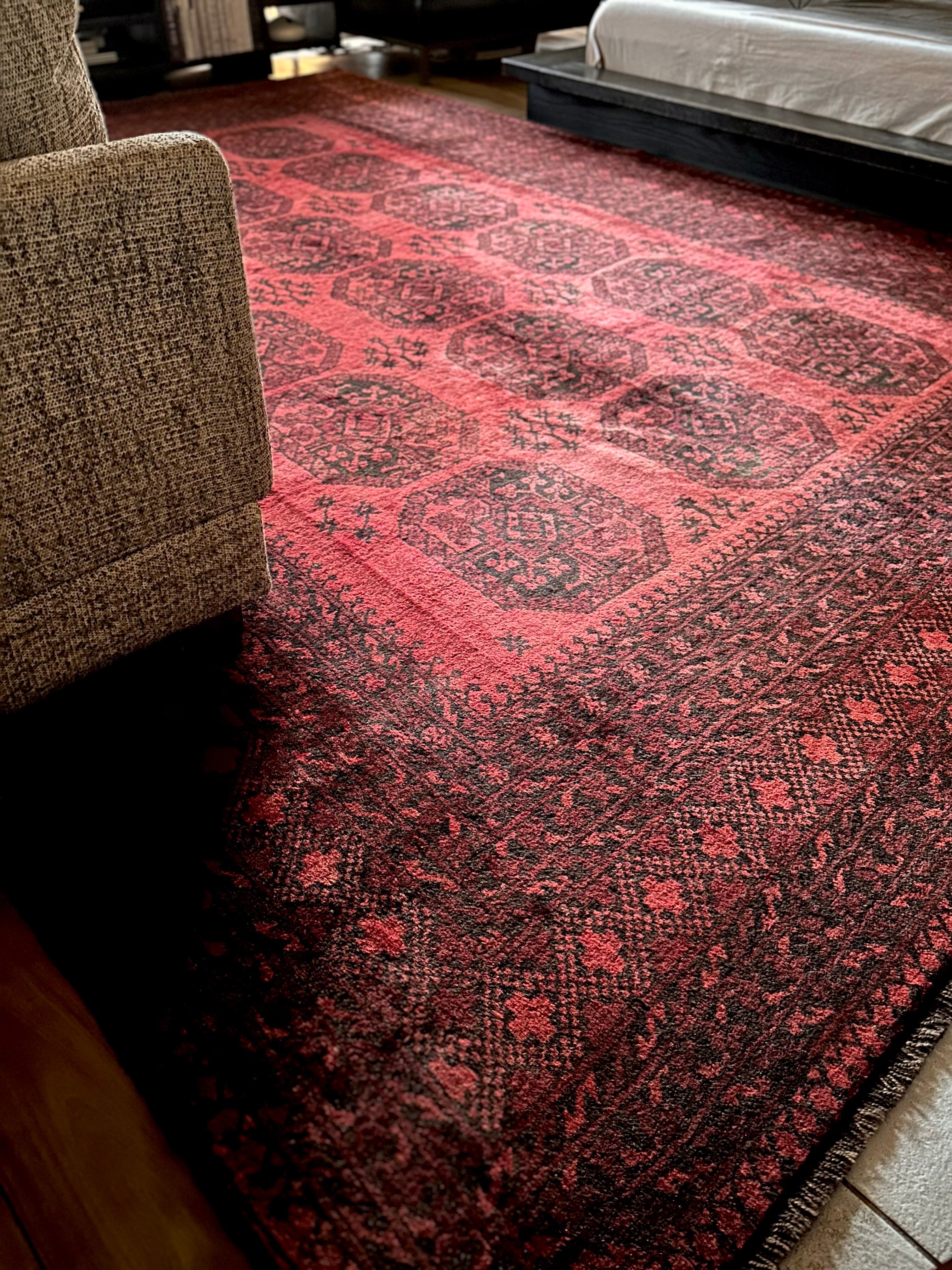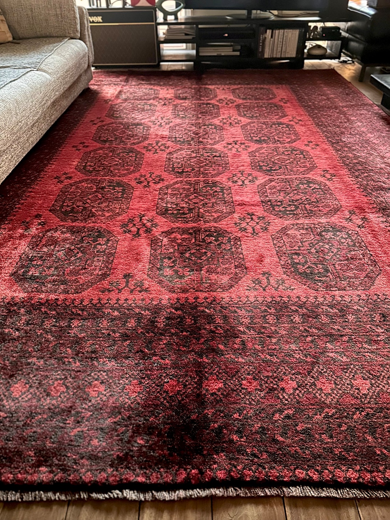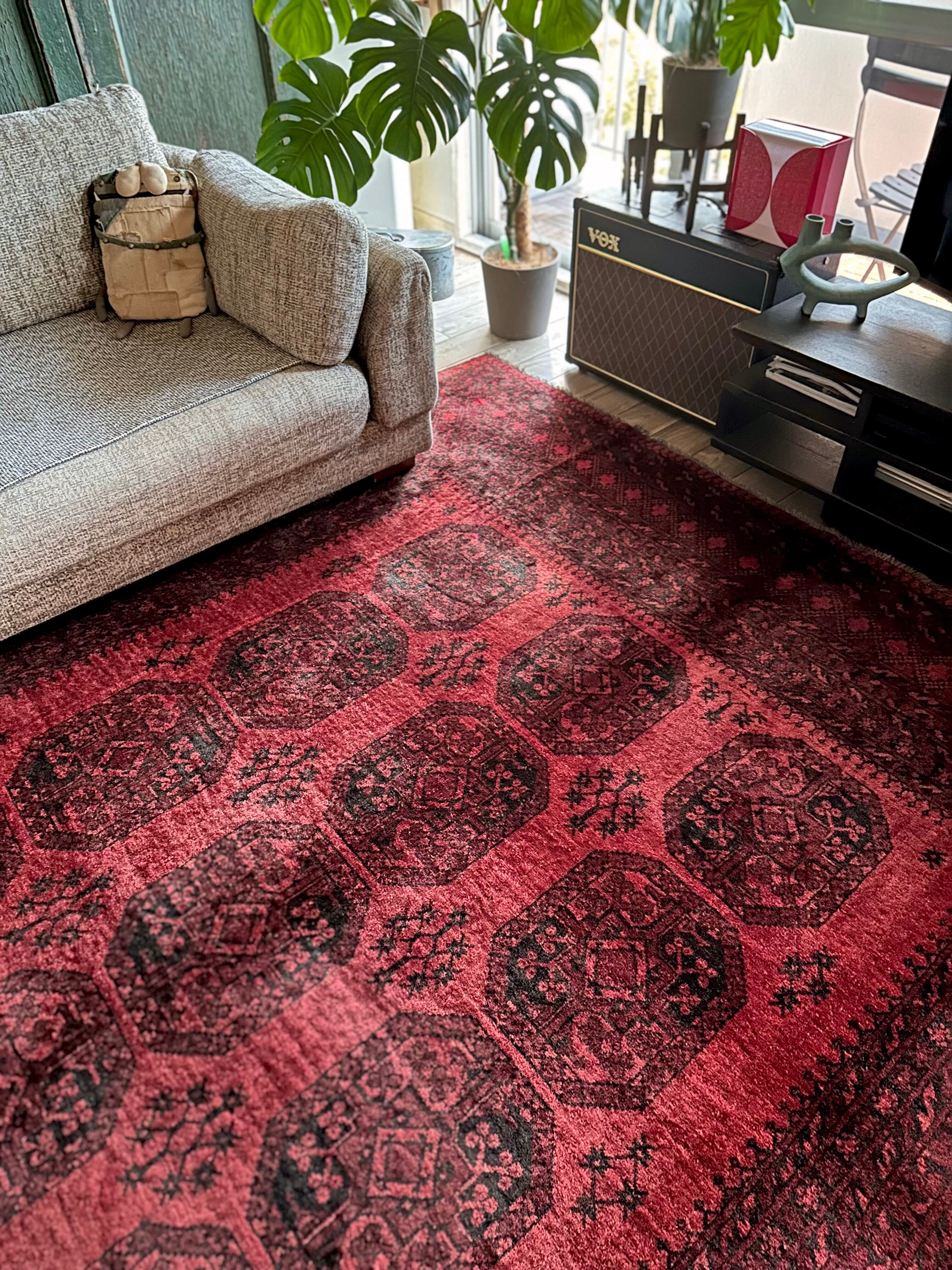 こちら見るからに特大サイズ過ぎてソファが半分乗っかるくらい、今まで仕入れたラグの中でも一番大きく、そして一番重く腰が砕けそうになりましたが、敷いてみるとやっぱりかっこいいアフガニスタン北部に居住するトルクメンの種族であるエルサリ族のトライバルラグになります。