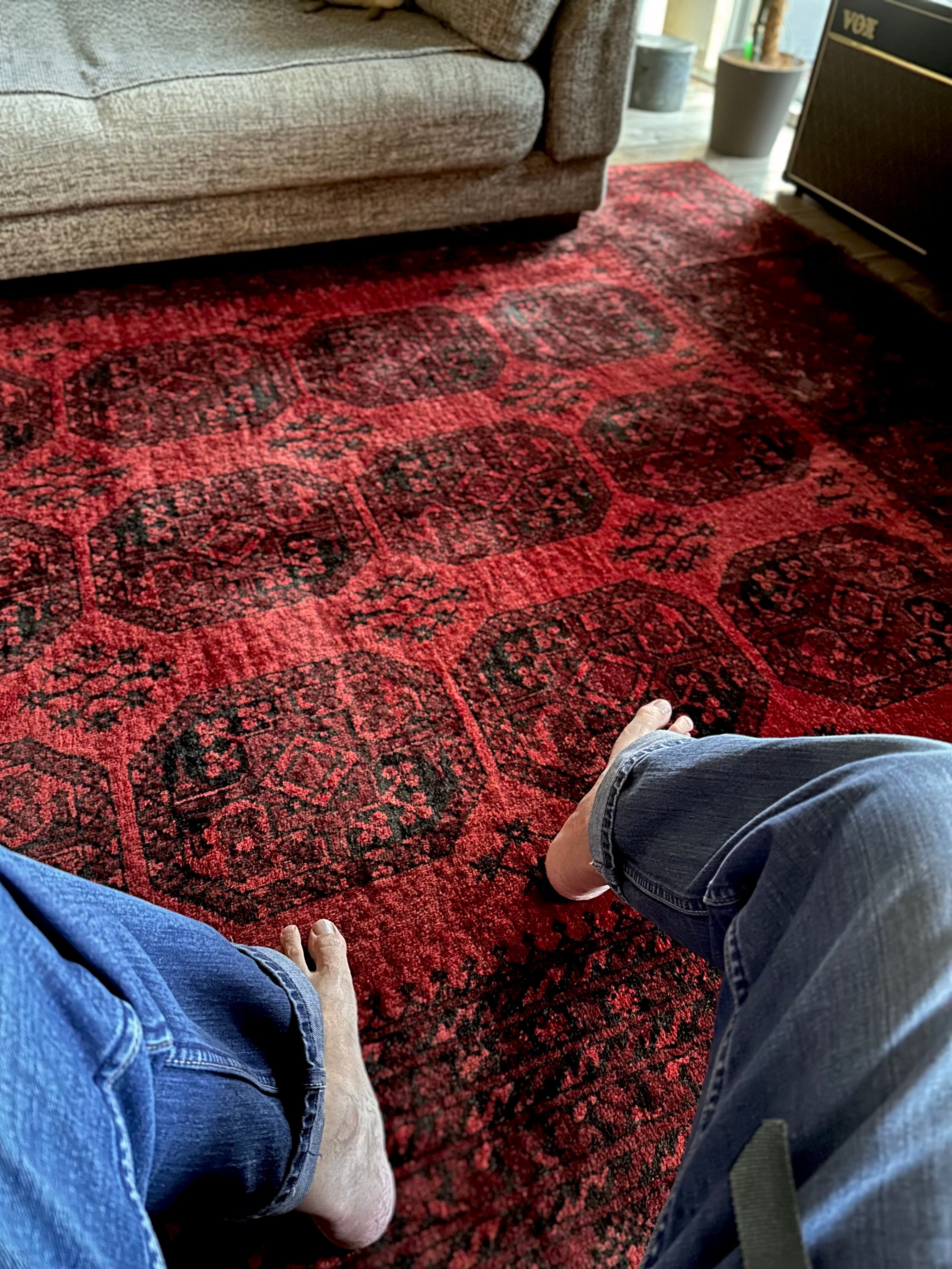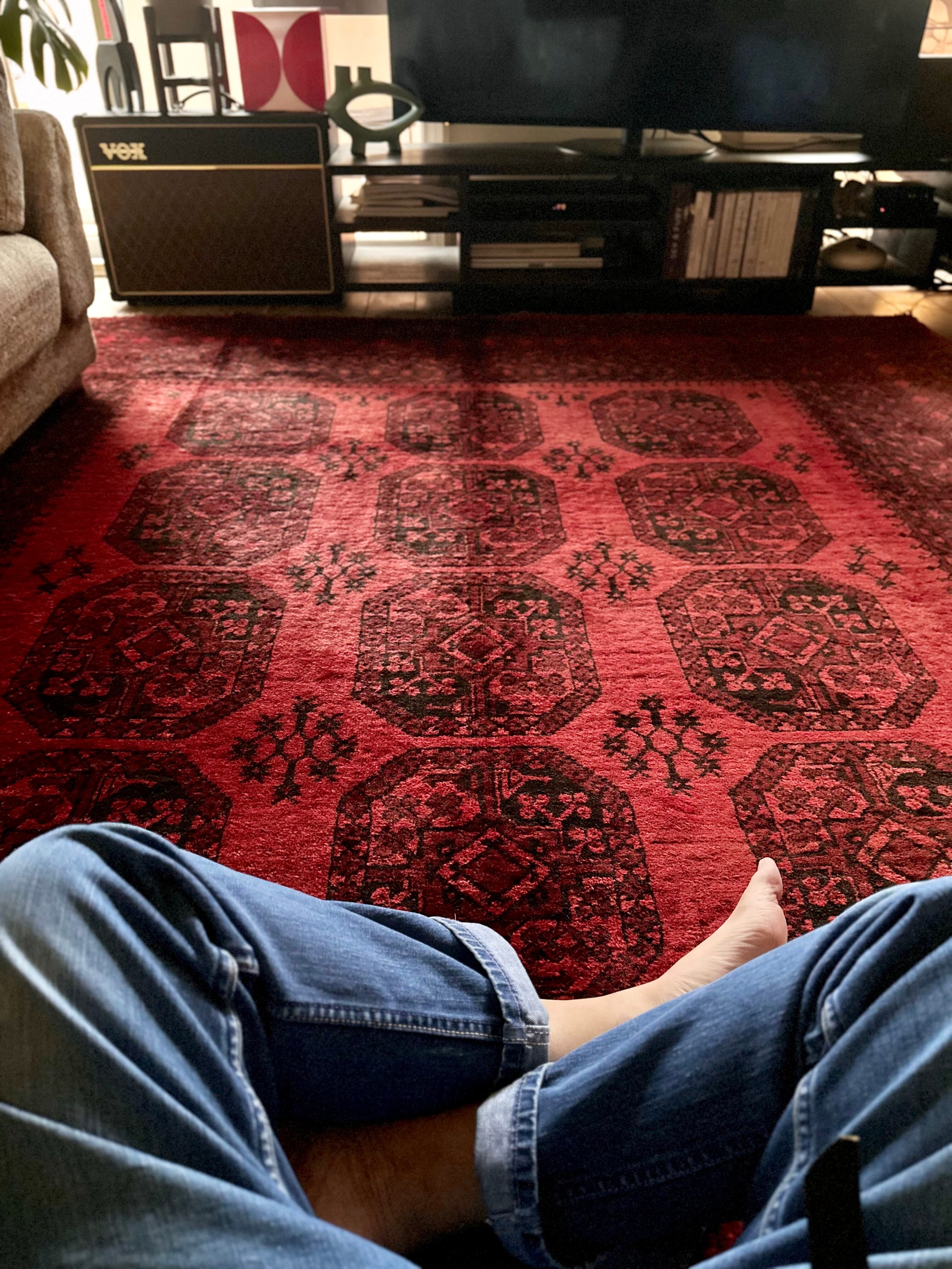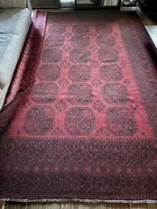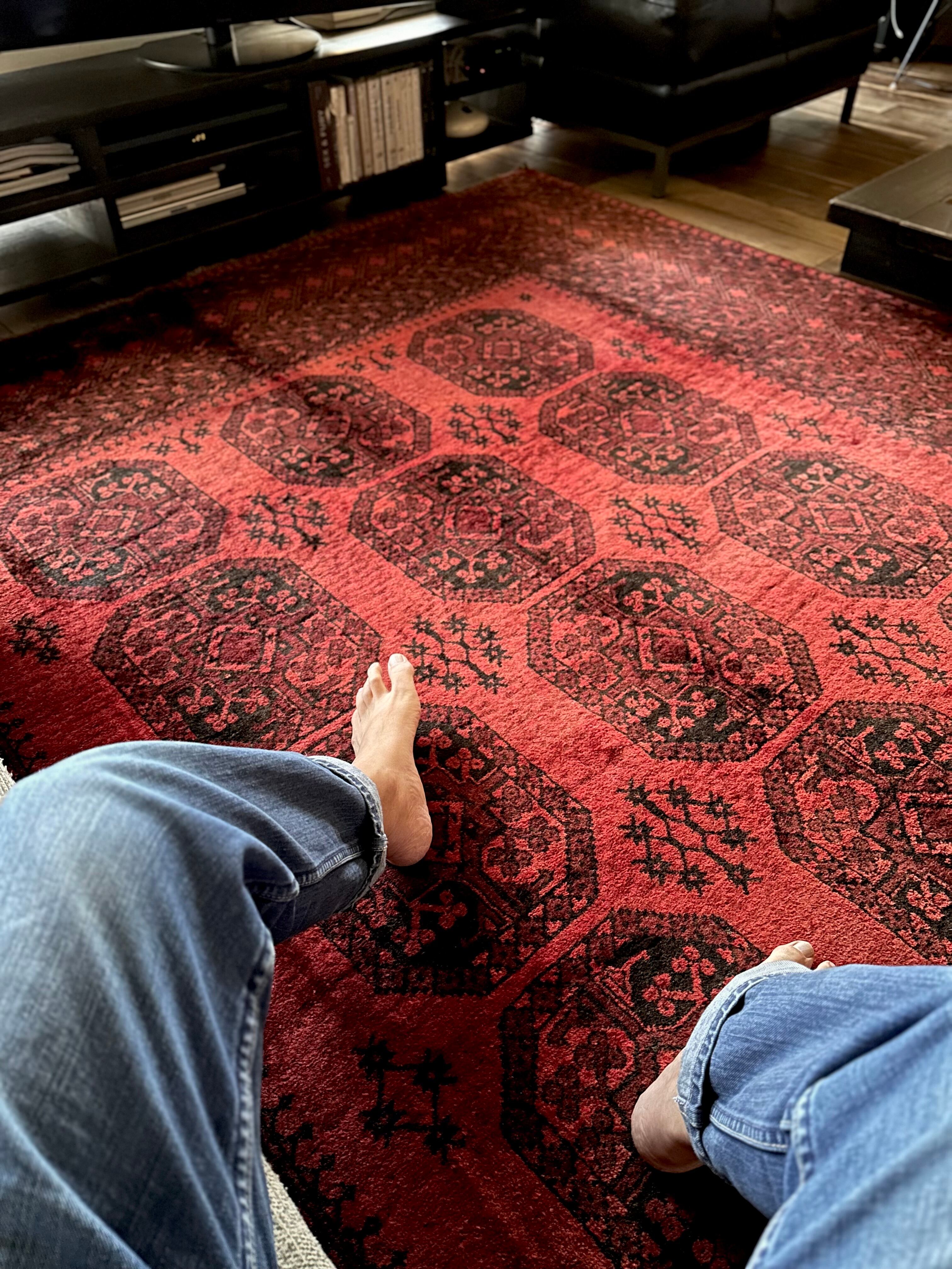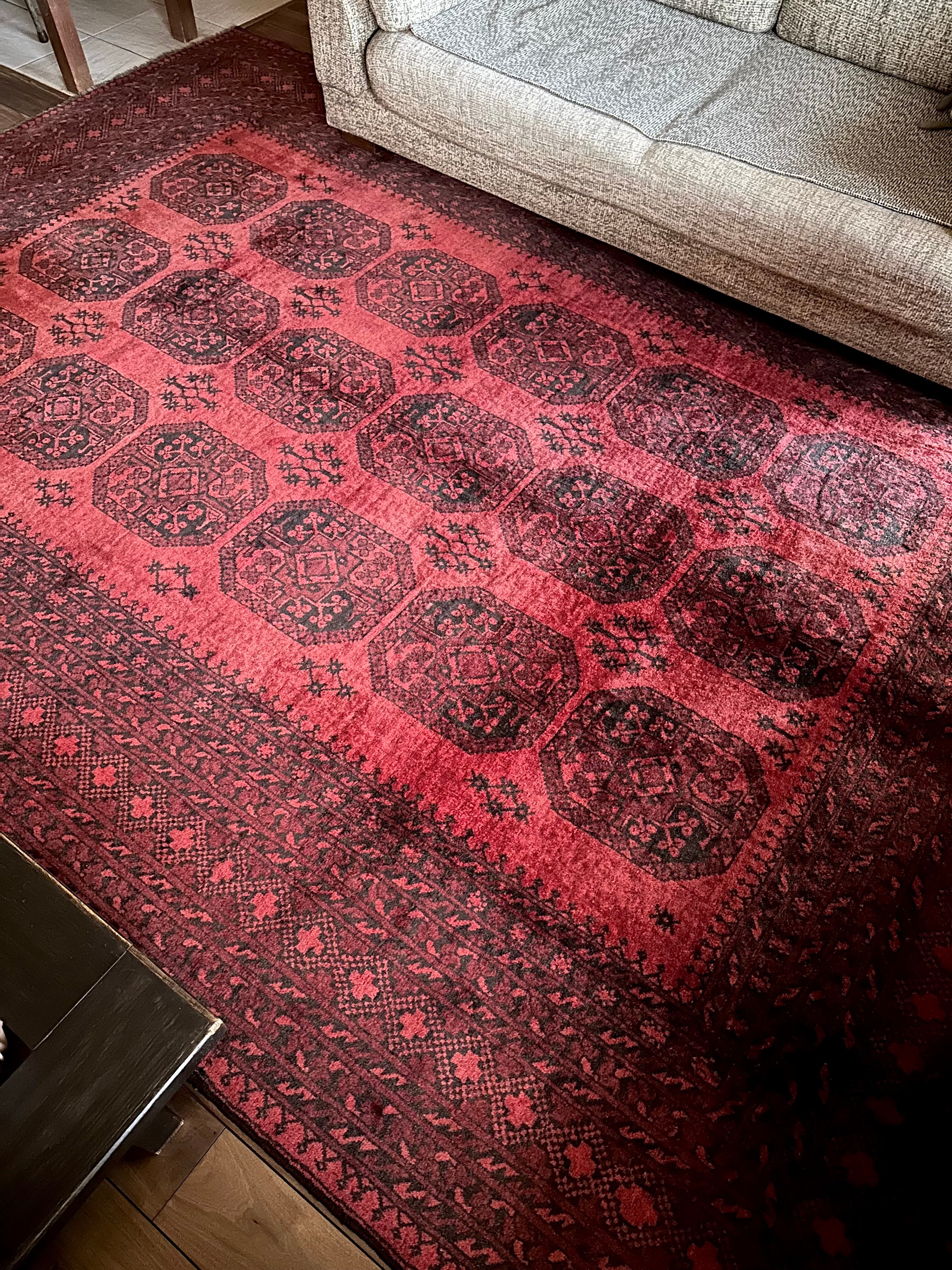 こちら見るからに特大サイズ過ぎてソファが半分乗っかるくらい、今まで仕入れたラグの中でも一番大きく、そして一番重く腰が砕けそうになりましたが、敷いてみるとやっぱりかっこいいアフガニスタン北部に居住するトルクメンの種族であるエルサリ族のトライバルラグになります。