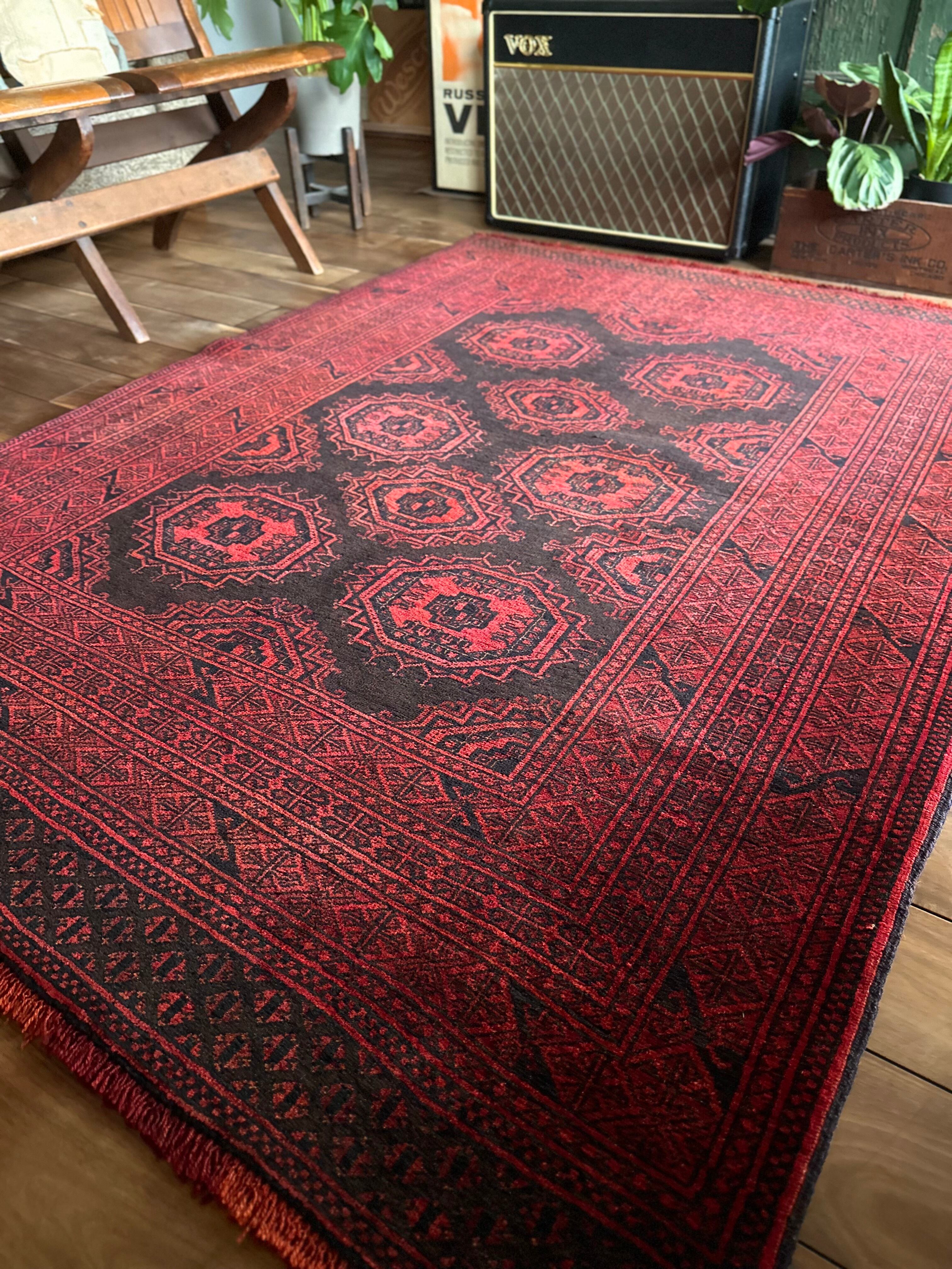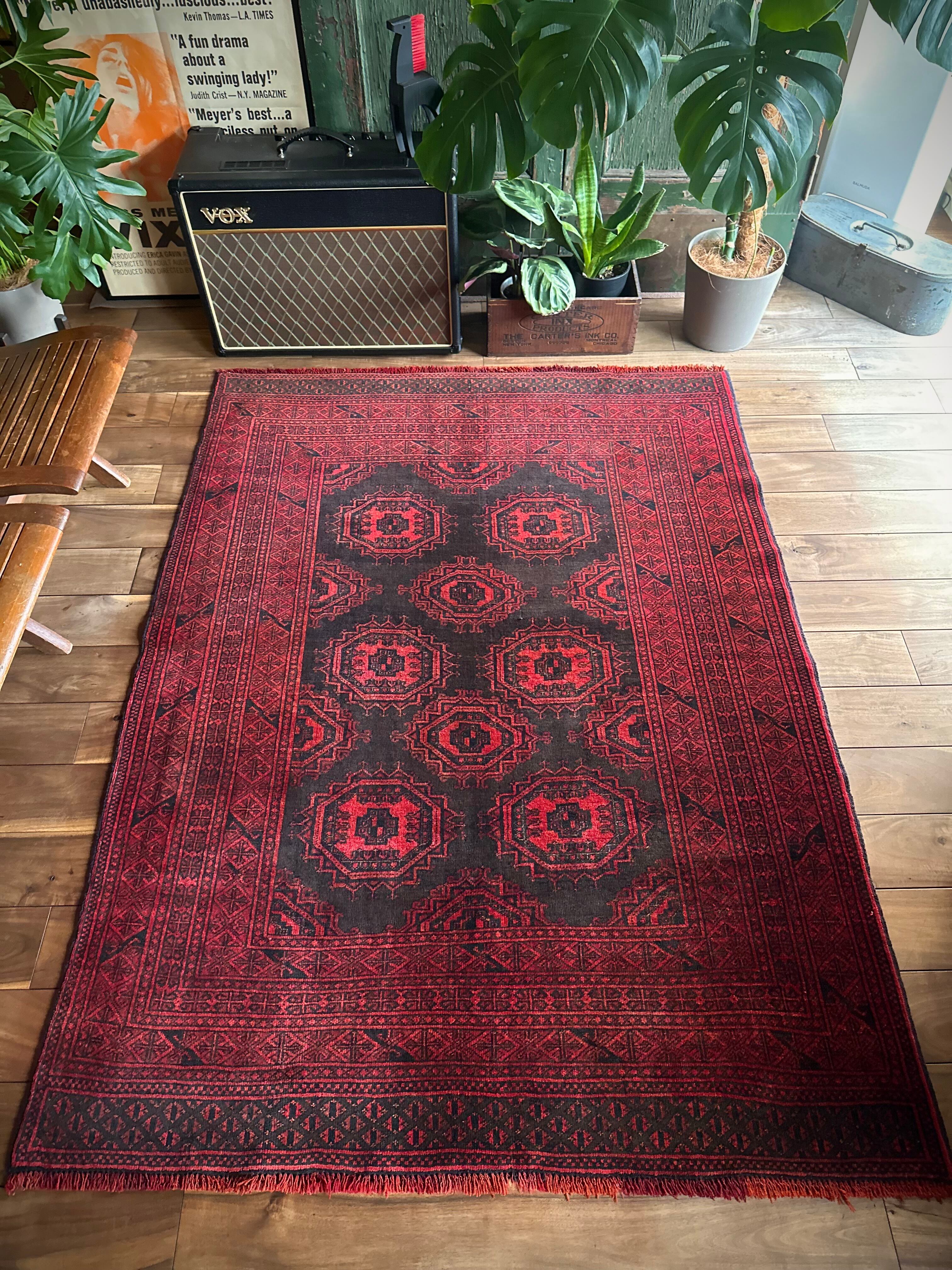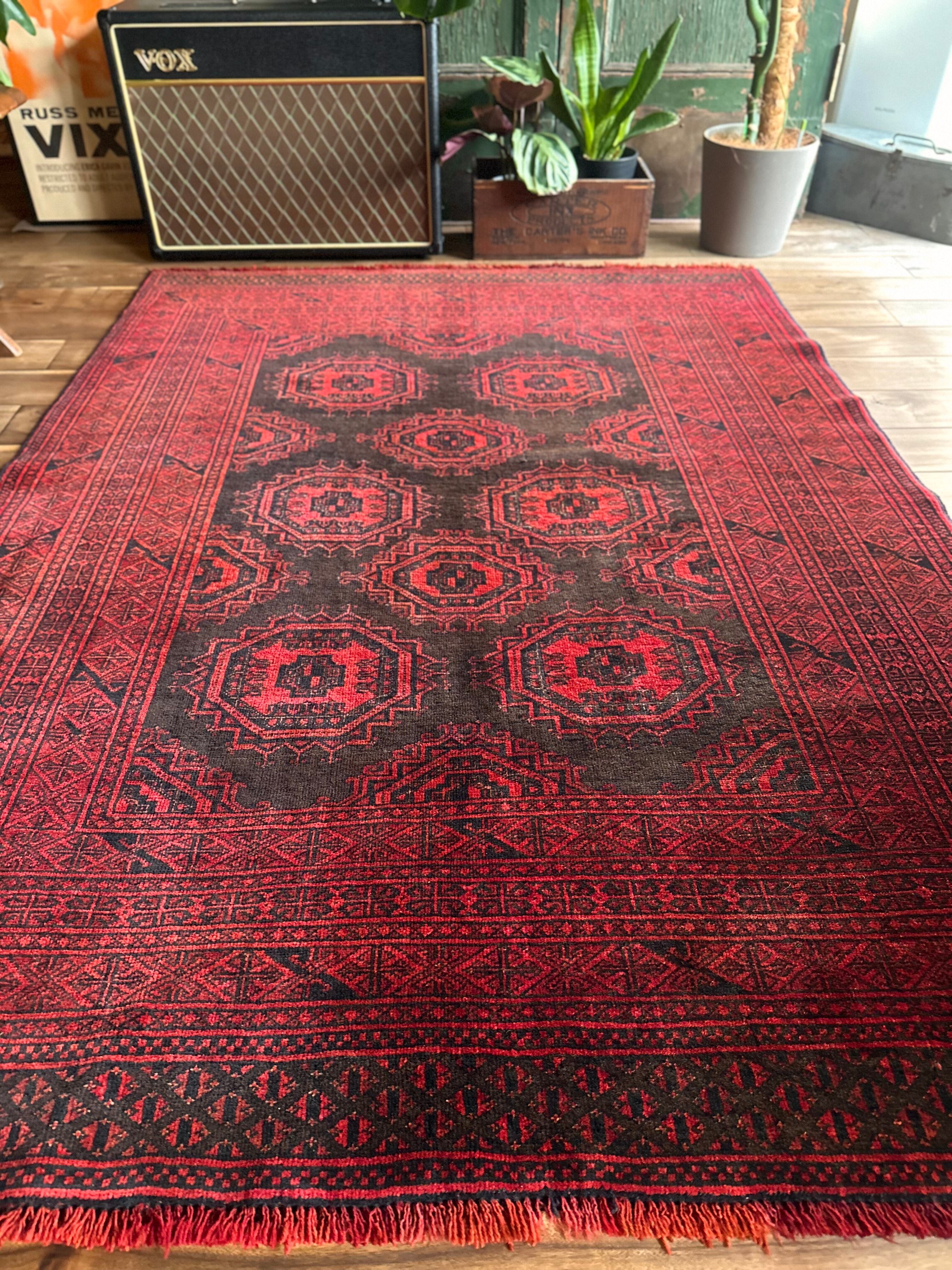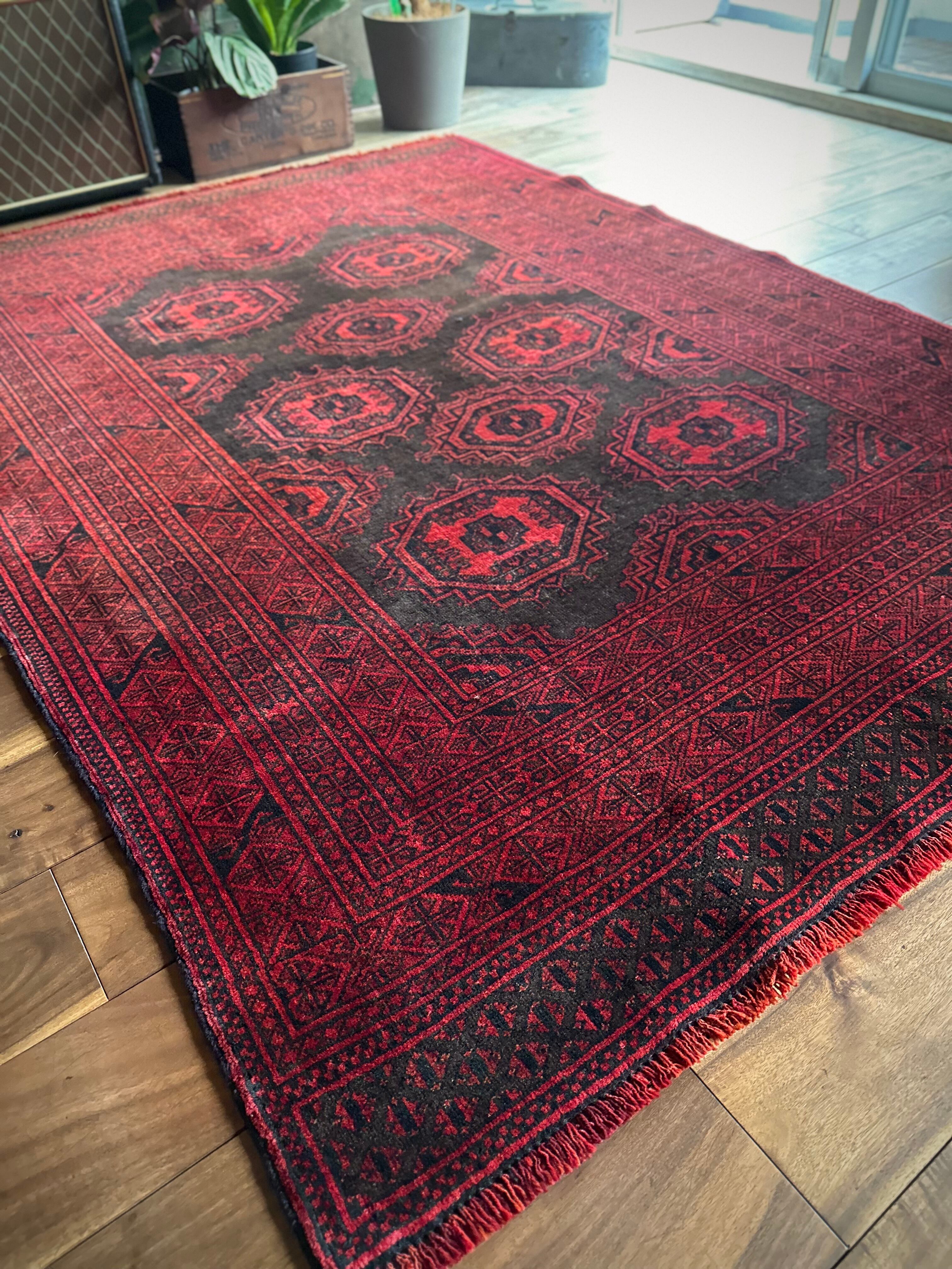 なんとも男前なブラック&レッドというシンプルな色合いが潔くてかっこいいミディアム・サイズの1枚で、アフガニスタン北部のジョウズジャーン州に居住する、赤い絨毯の代名詞でもあるトルクメン族のトライバルラグになります。