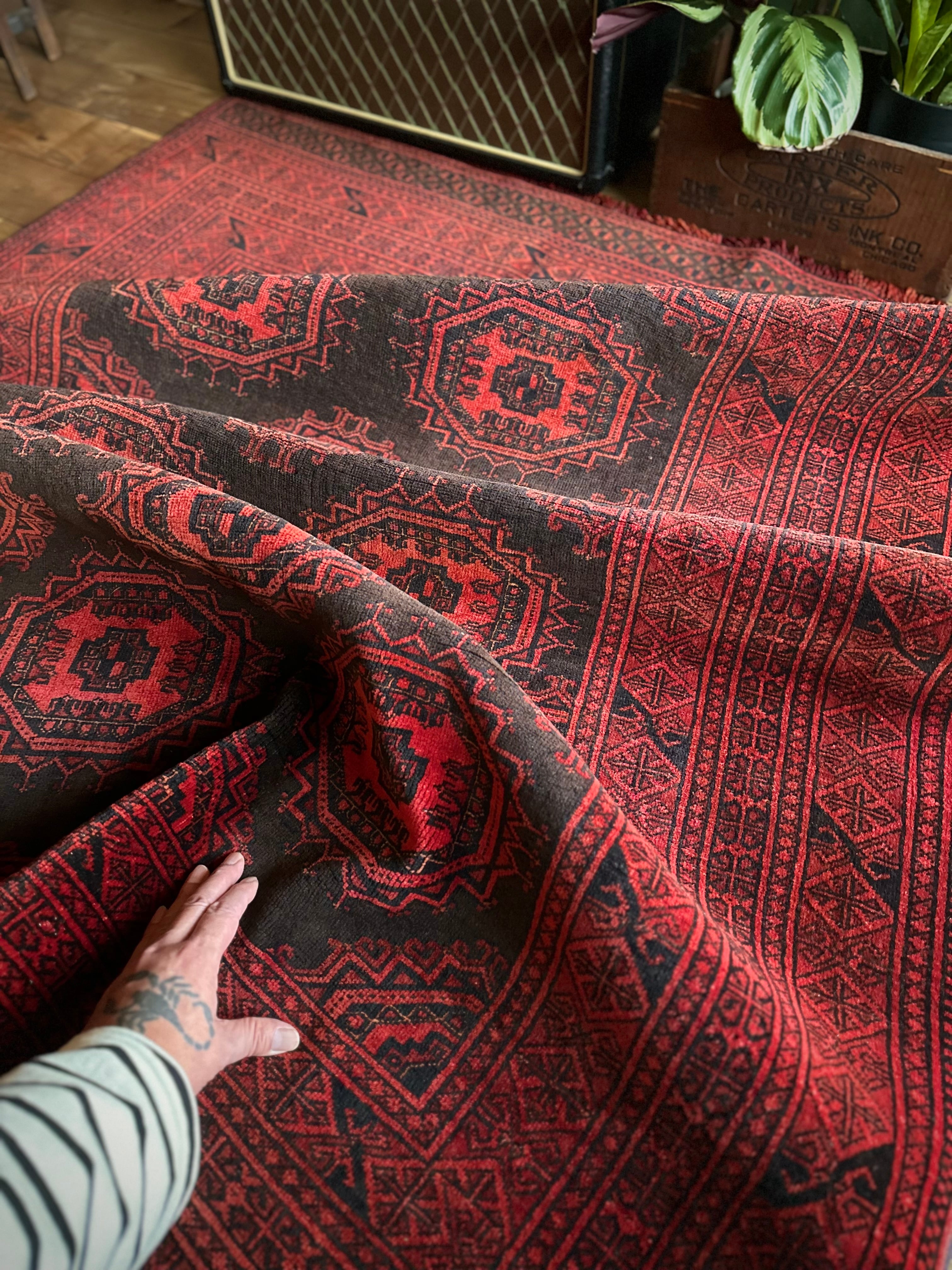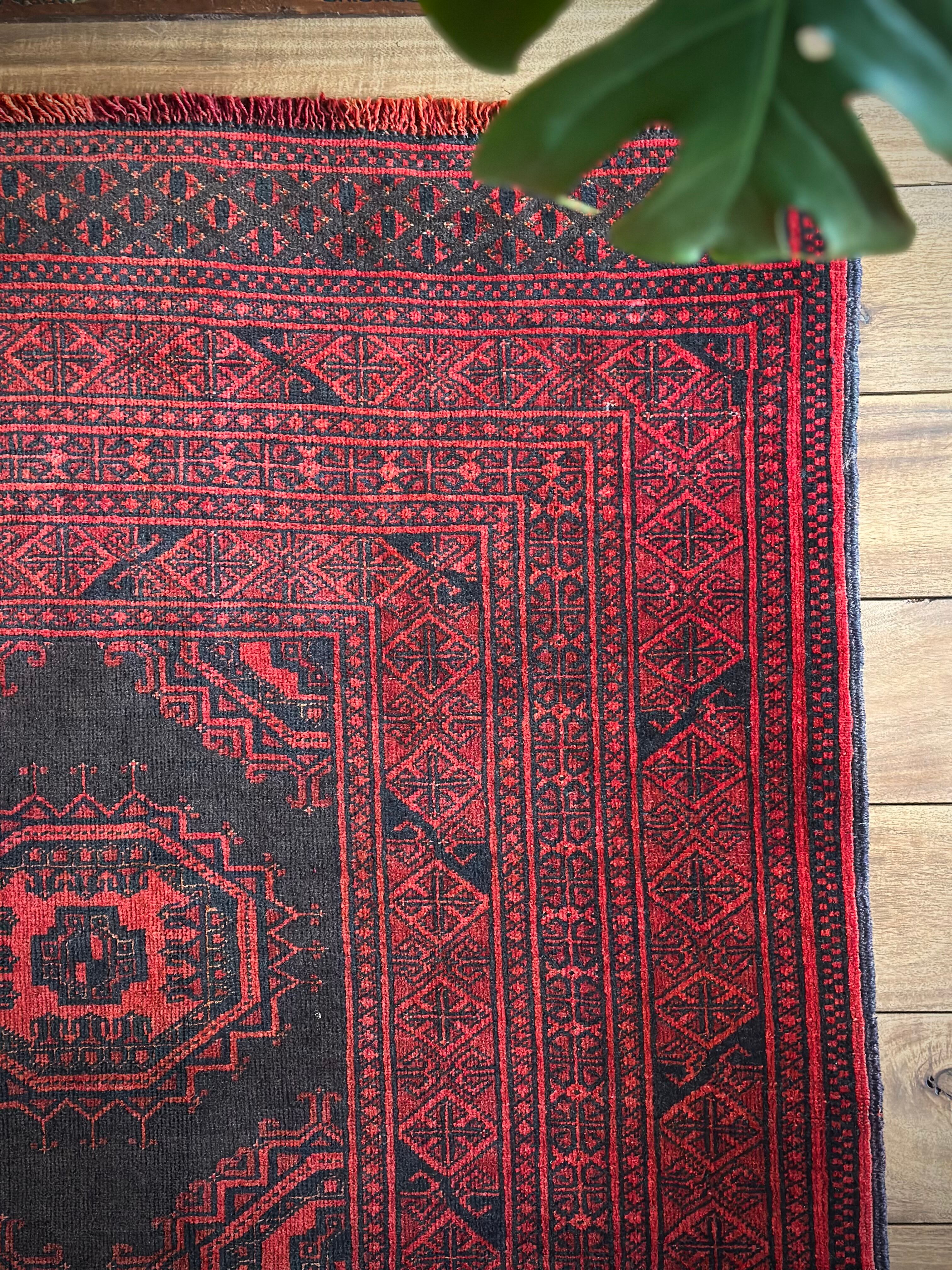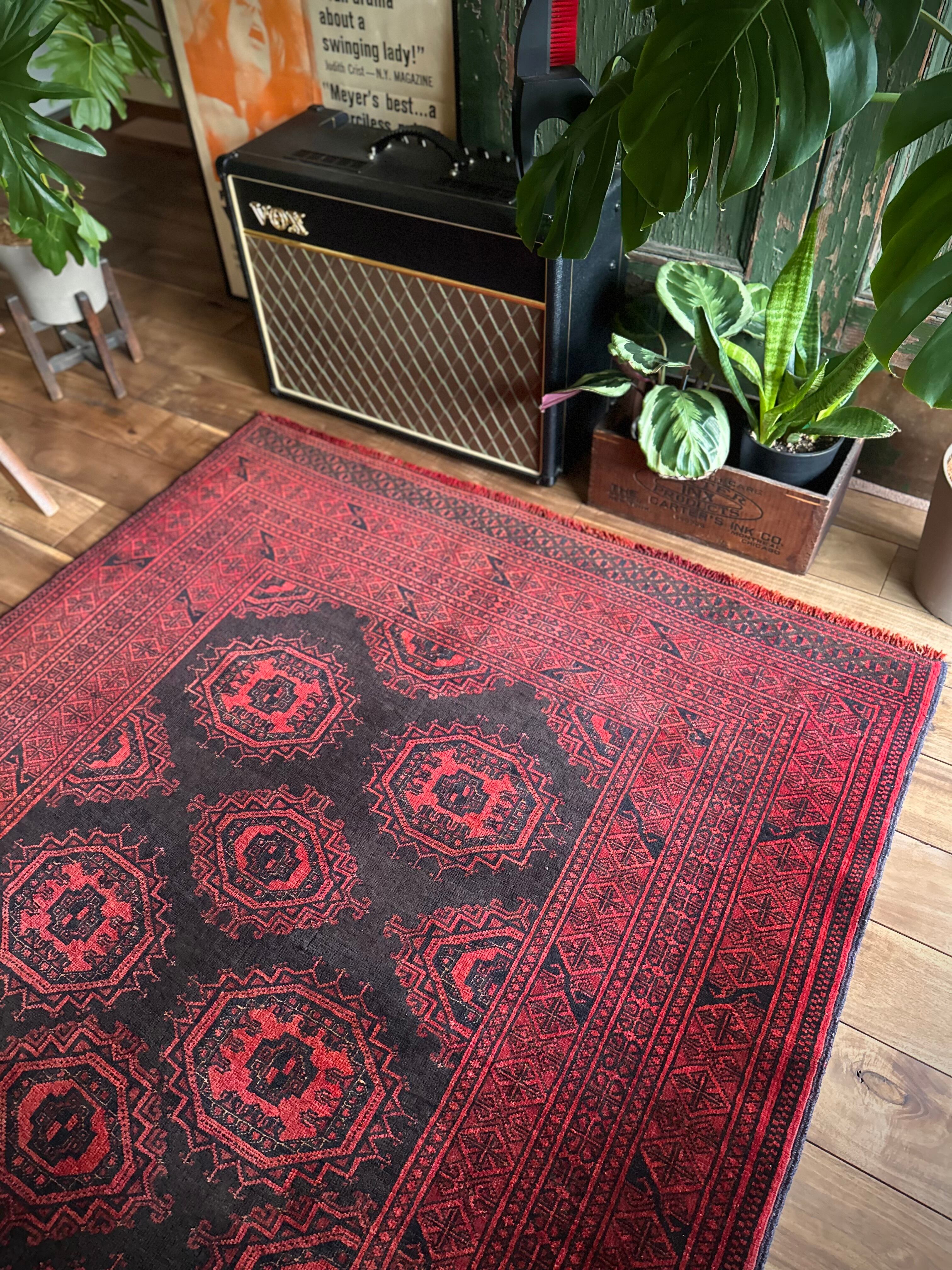 なんとも男前なブラック&レッドというシンプルな色合いが潔くてかっこいいミディアム・サイズの1枚で、アフガニスタン北部のジョウズジャーン州に居住する、赤い絨毯の代名詞でもあるトルクメン族のトライバルラグになります。