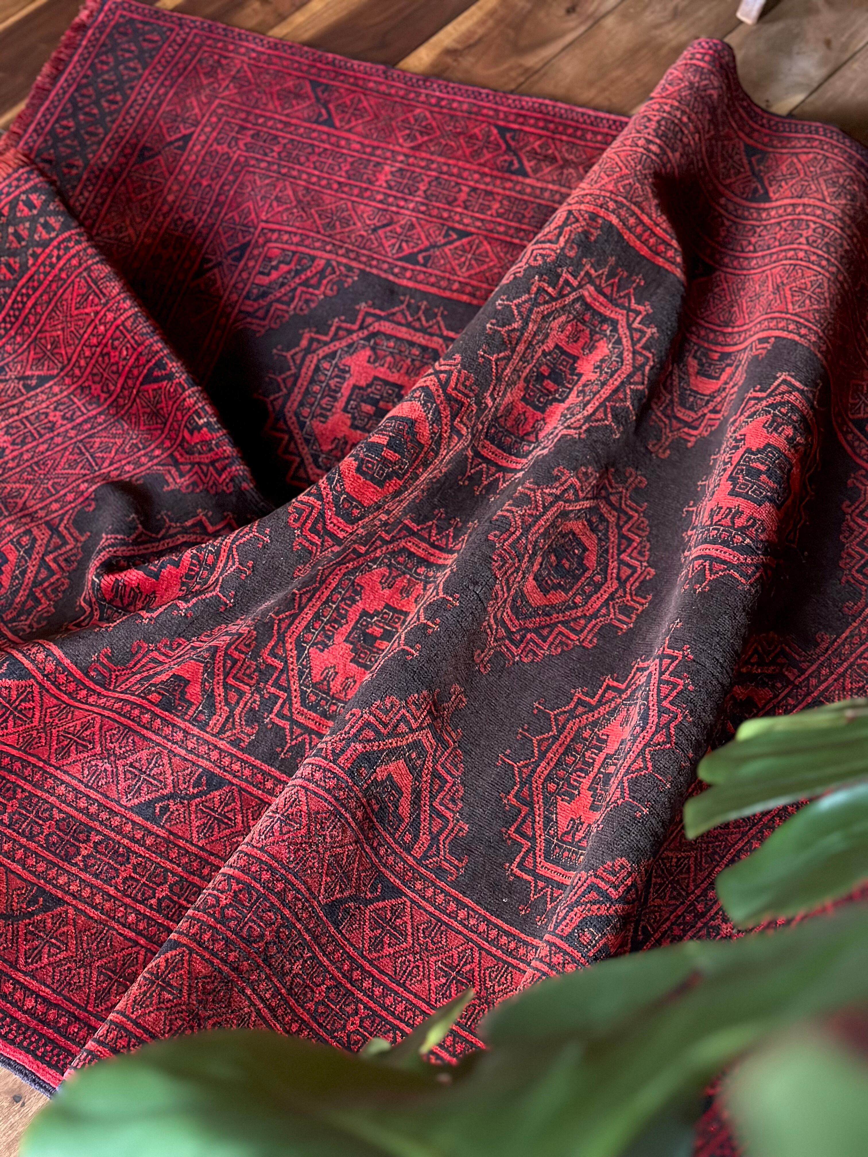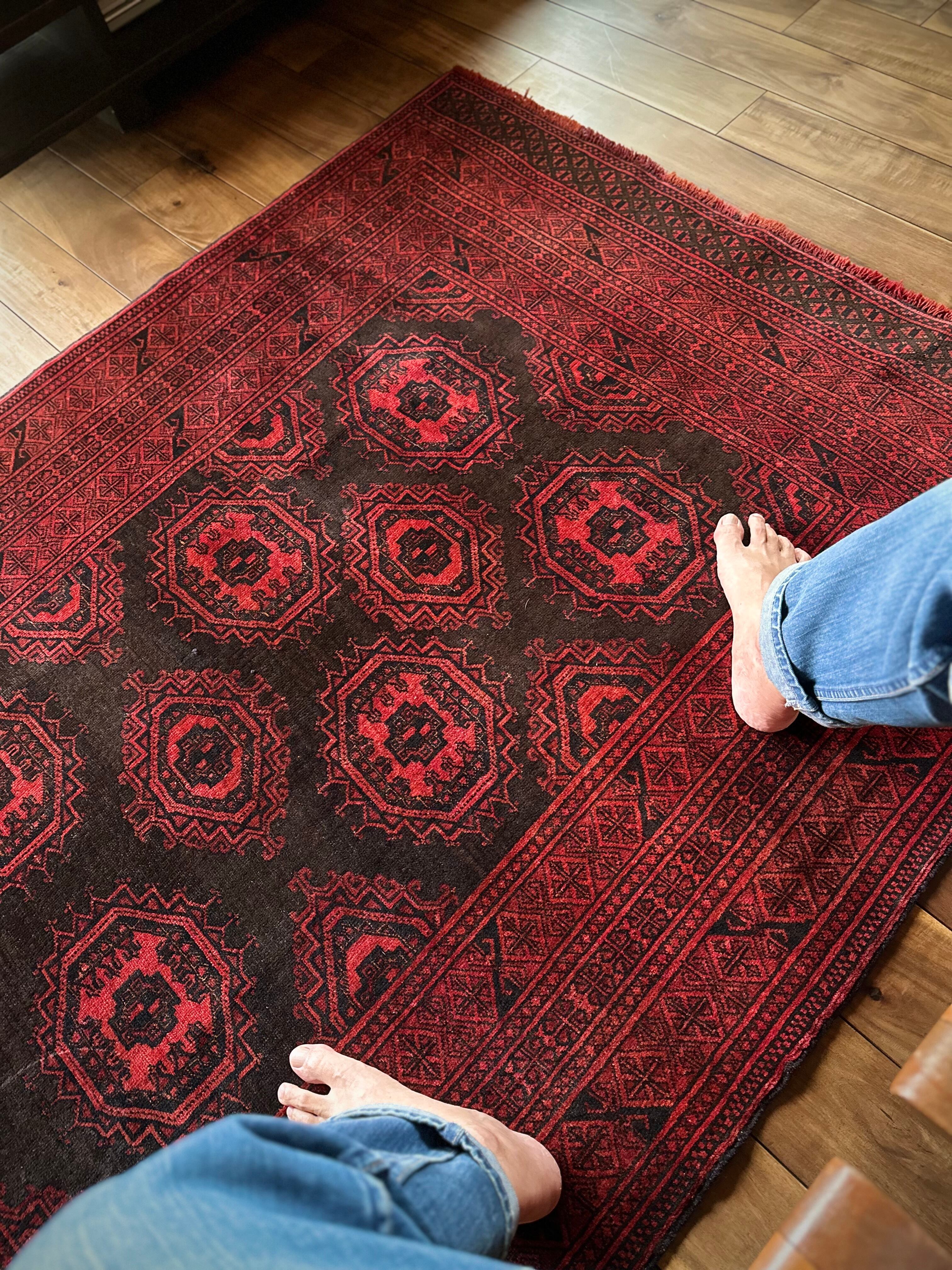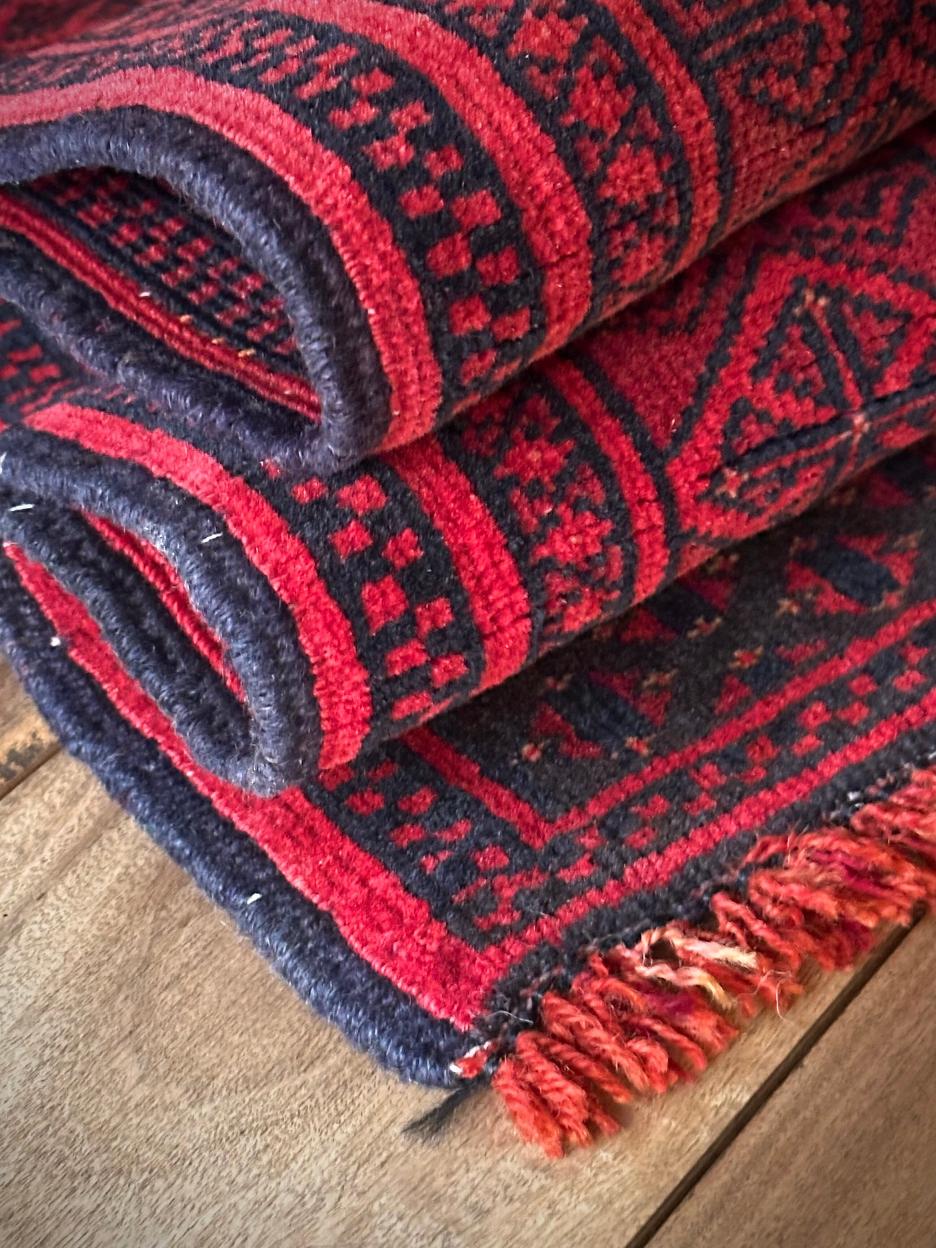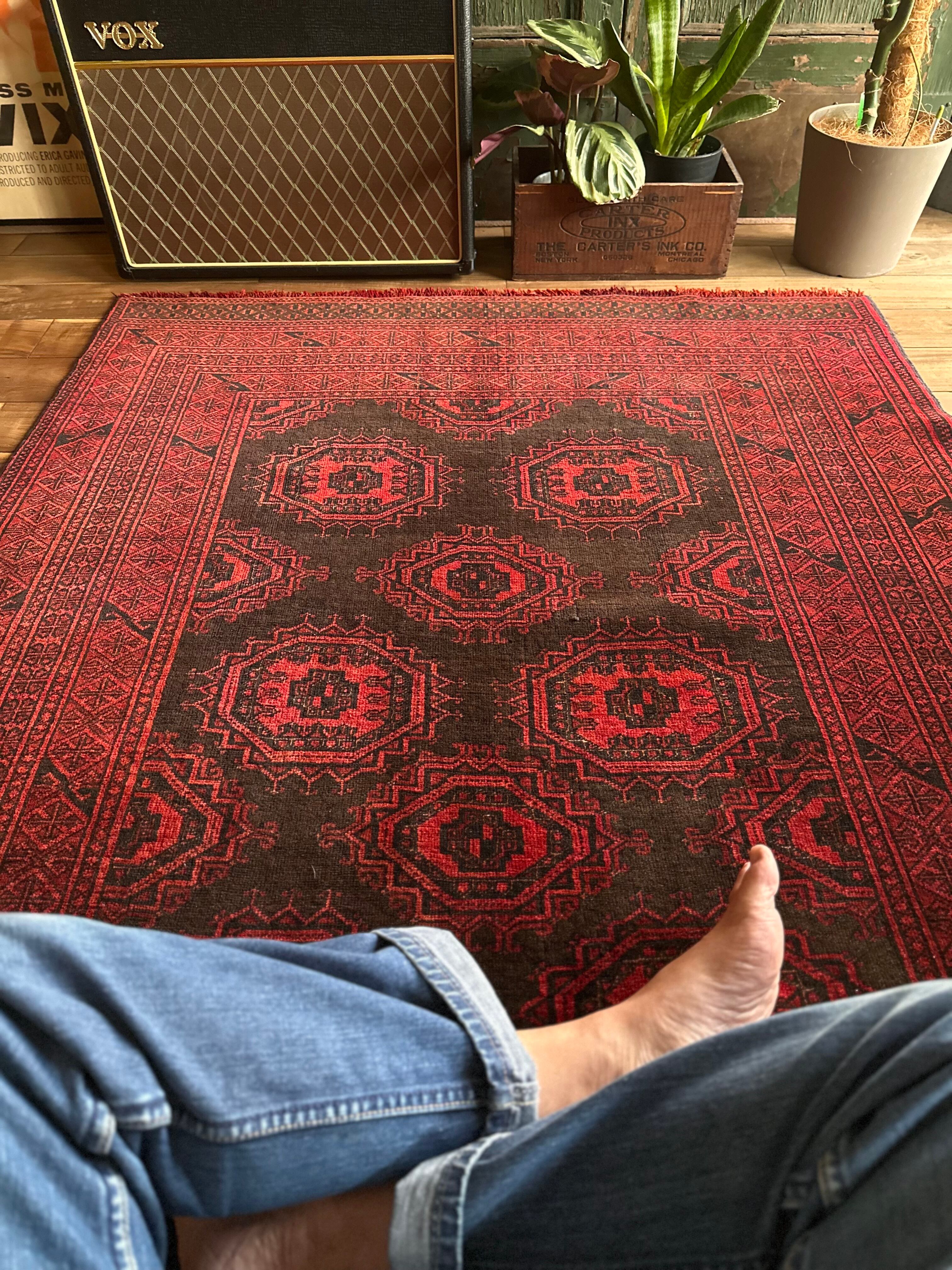 なんとも男前なブラック&レッドというシンプルな色合いが潔くてかっこいいミディアム・サイズの1枚で、アフガニスタン北部のジョウズジャーン州に居住する、赤い絨毯の代名詞でもあるトルクメン族のトライバルラグになります。