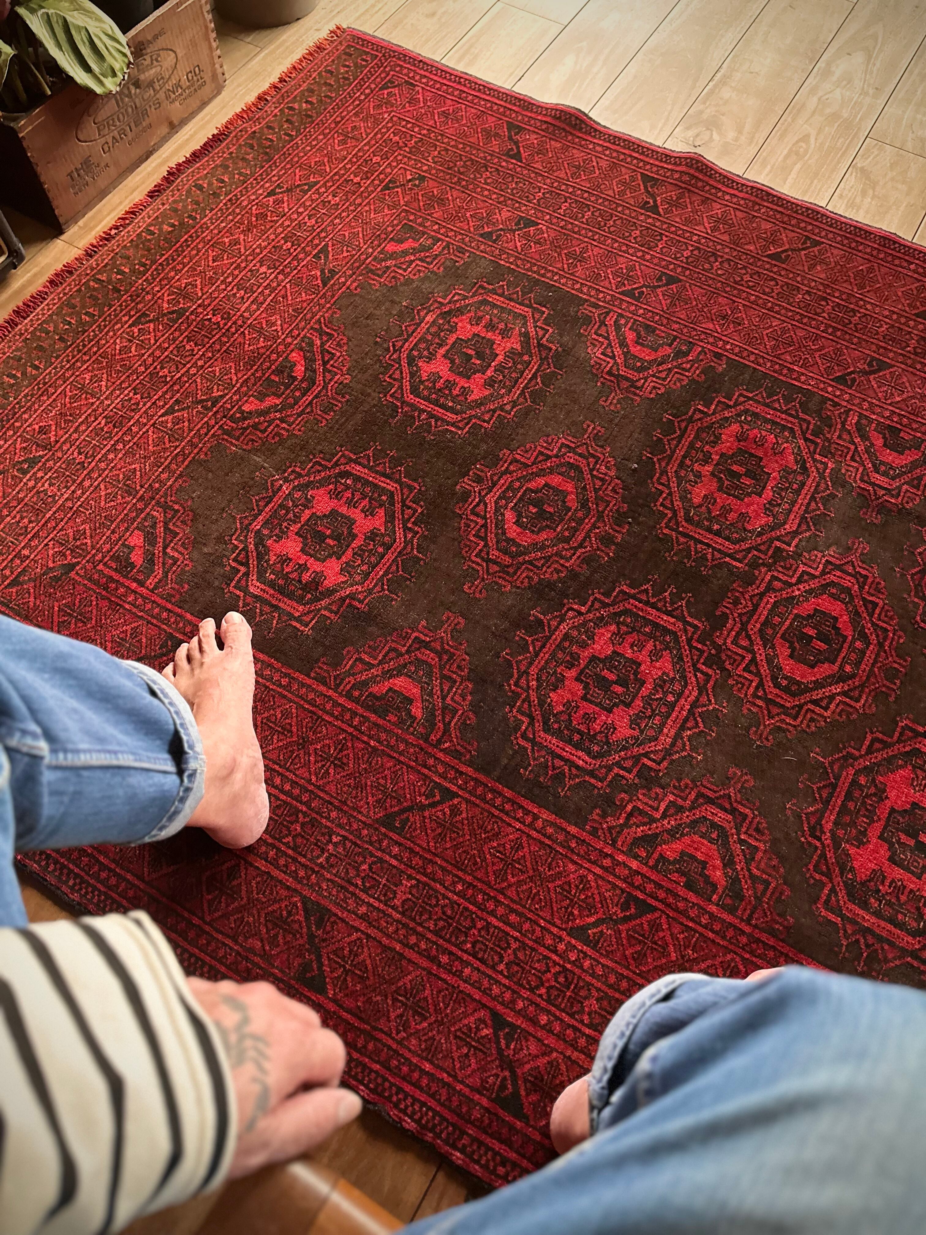 最後にラグそのものに関しては羊毛特有の匂いがあり、採寸は中央付近で計測していますが、手織りならではの歪みによる誤差や水洗いクリーニングによる縮み、また草木染めによる経年劣化の色ムラなどがありますが、それもまたヴィンテージラグの魅力かとご理解ください。