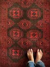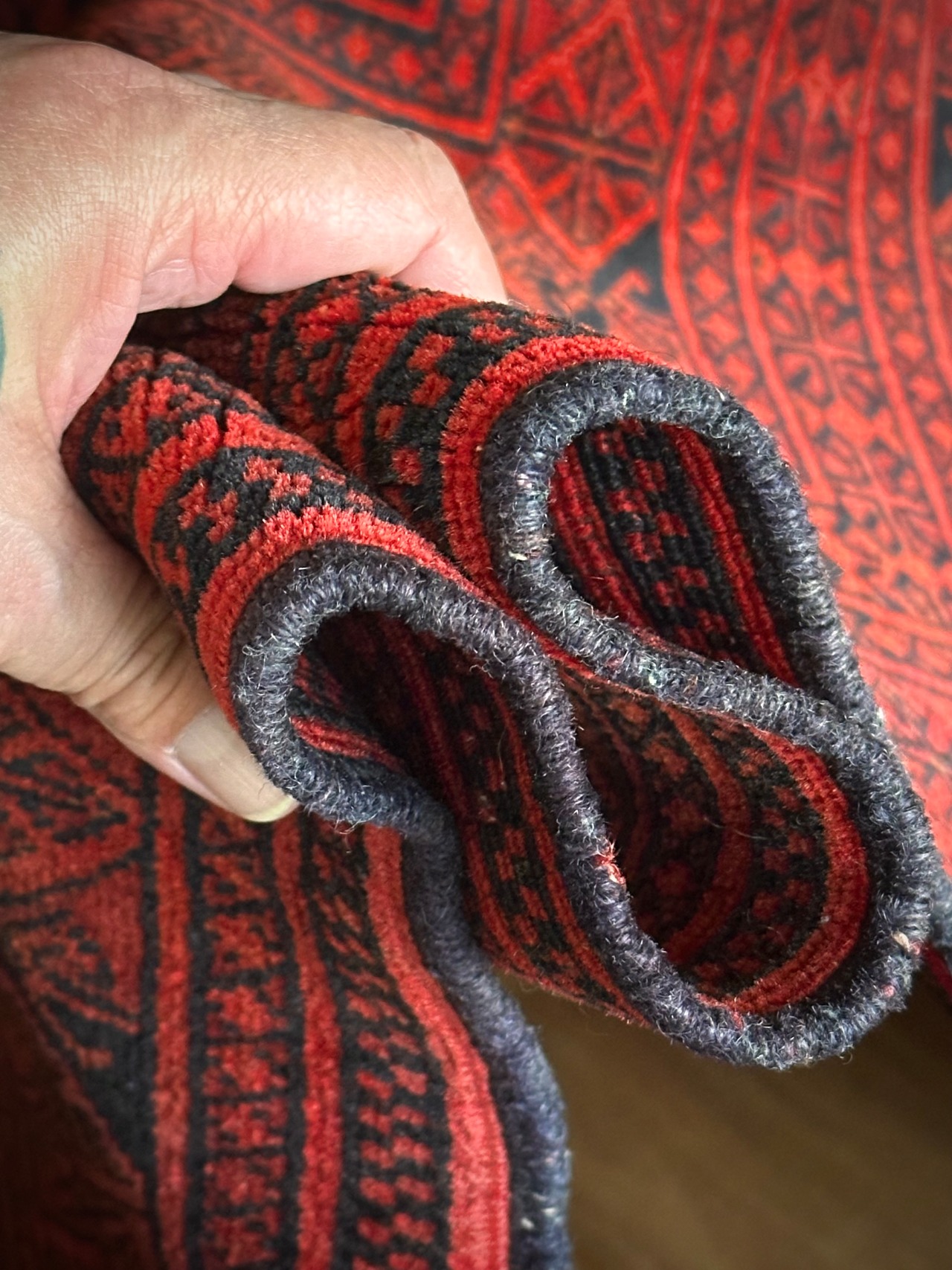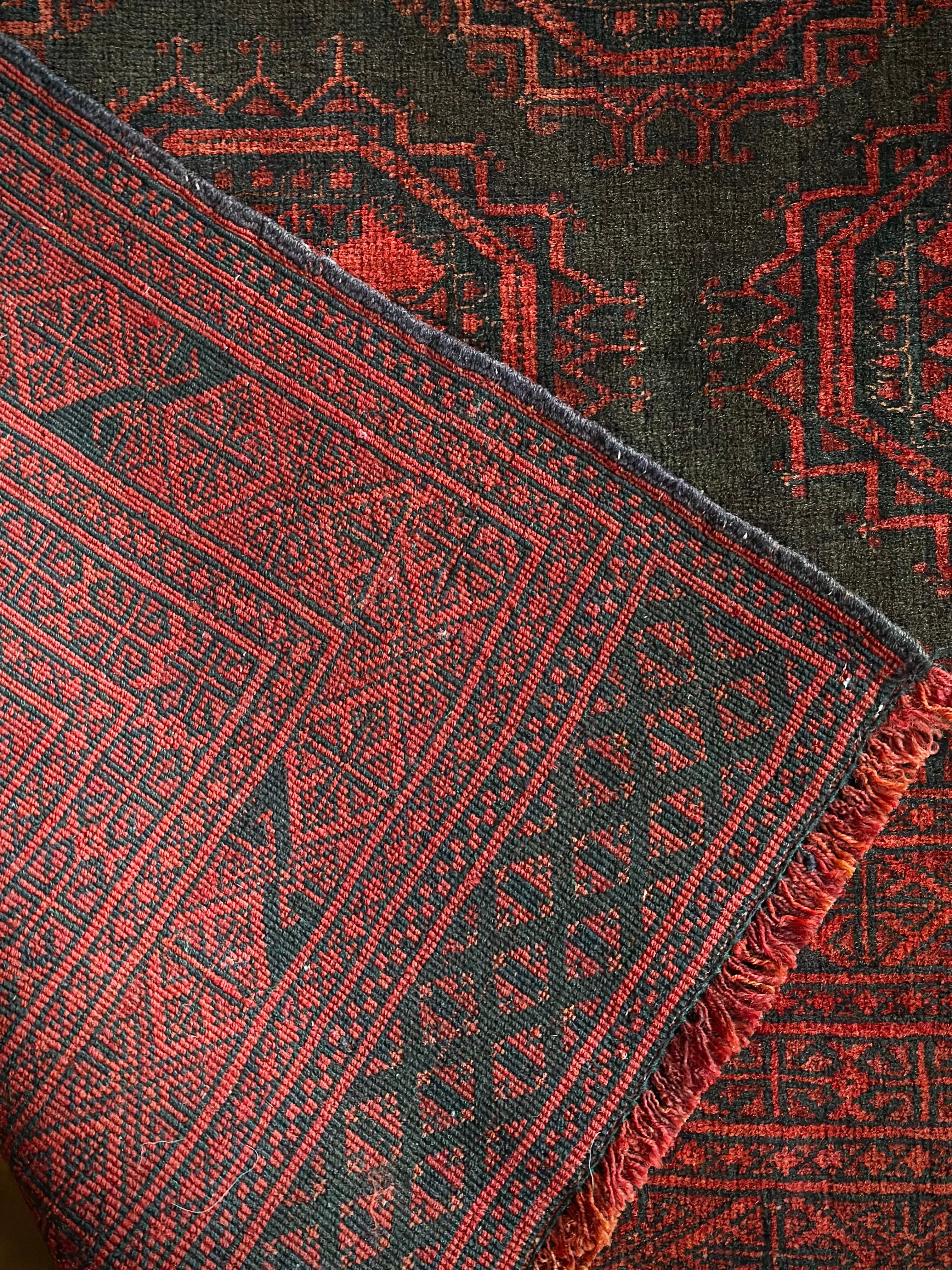 中央のフィールド部分には装飾具をモチーフとしたサロールギュルの連続紋様が記されていて、アフガニスタンではサルーク支族とも認識されていますが、ボーダーの細かなミルフィーユ状の模様もかっこよく、この幅のある絶妙なサイズ感がありそうで無い1枚でしょうか。