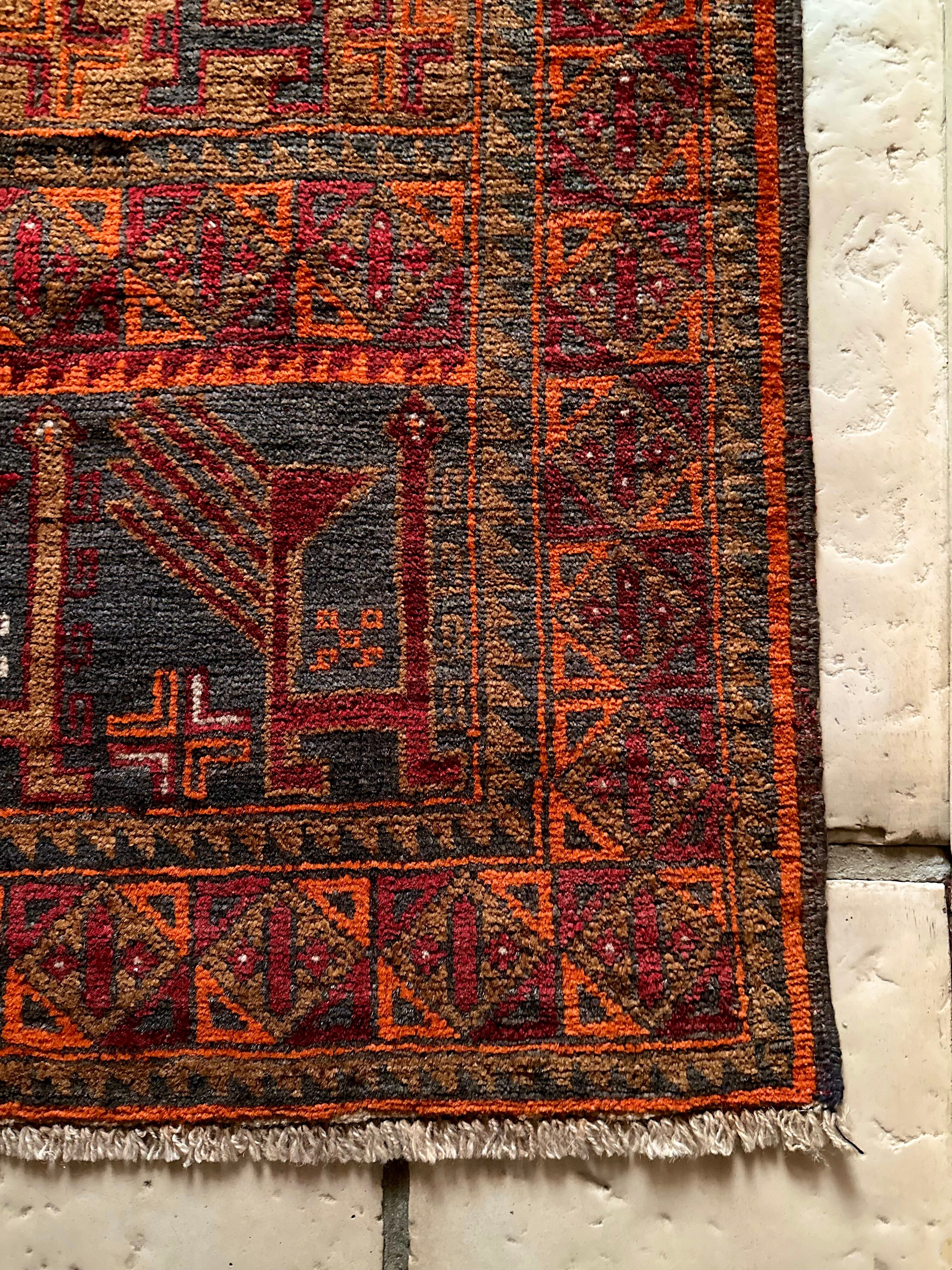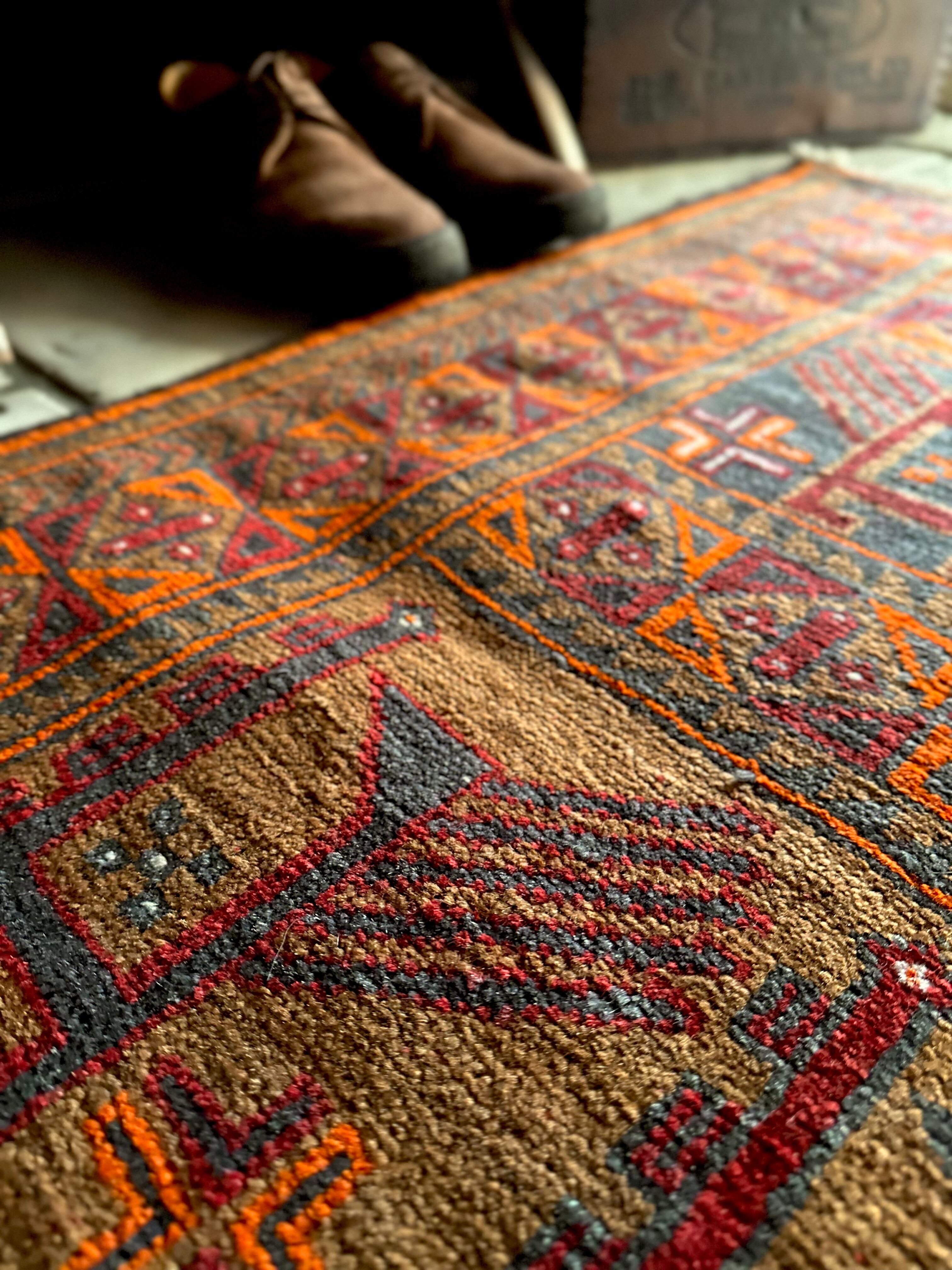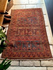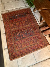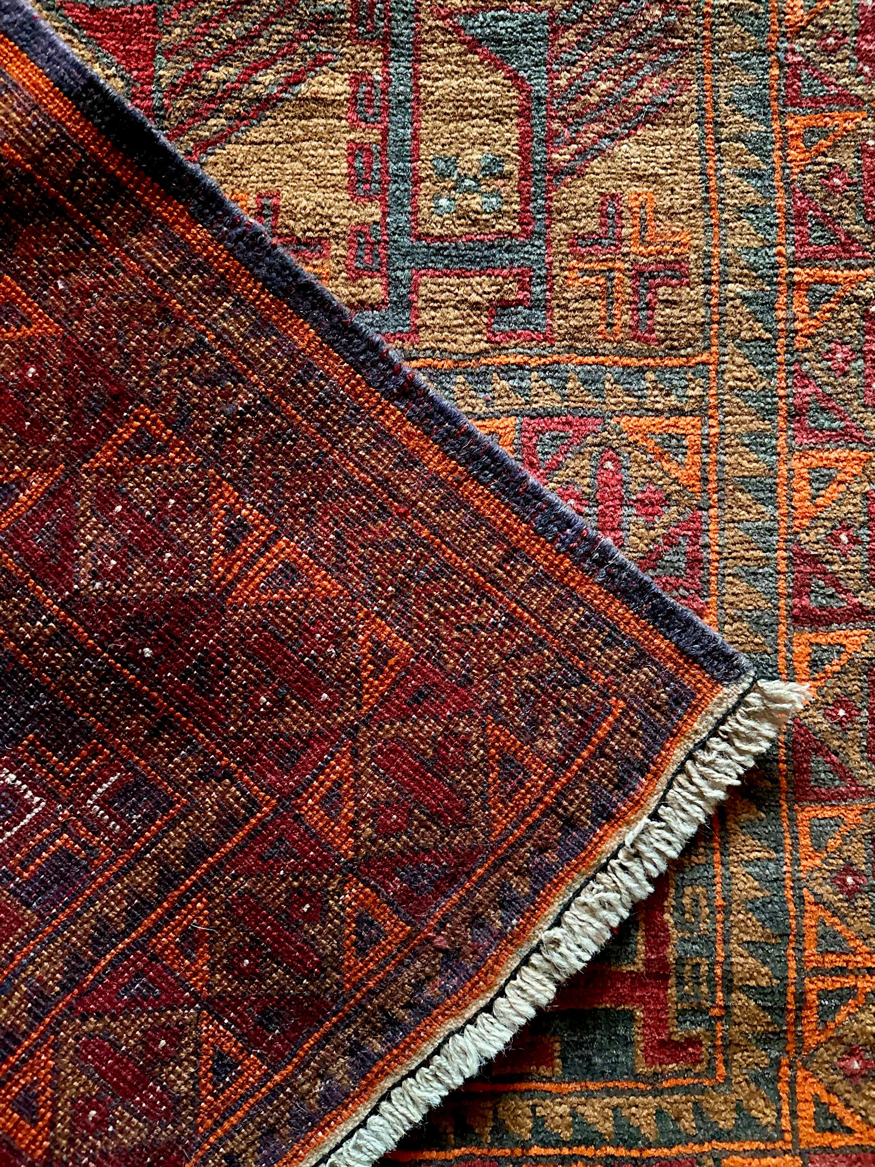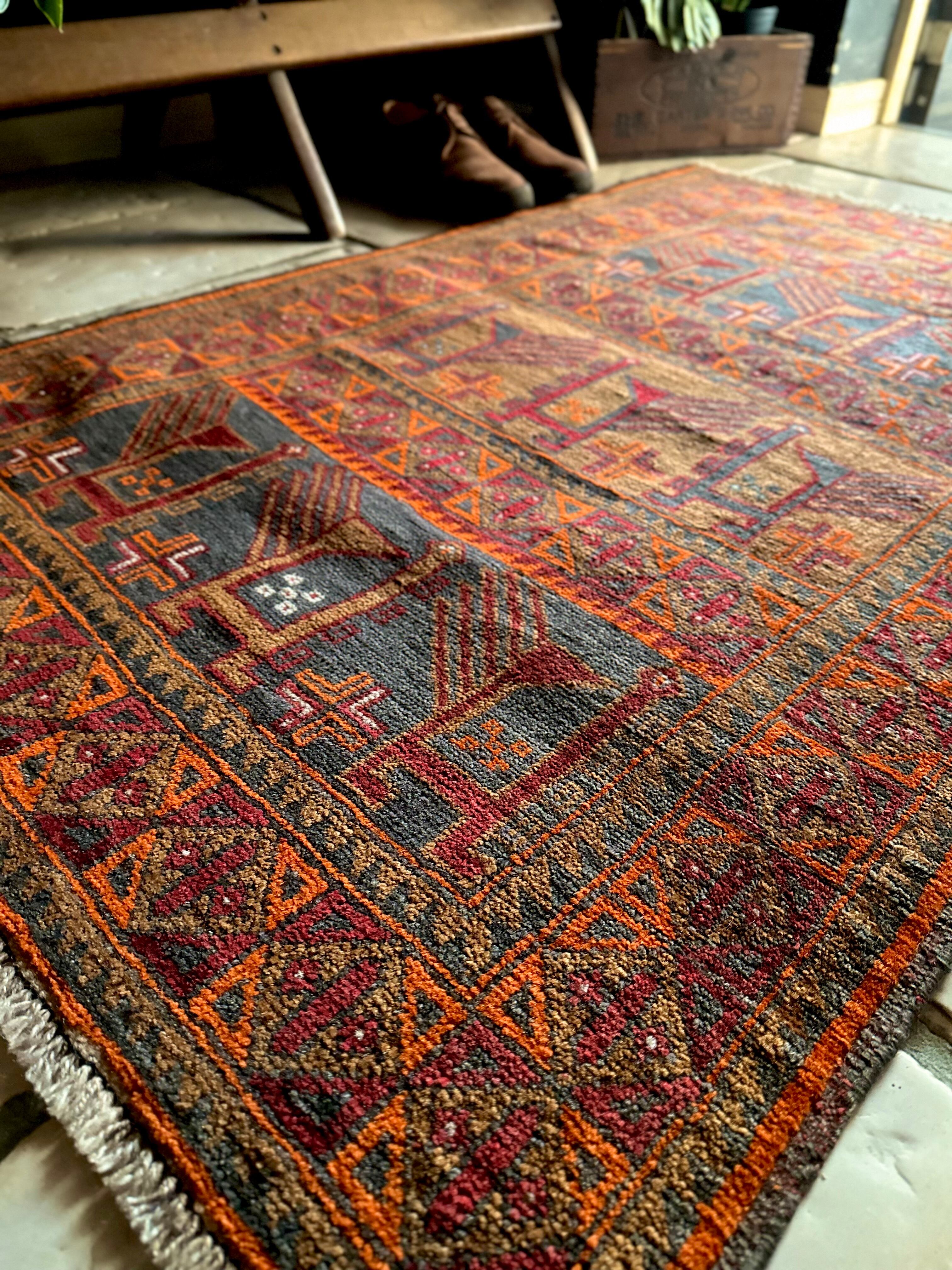 カフェオレ・ベースにオレンジとレッドが映える壁画っぽい絵柄のこちらは、アフガニスタン北部のバグラーン州に居住するパシュトゥーン人によるアリホジャと呼ばれるトルクメン族系譜のトライバルラグになります。