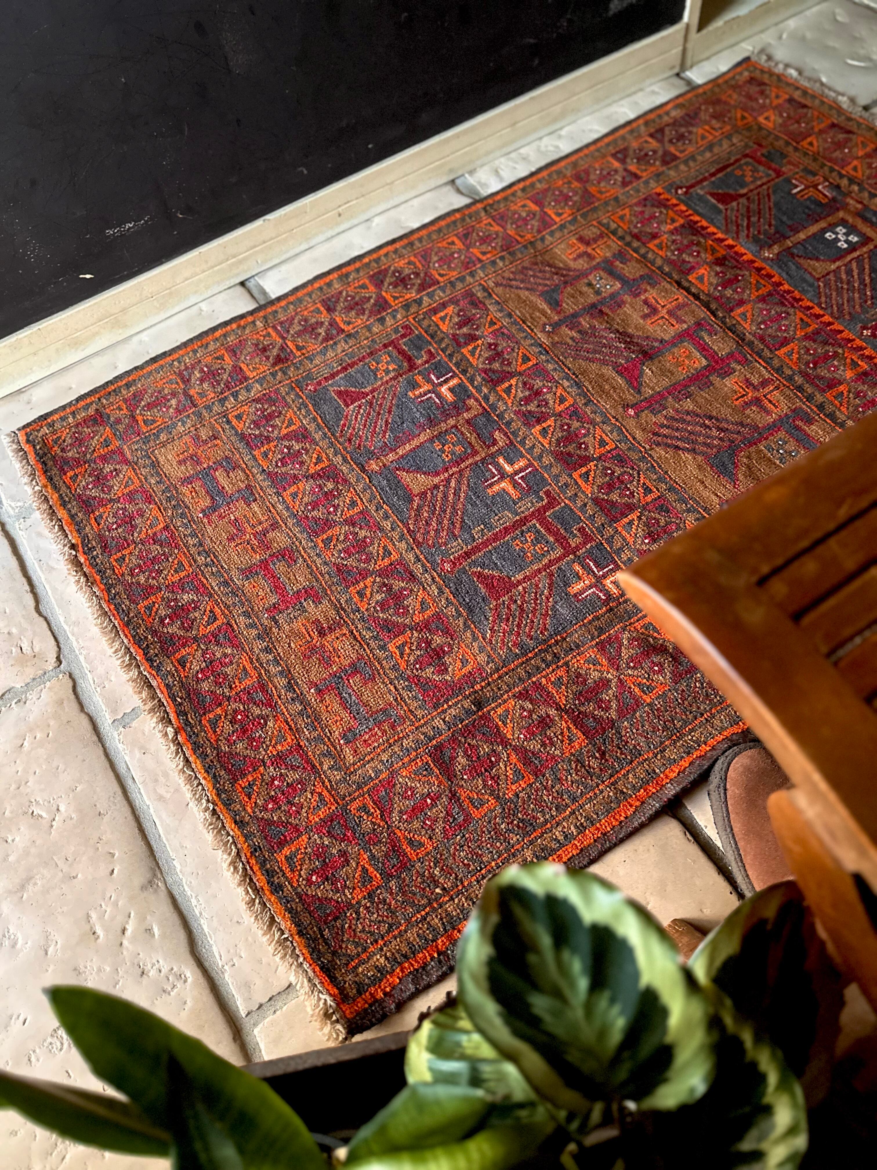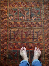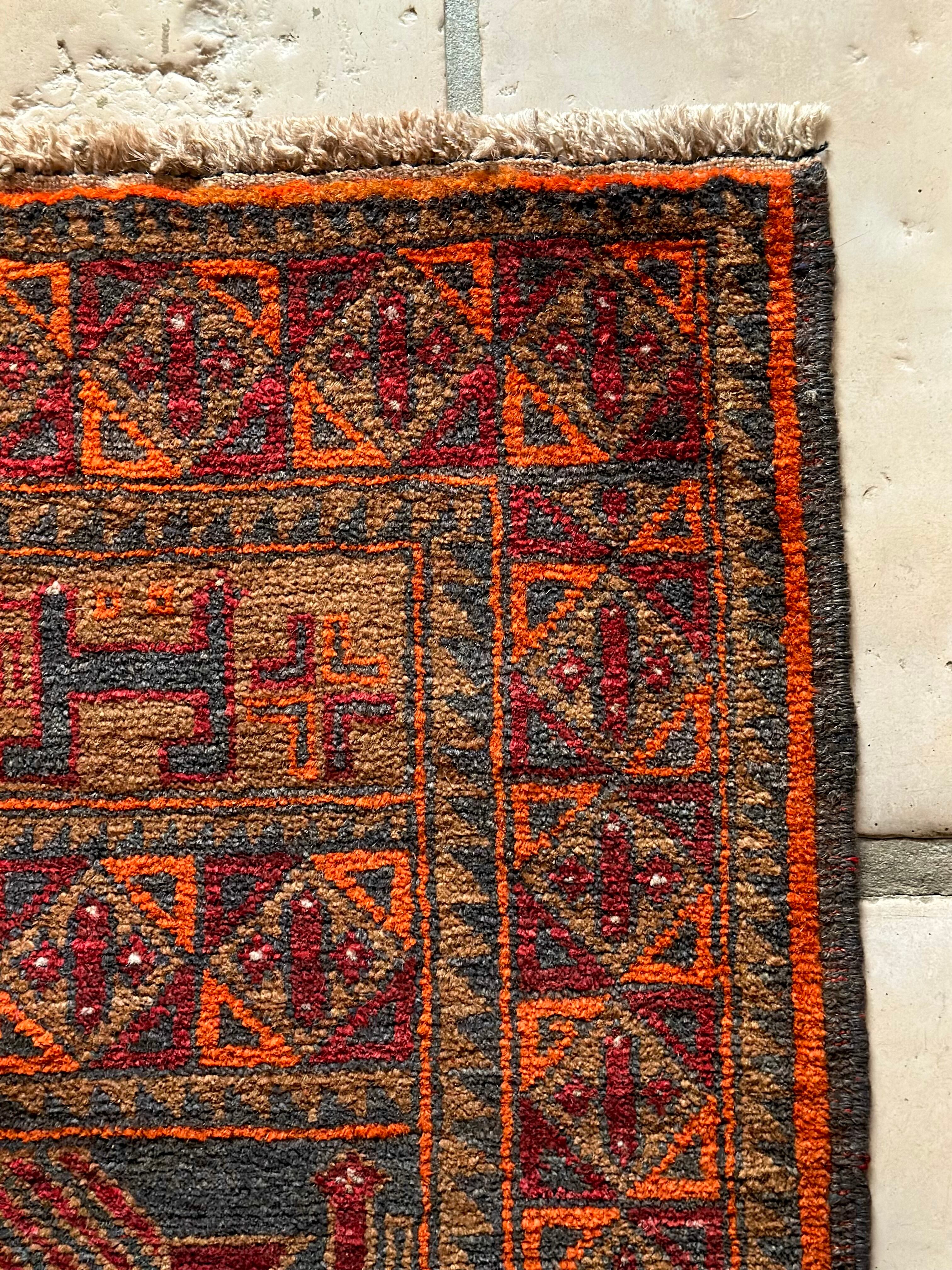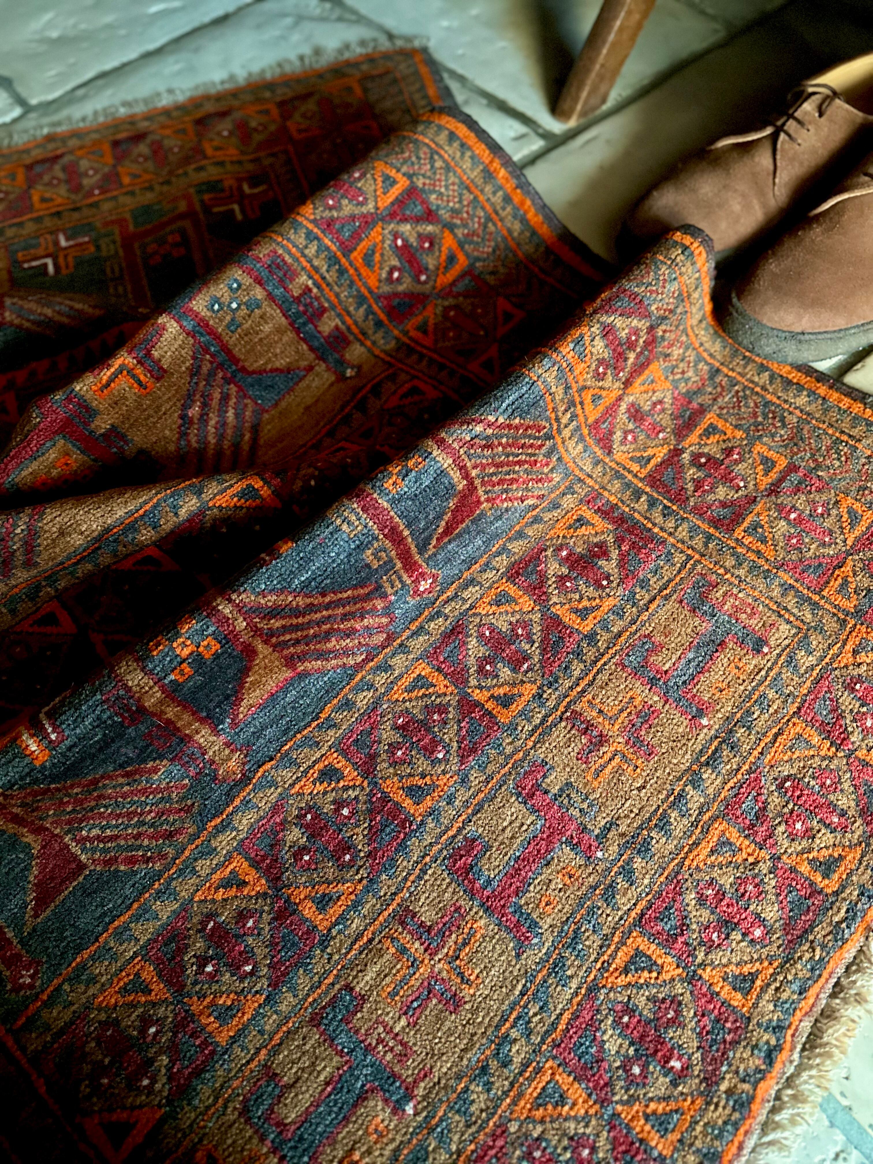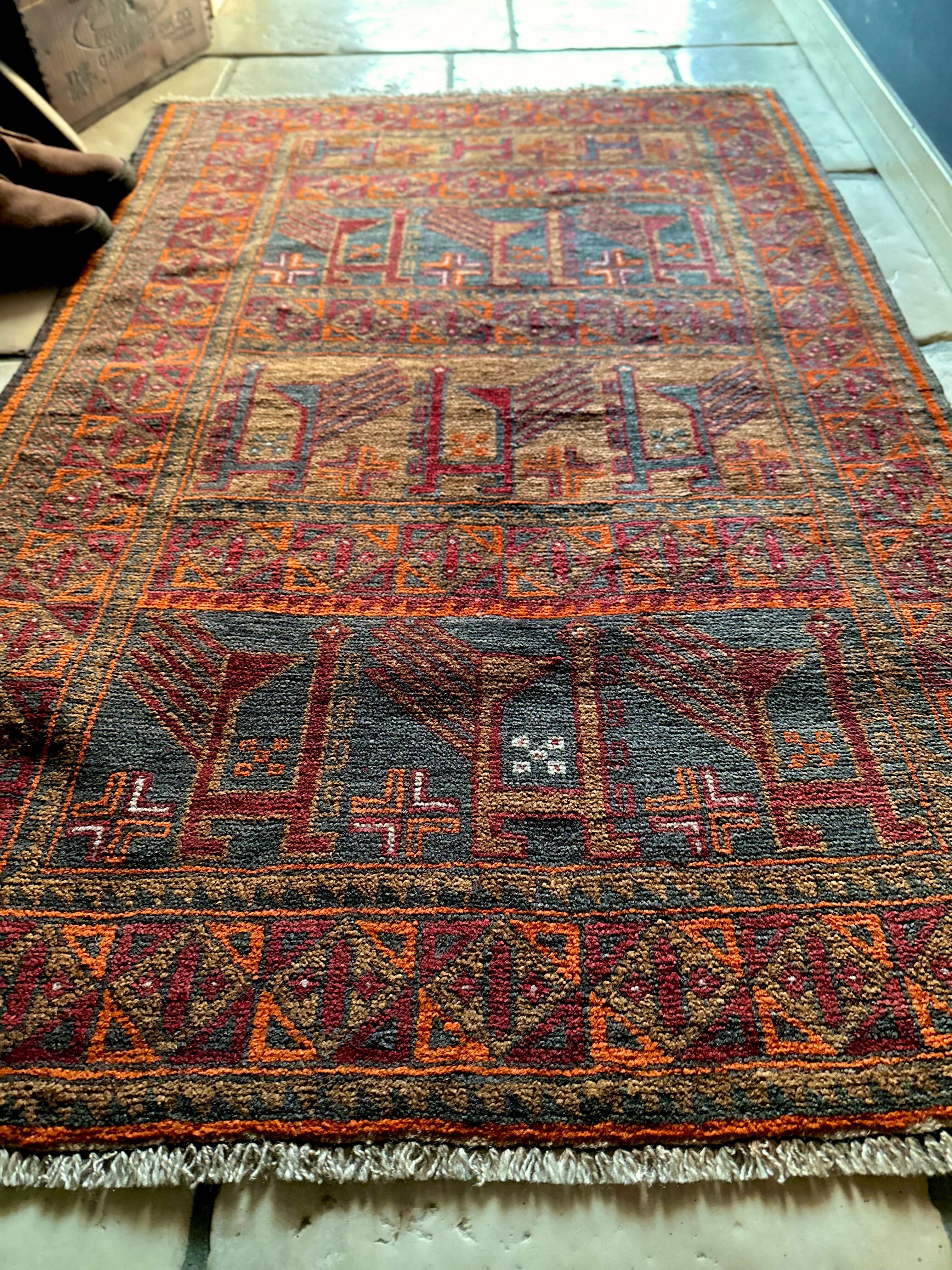カフェオレ・ベースにオレンジとレッドが映える壁画っぽい絵柄のこちらは、アフガニスタン北部のバグラーン州に居住するパシュトゥーン人によるアリホジャと呼ばれるトルクメン族系譜のトライバルラグになります。
