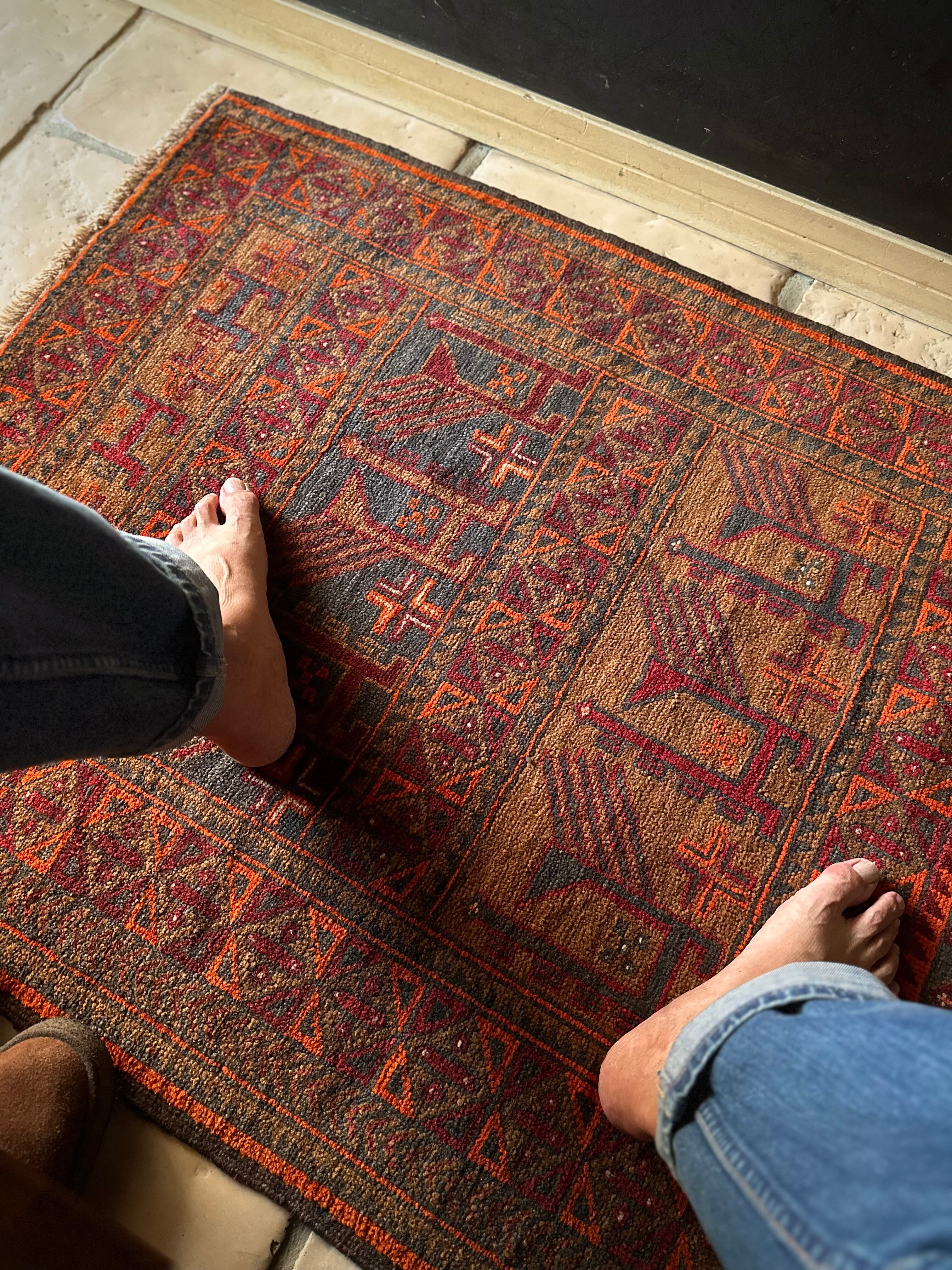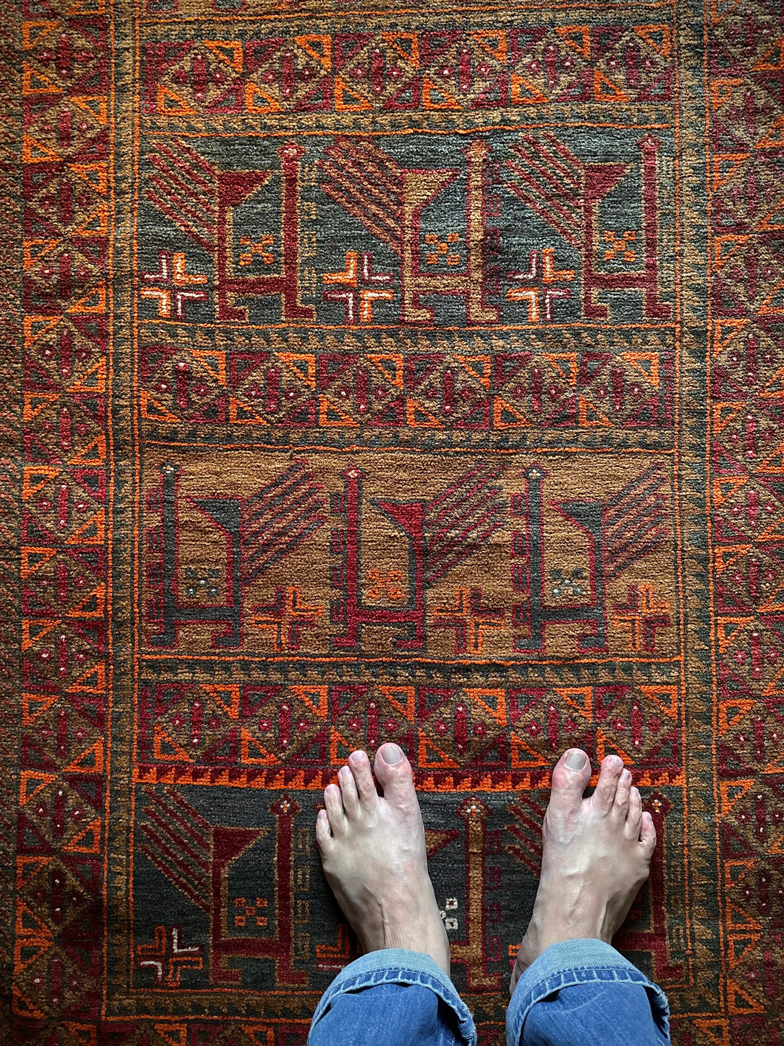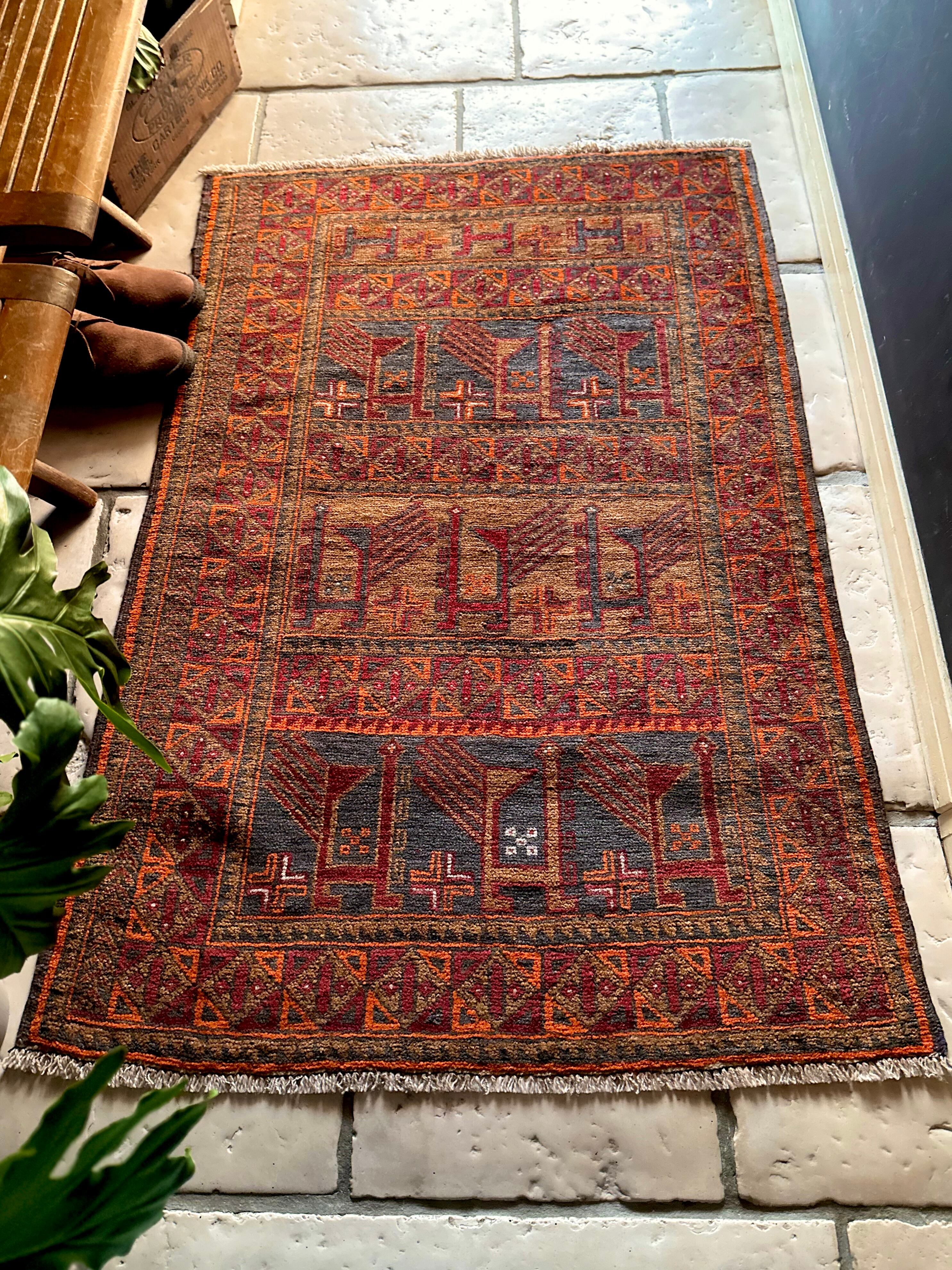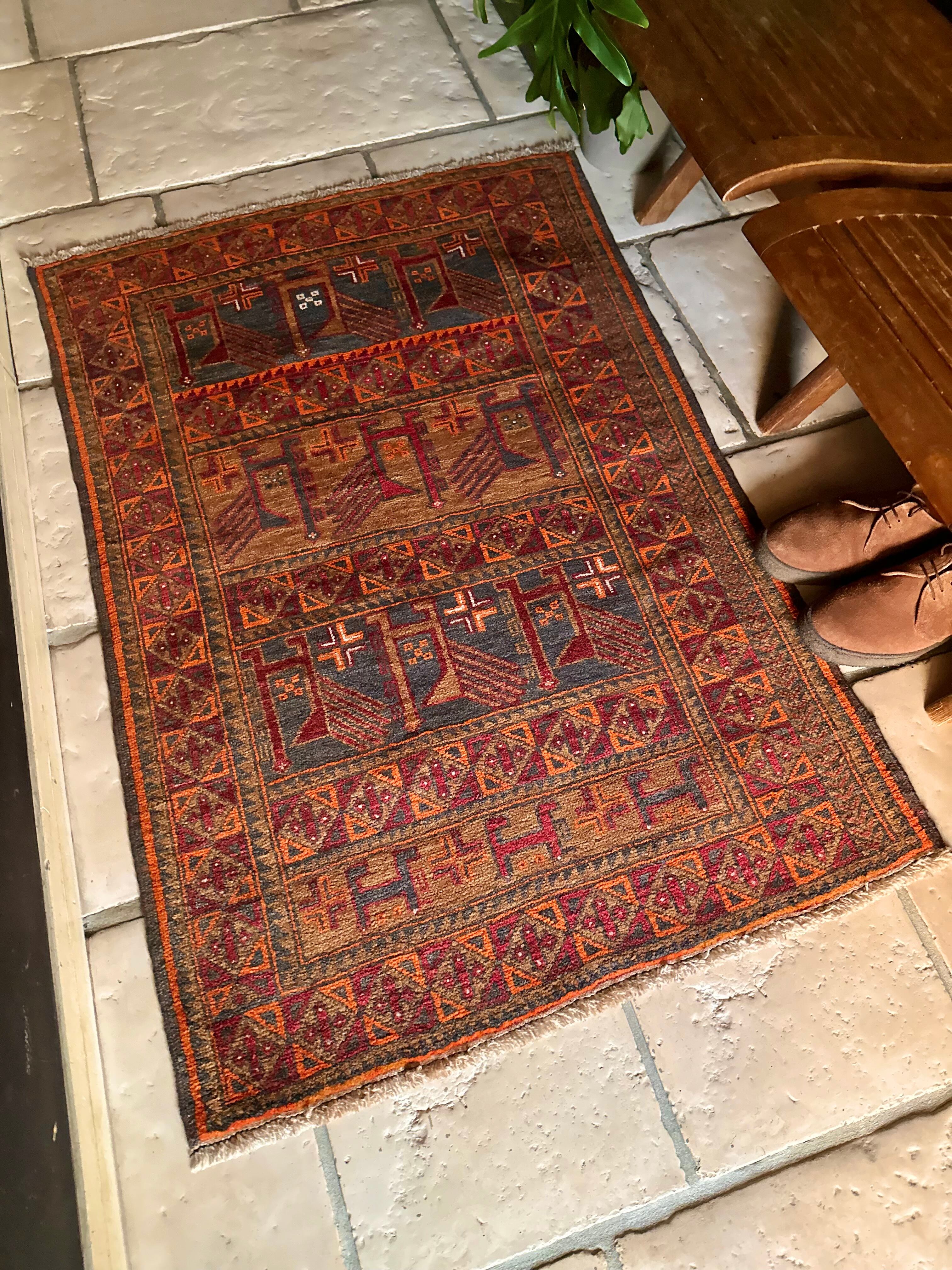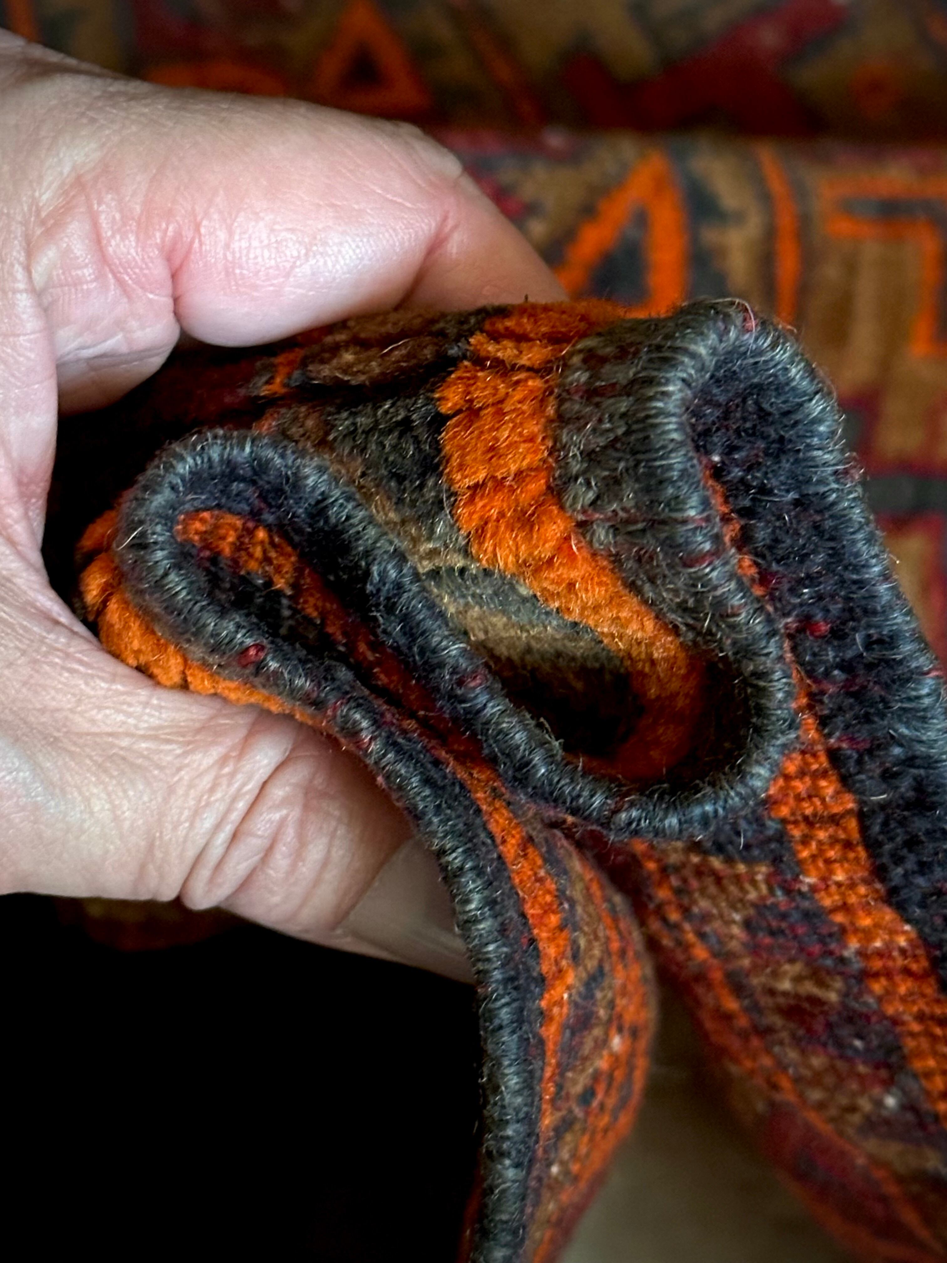 経年としてはかなり古い65年のヴィンテージラグとなり、それなりの使用感に多少の歪みがありますが、目立つダメージにリペア箇所は見当たらないナイスなコンディションで、一風変わったトライバルラグがお好きな方におすすめです。