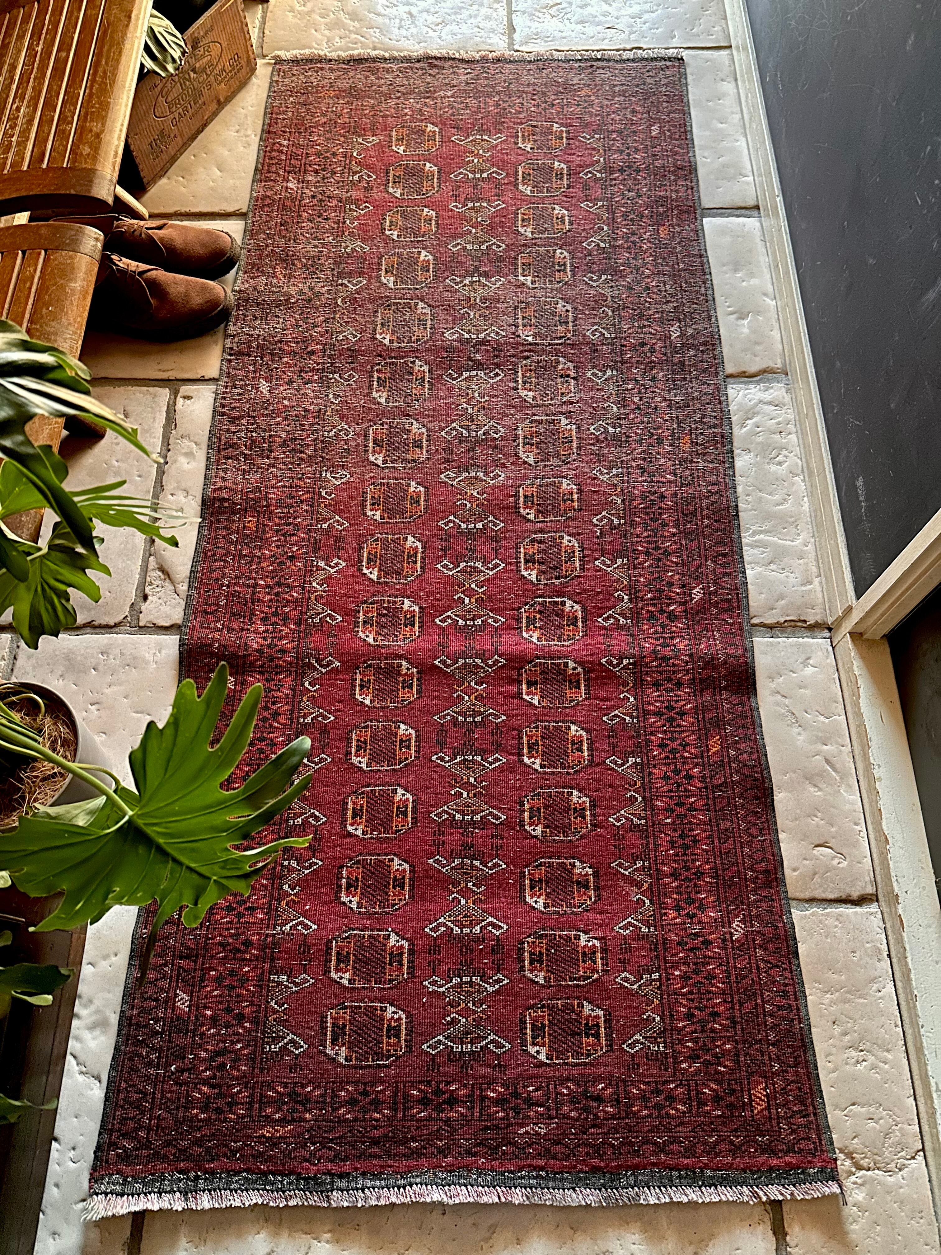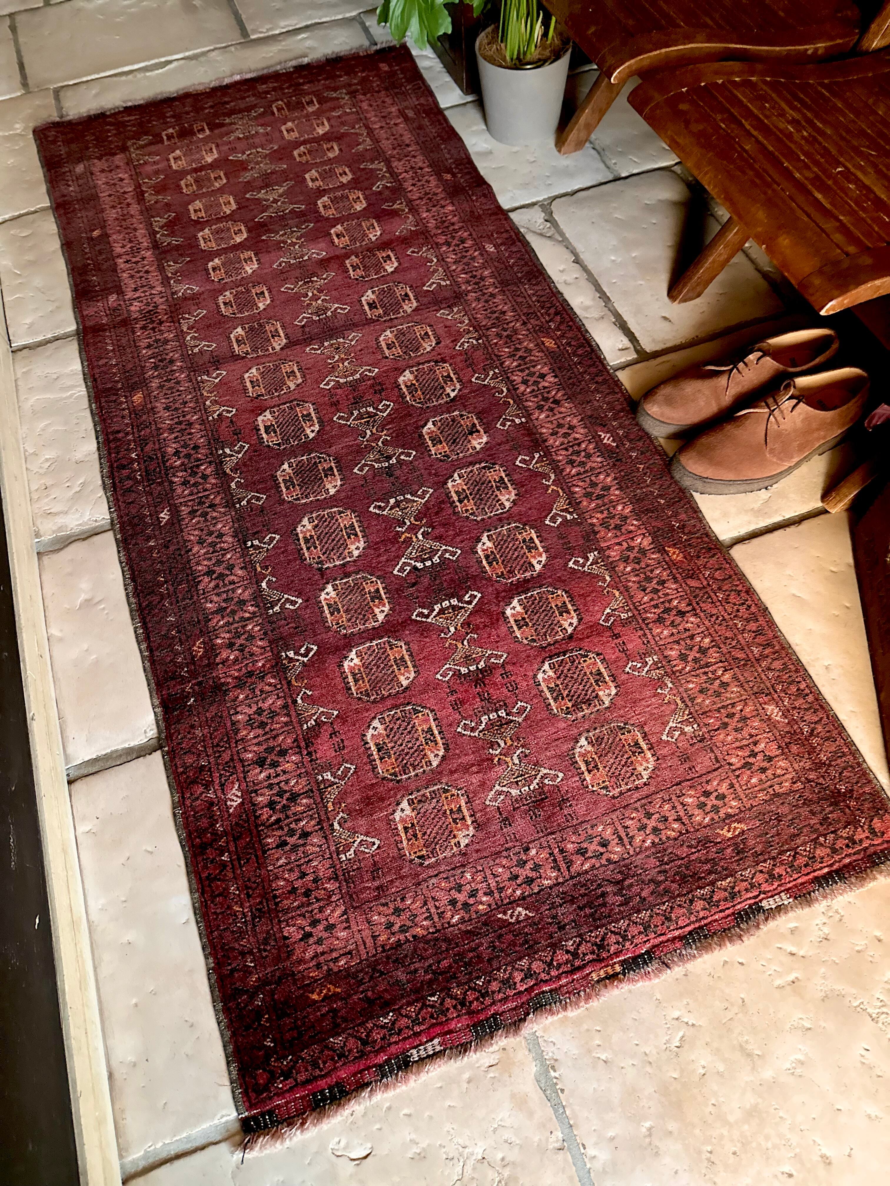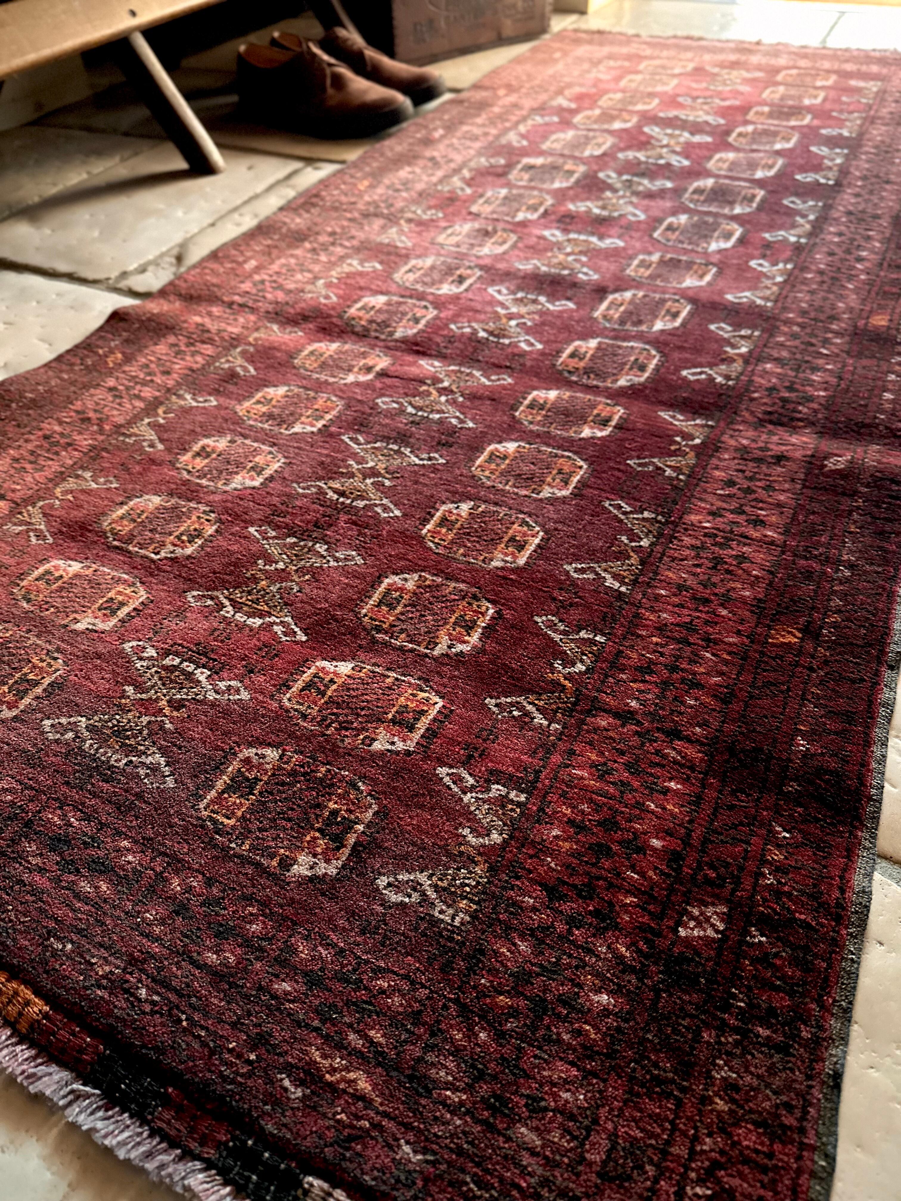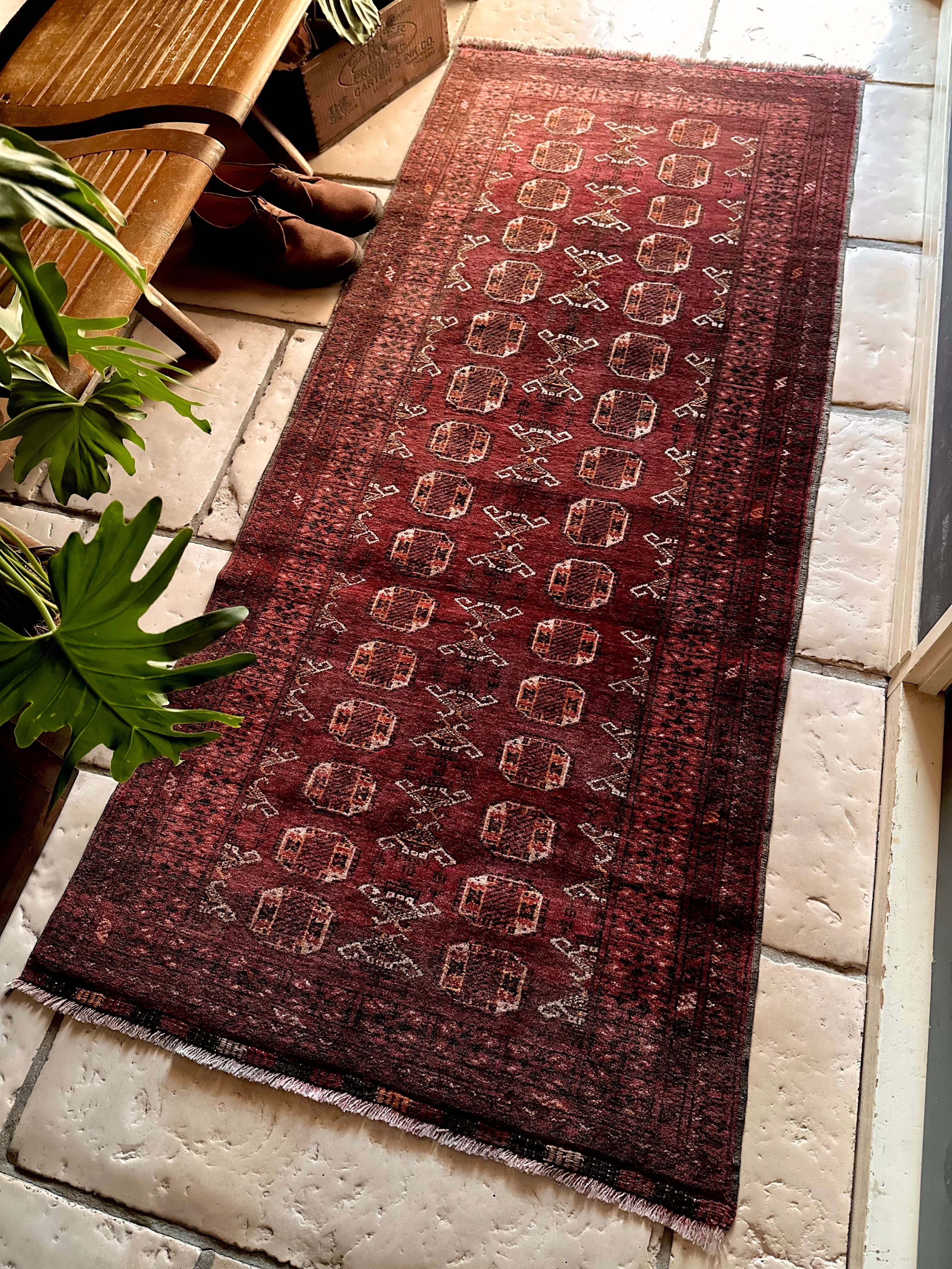 かなり深みのあるボルドーの色合いが特徴的な1枚で、大きさ的にも廊下や室内の動線にも最適なランナーサイズが魅力的な、アフガニスタンは北部に居住するトルクメン族のWaziri支族デザインのトライバルラグになります。