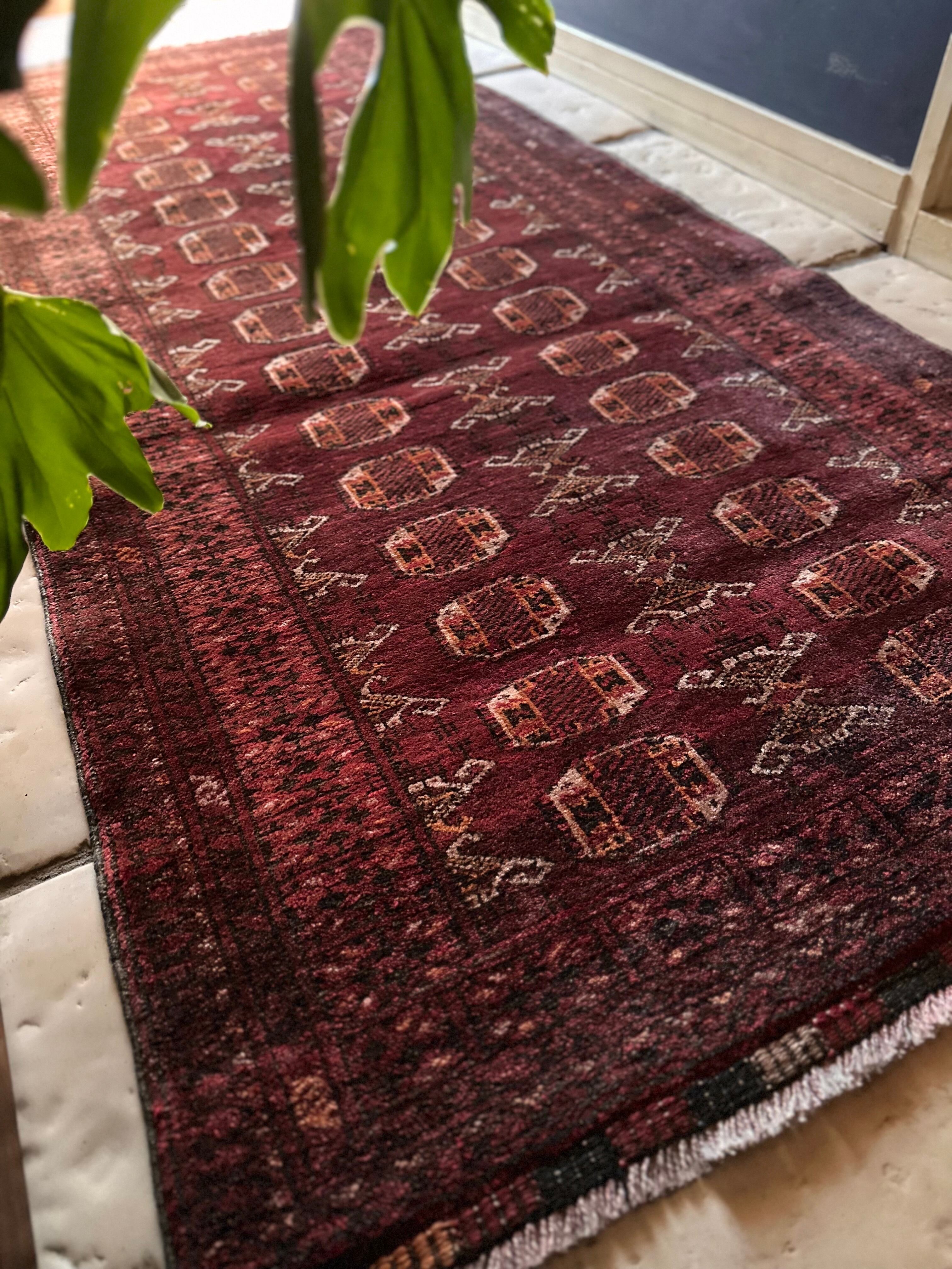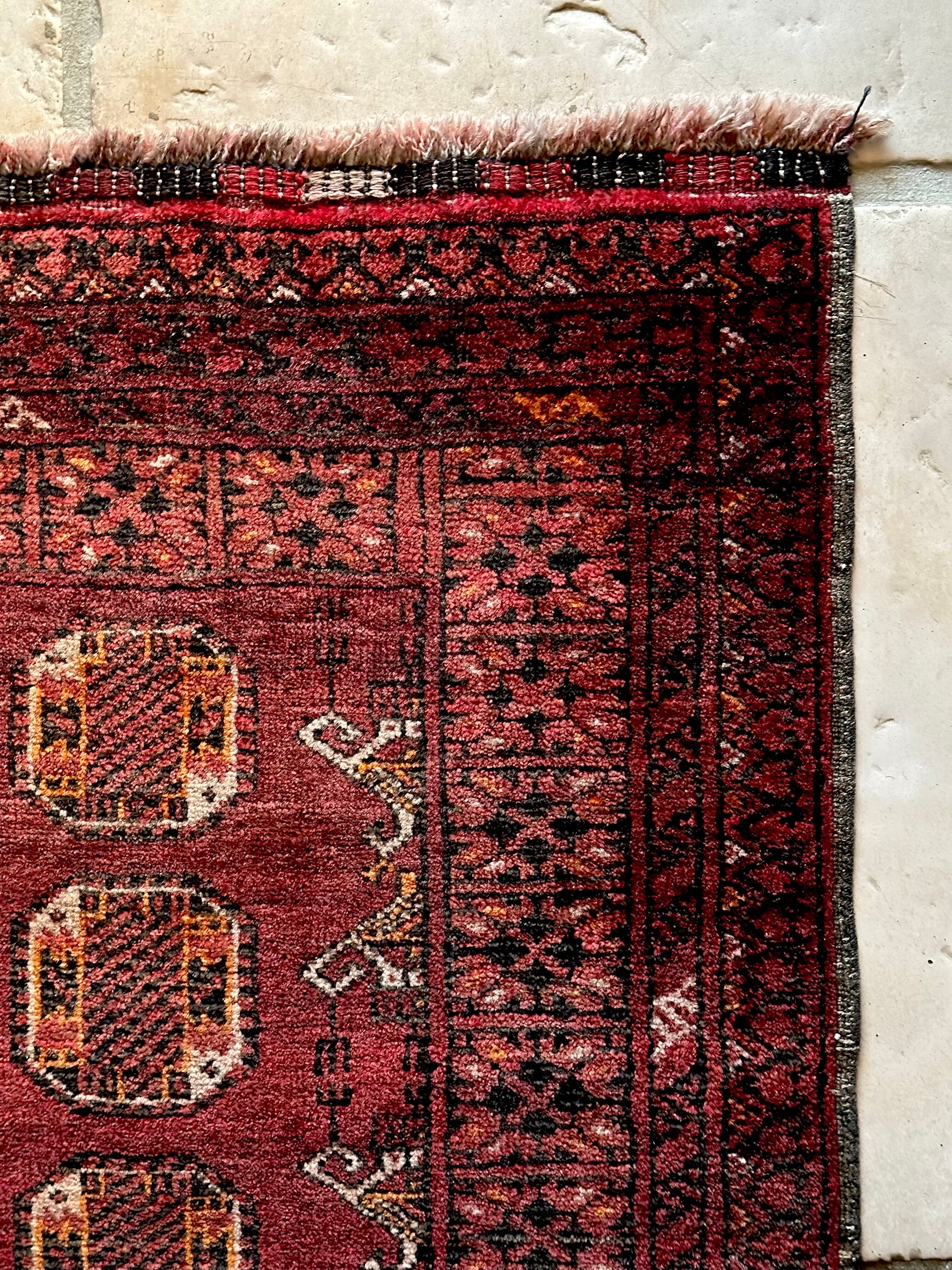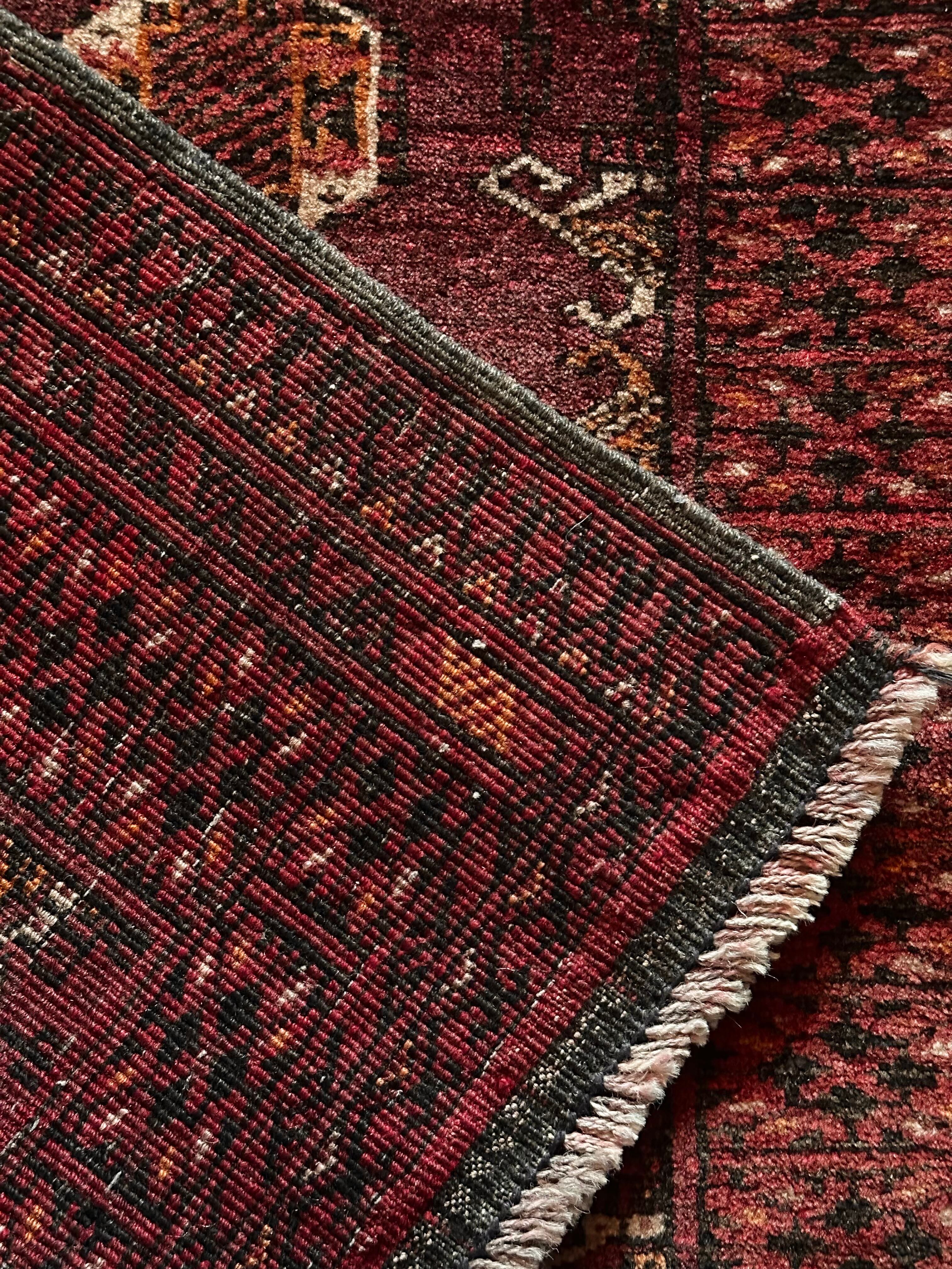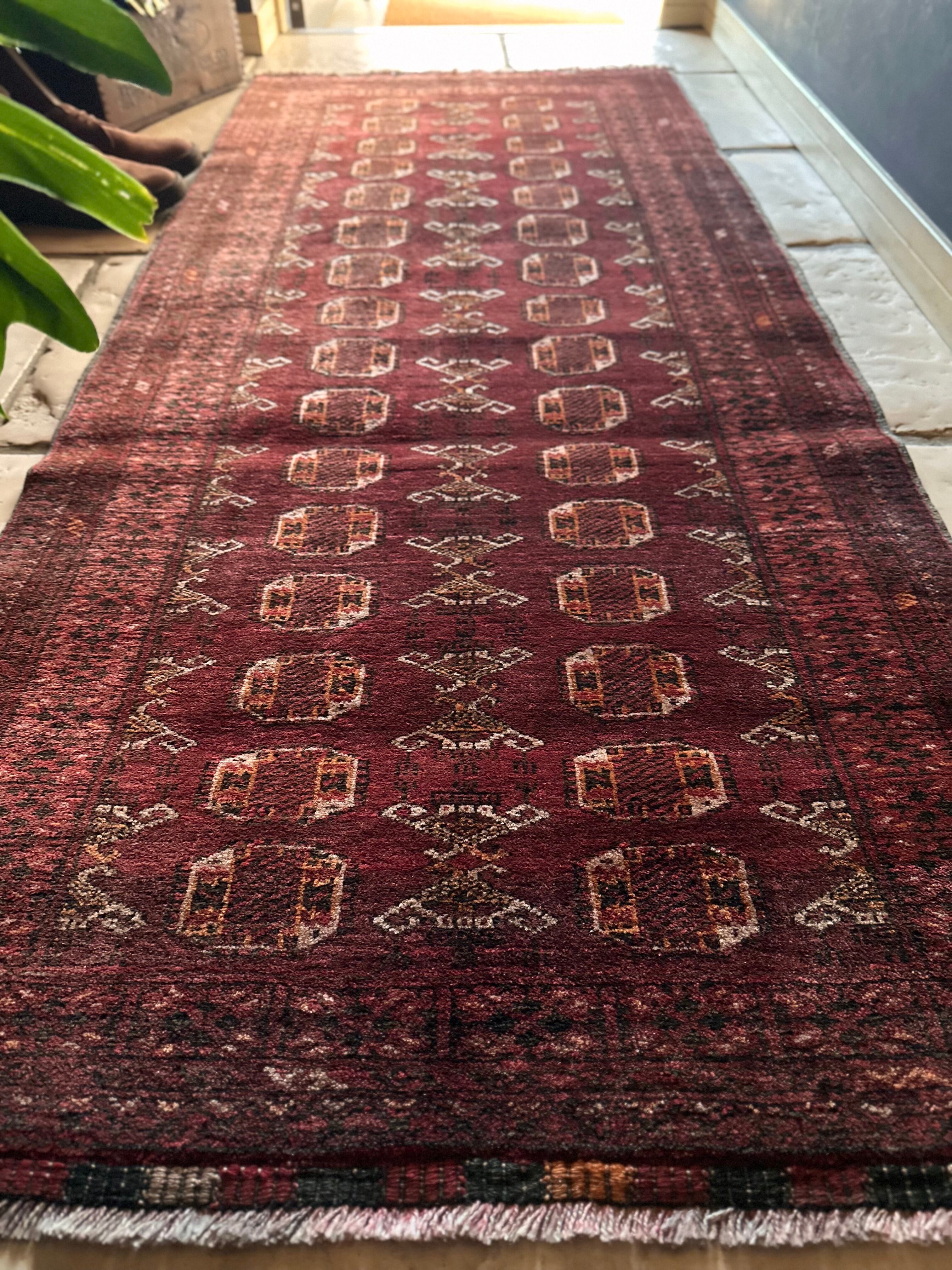 かなり深みのあるボルドーの色合いが特徴的な1枚で、大きさ的にも廊下や室内の動線にも最適なランナーサイズが魅力的な、アフガニスタンは北部に居住するトルクメン族のWaziri支族デザインのトライバルラグになります。