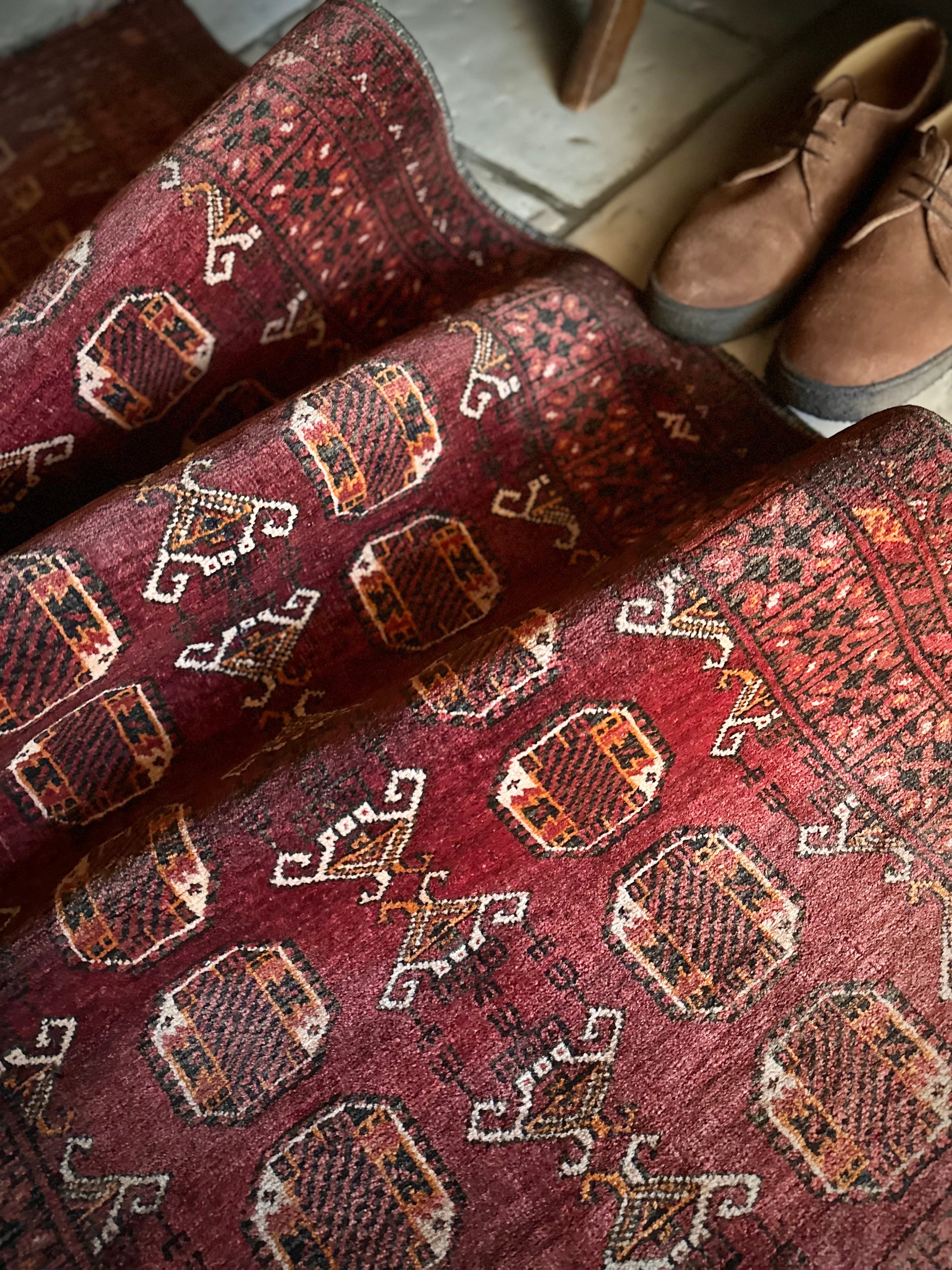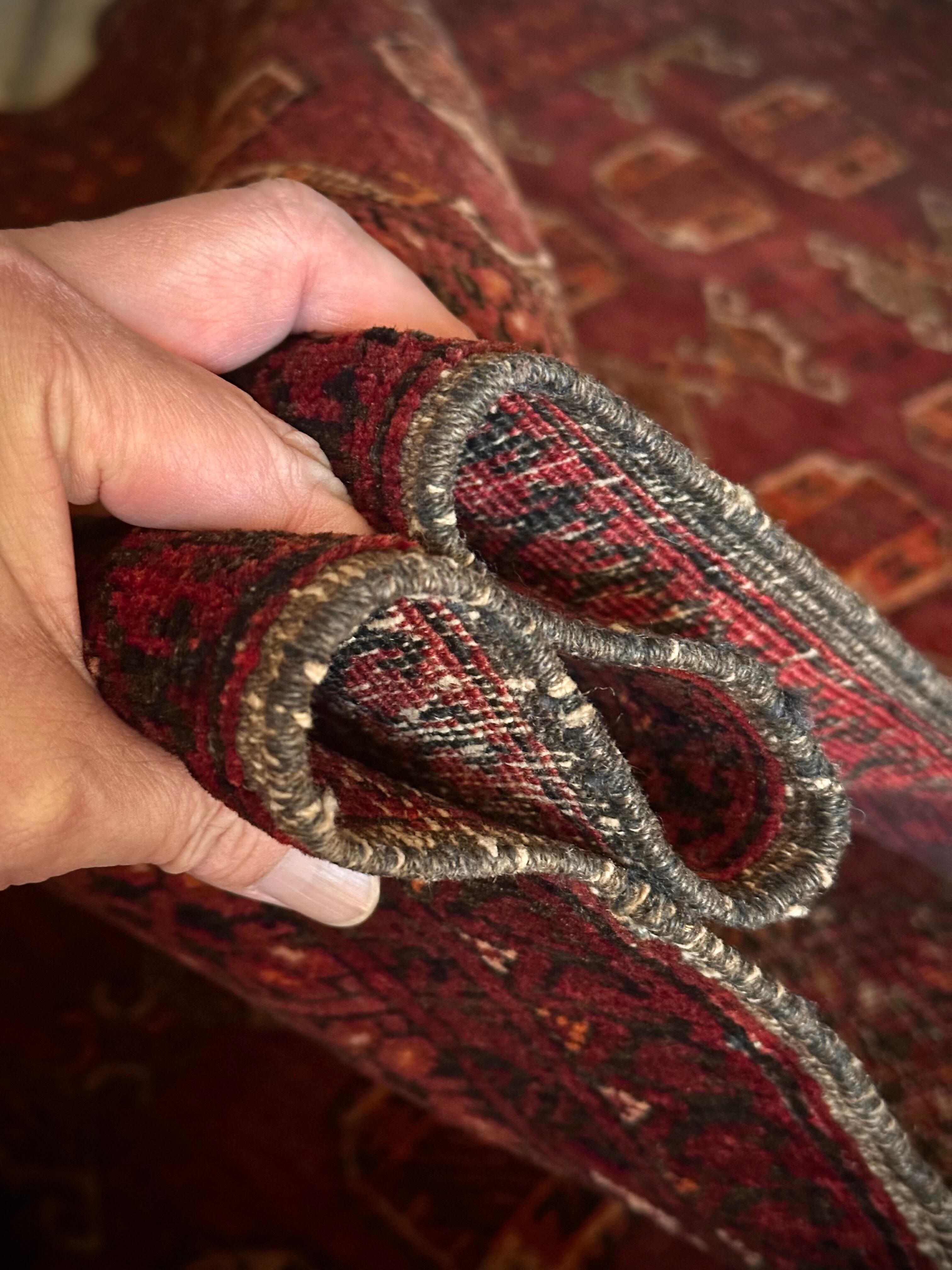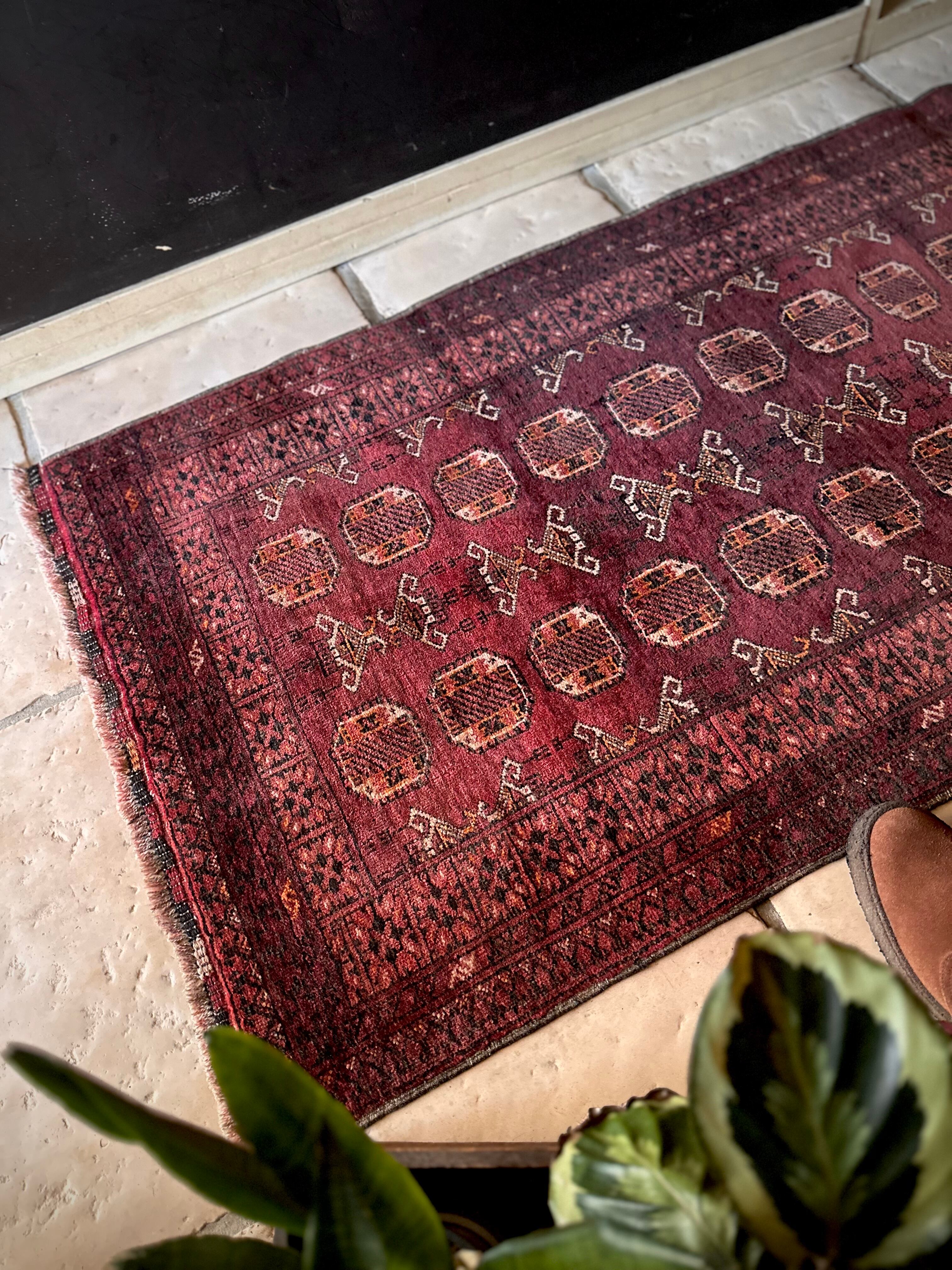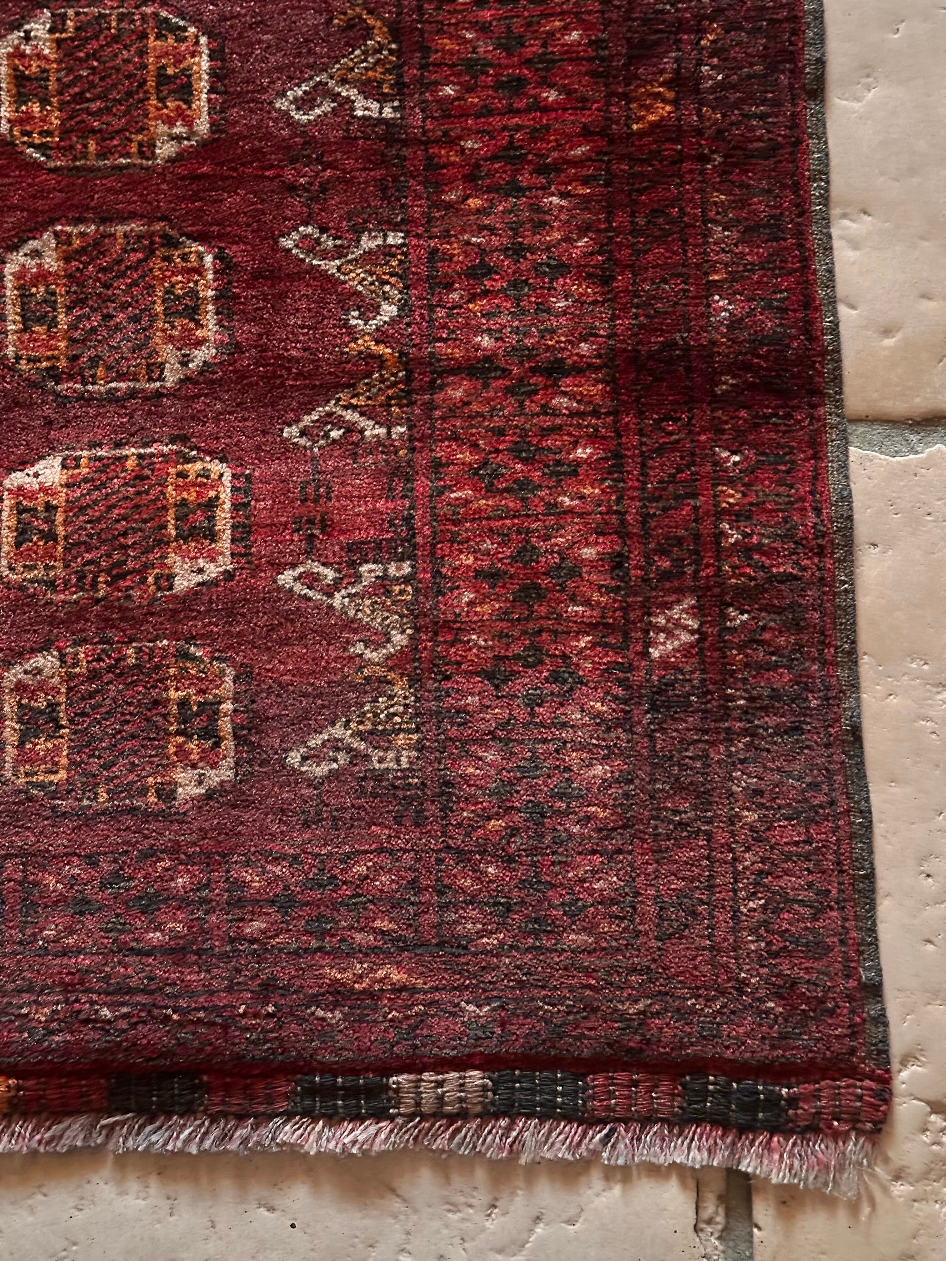 かなり深みのあるボルドーの色合いが特徴的な1枚で、大きさ的にも廊下や室内の動線にも最適なランナーサイズが魅力的な、アフガニスタンは北部に居住するトルクメン族のWaziri支族デザインのトライバルラグになります。