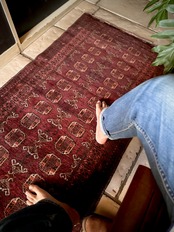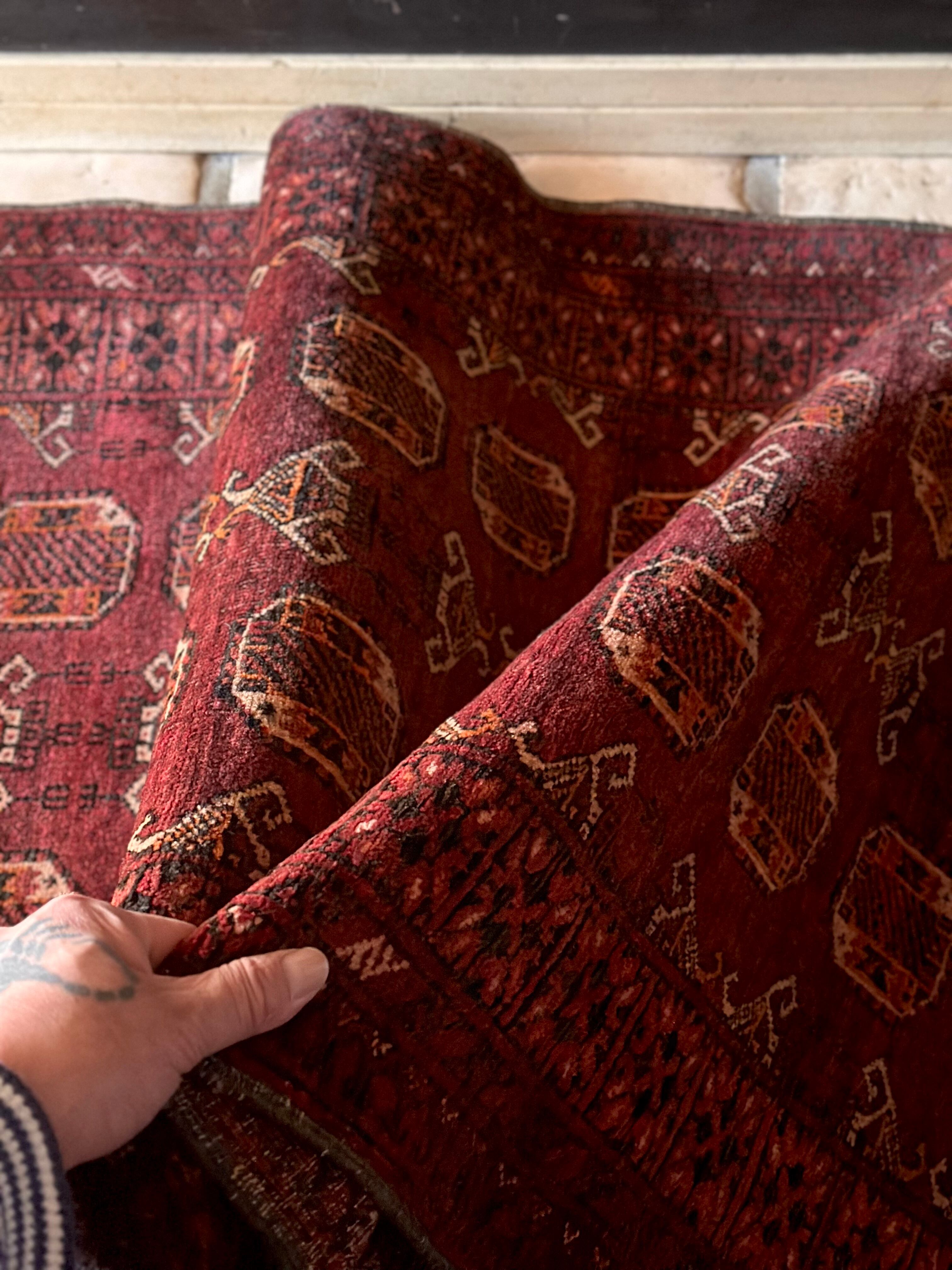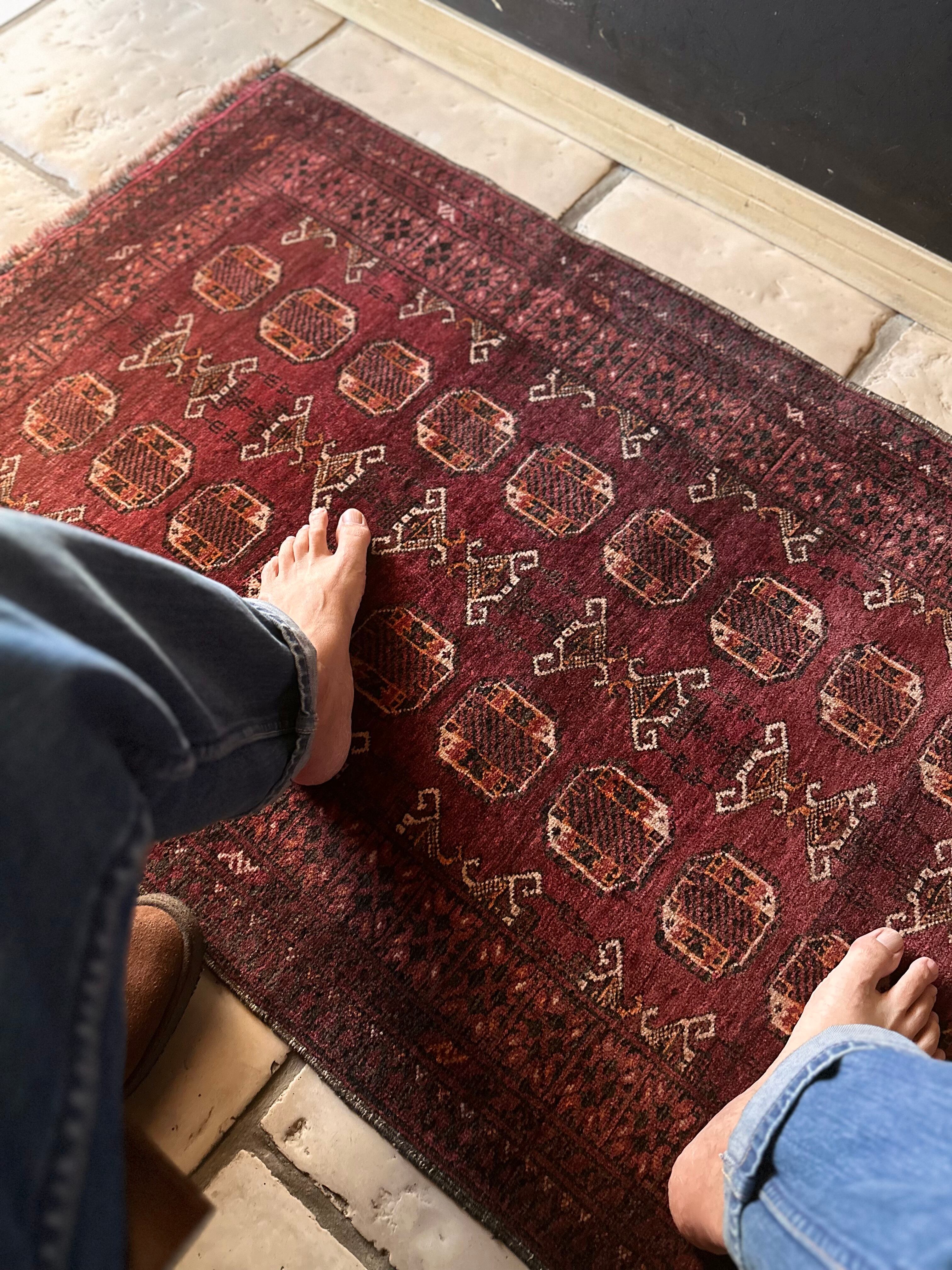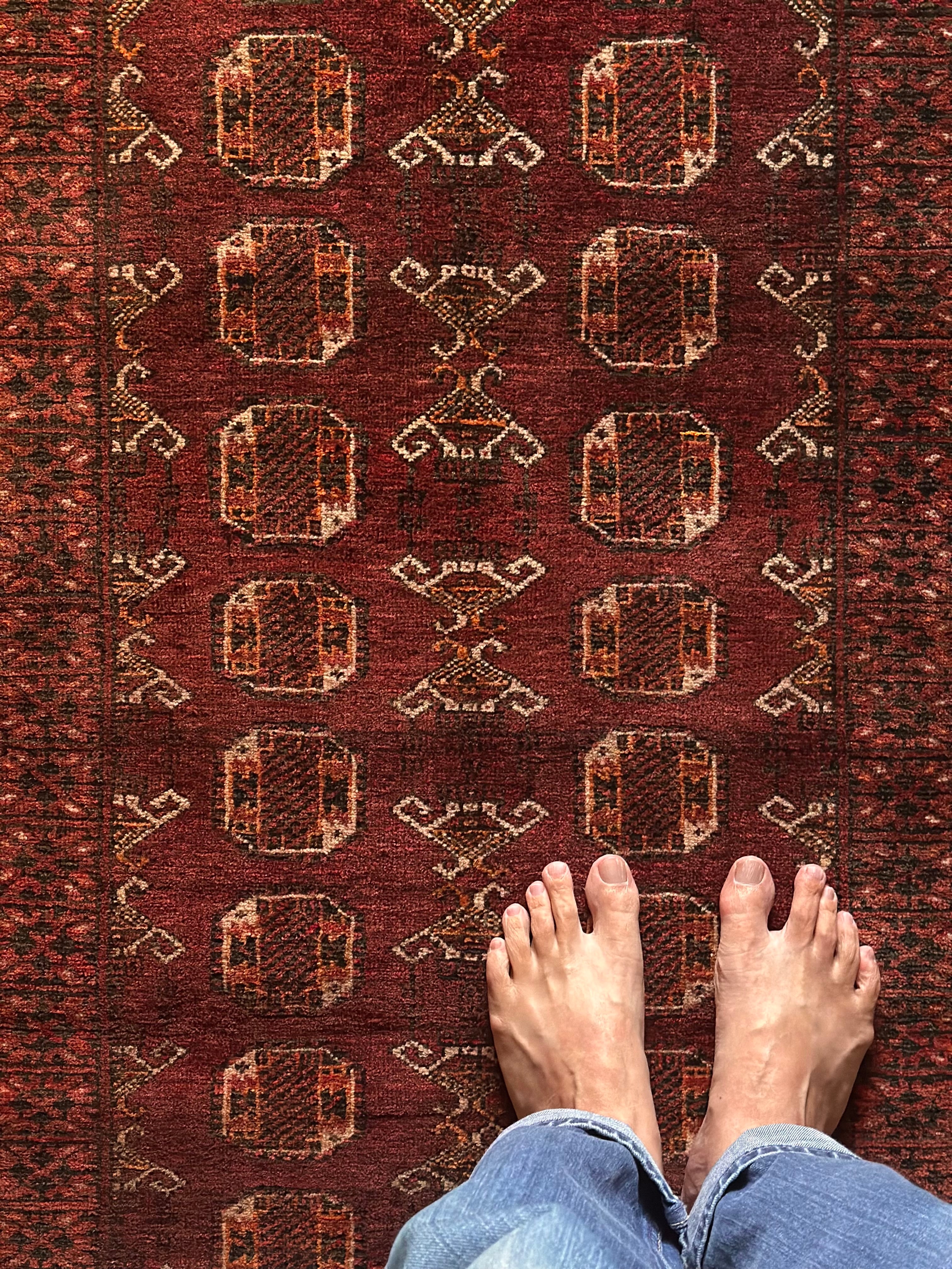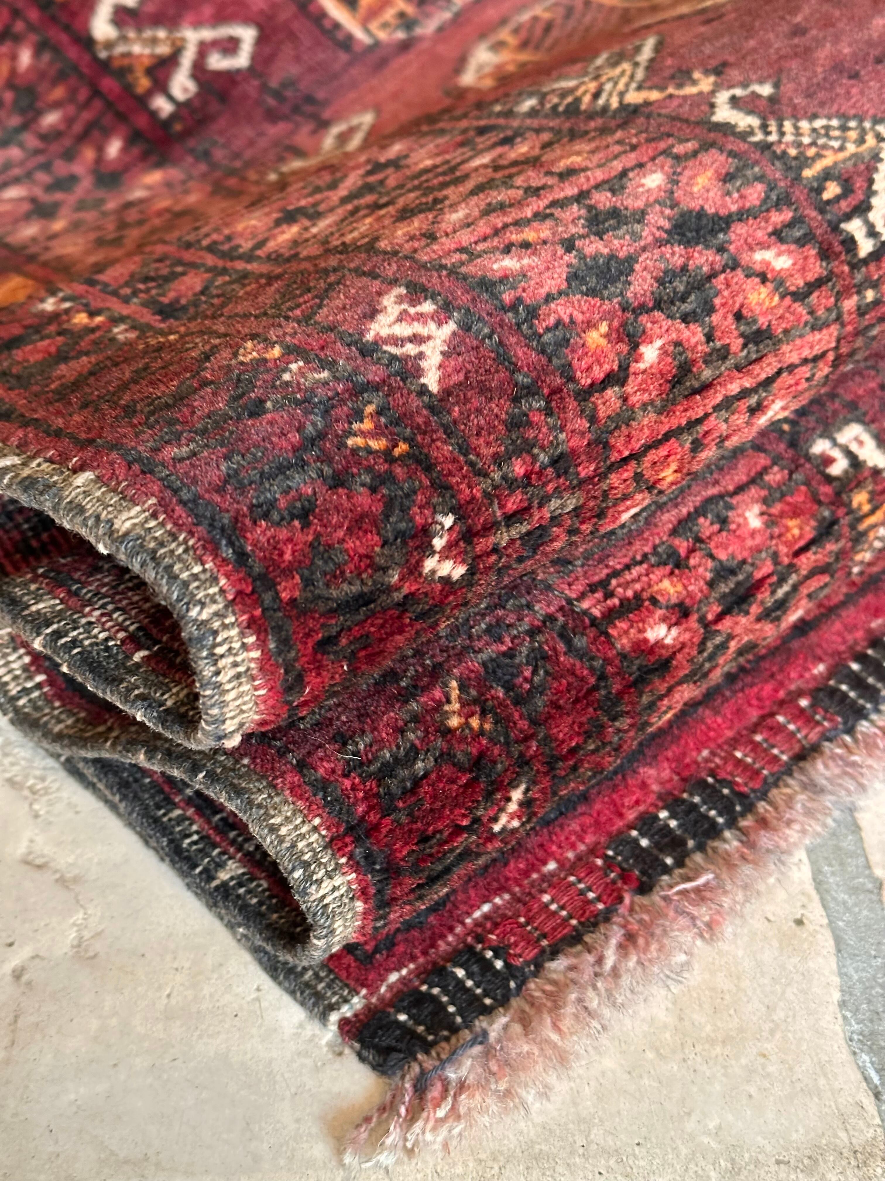 かなり深みのあるボルドーの色合いが特徴的な1枚で、大きさ的にも廊下や室内の動線にも最適なランナーサイズが魅力的な、アフガニスタンは北部に居住するトルクメン族のWaziri支族デザインのトライバルラグになります。
